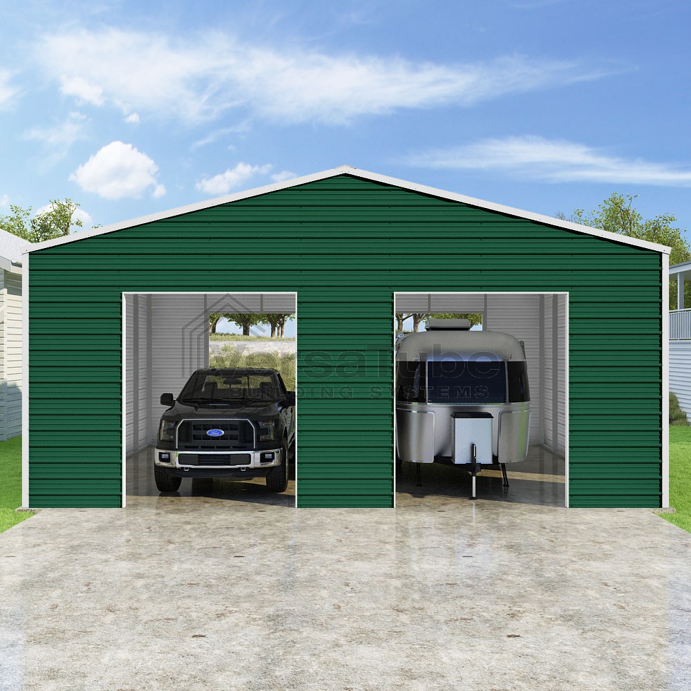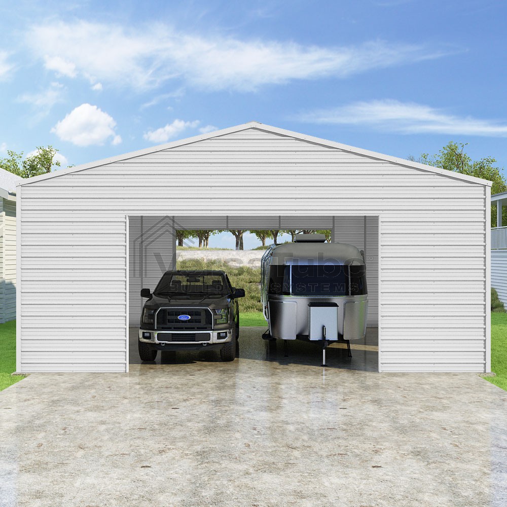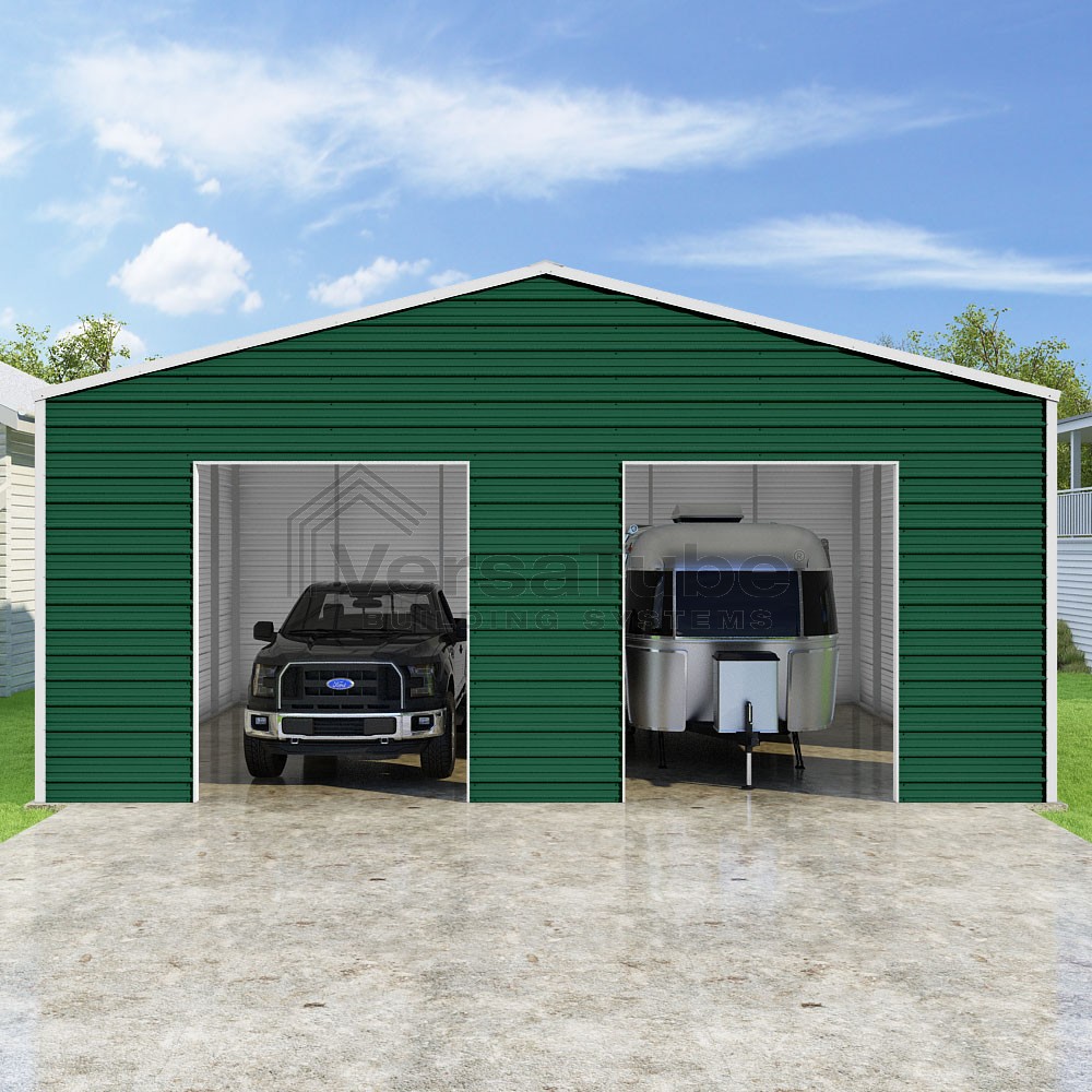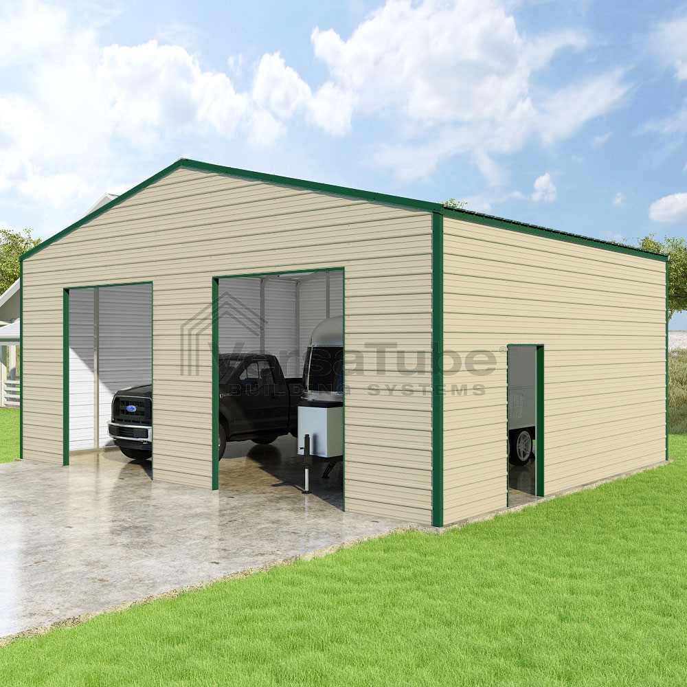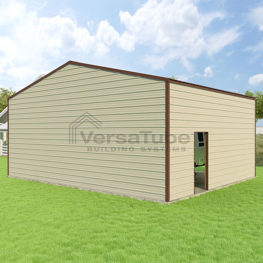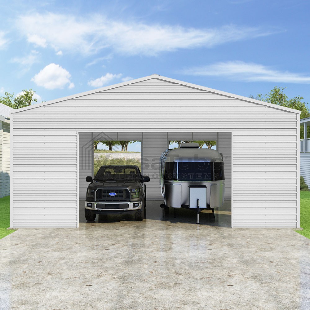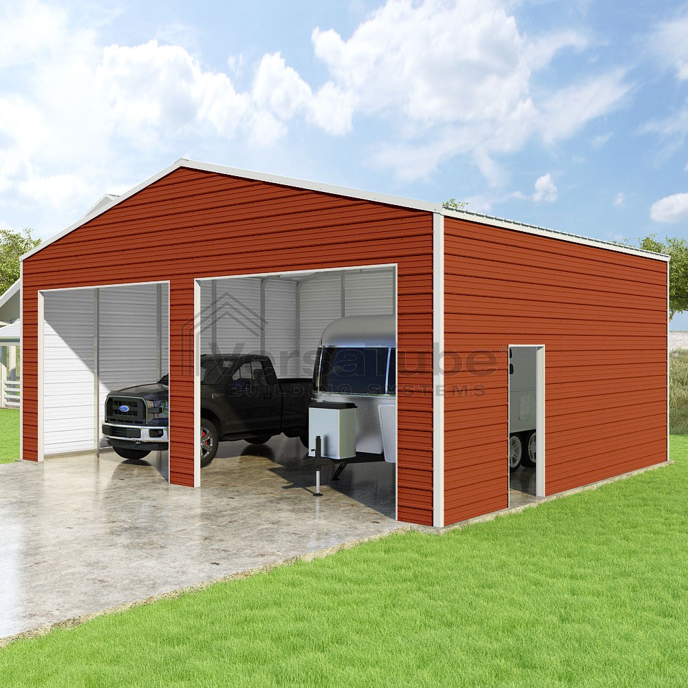 Frontier Series DIY garage kit features vertical sheet metal roof panels with horizontal siding panels..