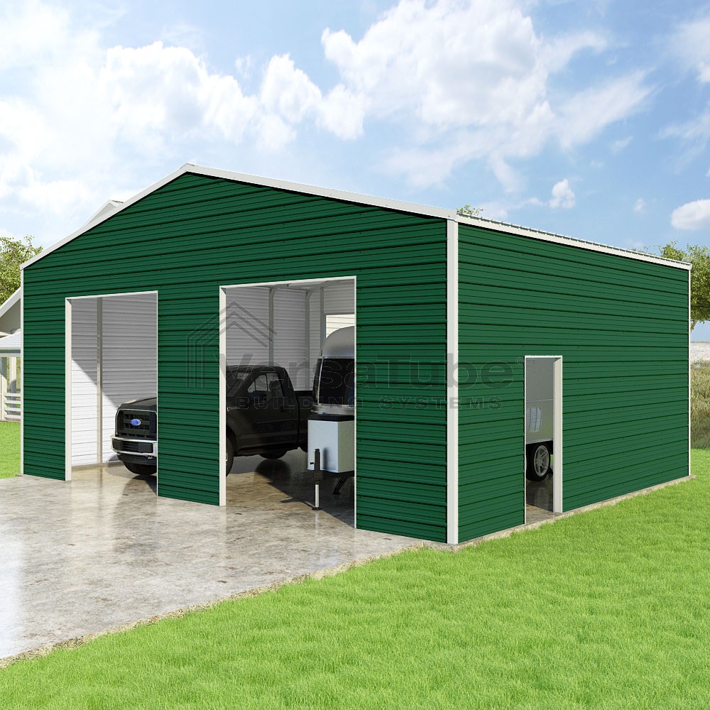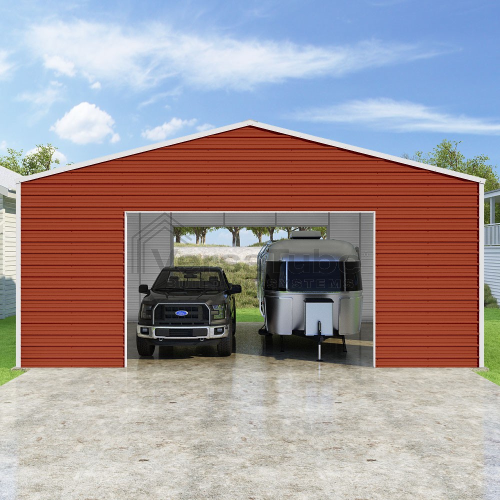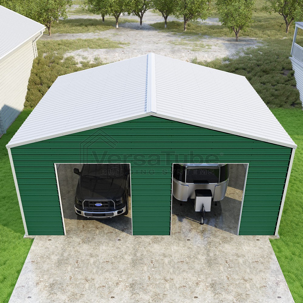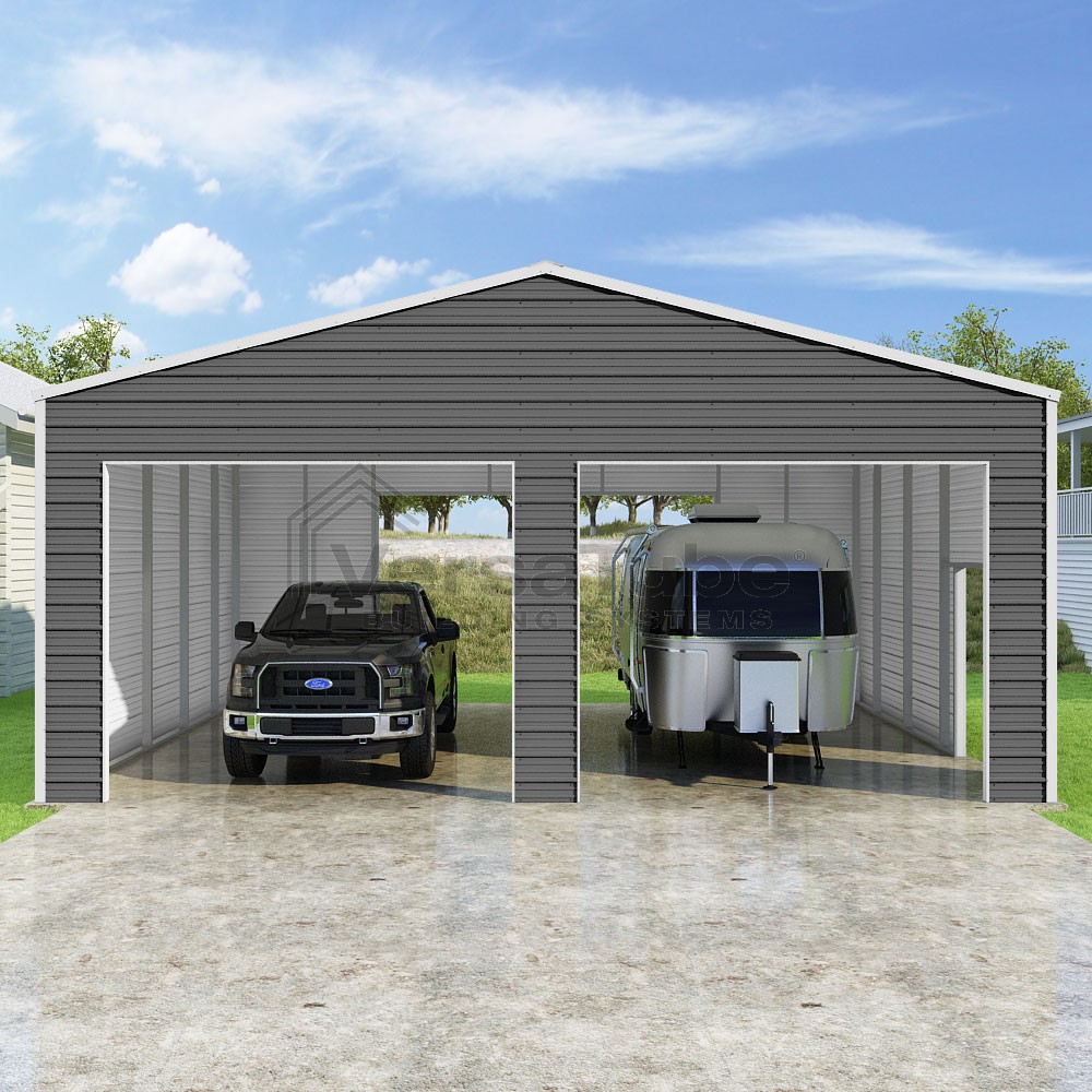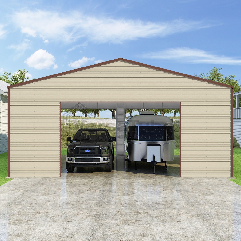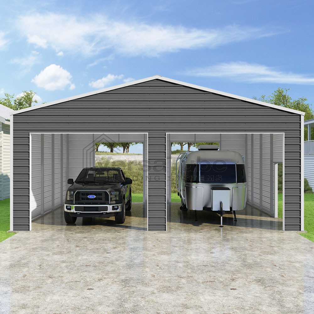 Frontier Series DIY garage kit features vertical sheet metal roof panels with horizontal siding panels..