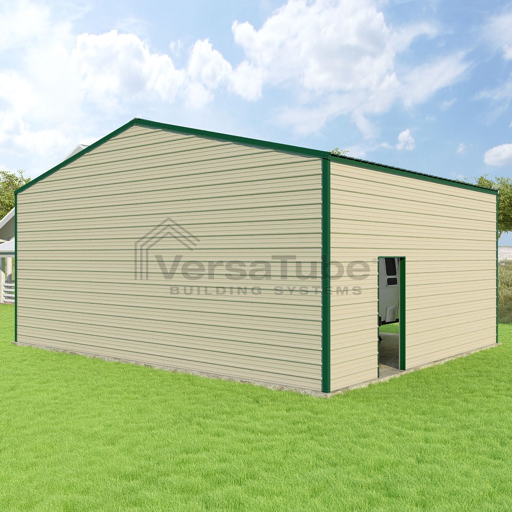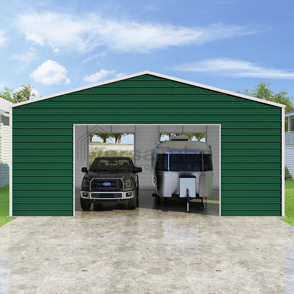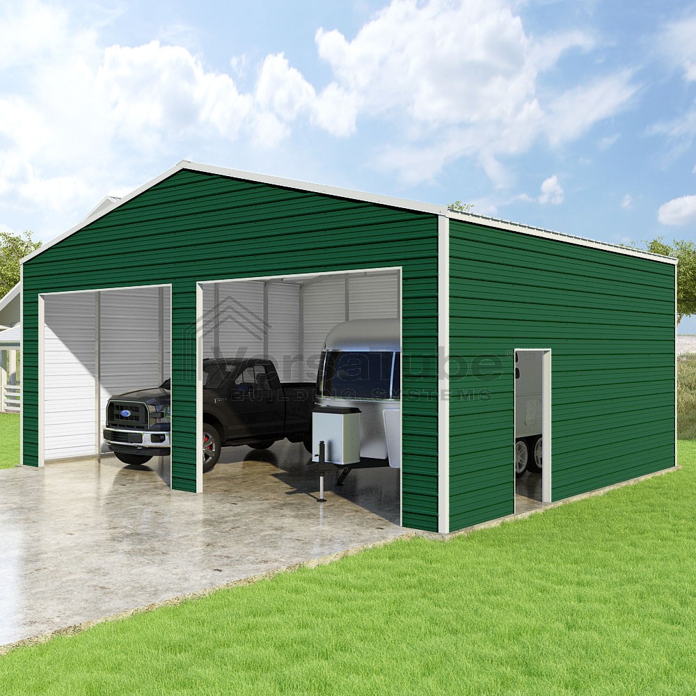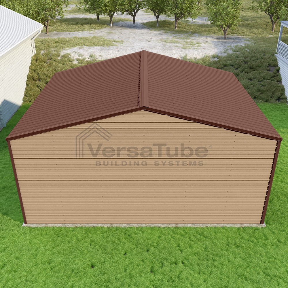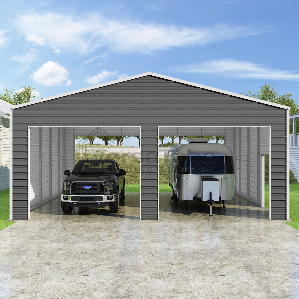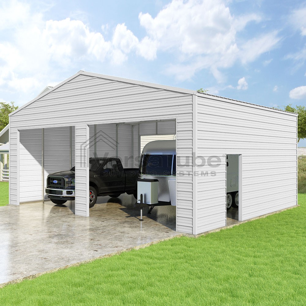 Frontier Series DIY garage kit features vertical sheet metal roof panels with horizontal siding panels..