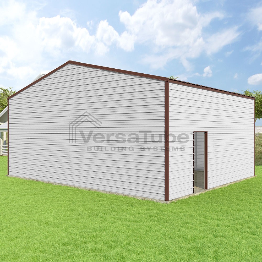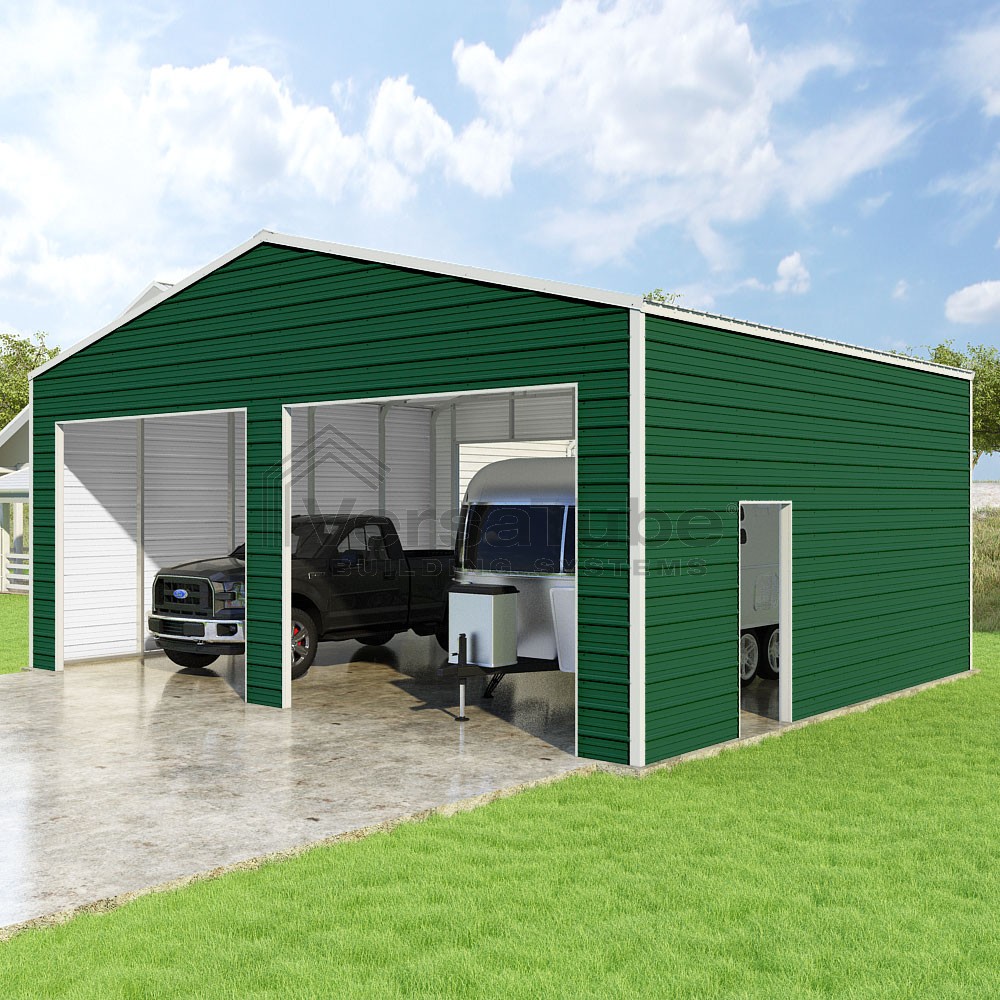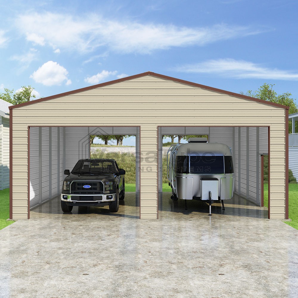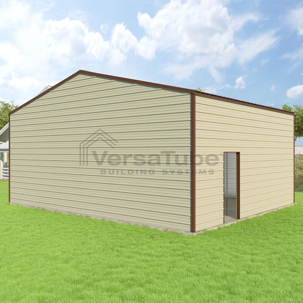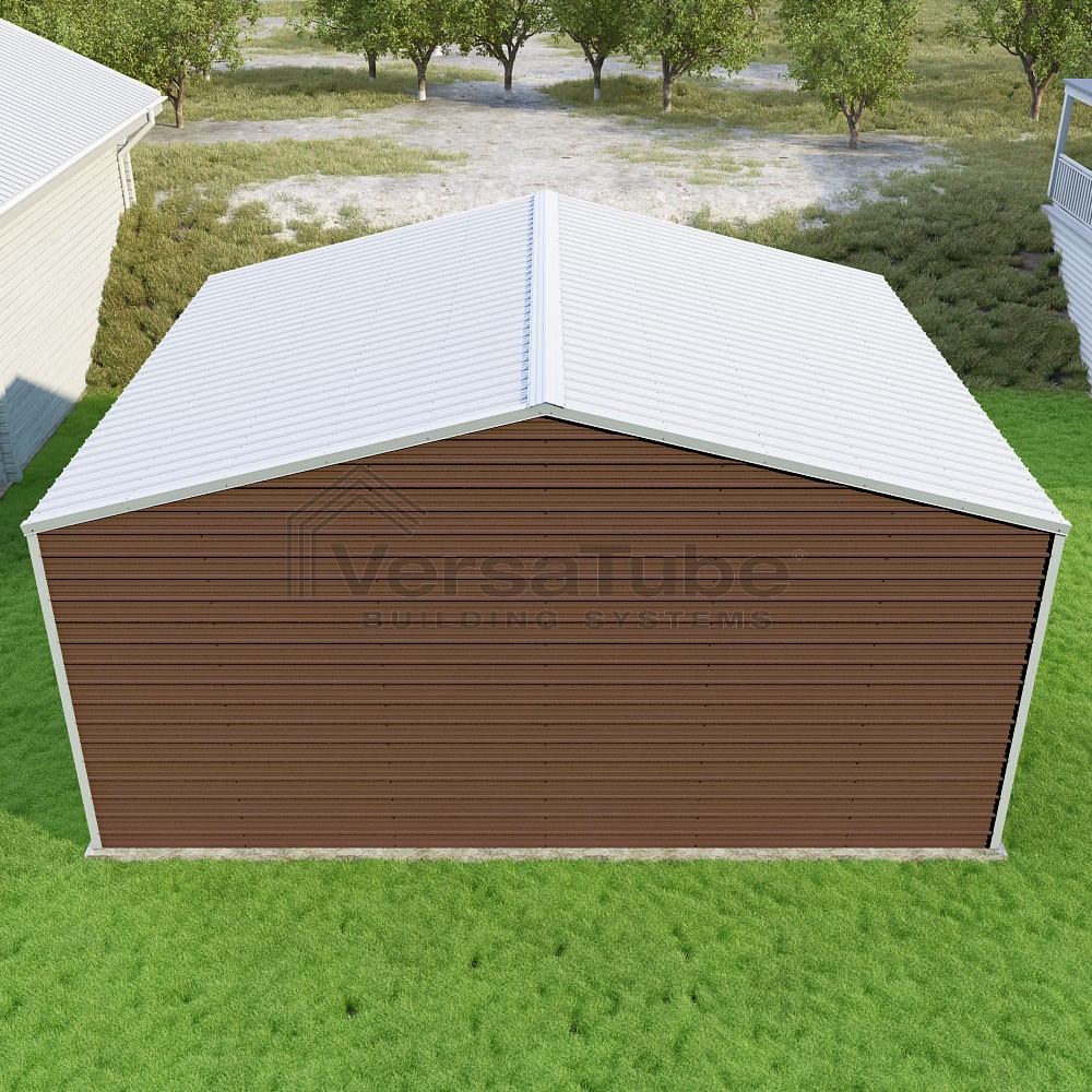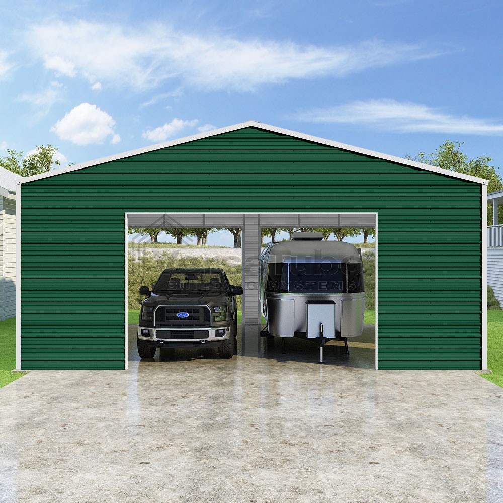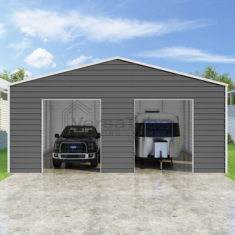 Frontier Series DIY garage kit features vertical sheet metal roof panels with horizontal siding panels..