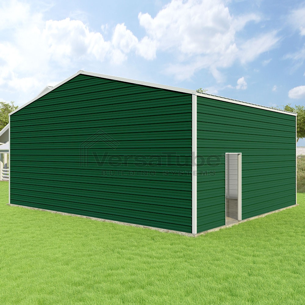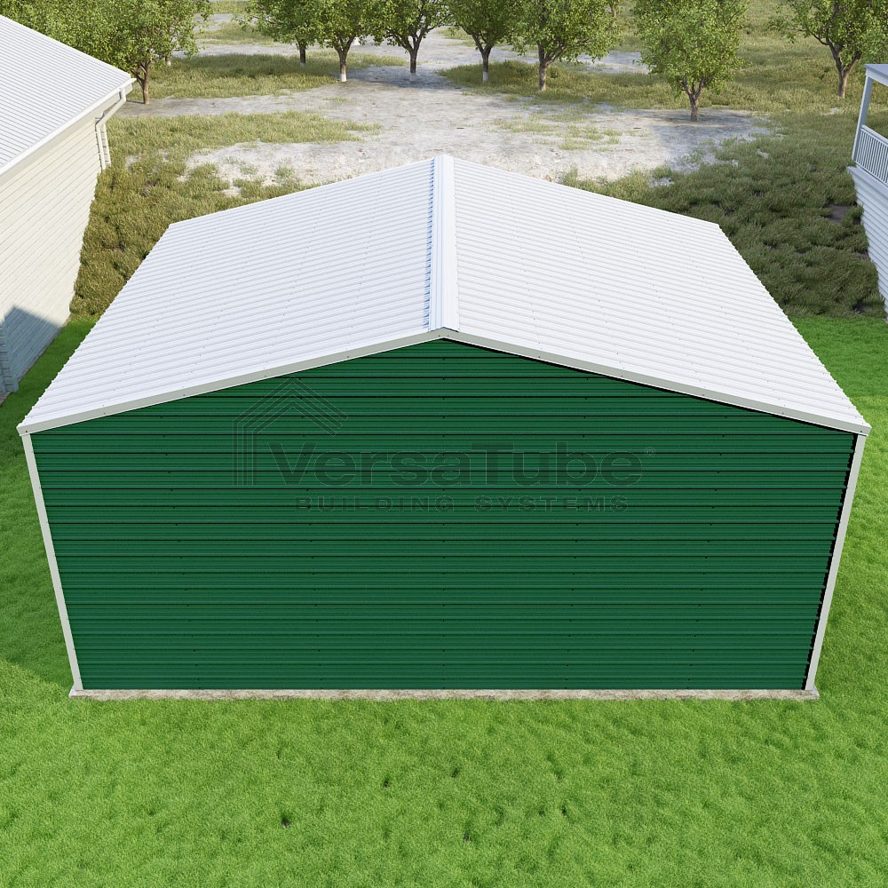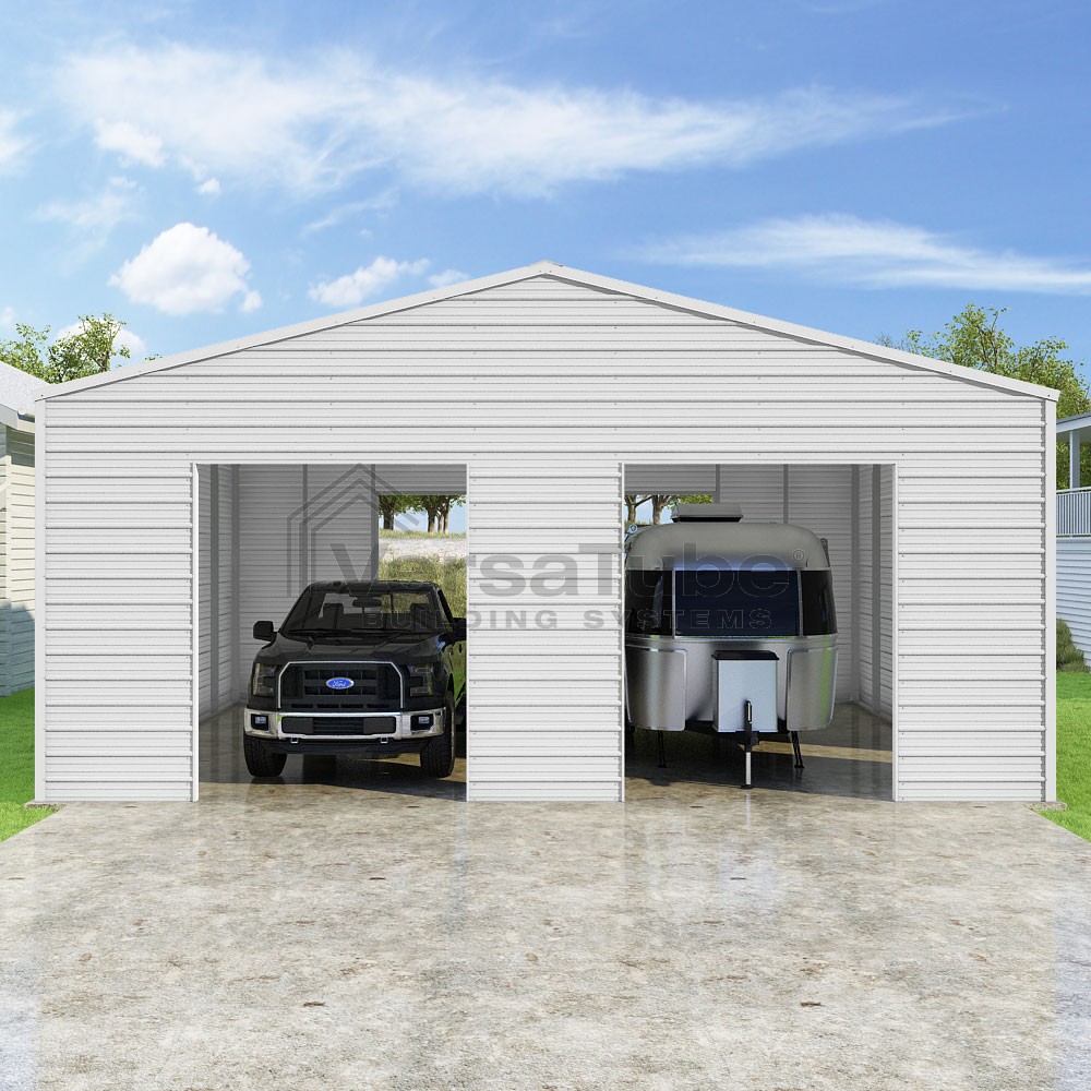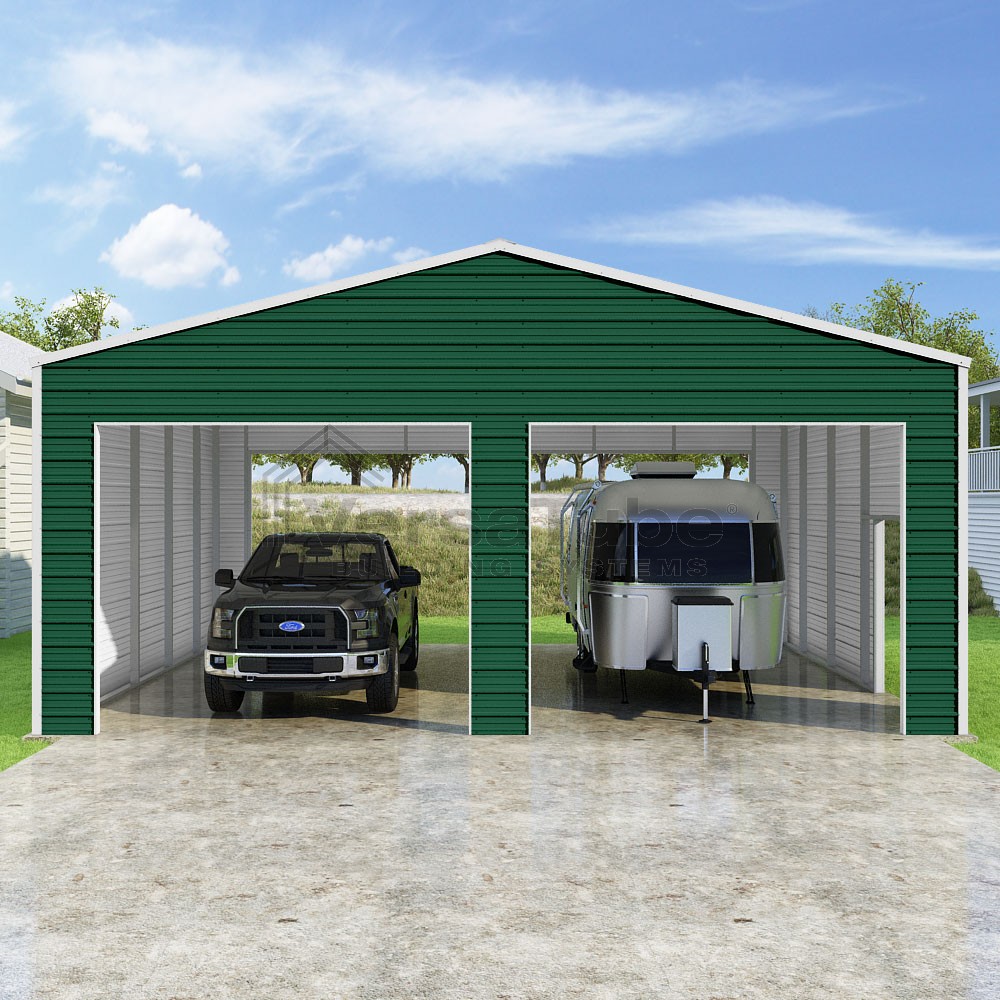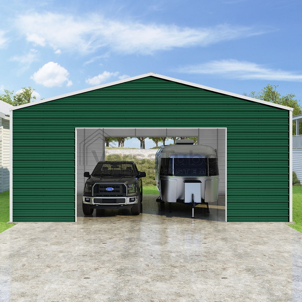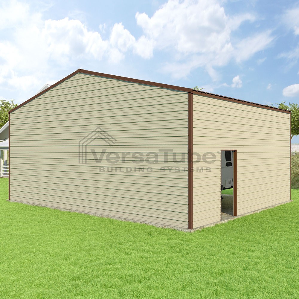 Frontier Series DIY garage kit features vertical sheet metal roof panels with horizontal siding panels..
