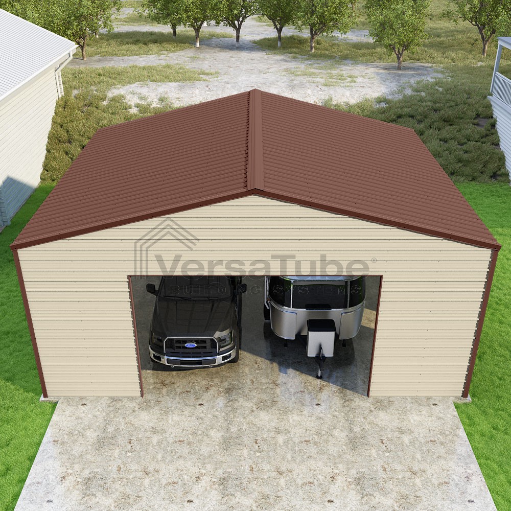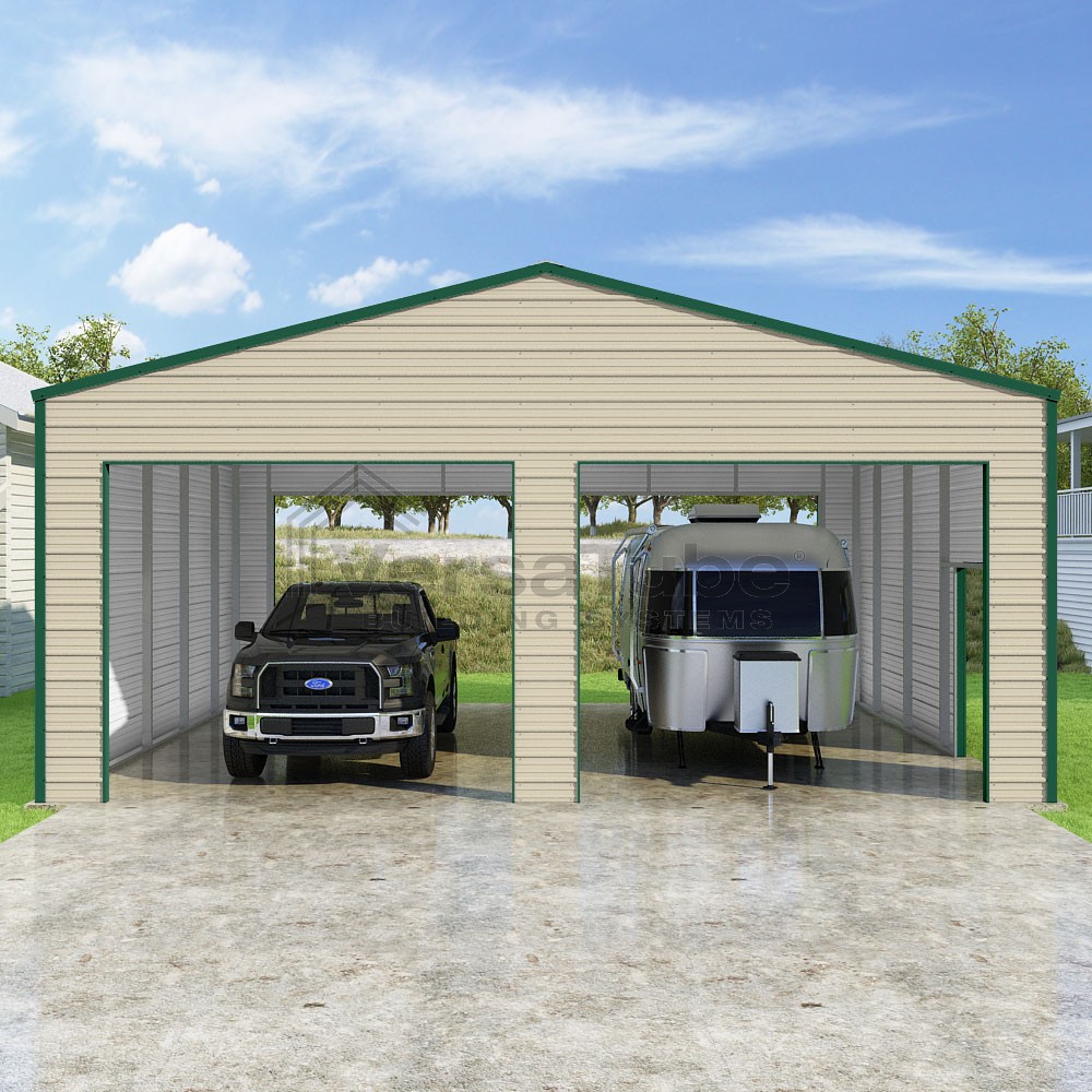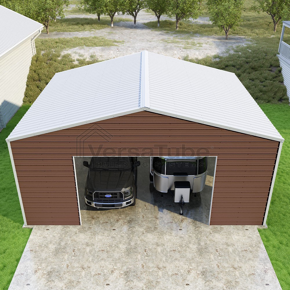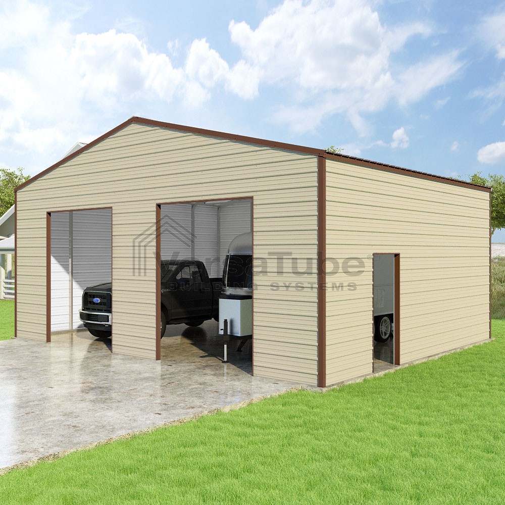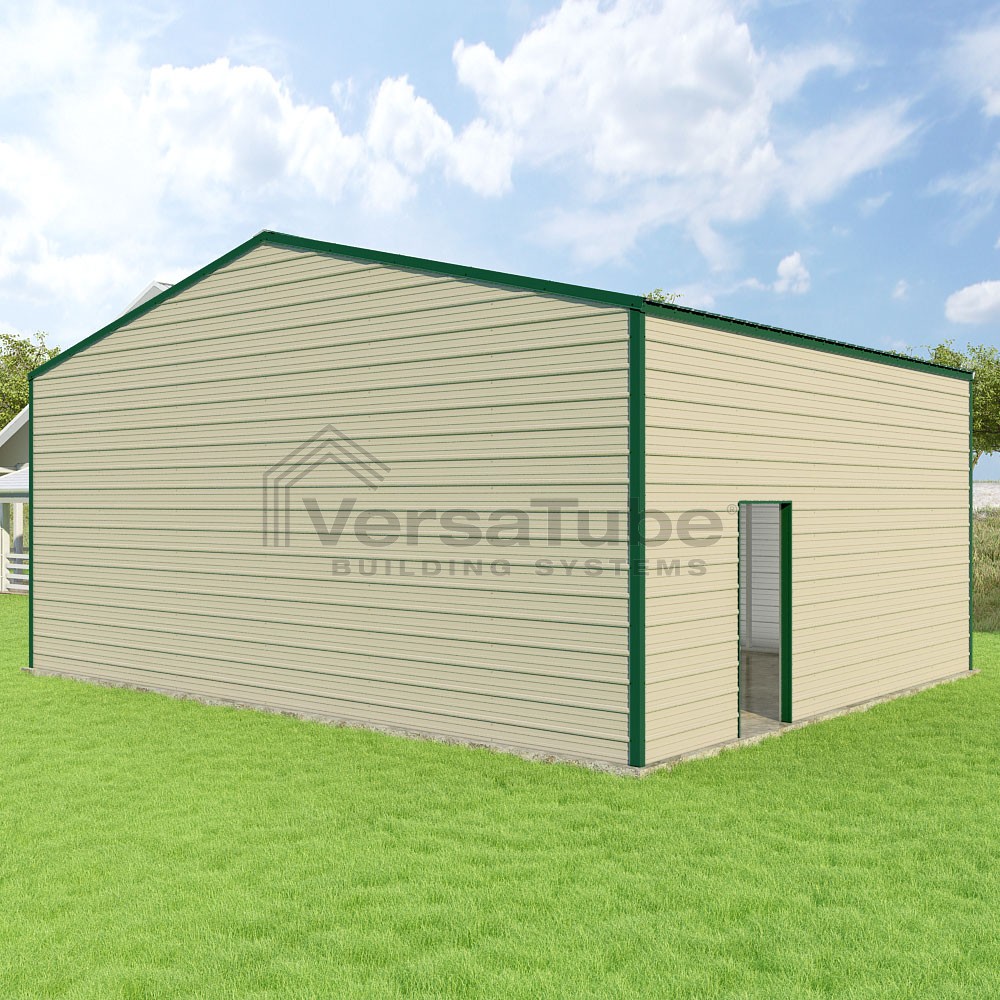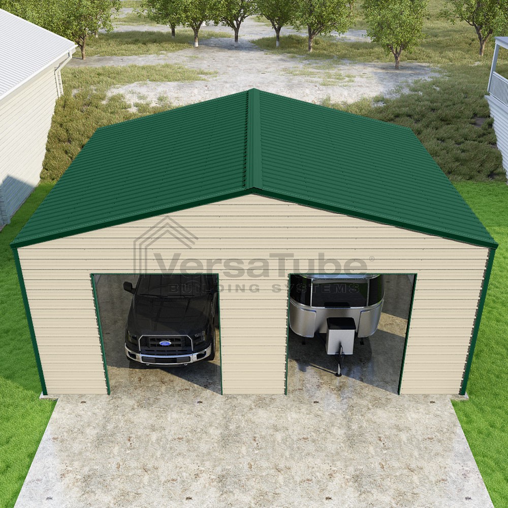 Frontier Series DIY garage kit features vertical sheet metal roof panels with horizontal siding panels..