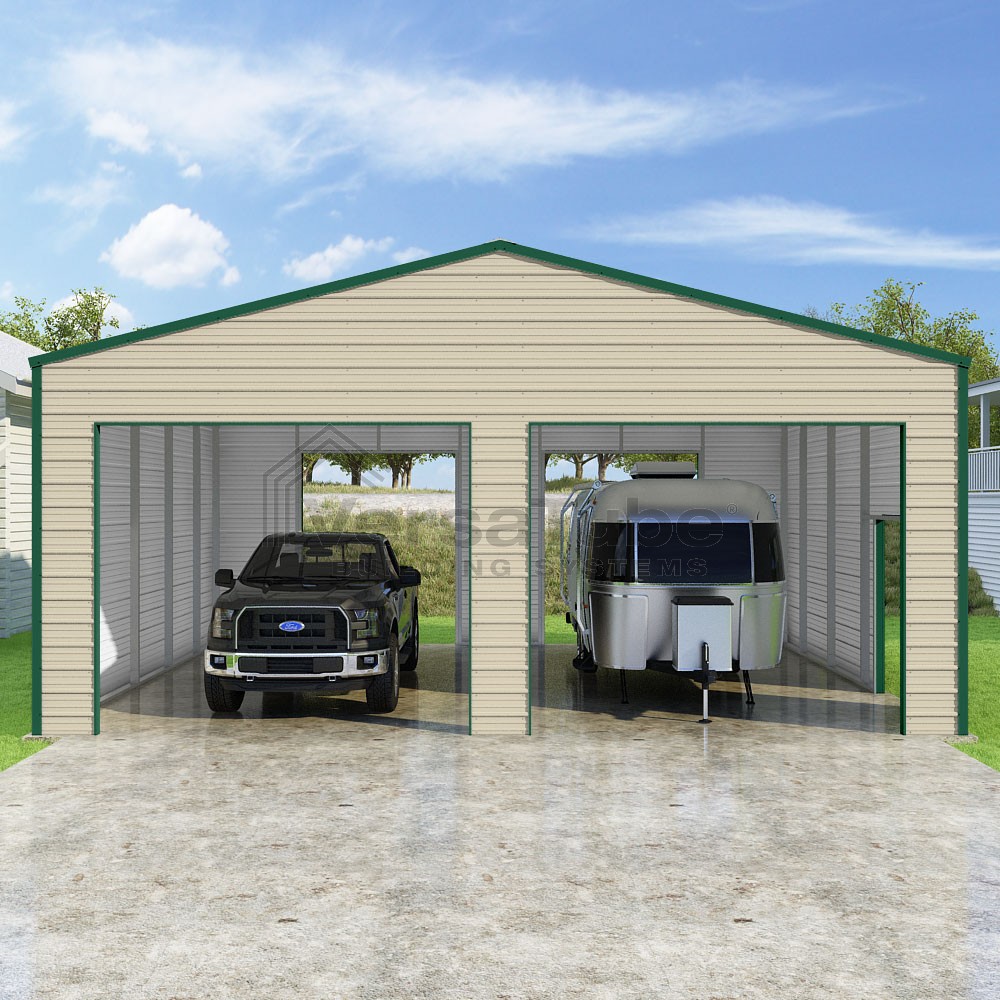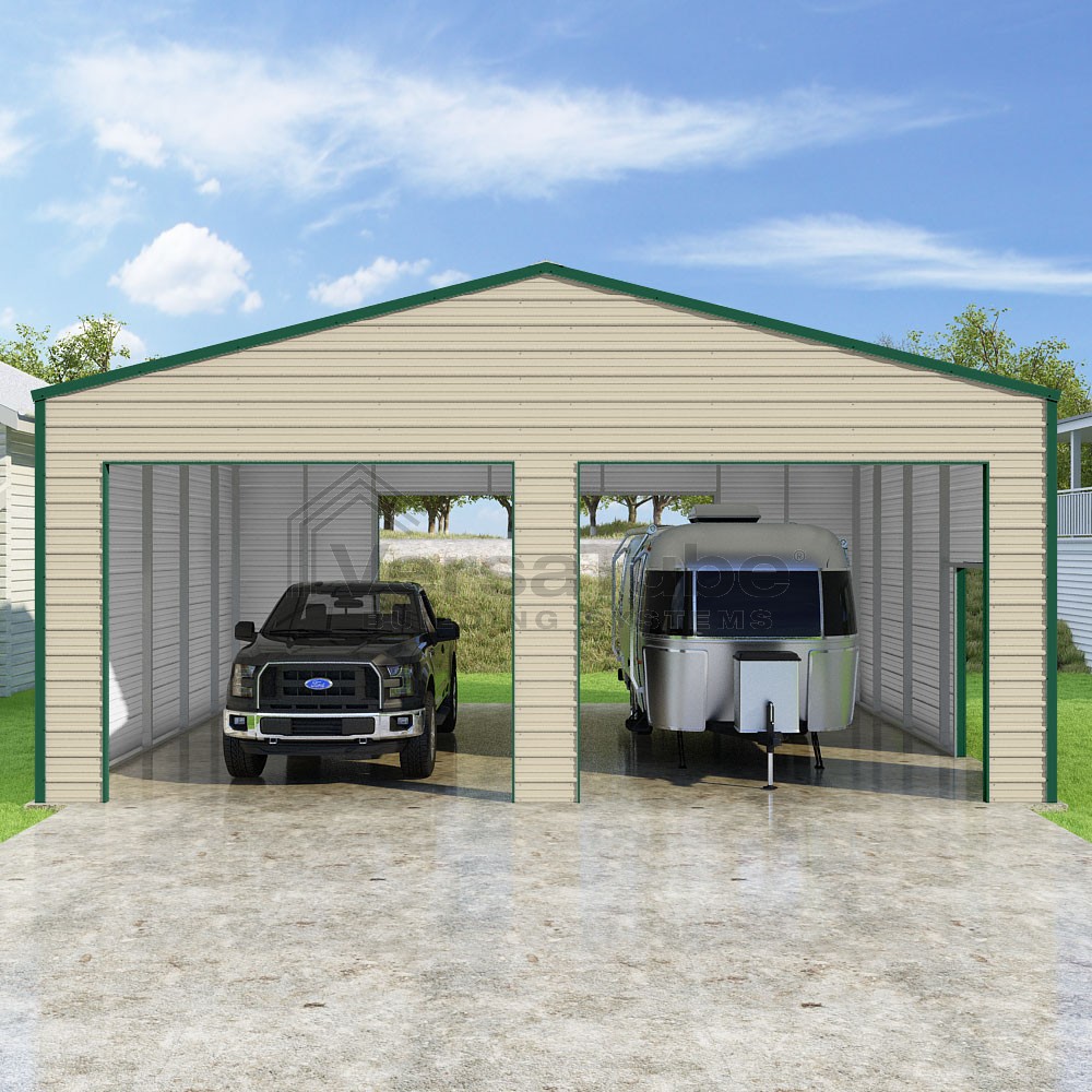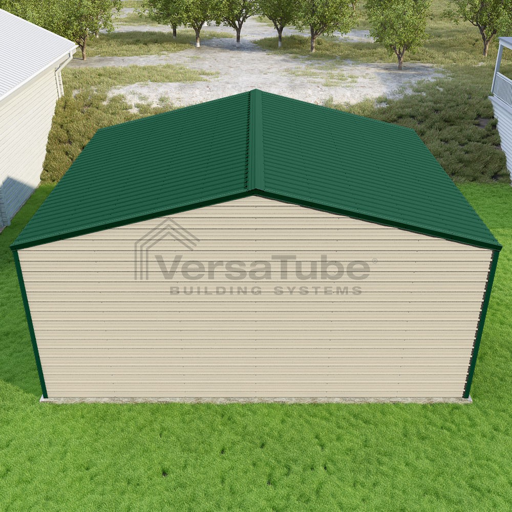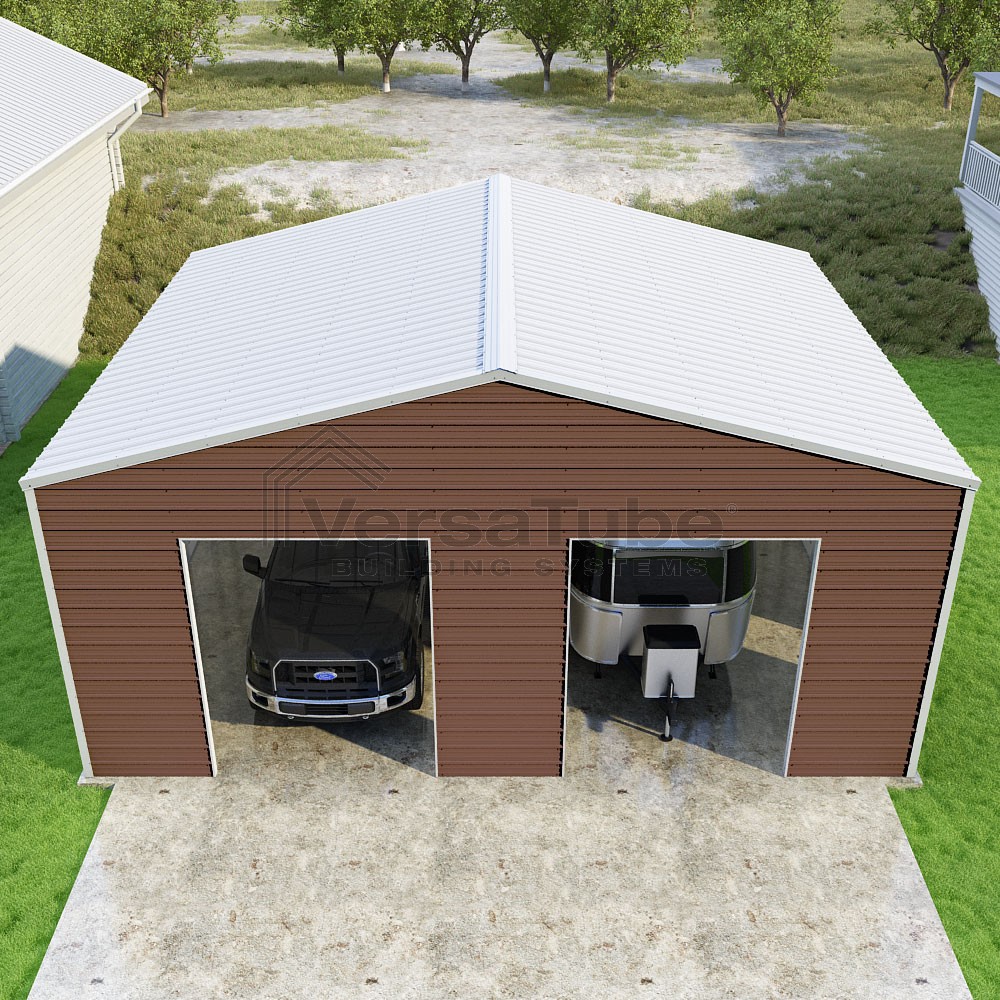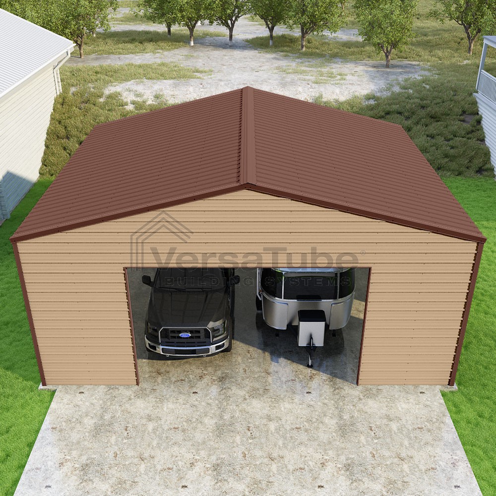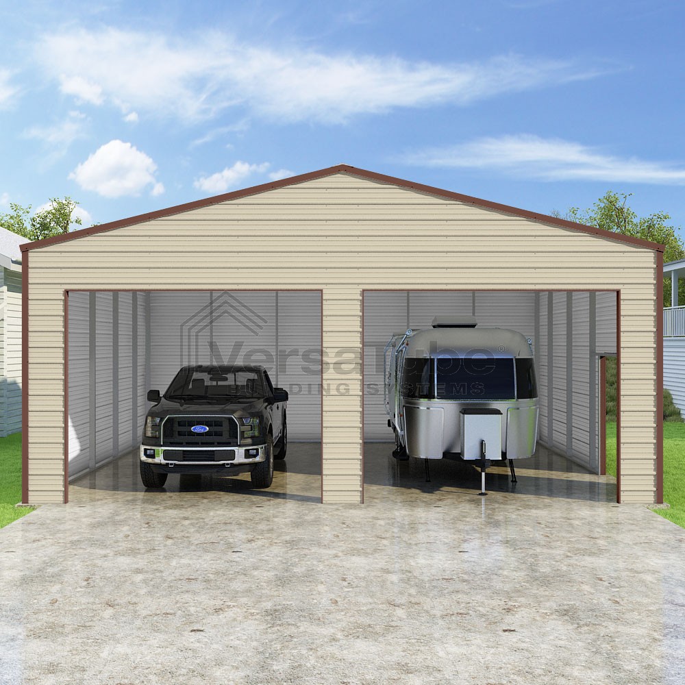 Frontier Series DIY garage kit features vertical sheet metal roof panels with horizontal siding panels..