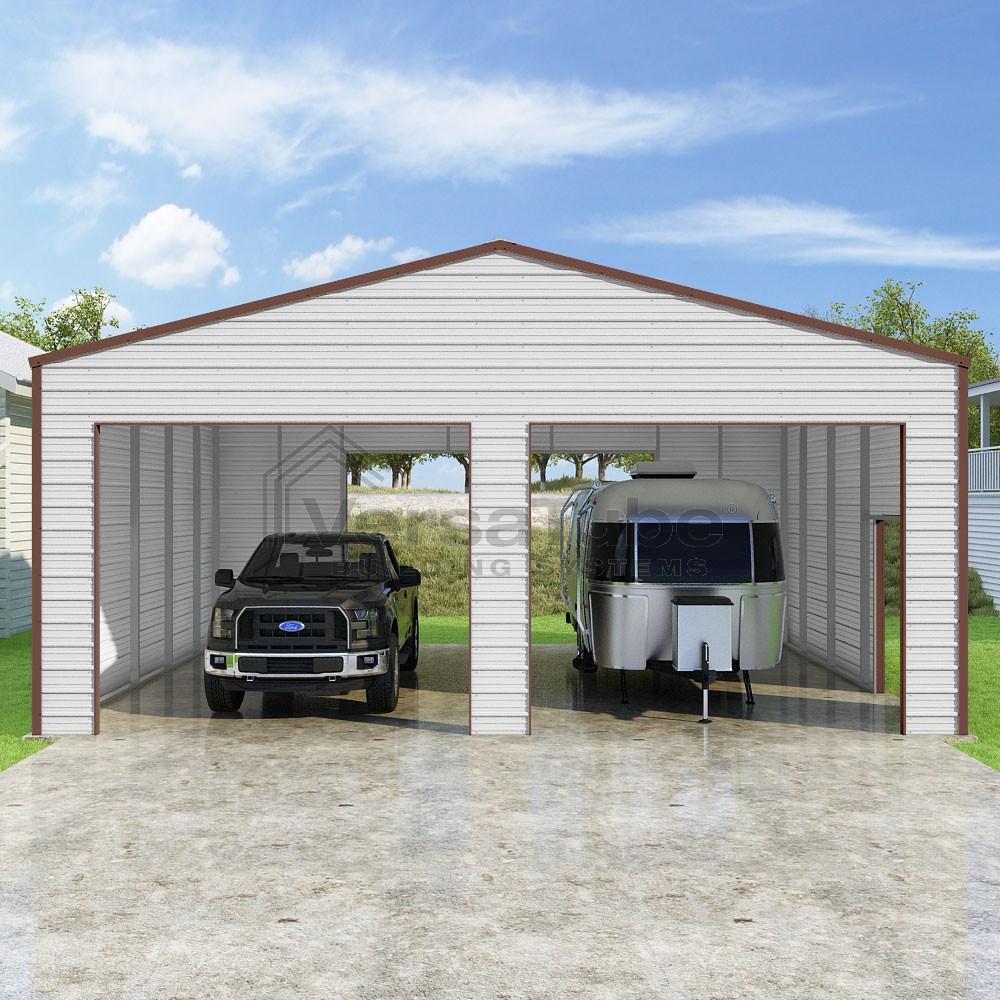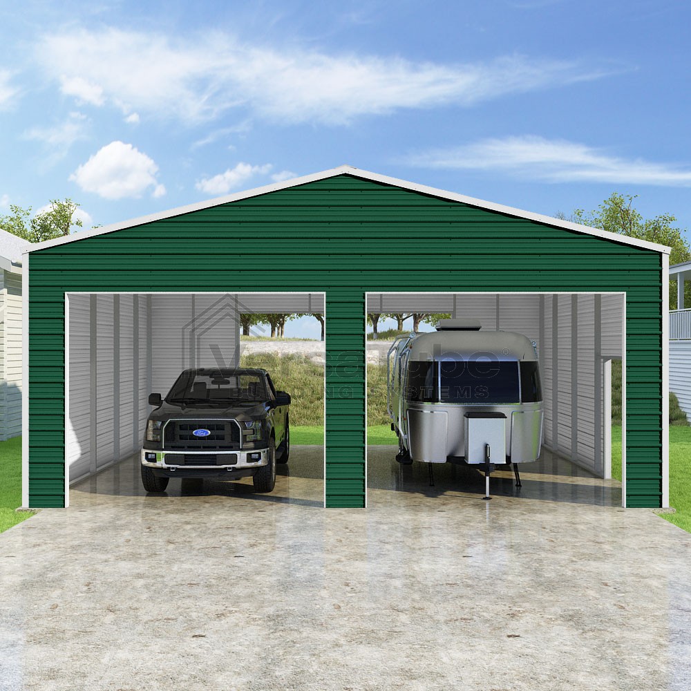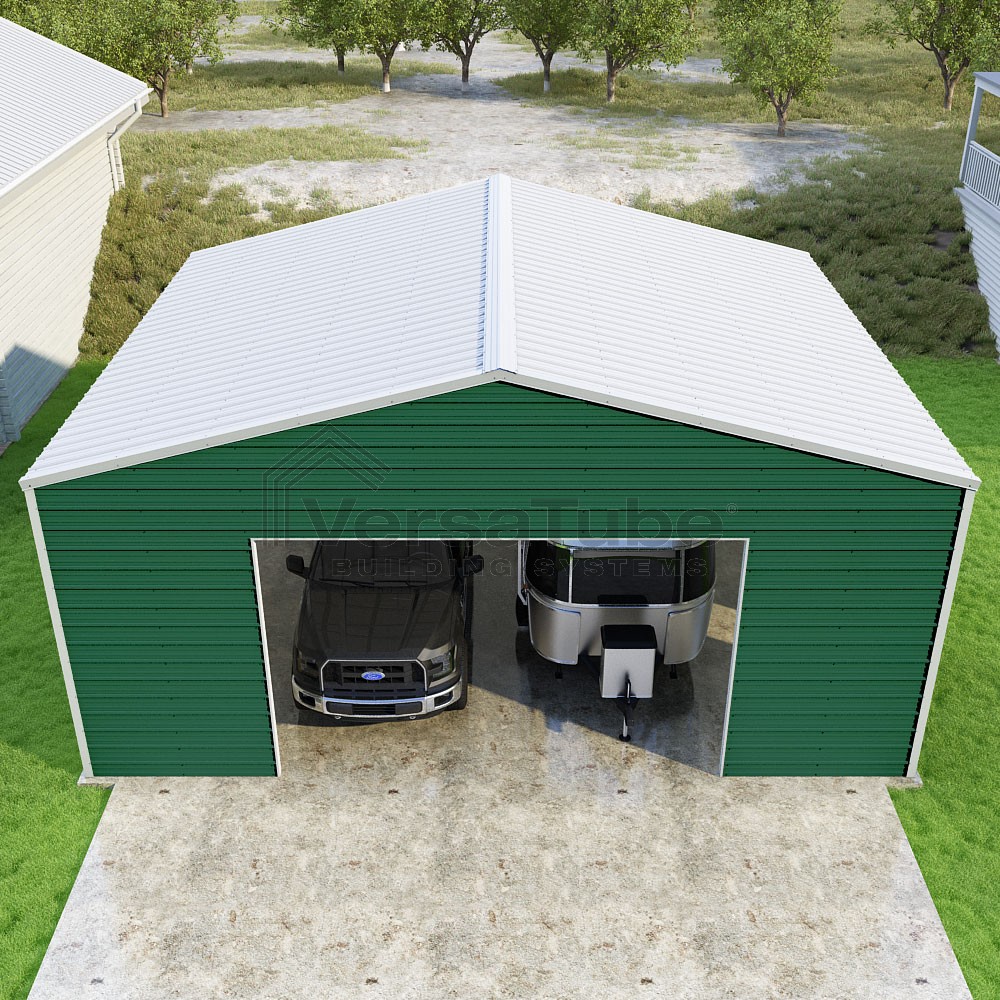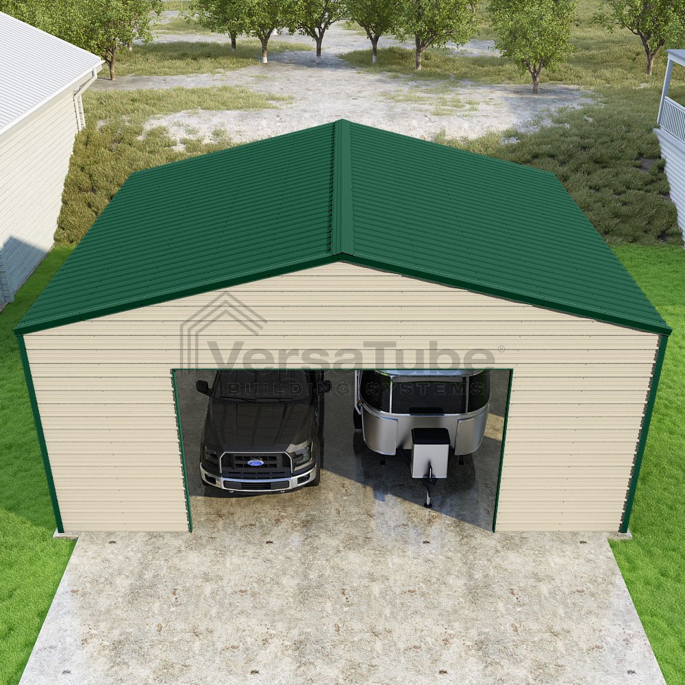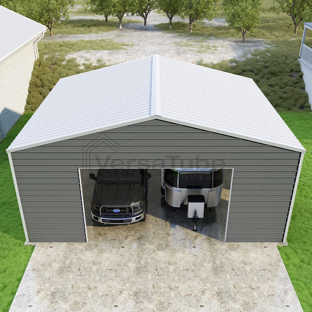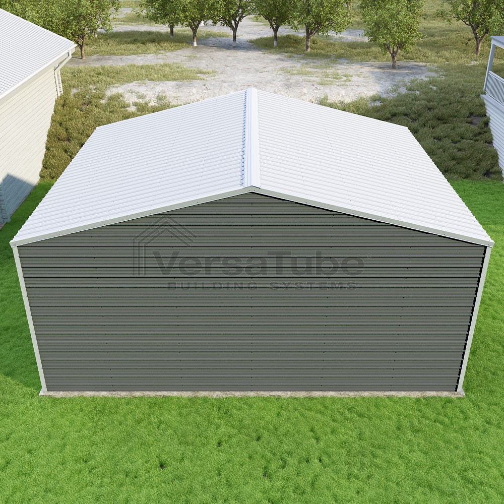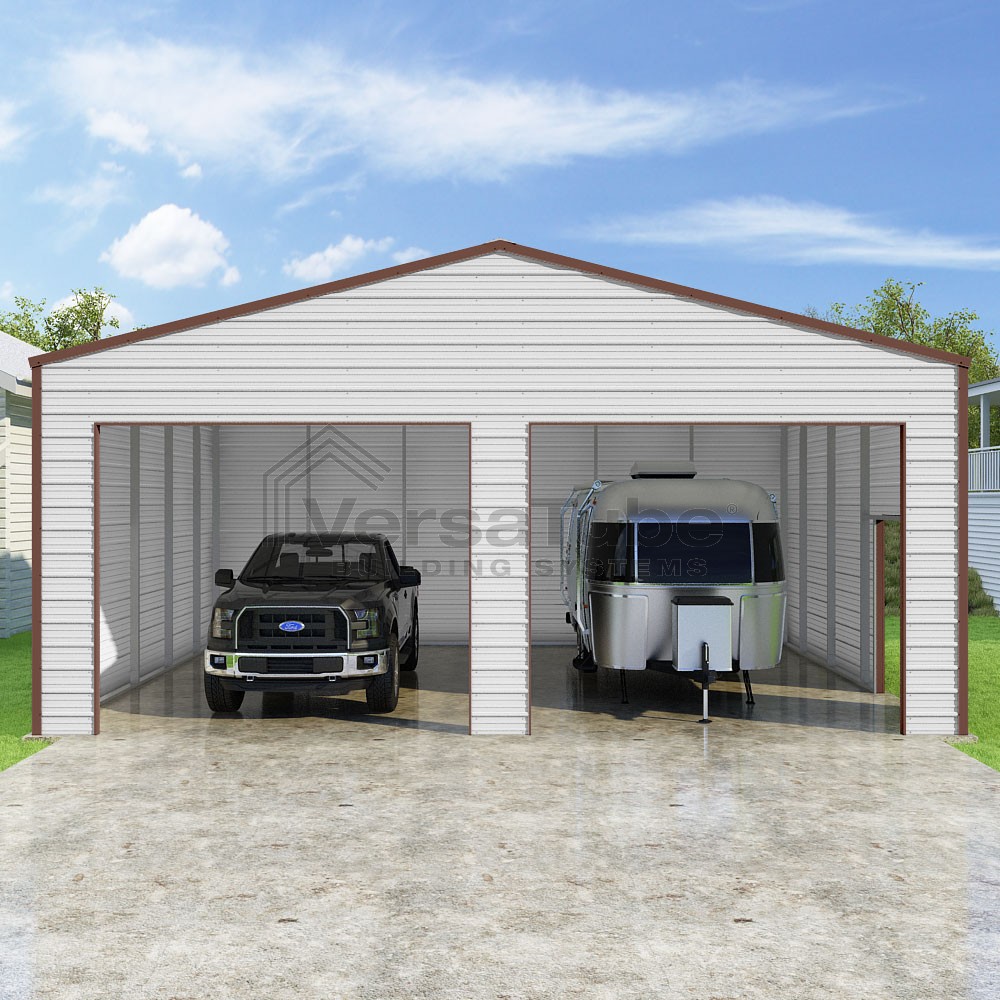 Frontier Series DIY garage kit features vertical sheet metal roof panels with horizontal siding panels..