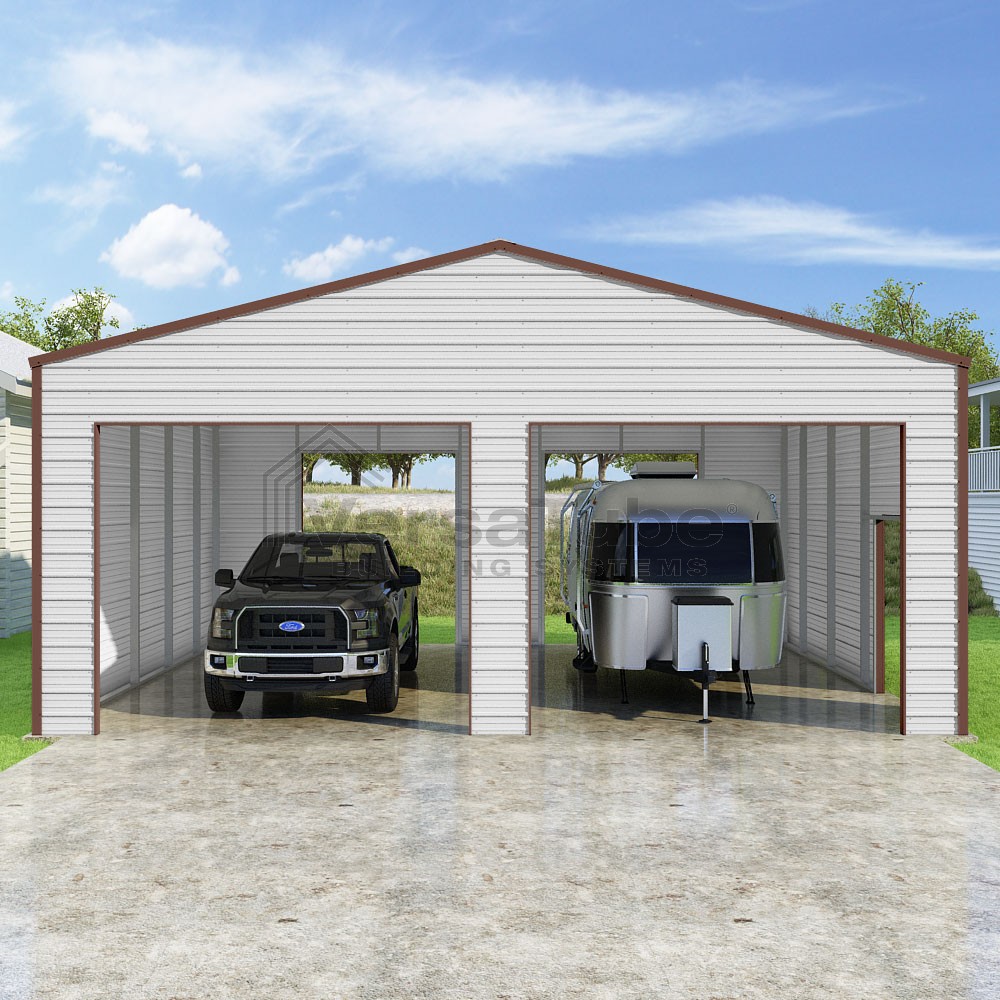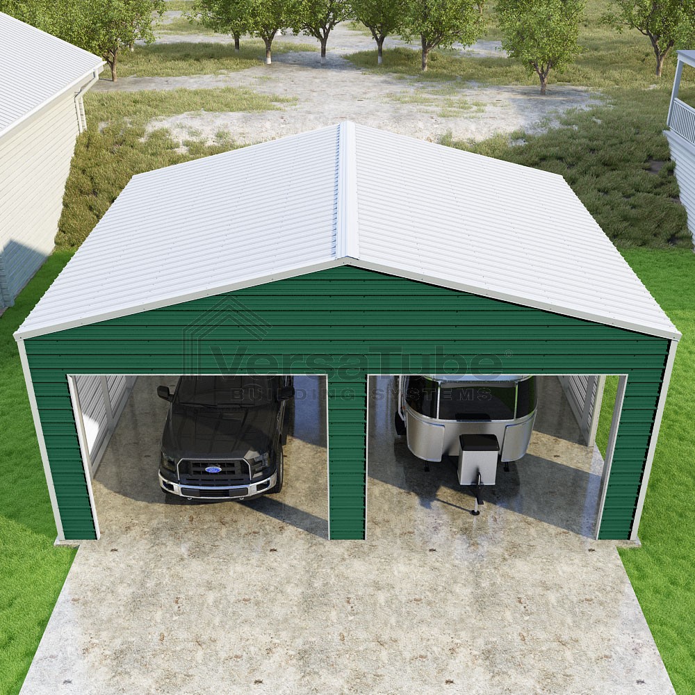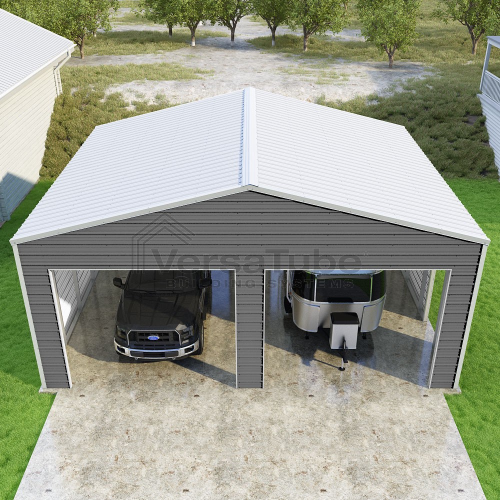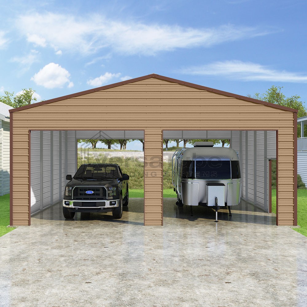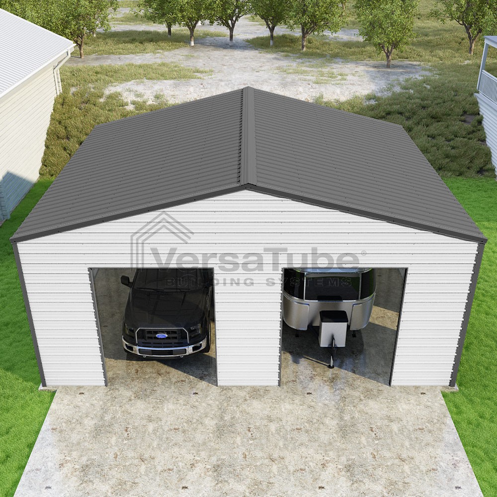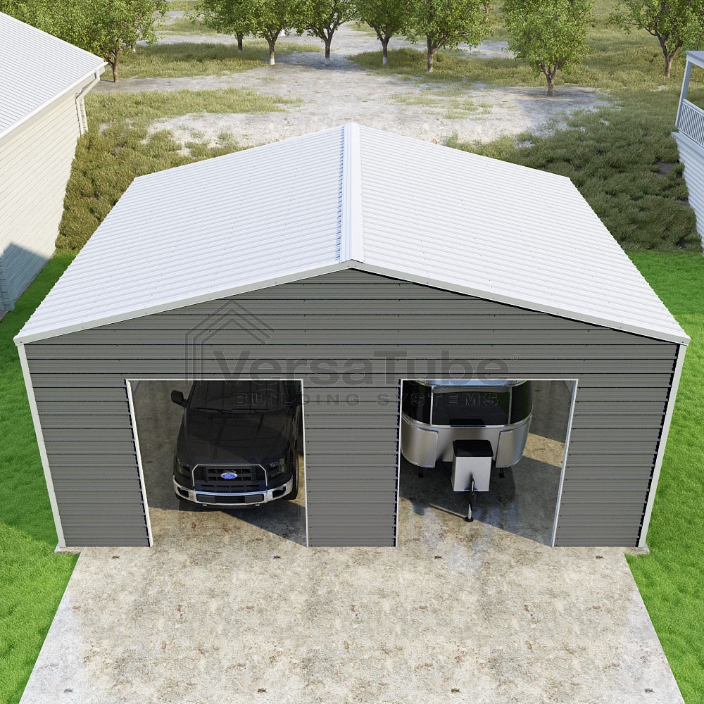 Frontier Series DIY garage kit features vertical sheet metal roof panels with horizontal siding panels..