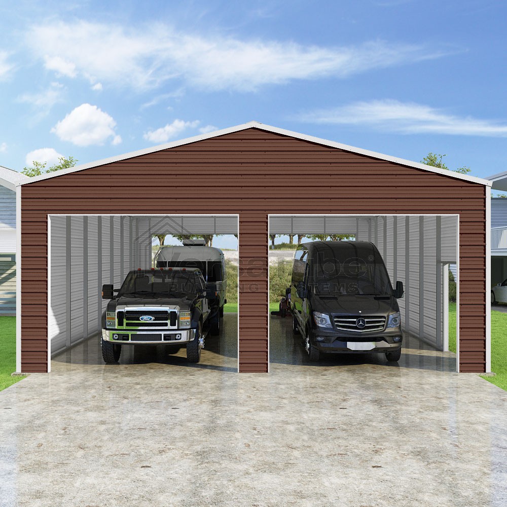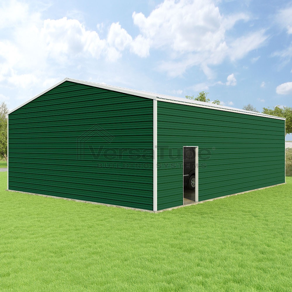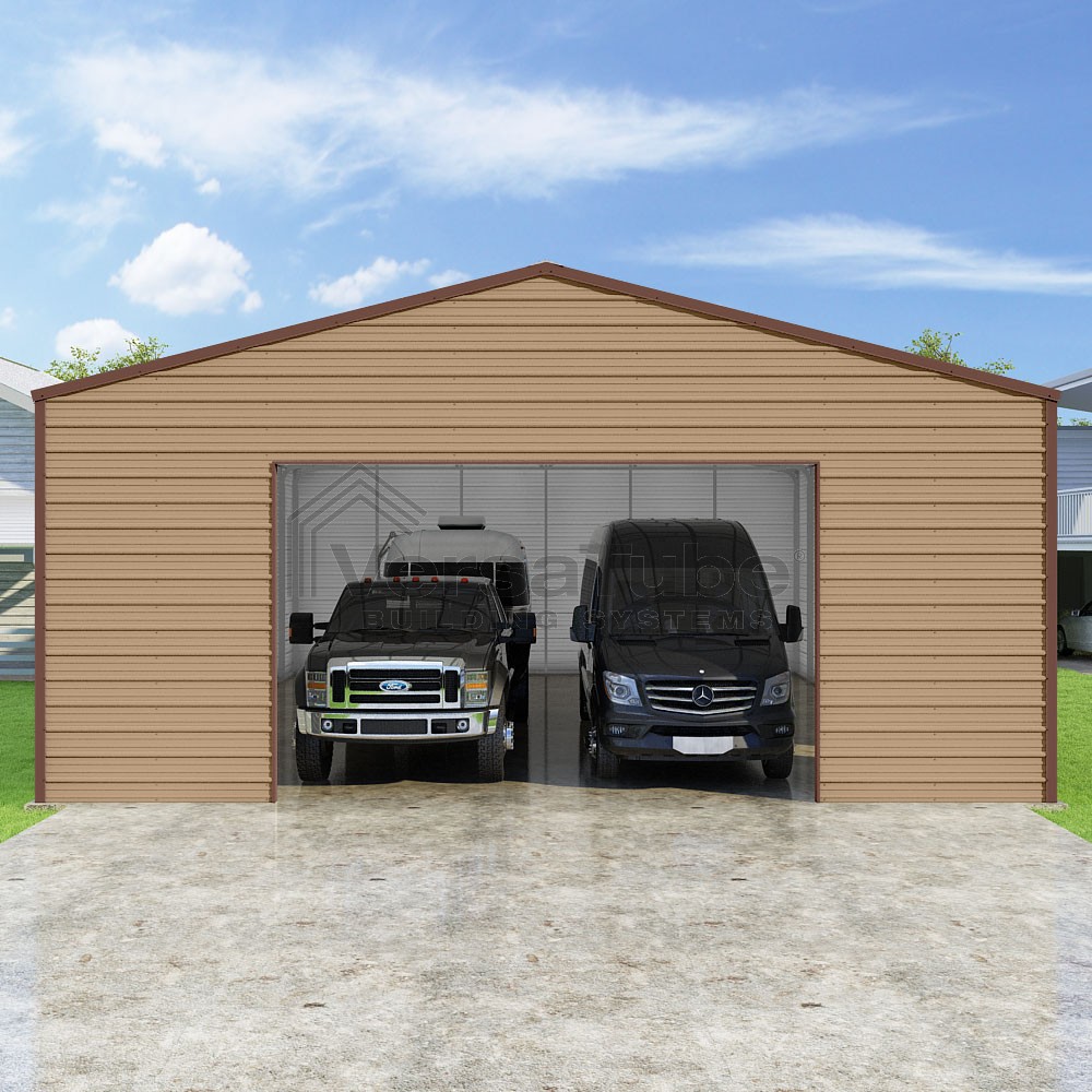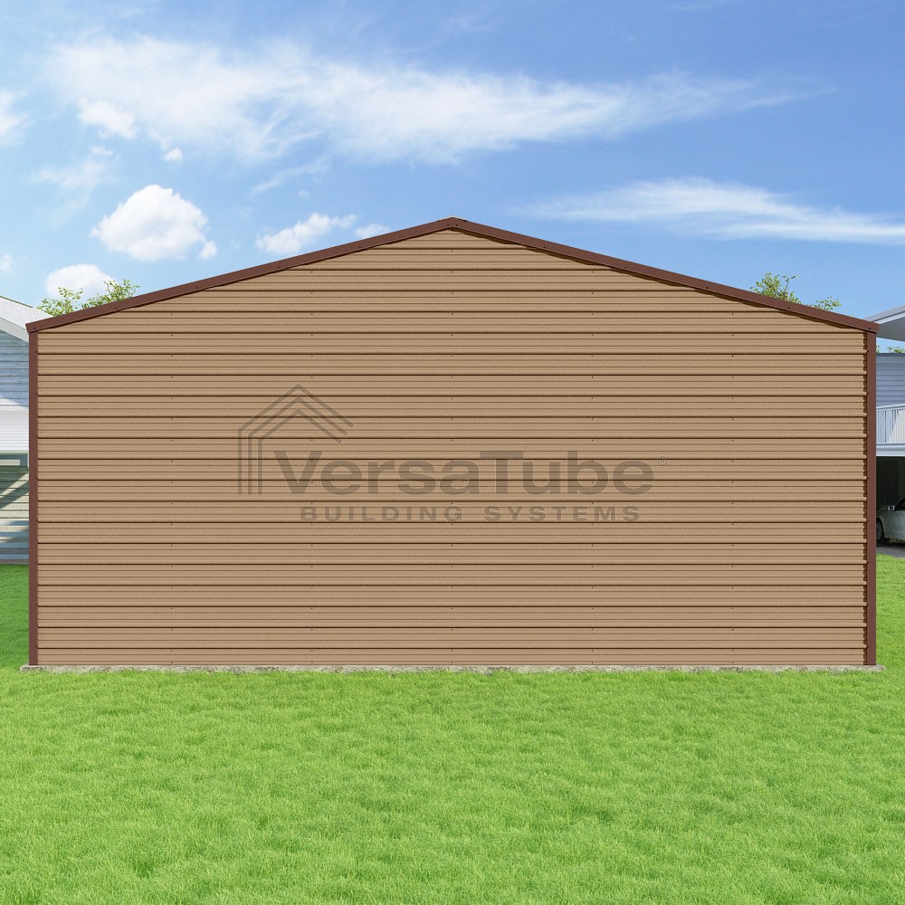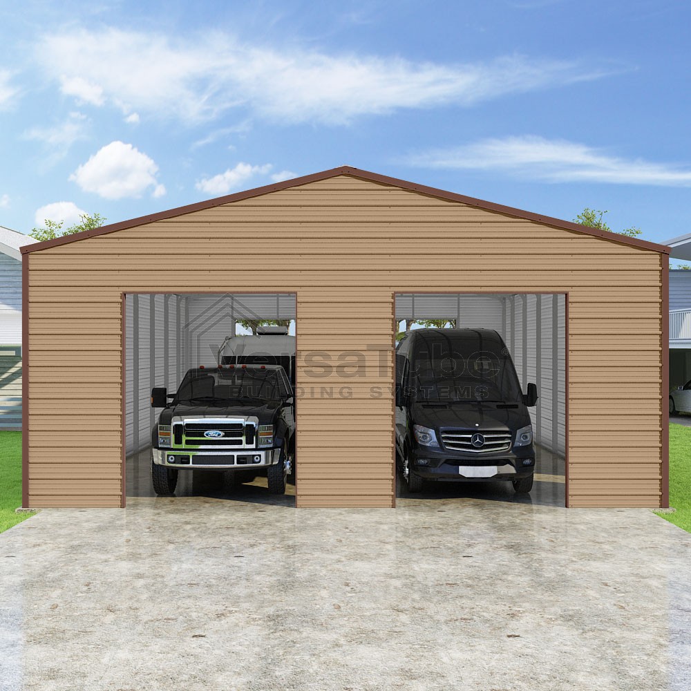 Frontier Series DIY garage kit features vertical sheet metal roof panels with horizontal siding panels..