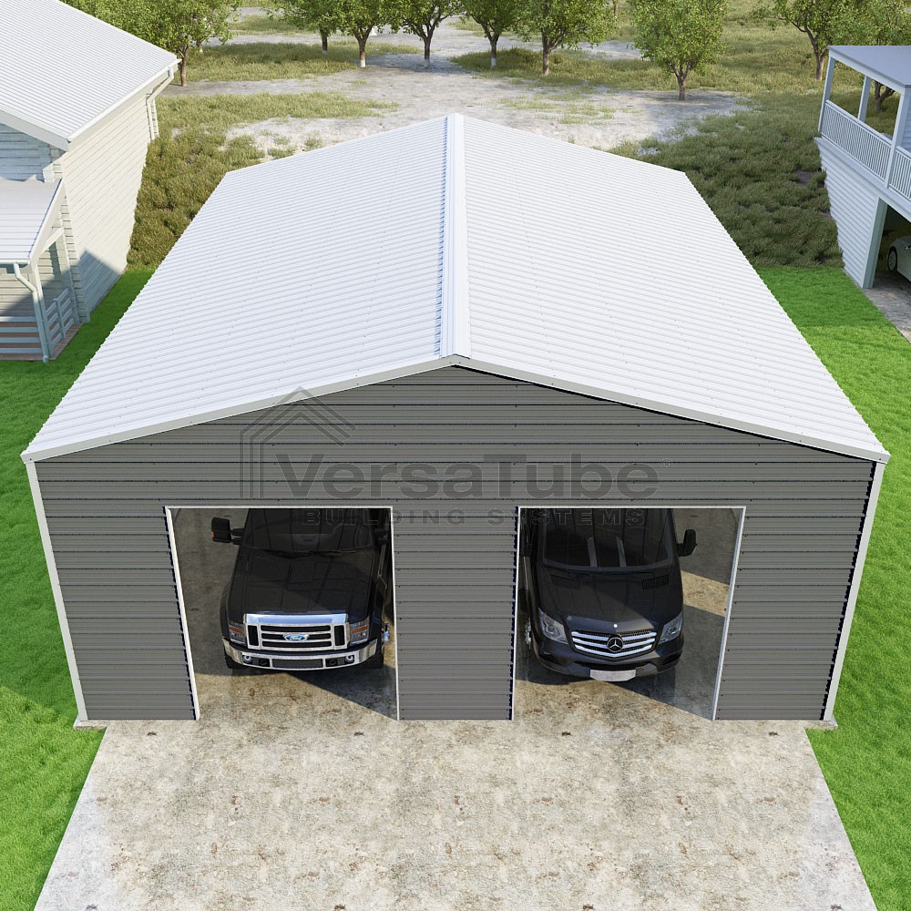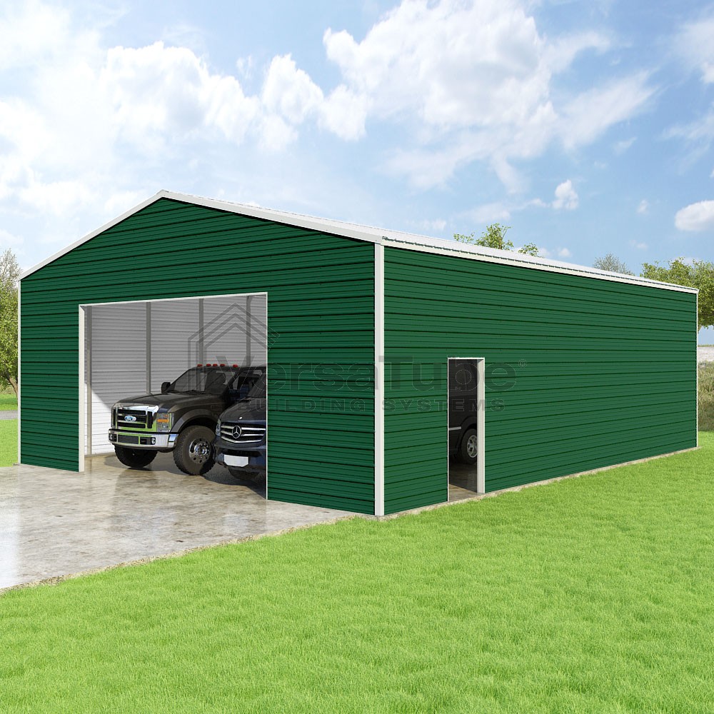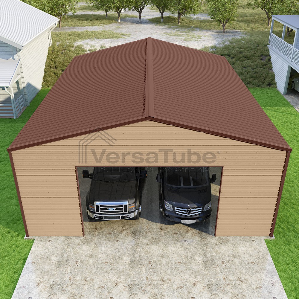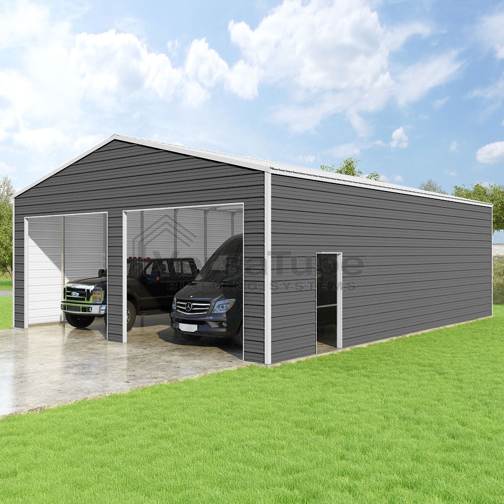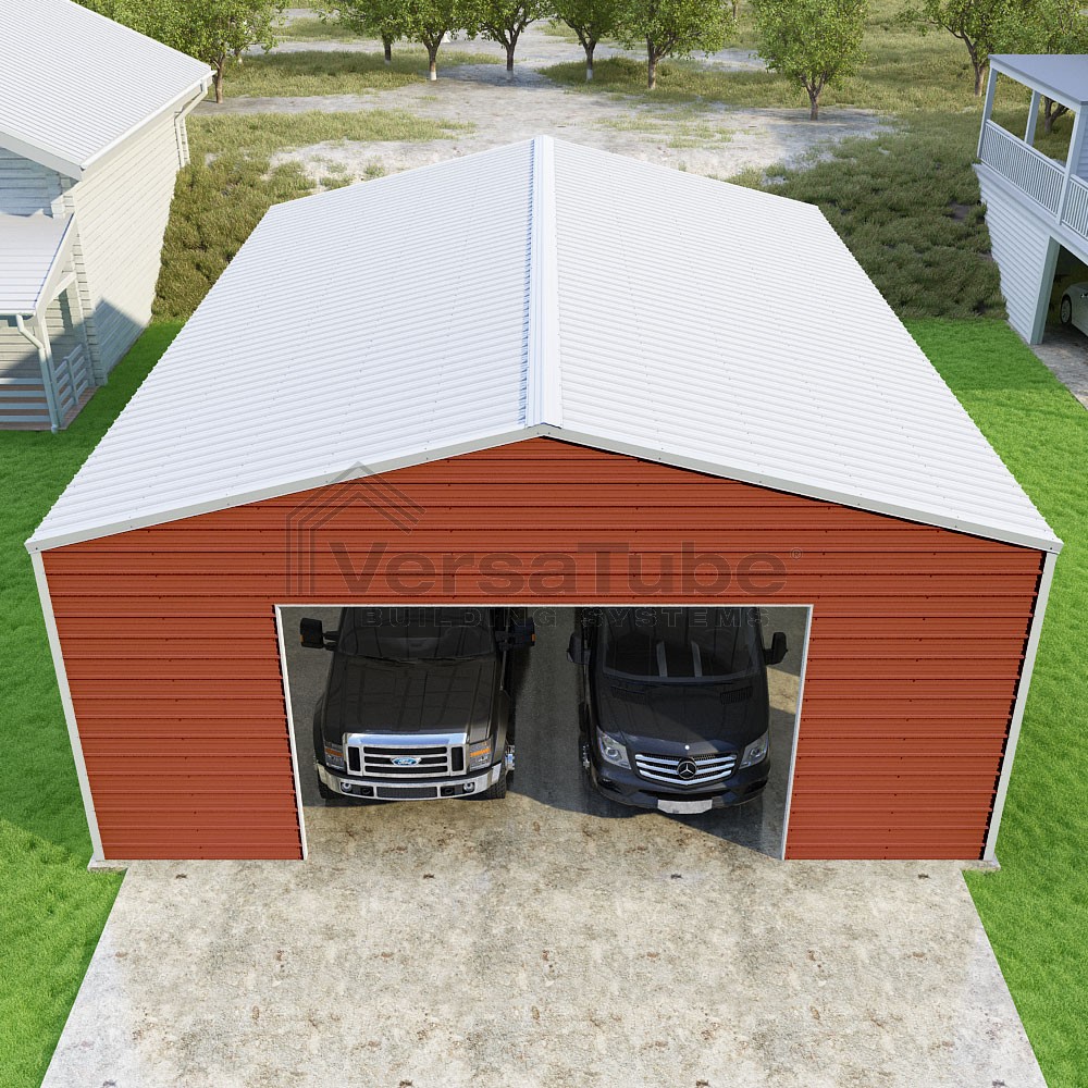 Frontier Series DIY garage kit features vertical sheet metal roof panels with horizontal siding panels..