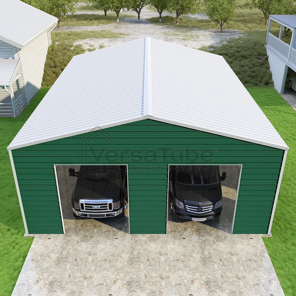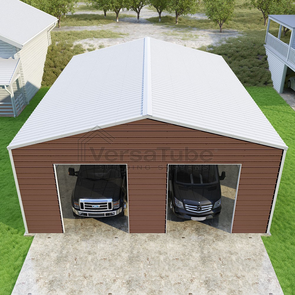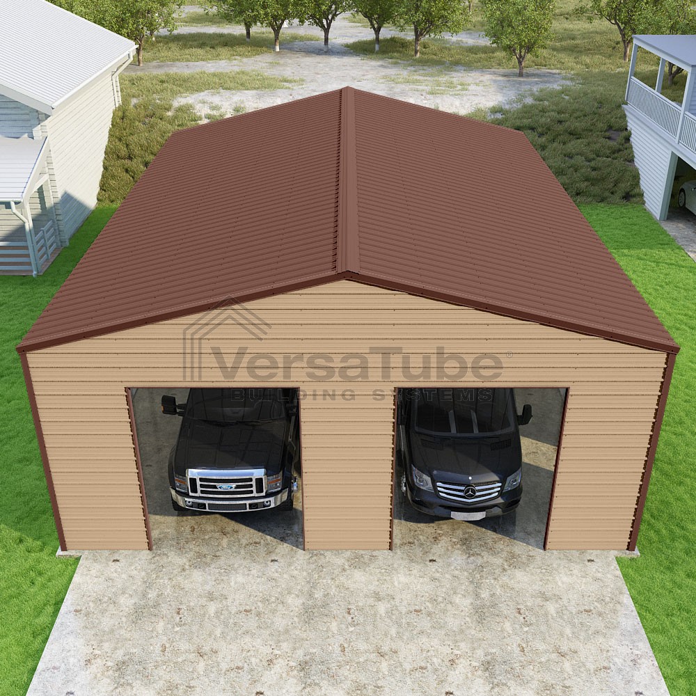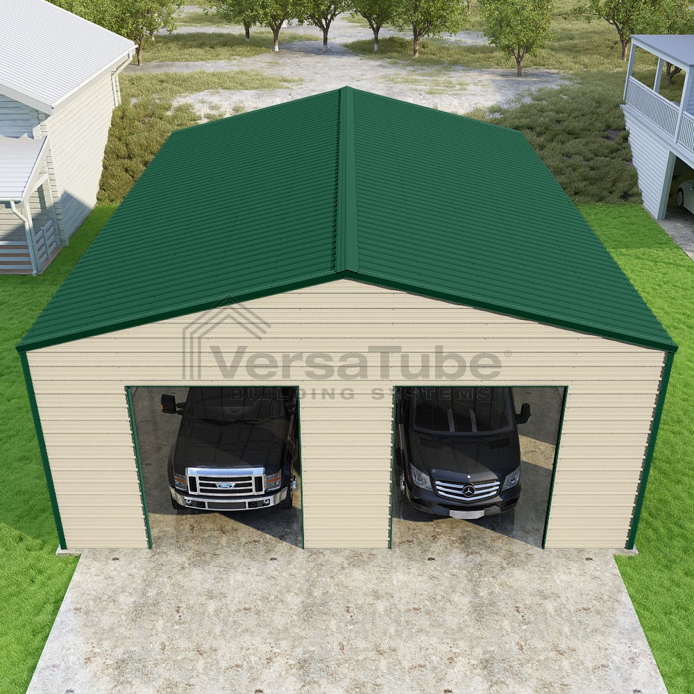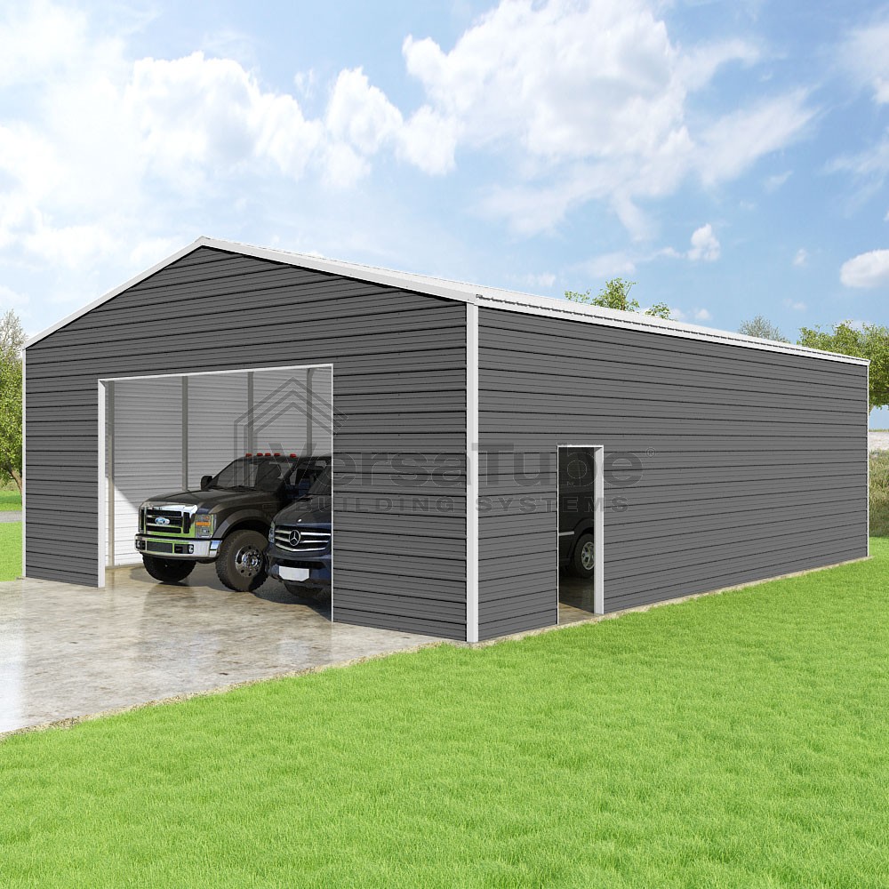 Frontier Series DIY garage kit features vertical sheet metal roof panels with horizontal siding panels..