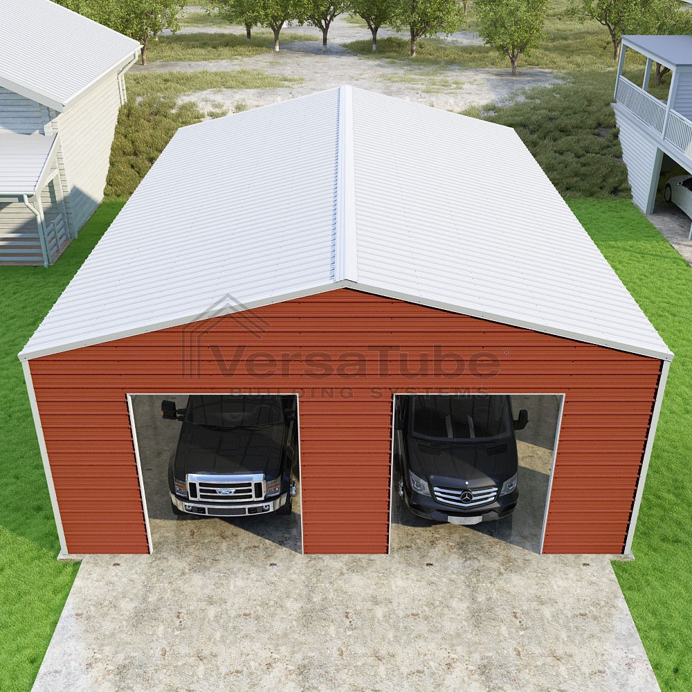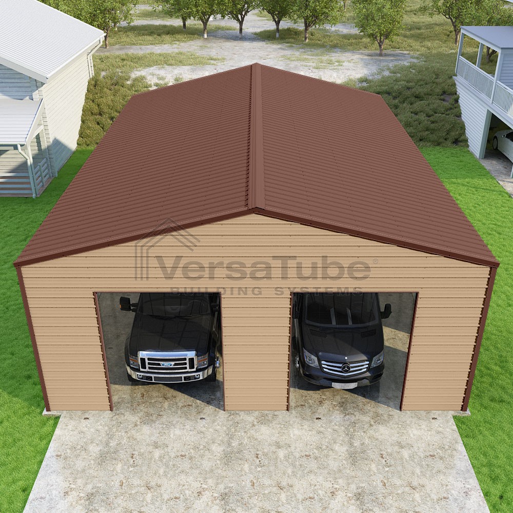 Frontier Series DIY garage kit features vertical sheet metal roof panels with horizontal siding panels..