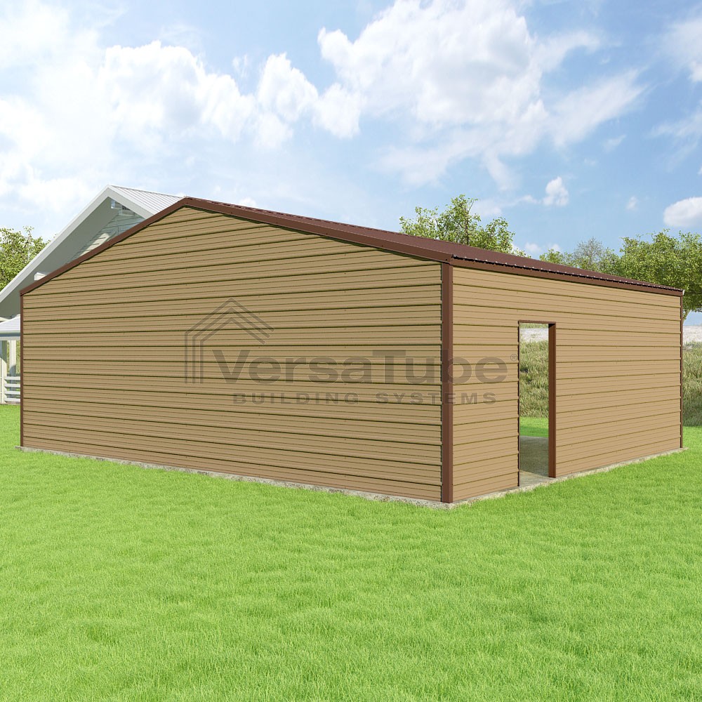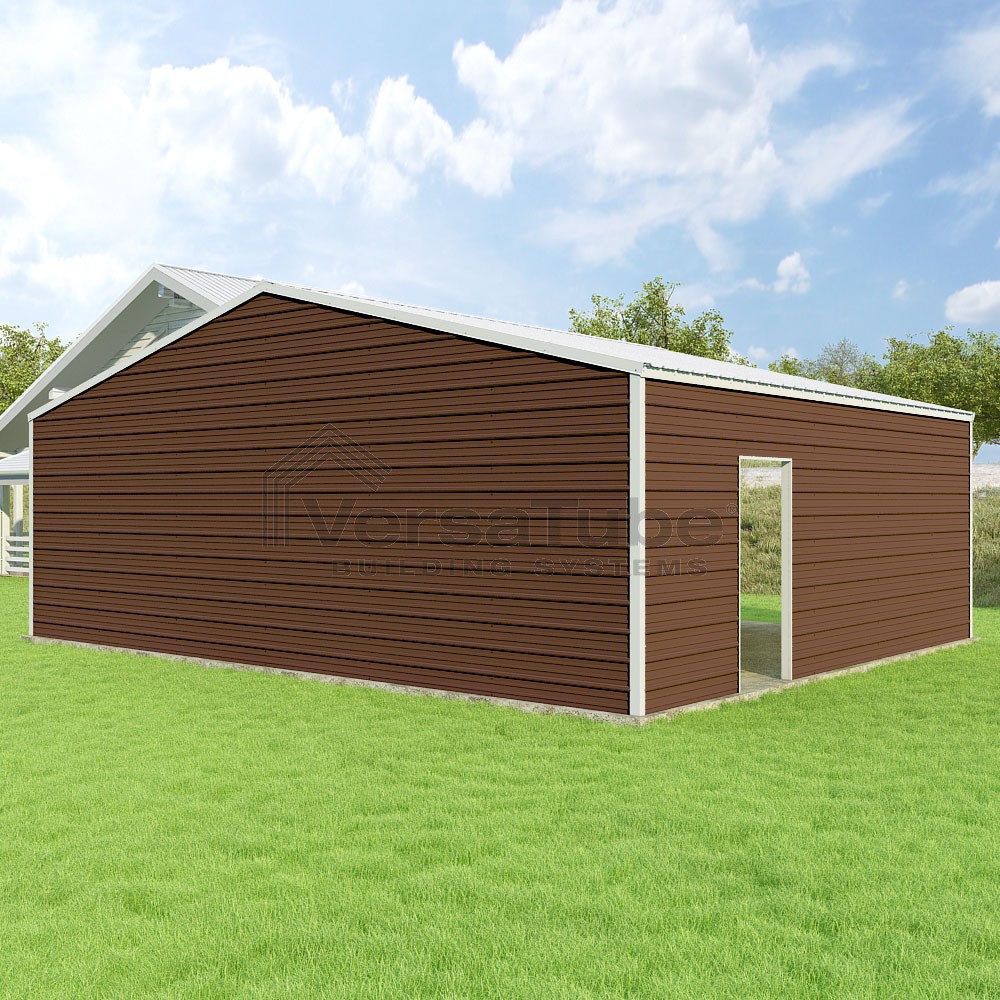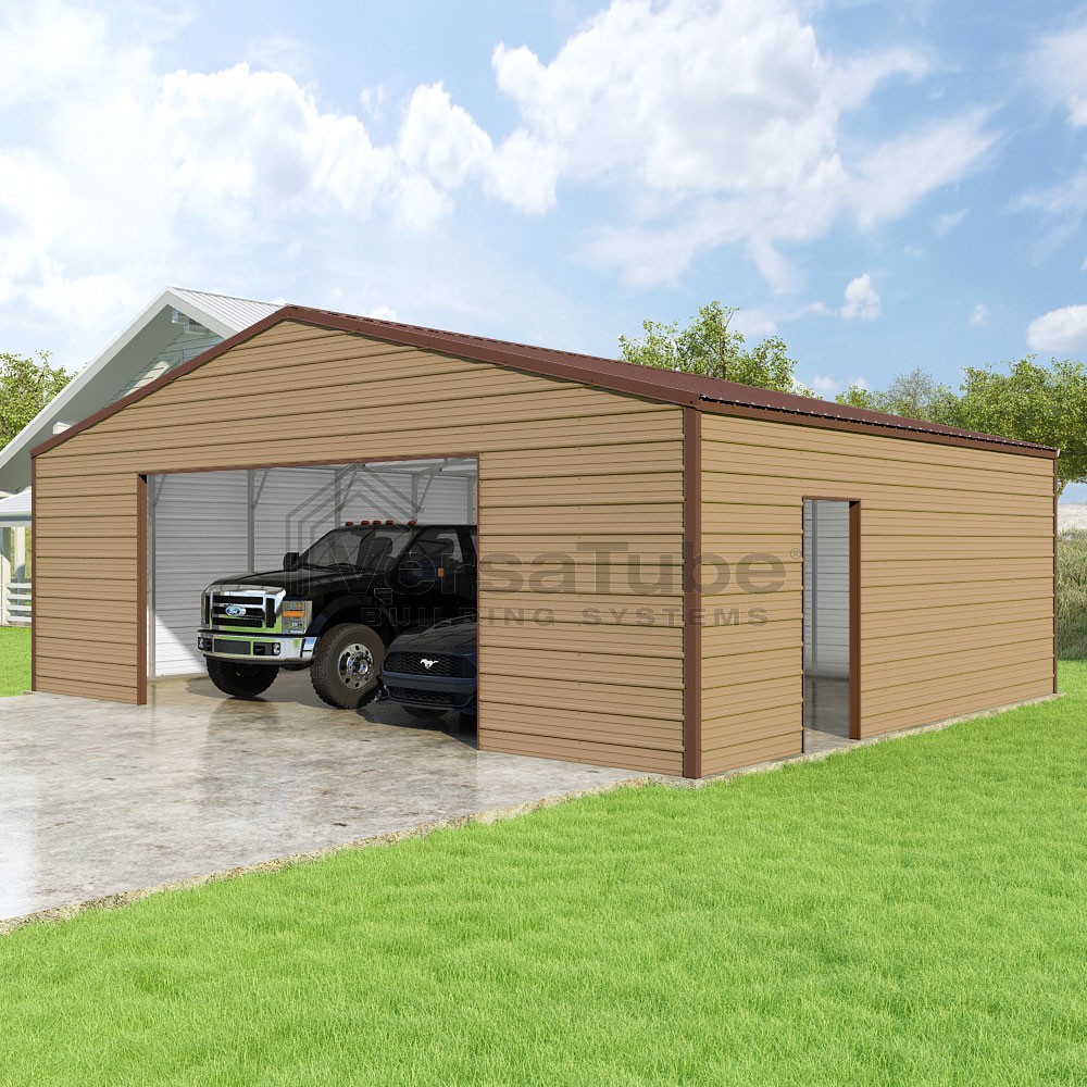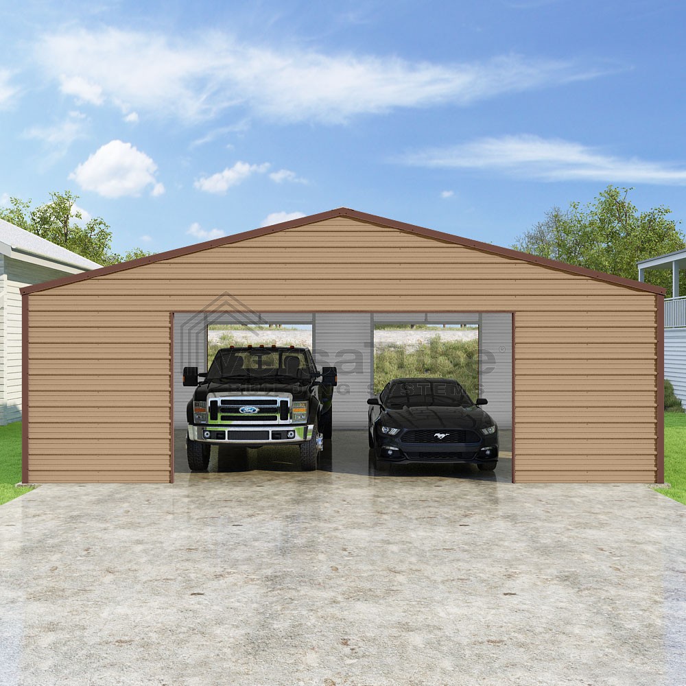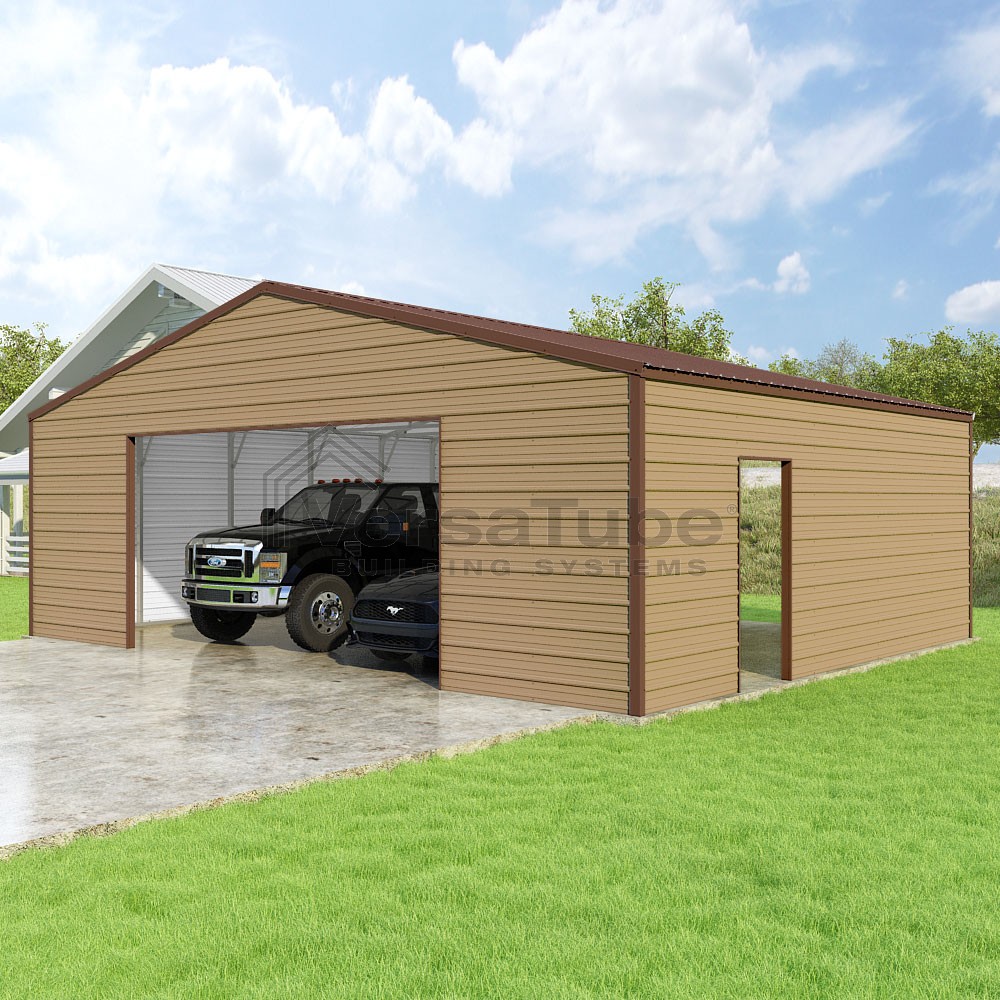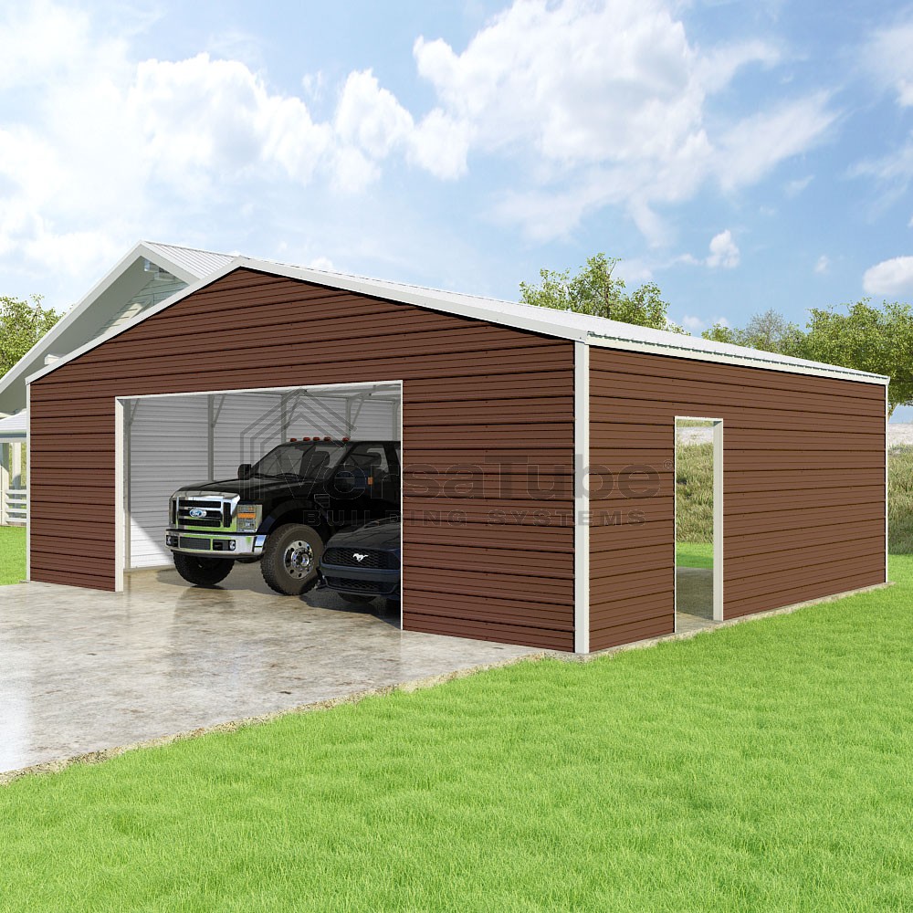 Frontier Series DIY garage kit features vertical sheet metal roof panels with horizontal siding panels..