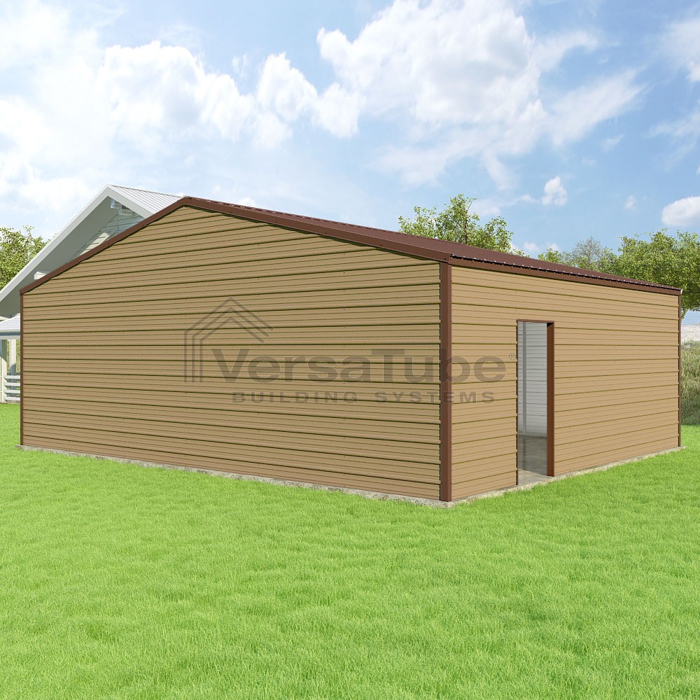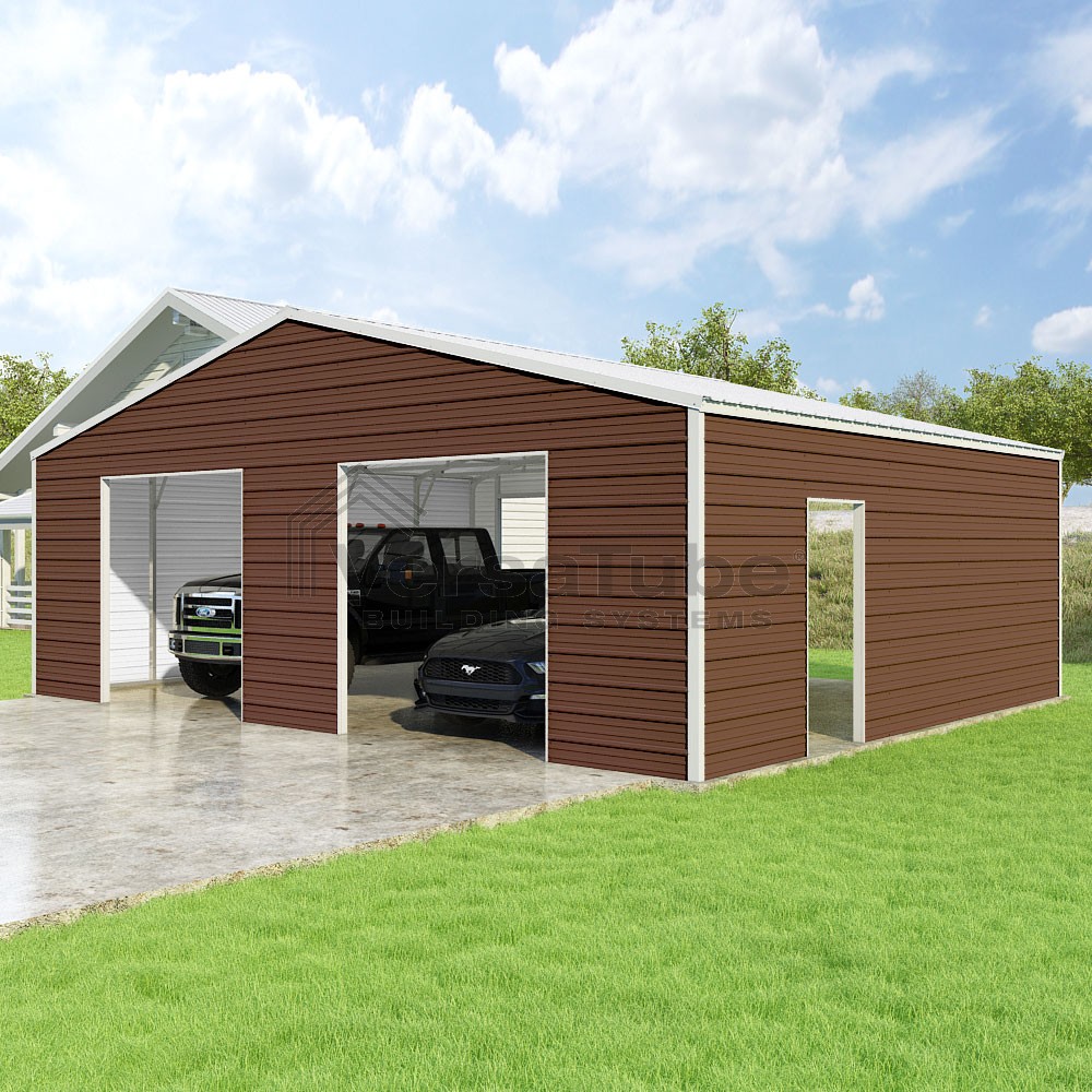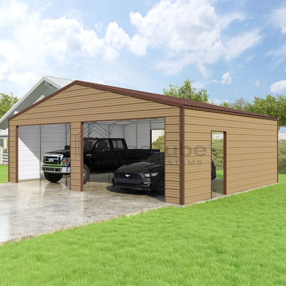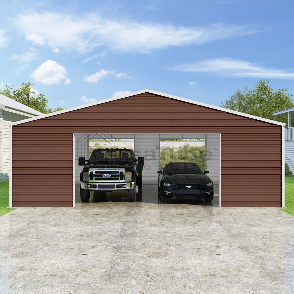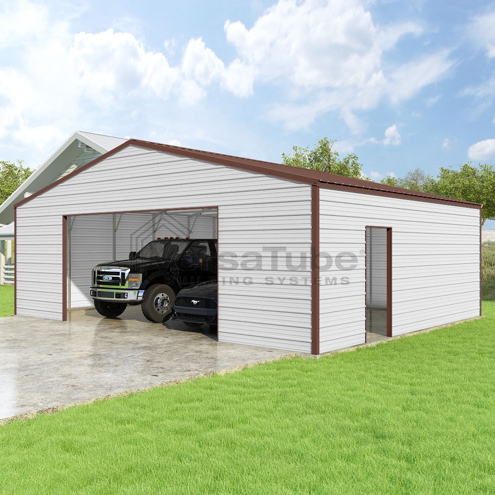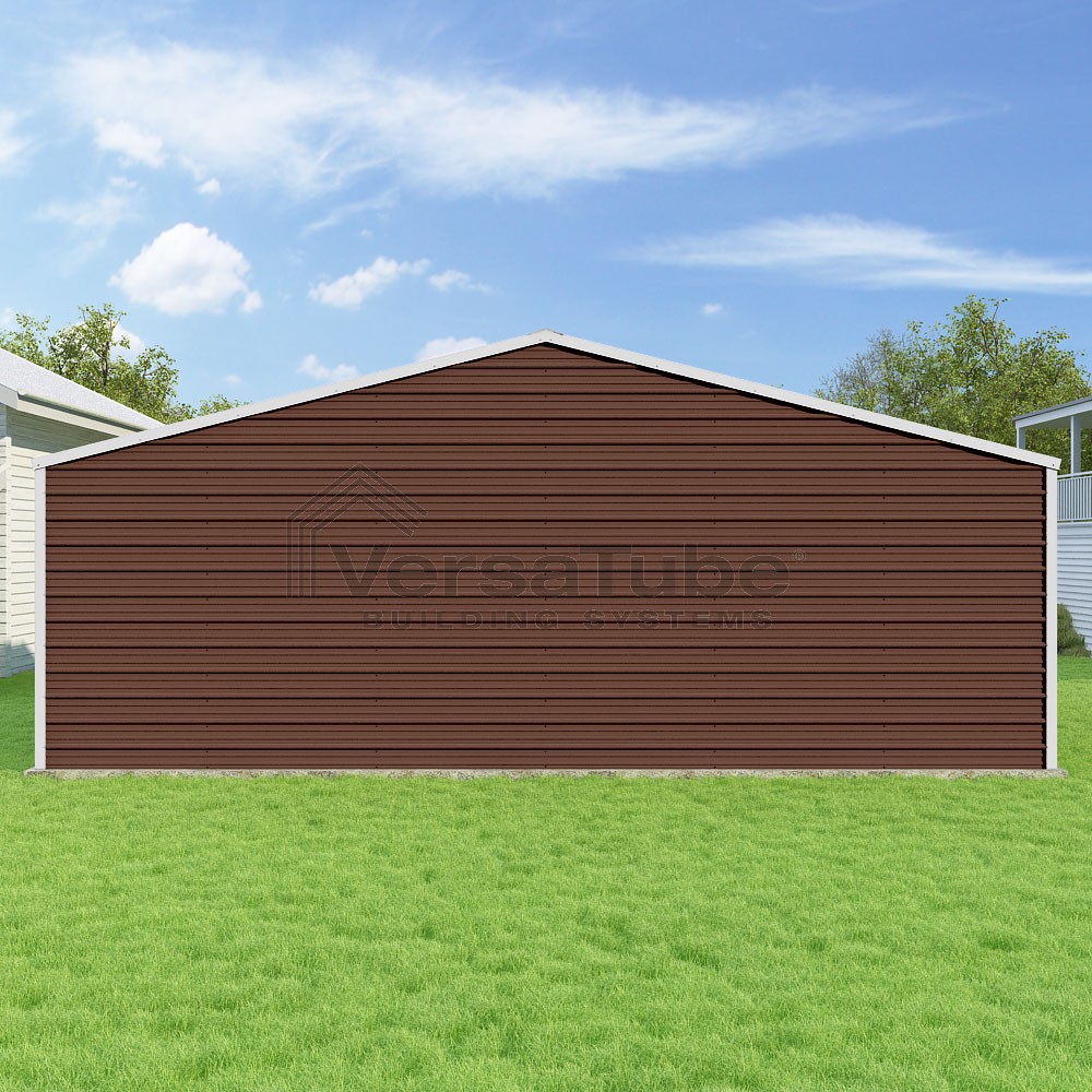 Frontier Series DIY garage kit features vertical sheet metal roof panels with horizontal siding panels..