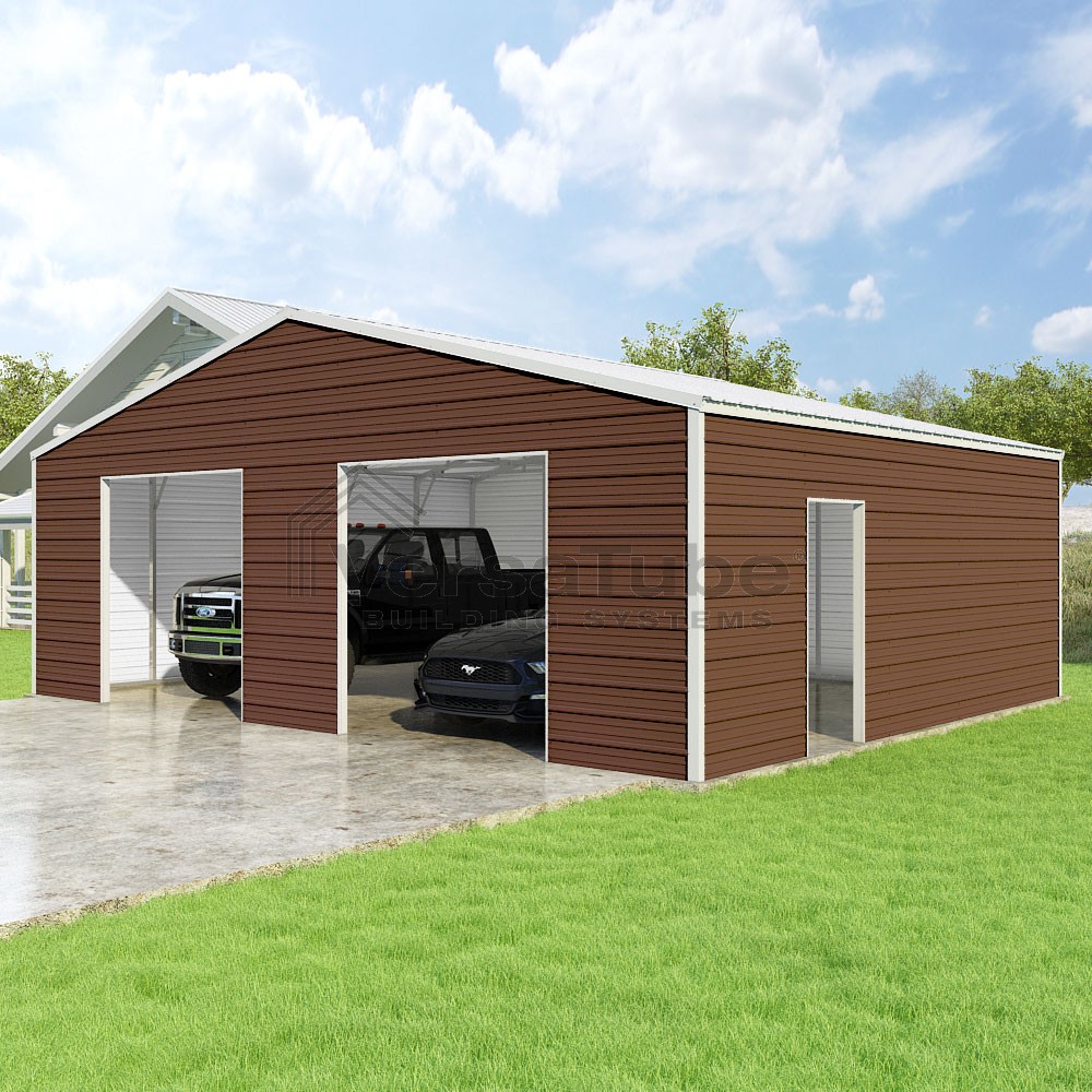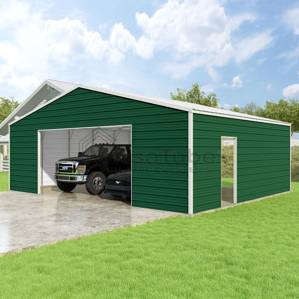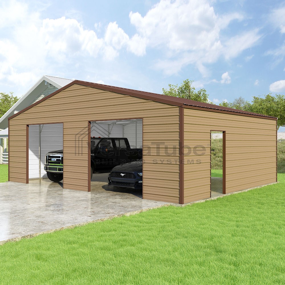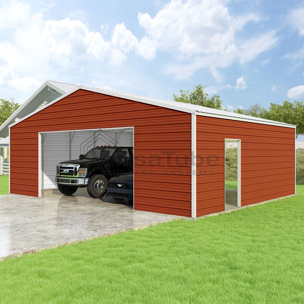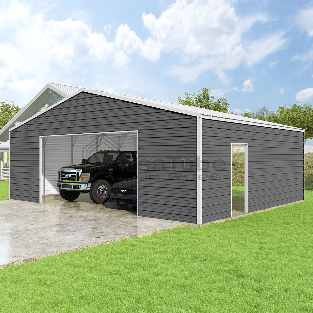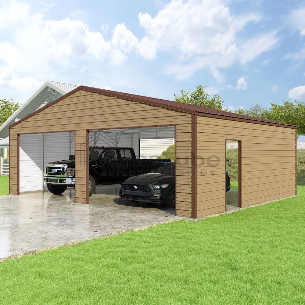 Frontier Series DIY garage kit features vertical sheet metal roof panels with horizontal siding panels..