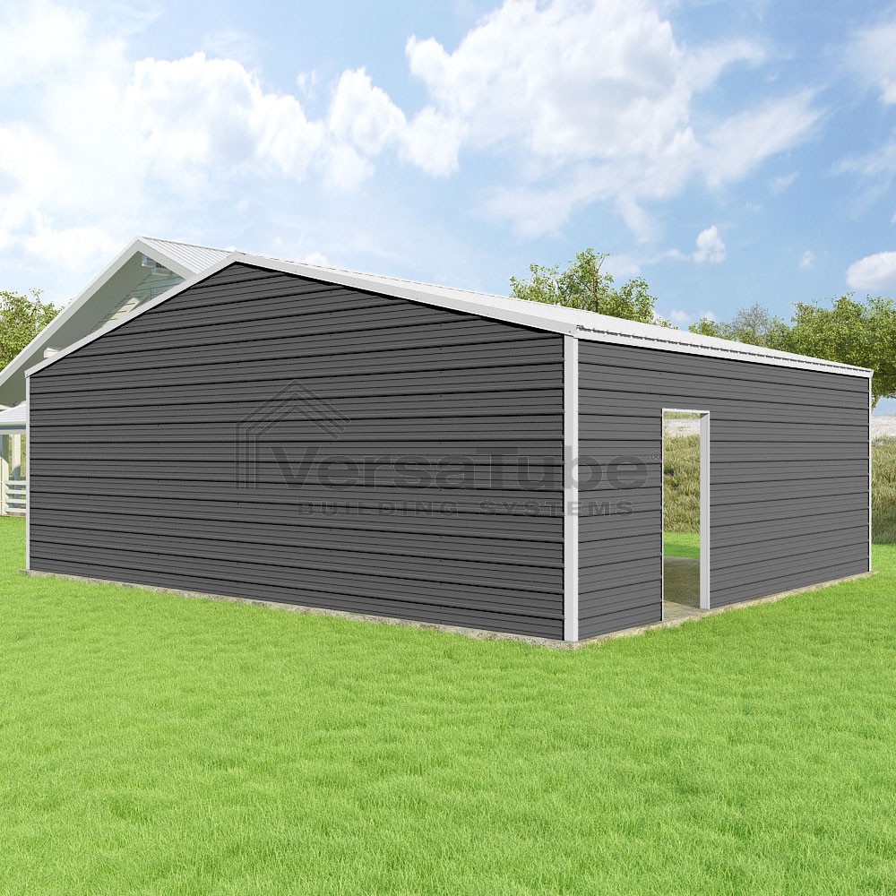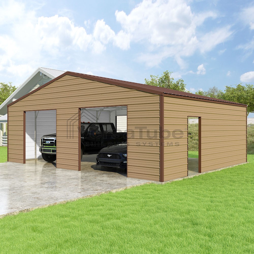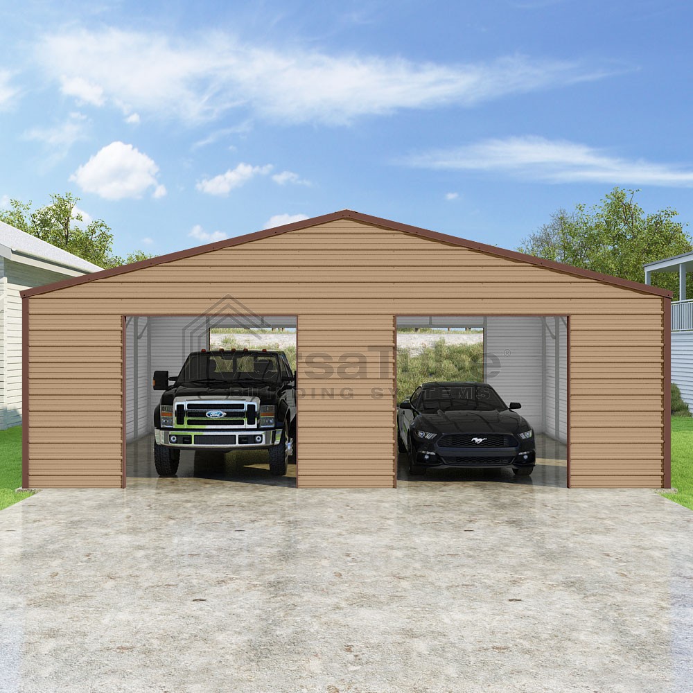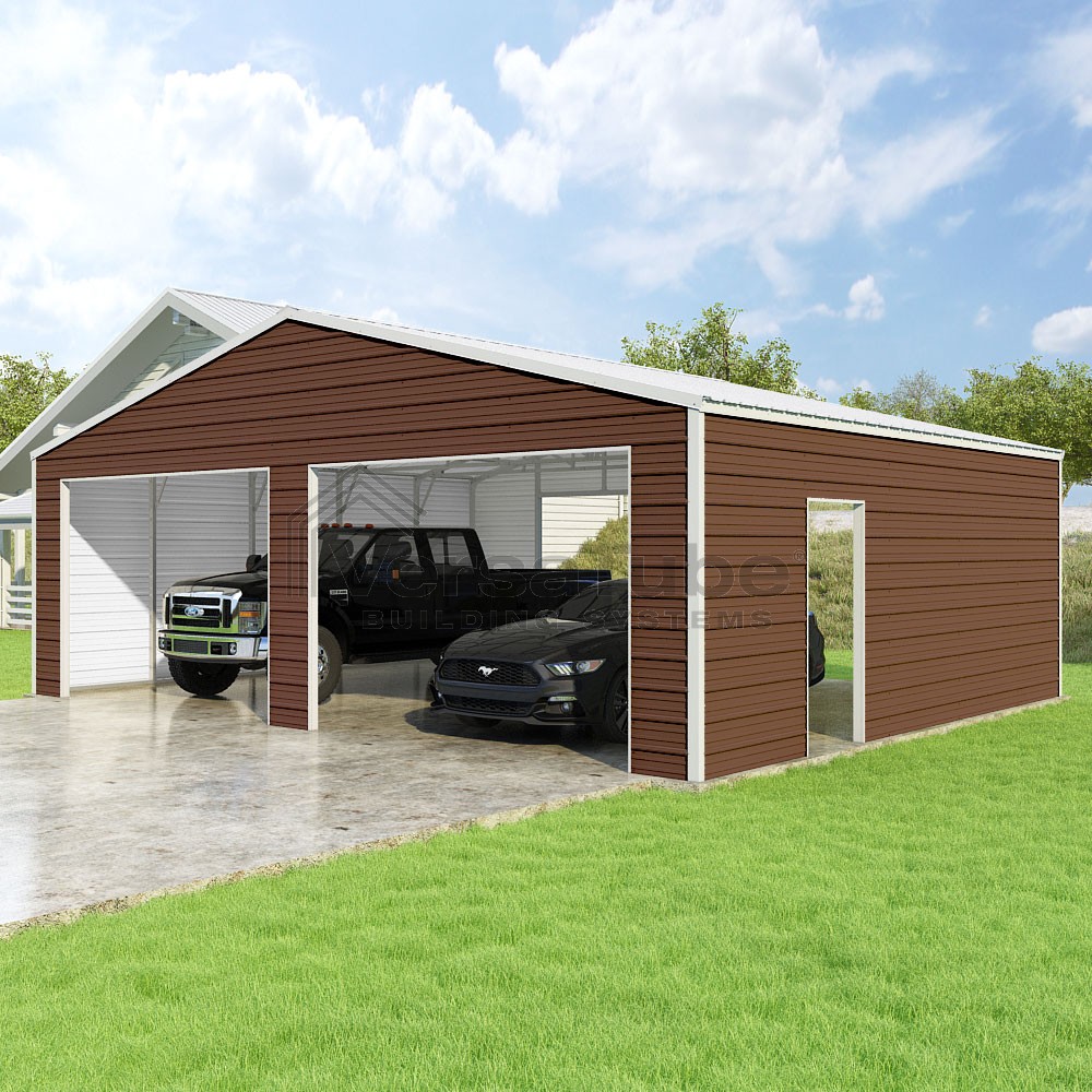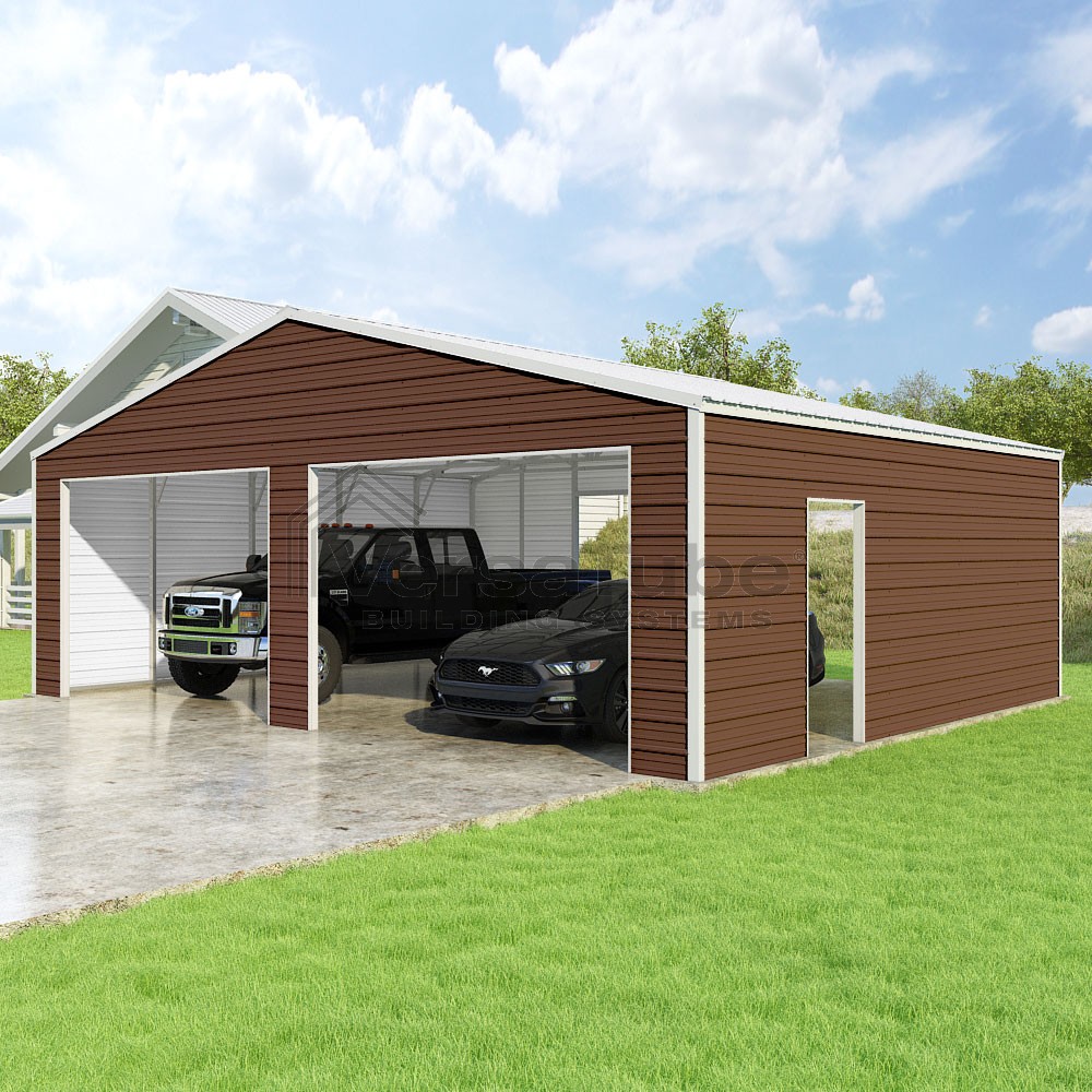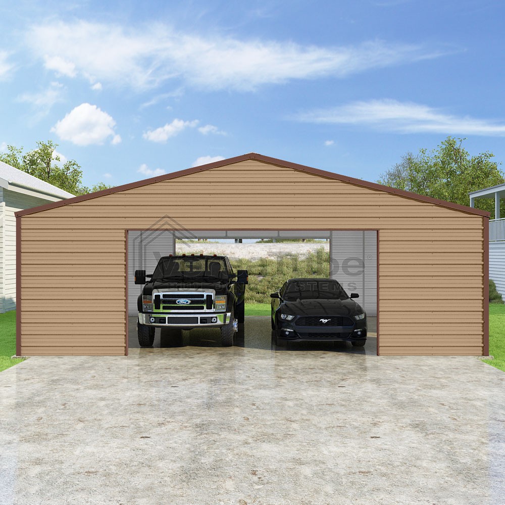 Frontier Series DIY garage kit features vertical sheet metal roof panels with horizontal siding panels..