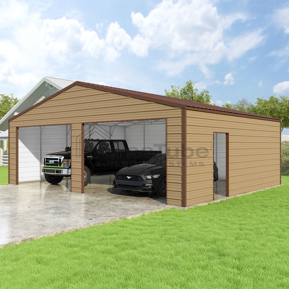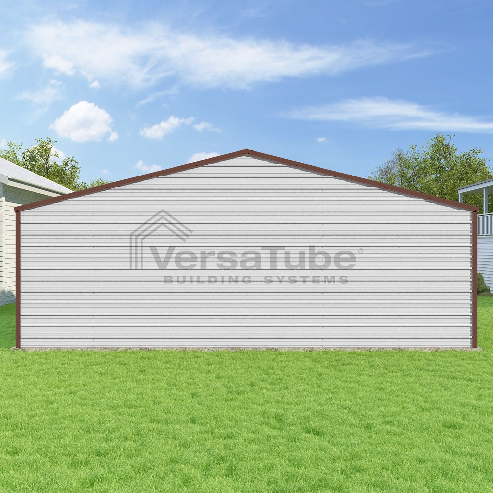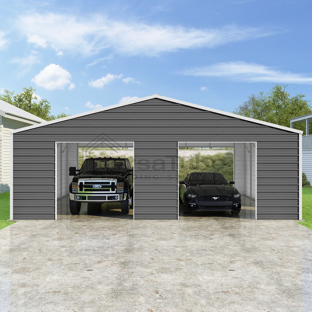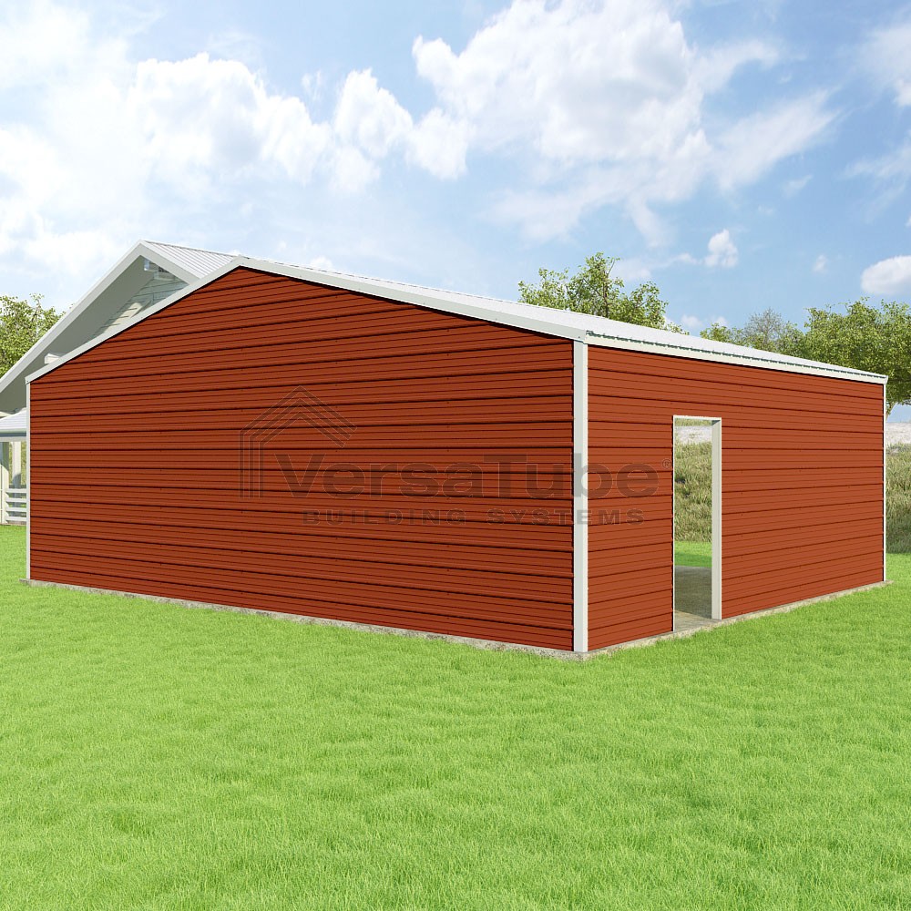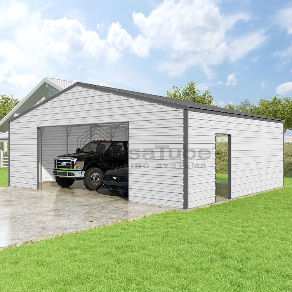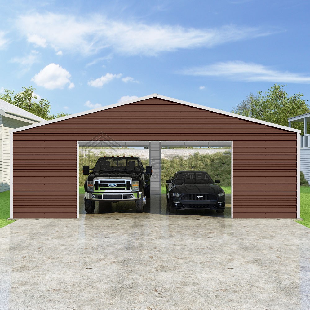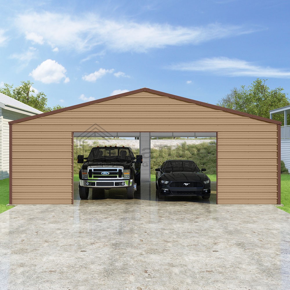 Frontier Series DIY garage kit features vertical sheet metal roof panels with horizontal siding panels..