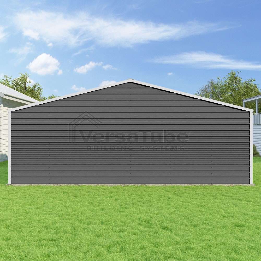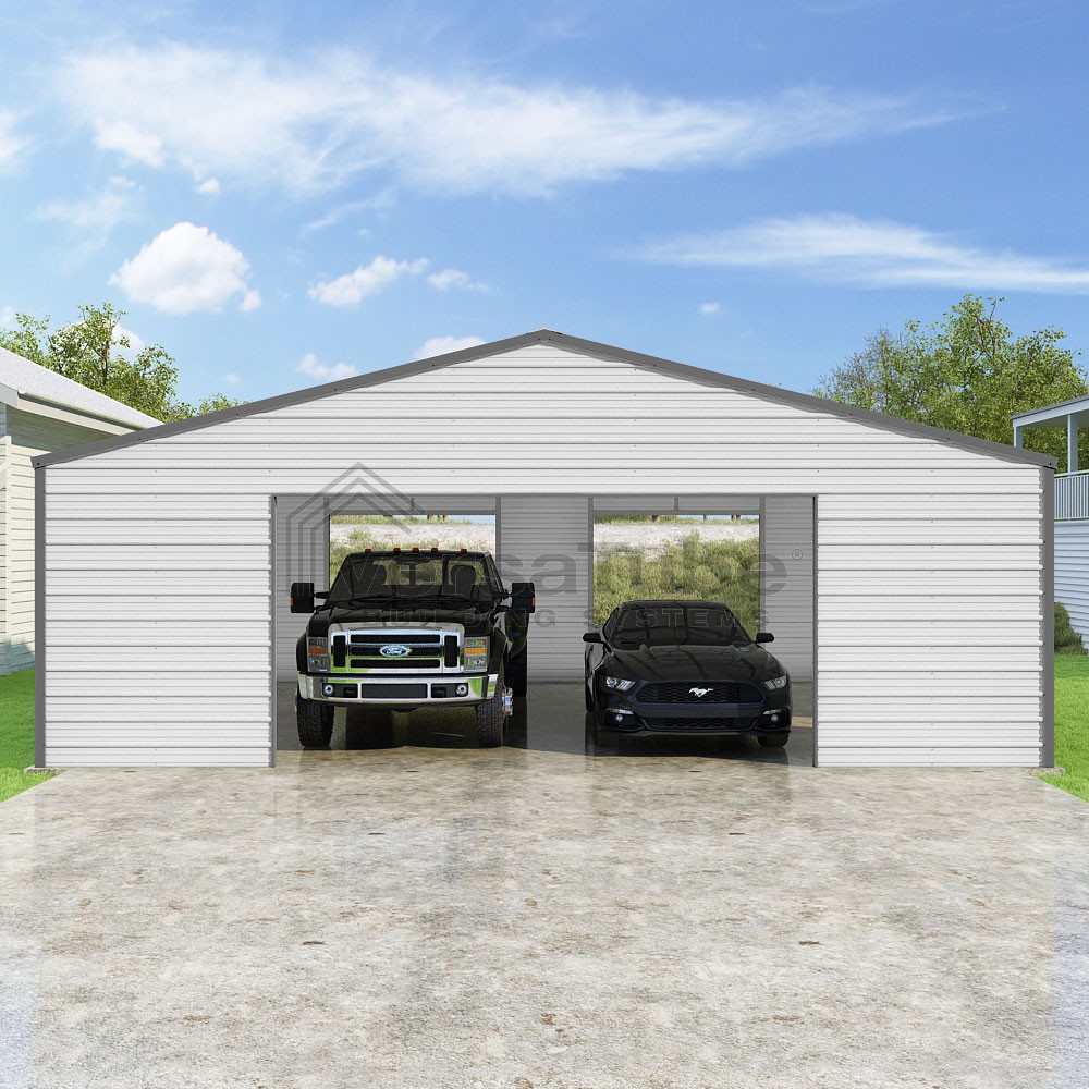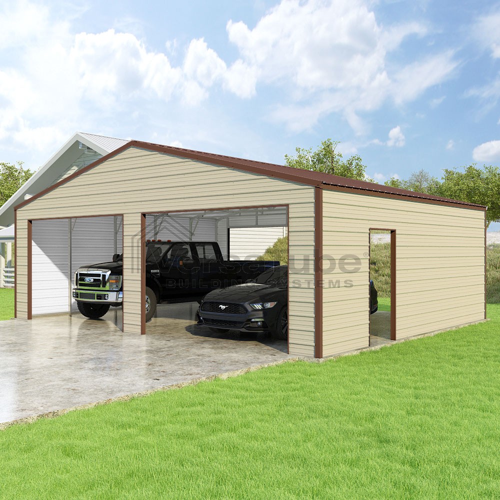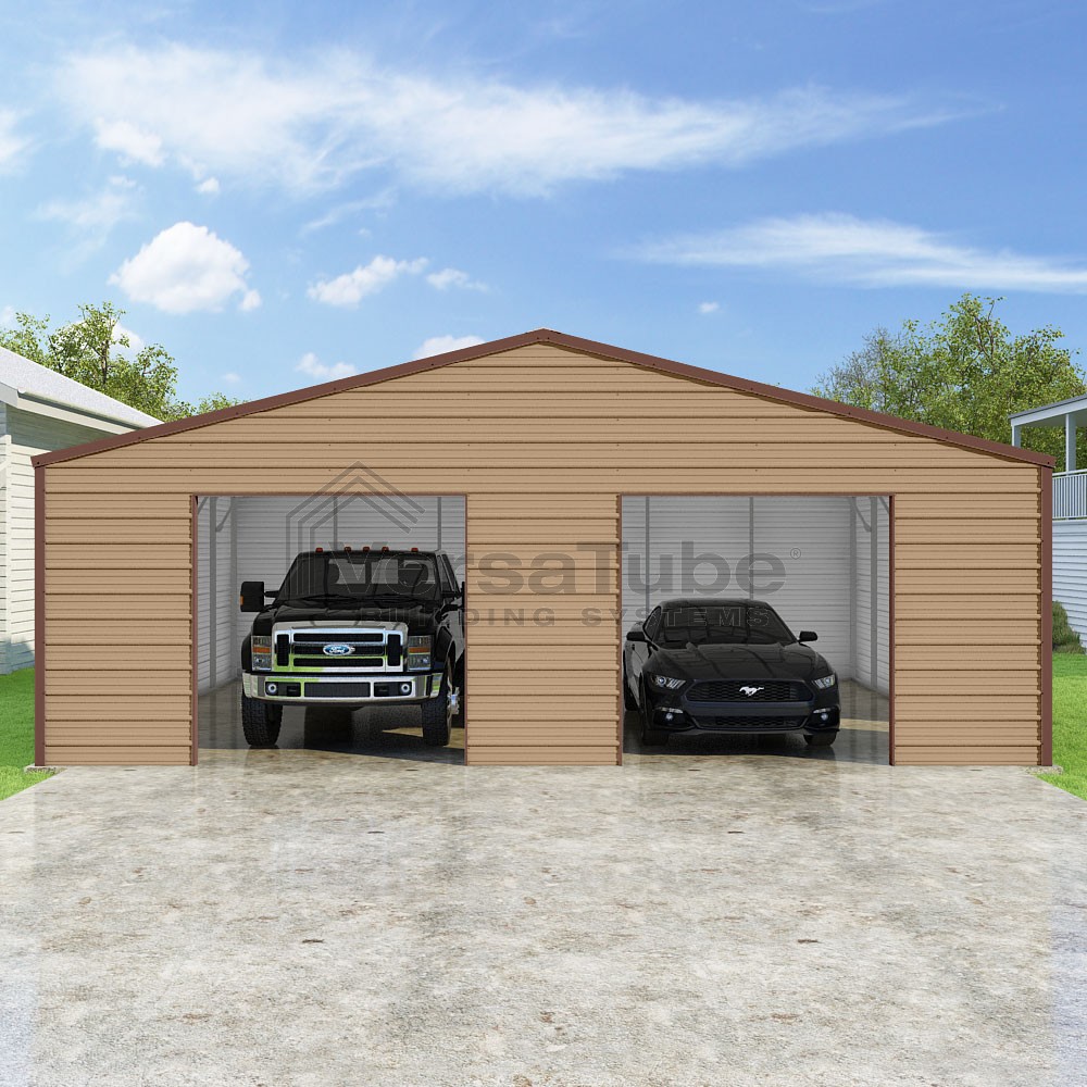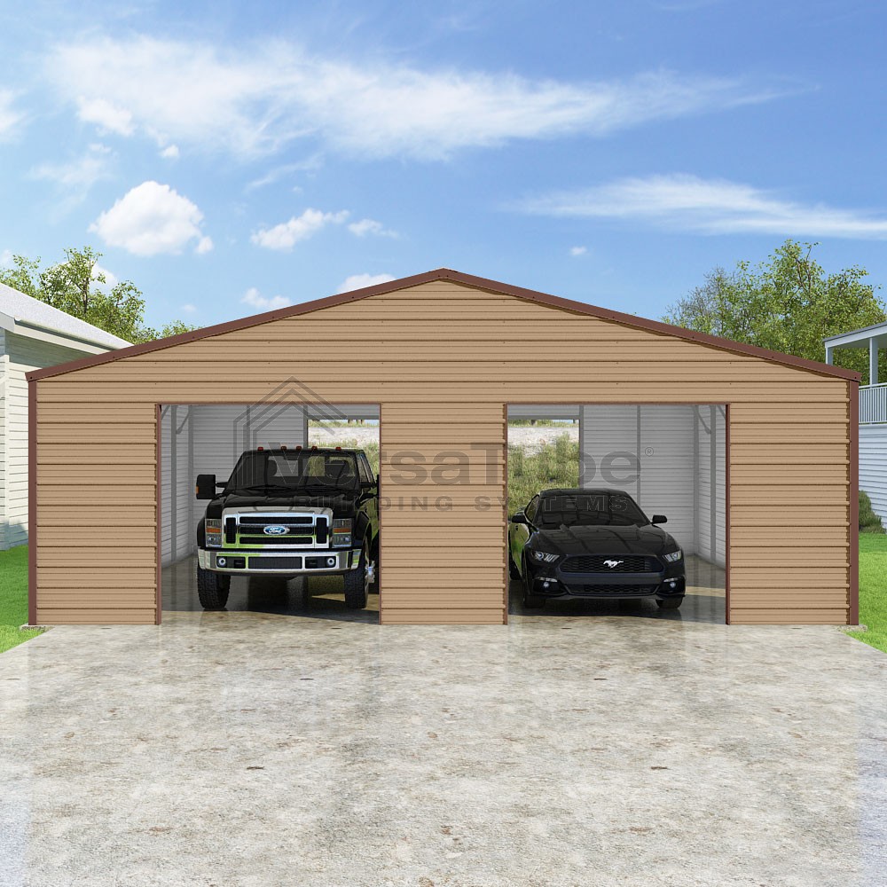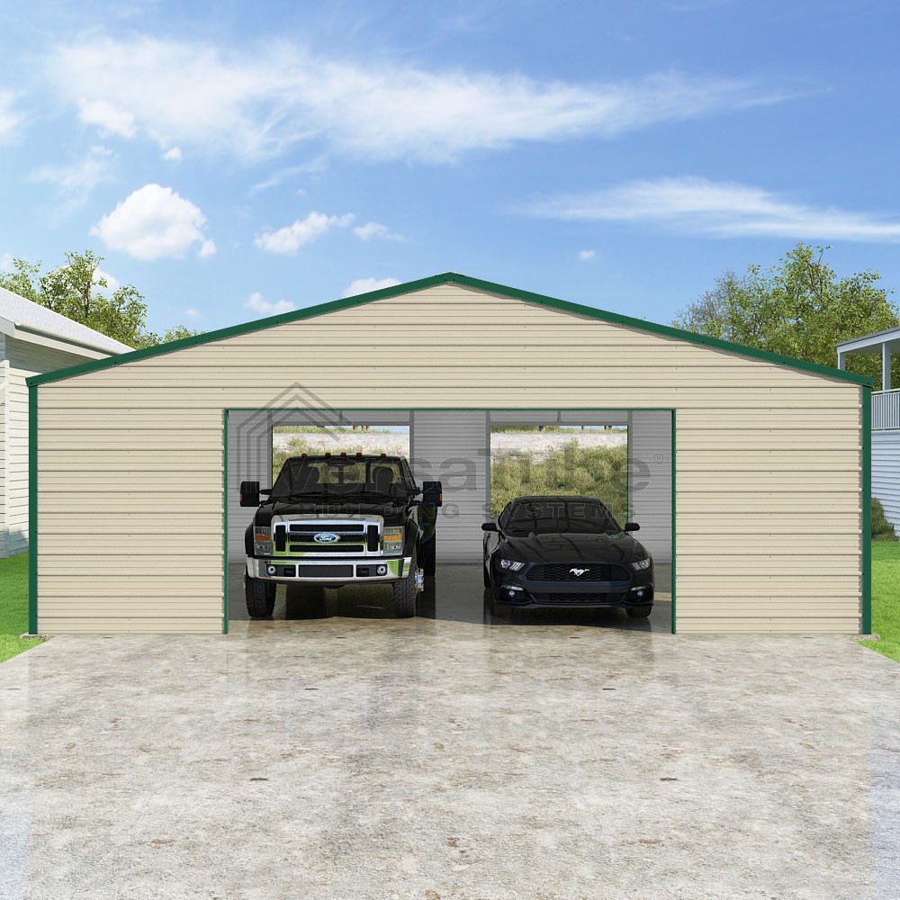 Frontier Series DIY garage kit features vertical sheet metal roof panels with horizontal siding panels..
