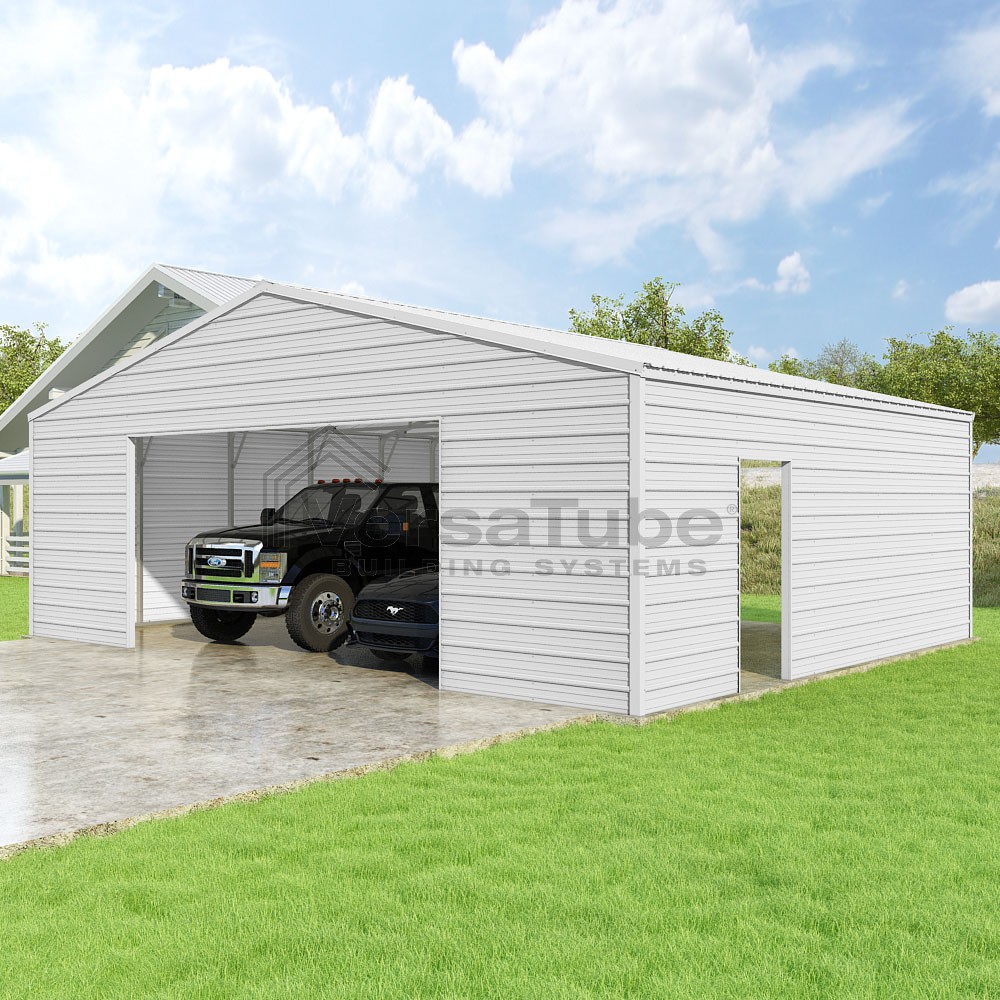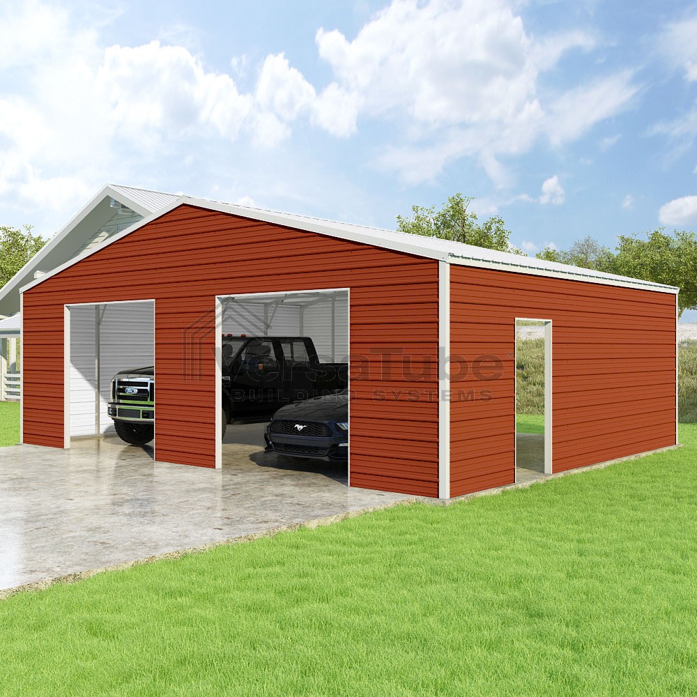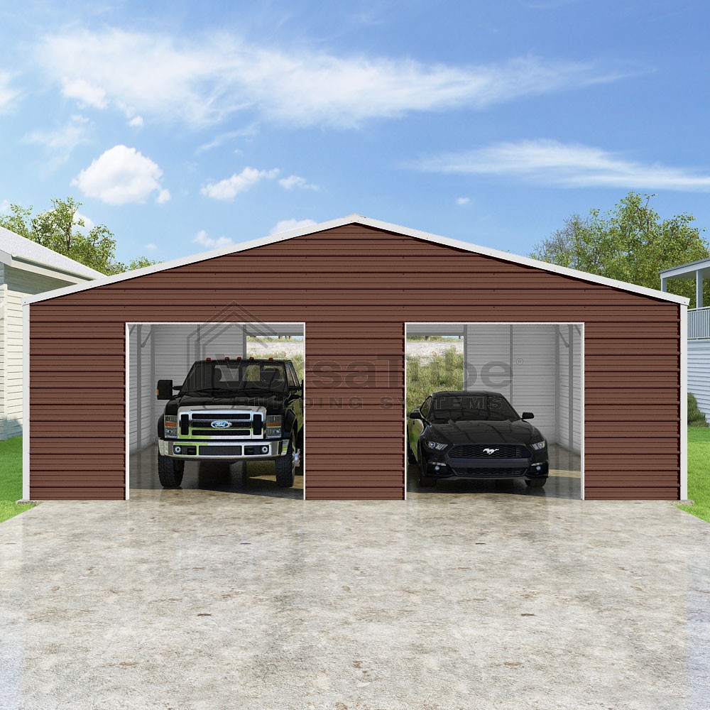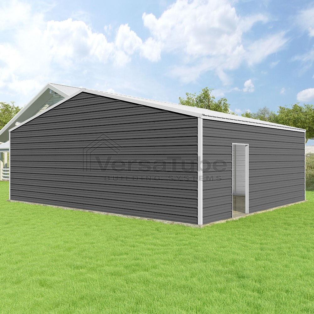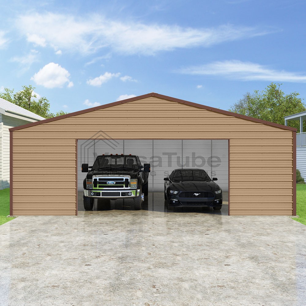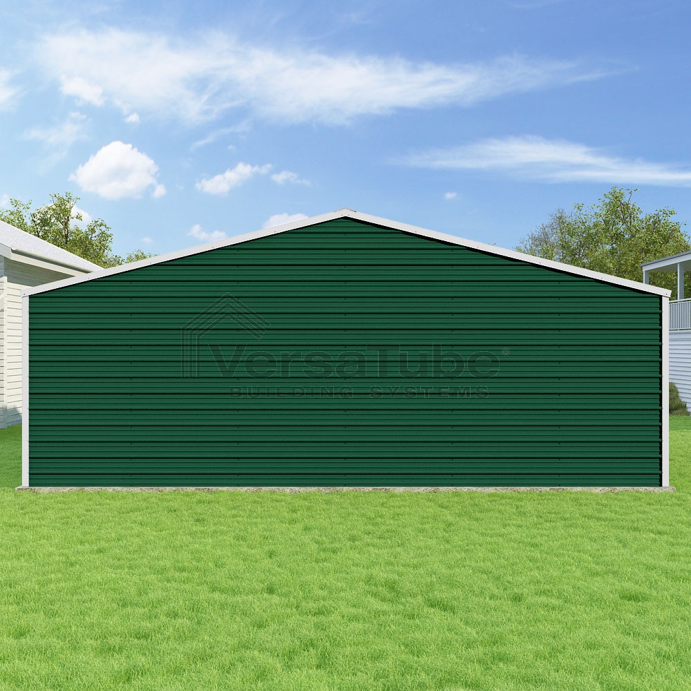 Frontier Series DIY garage kit features vertical sheet metal roof panels with horizontal siding panels..