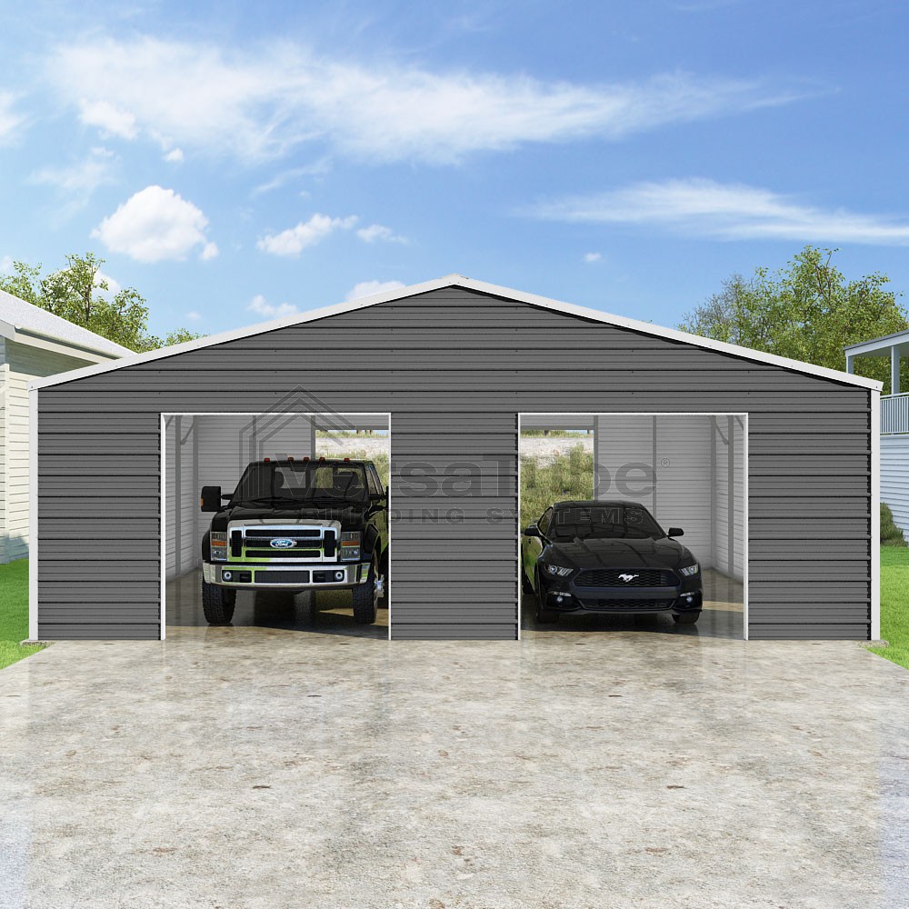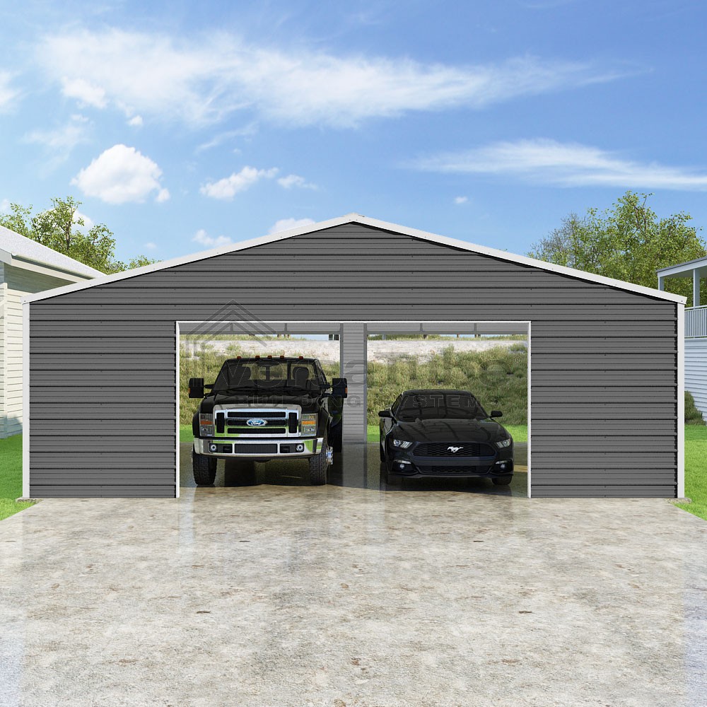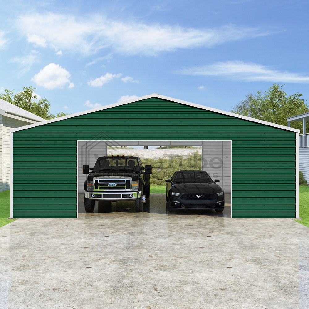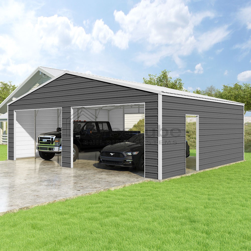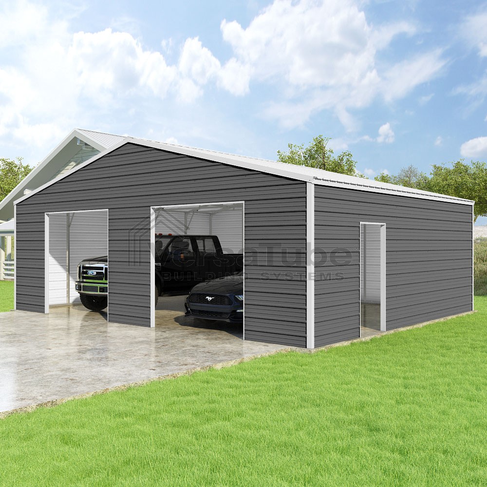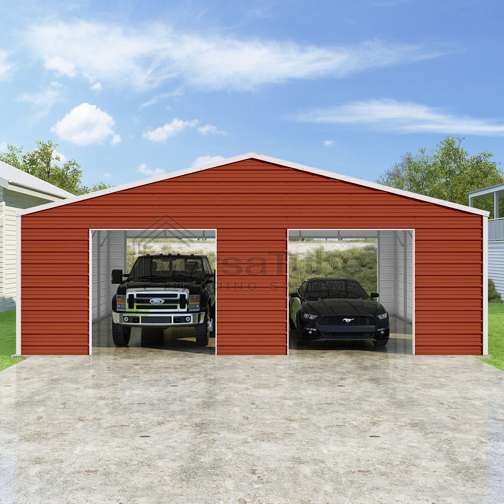 Frontier Series DIY garage kit features vertical sheet metal roof panels with horizontal siding panels..