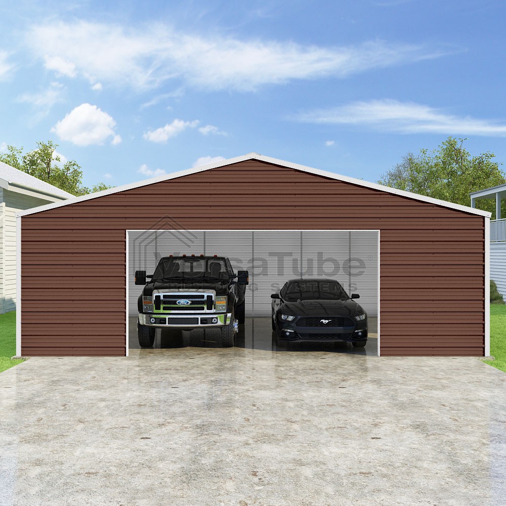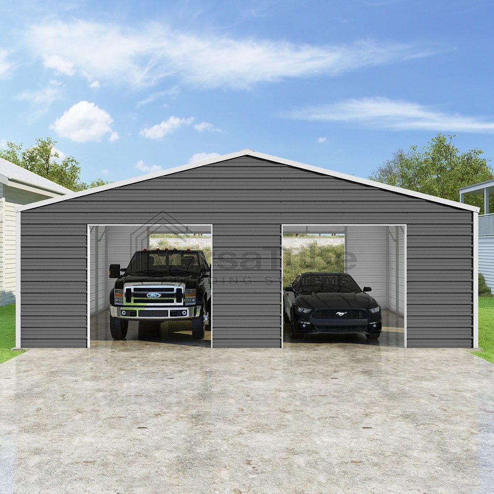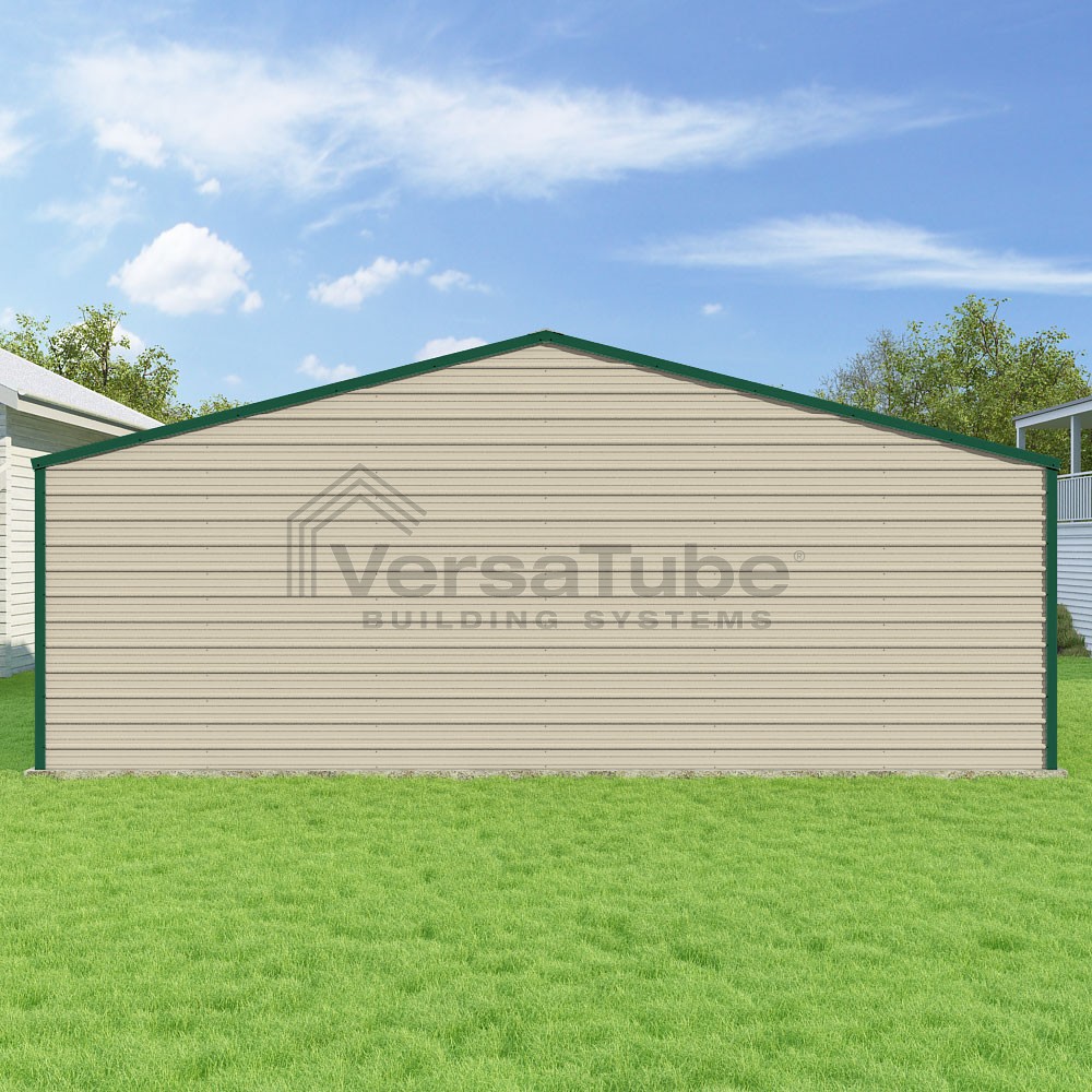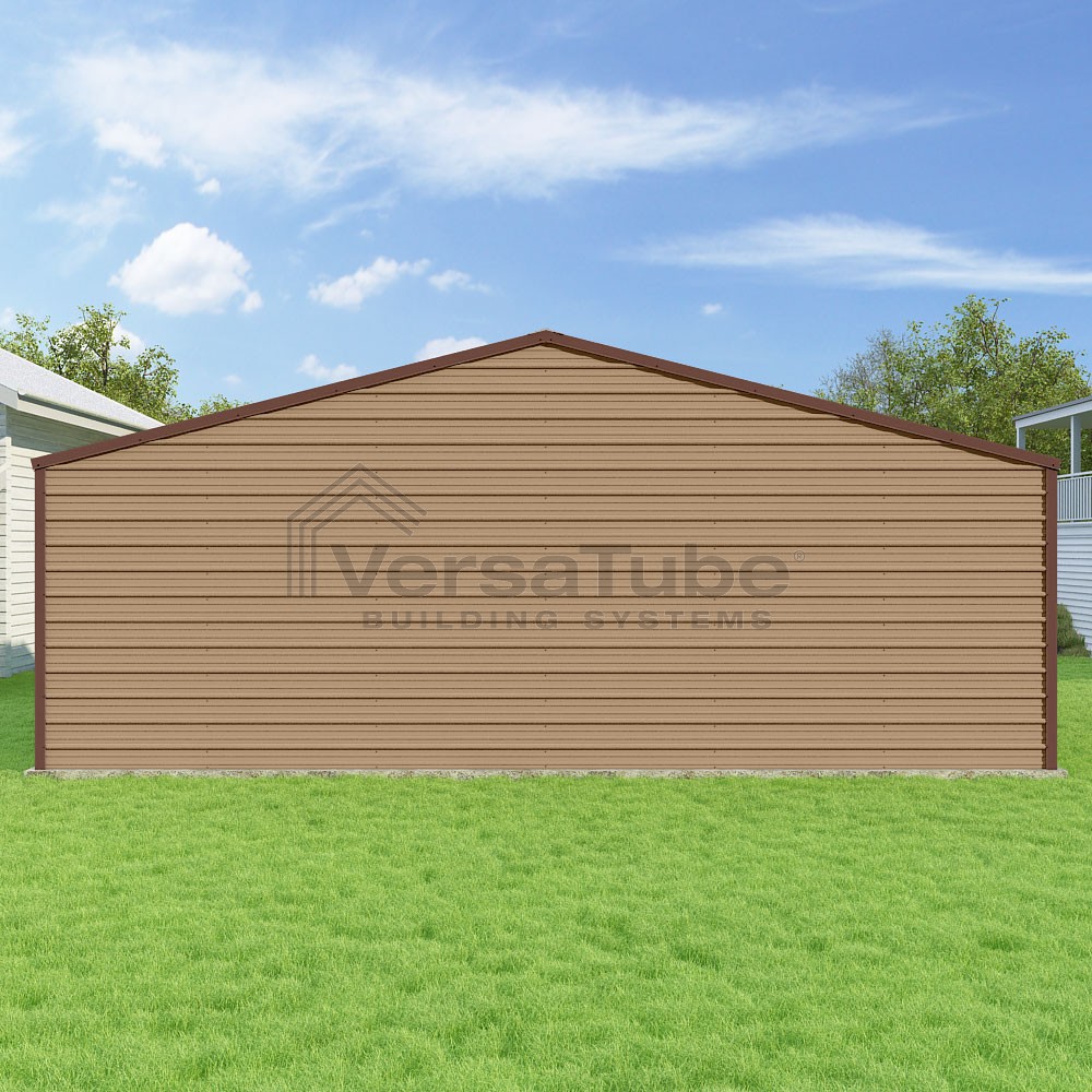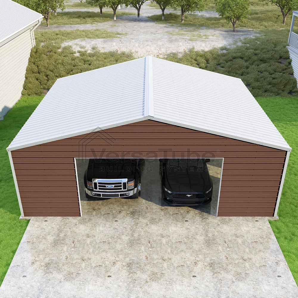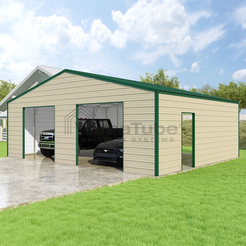 Frontier Series DIY garage kit features vertical sheet metal roof panels with horizontal siding panels..