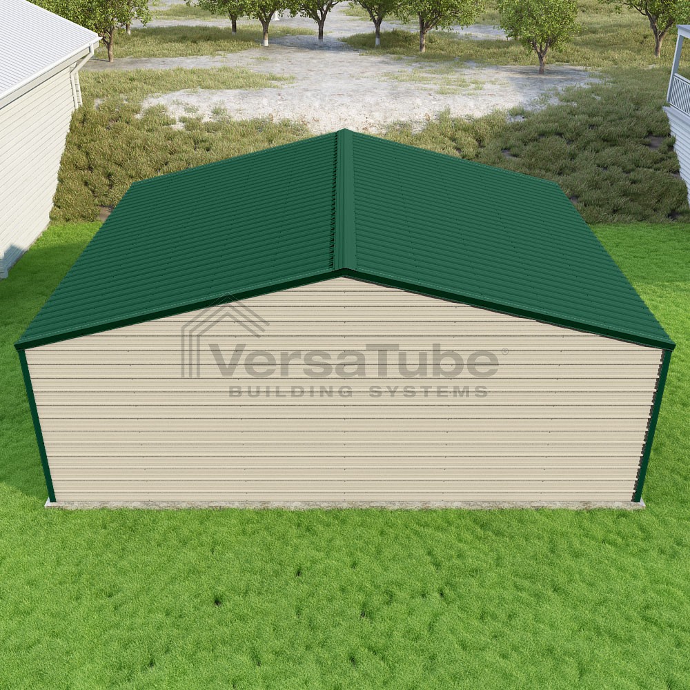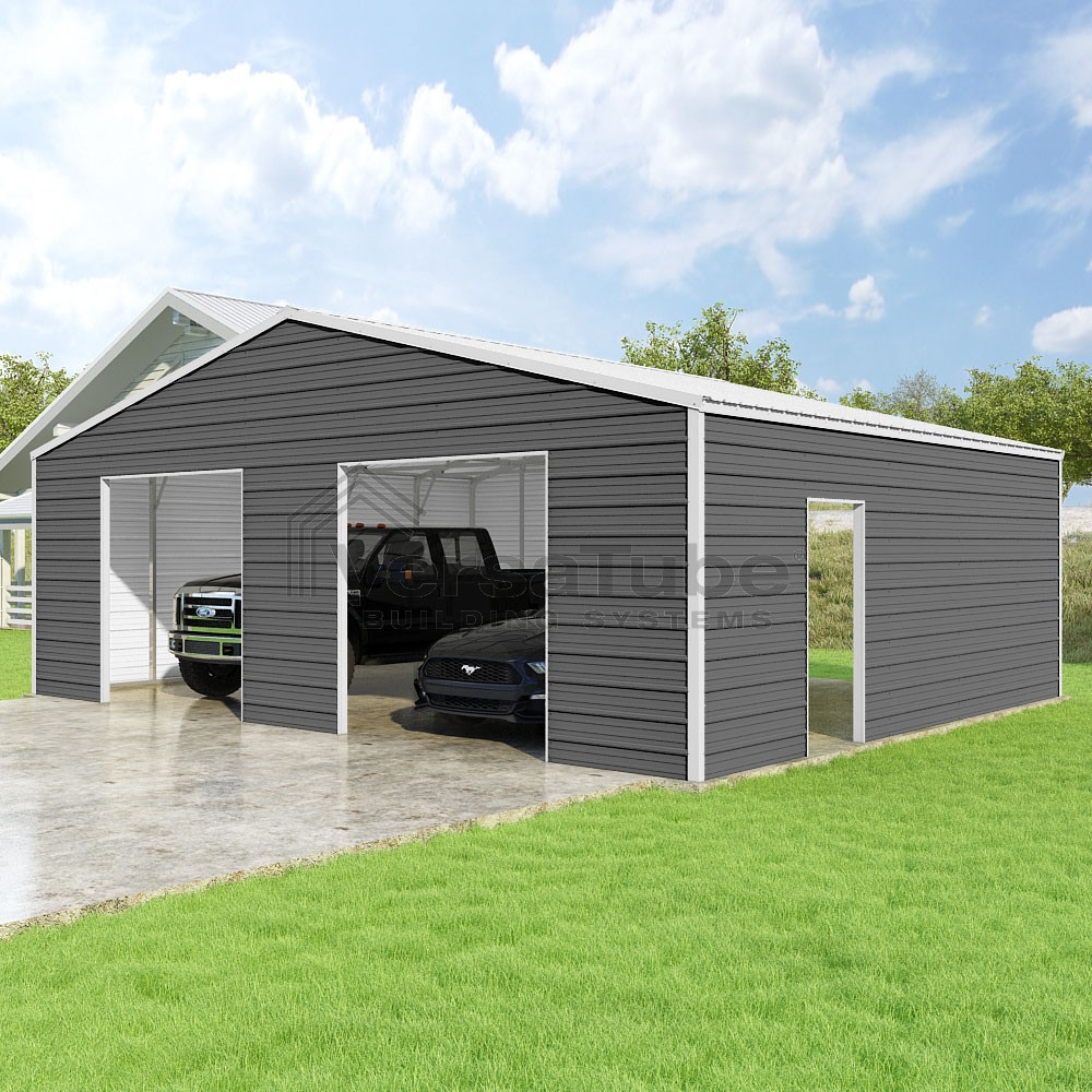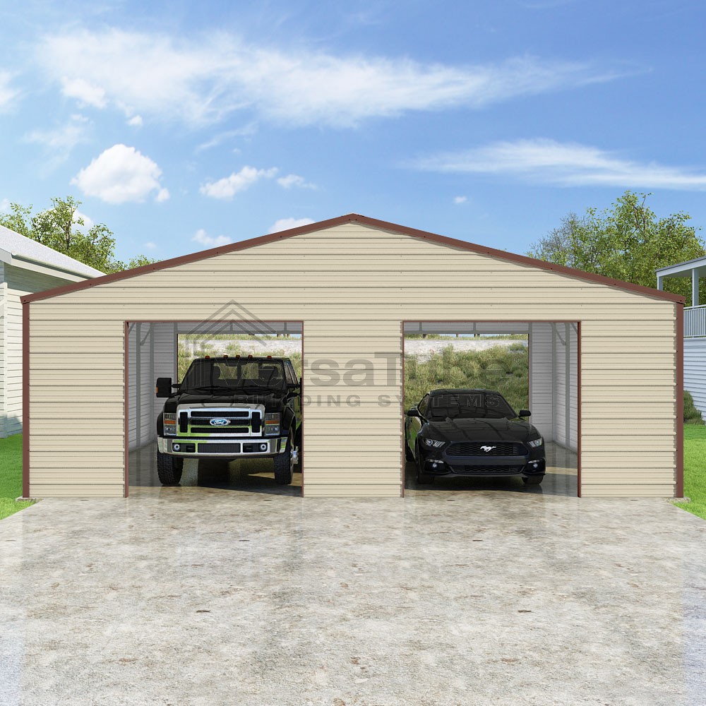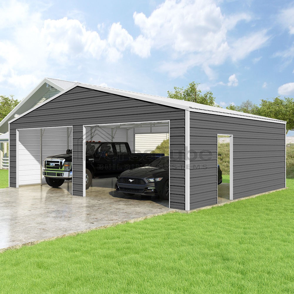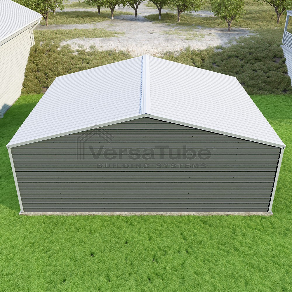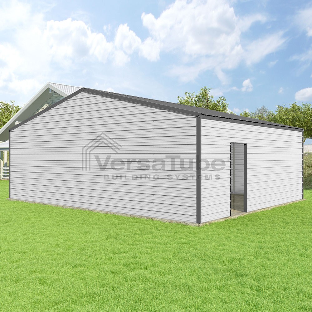 Frontier Series DIY garage kit features vertical sheet metal roof panels with horizontal siding panels..