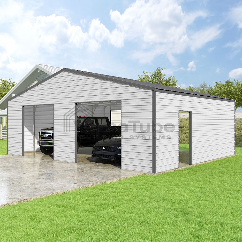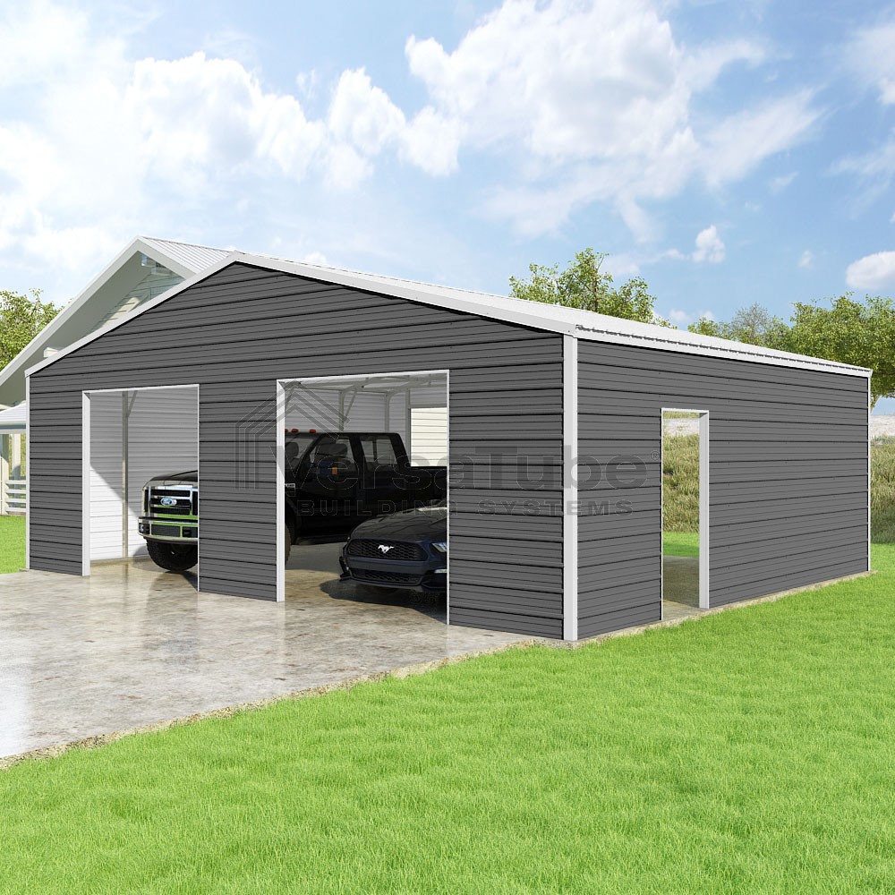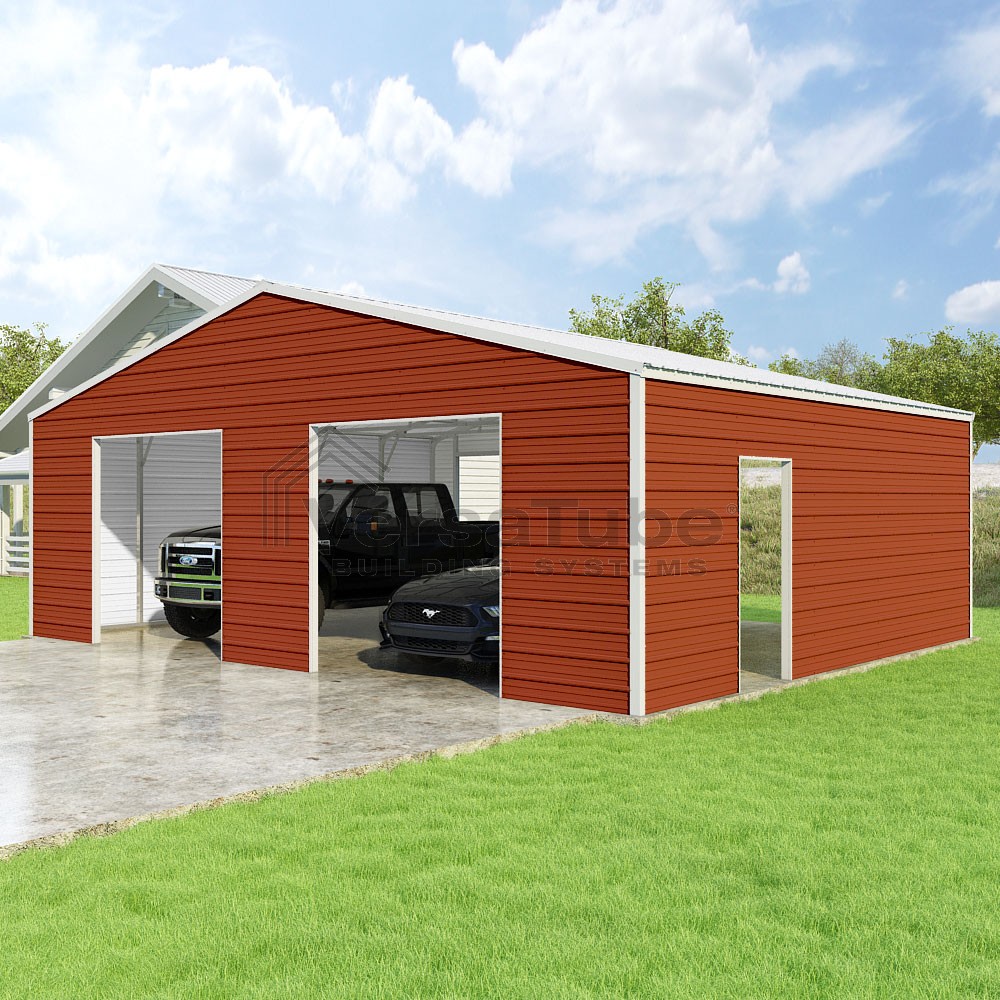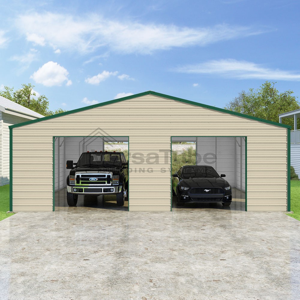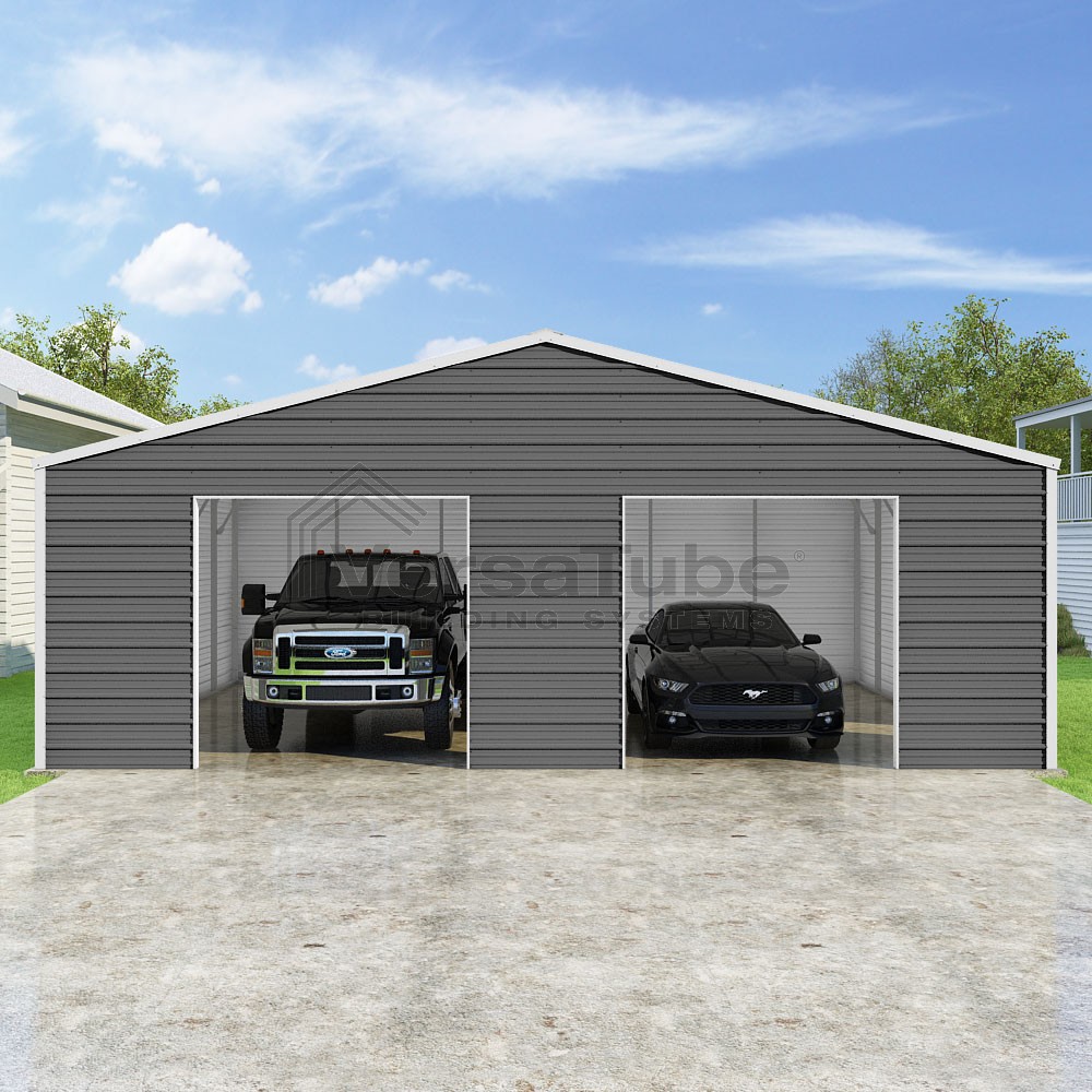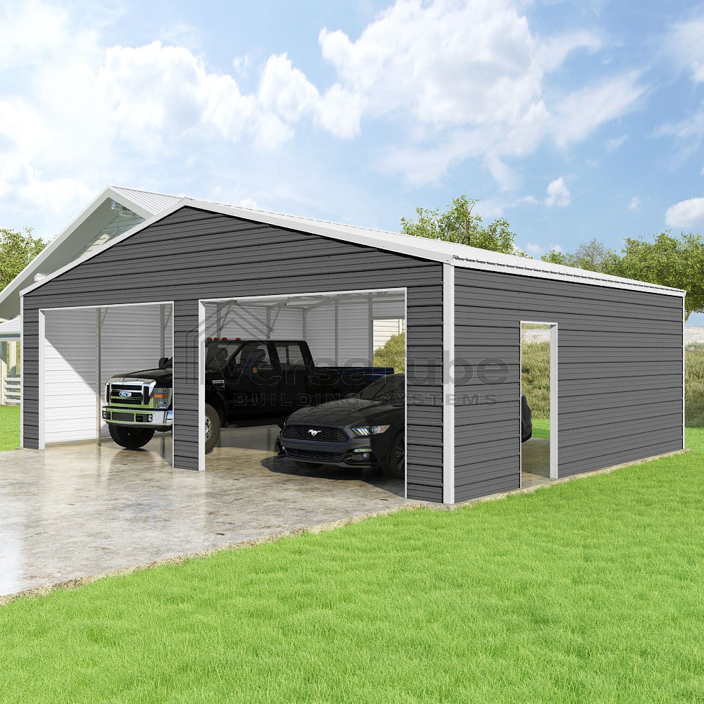 Frontier Series DIY garage kit features vertical sheet metal roof panels with horizontal siding panels..