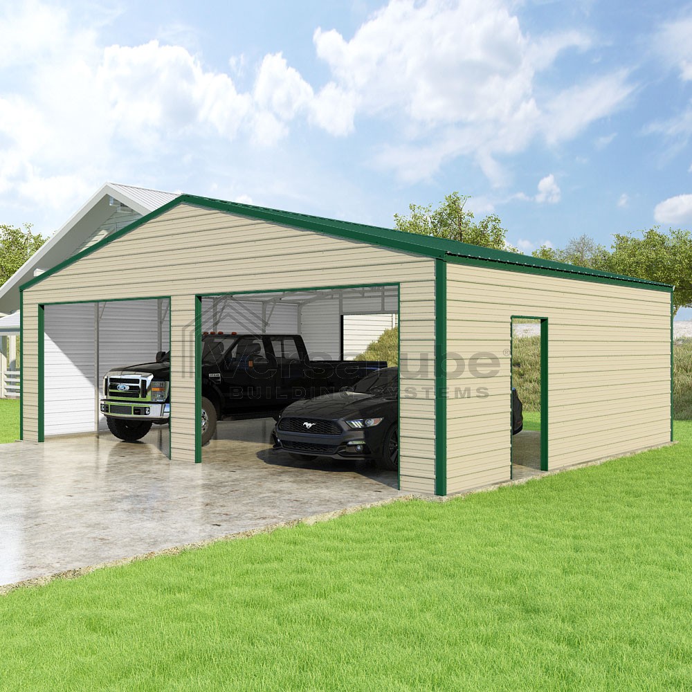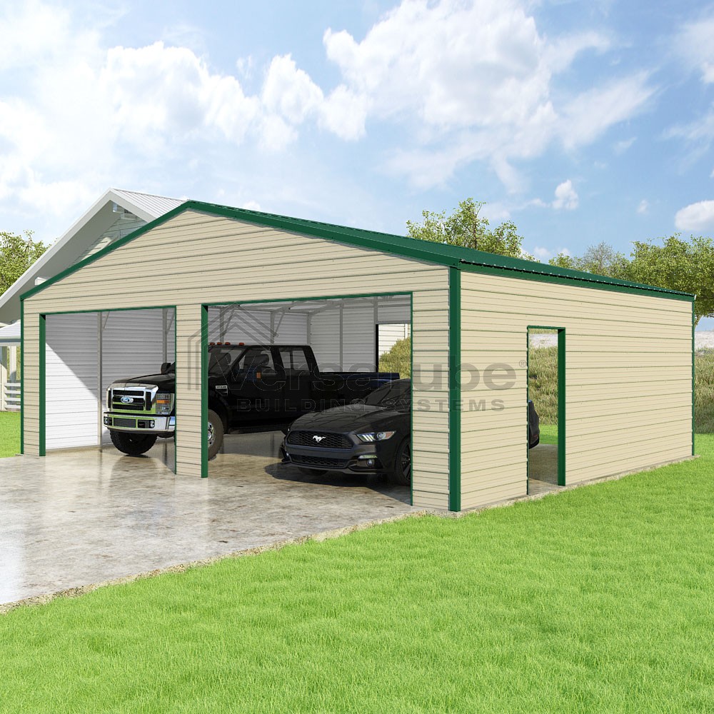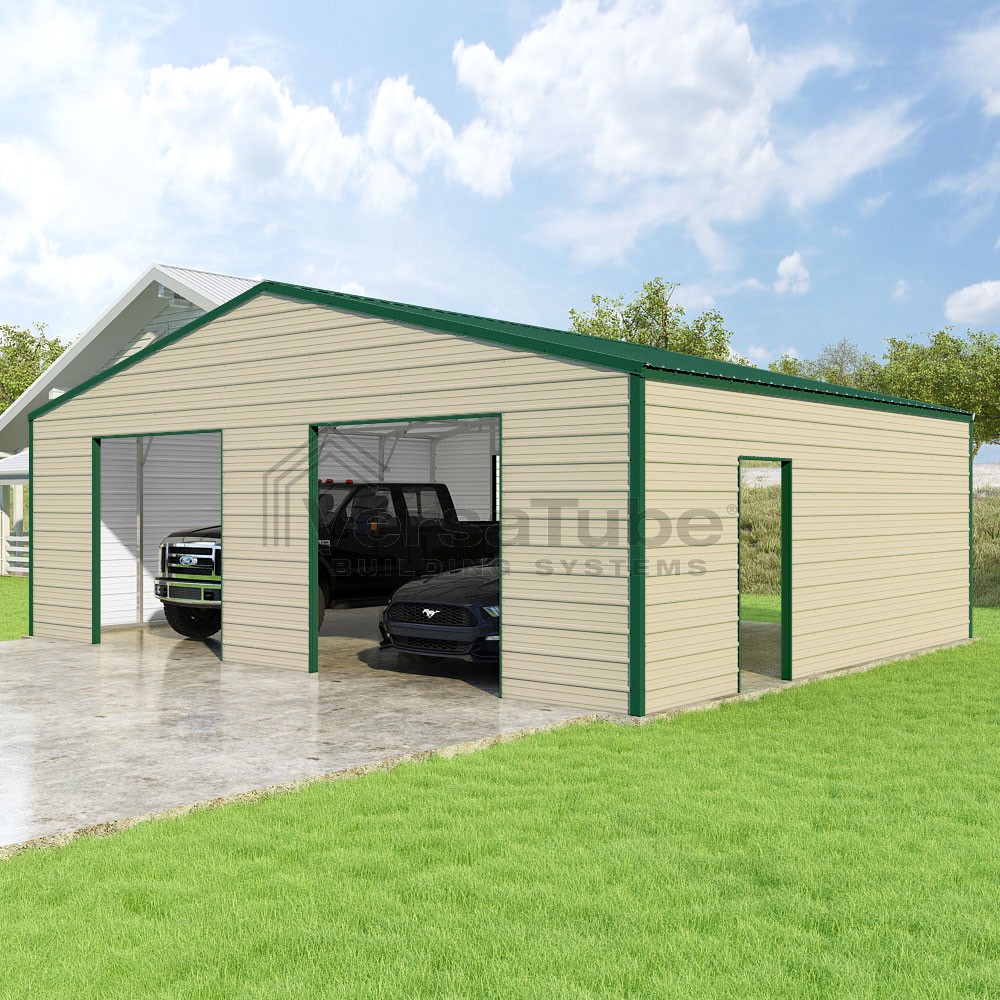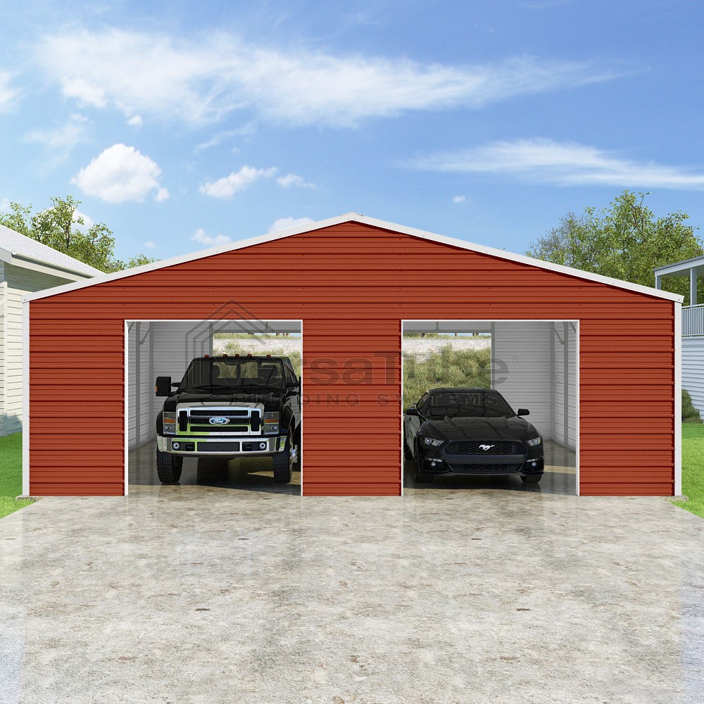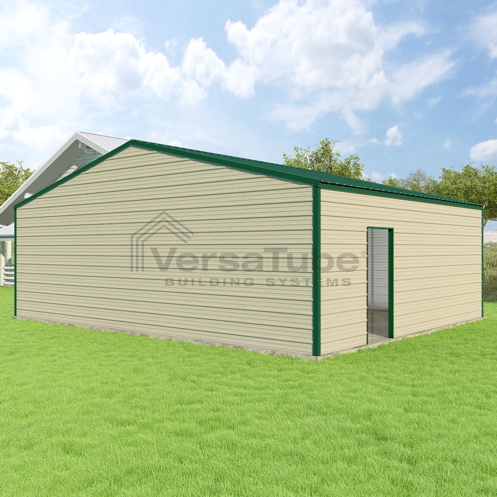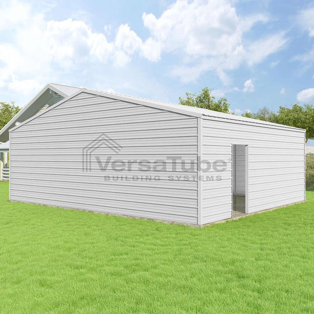 Frontier Series DIY garage kit features vertical sheet metal roof panels with horizontal siding panels..