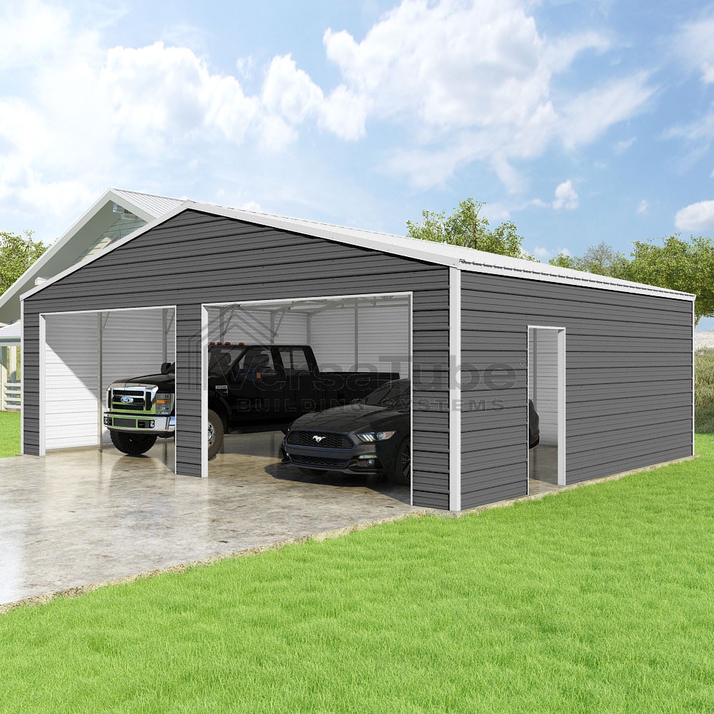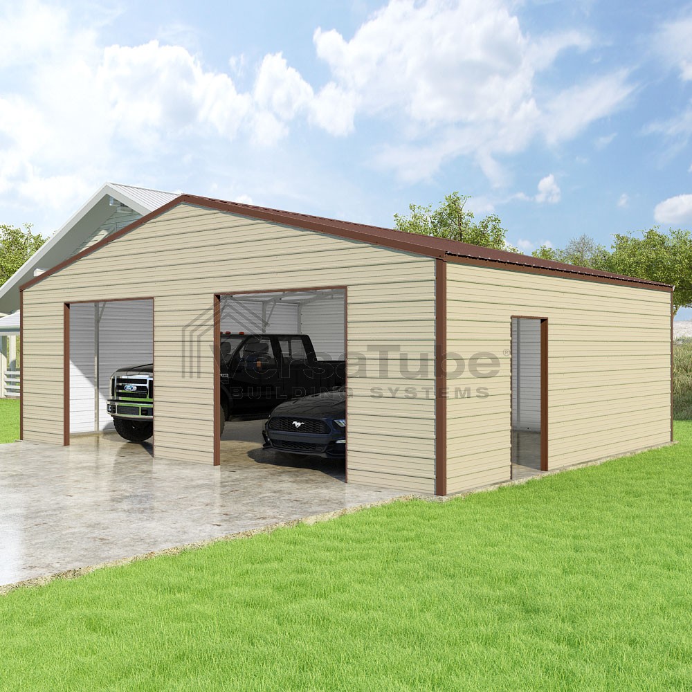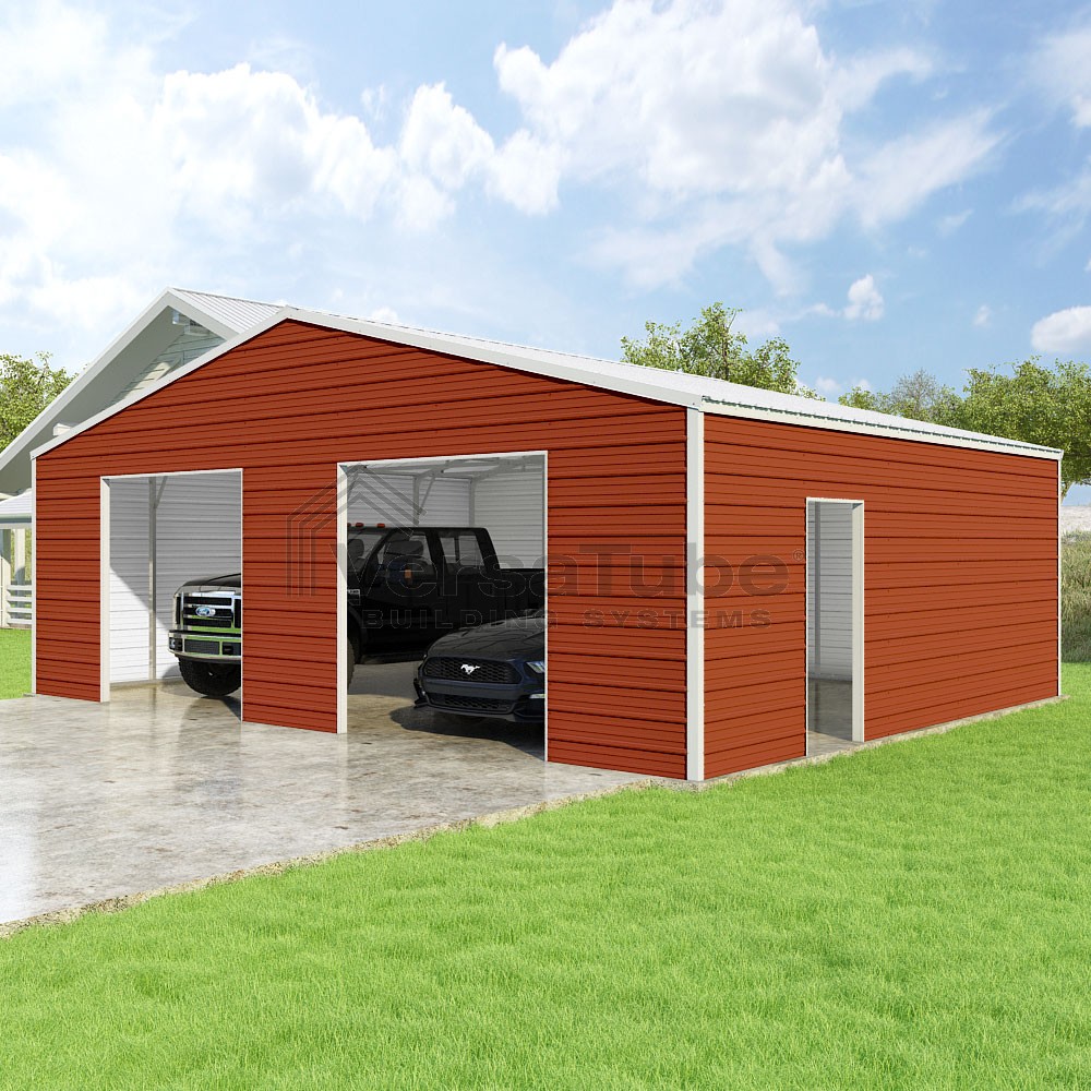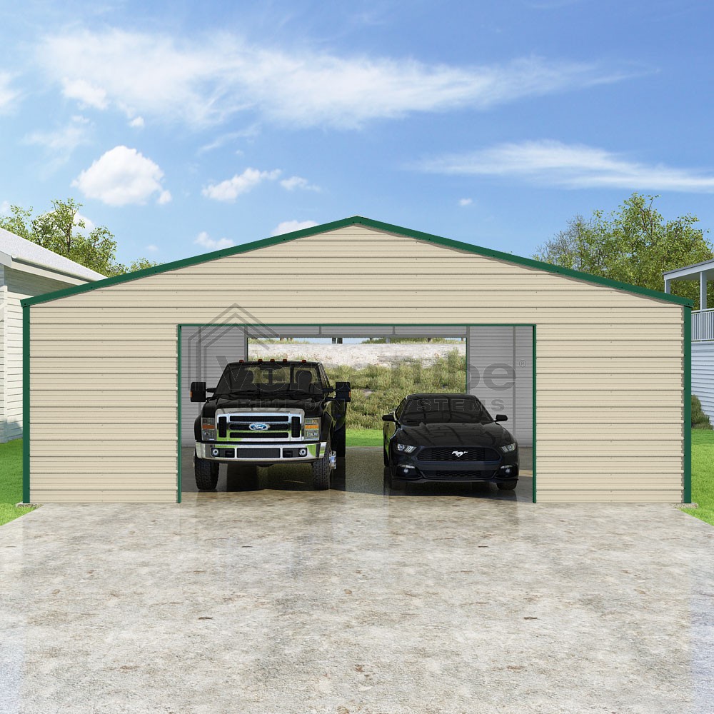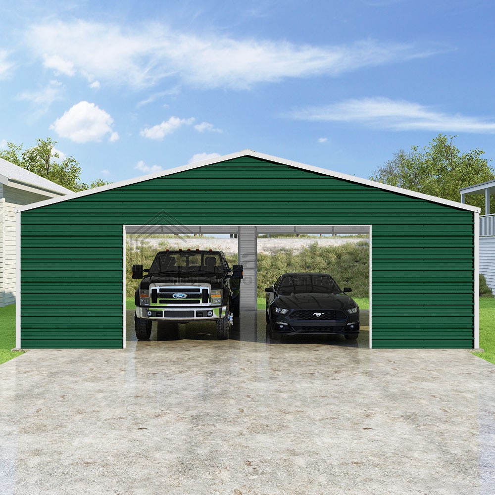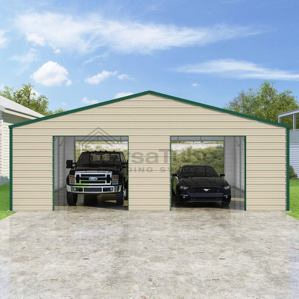 Frontier Series DIY garage kit features vertical sheet metal roof panels with horizontal siding panels..
