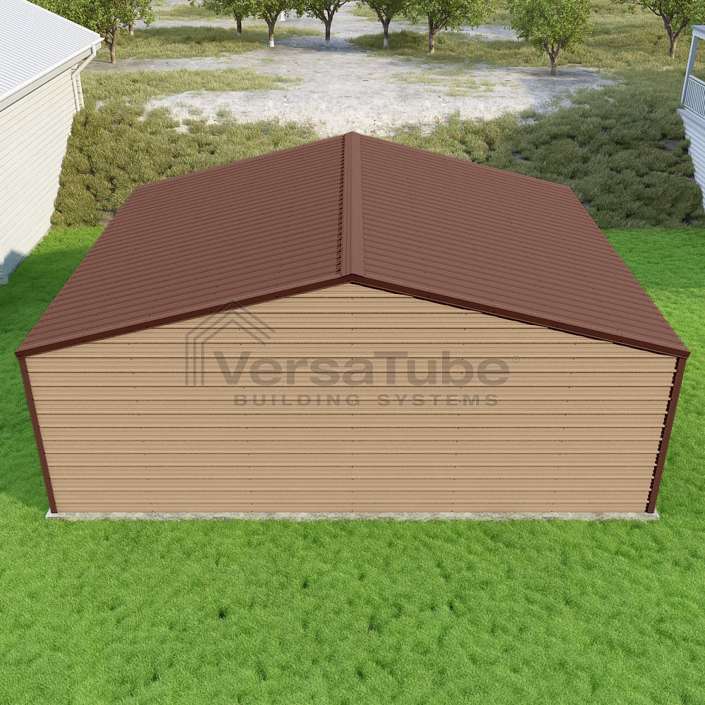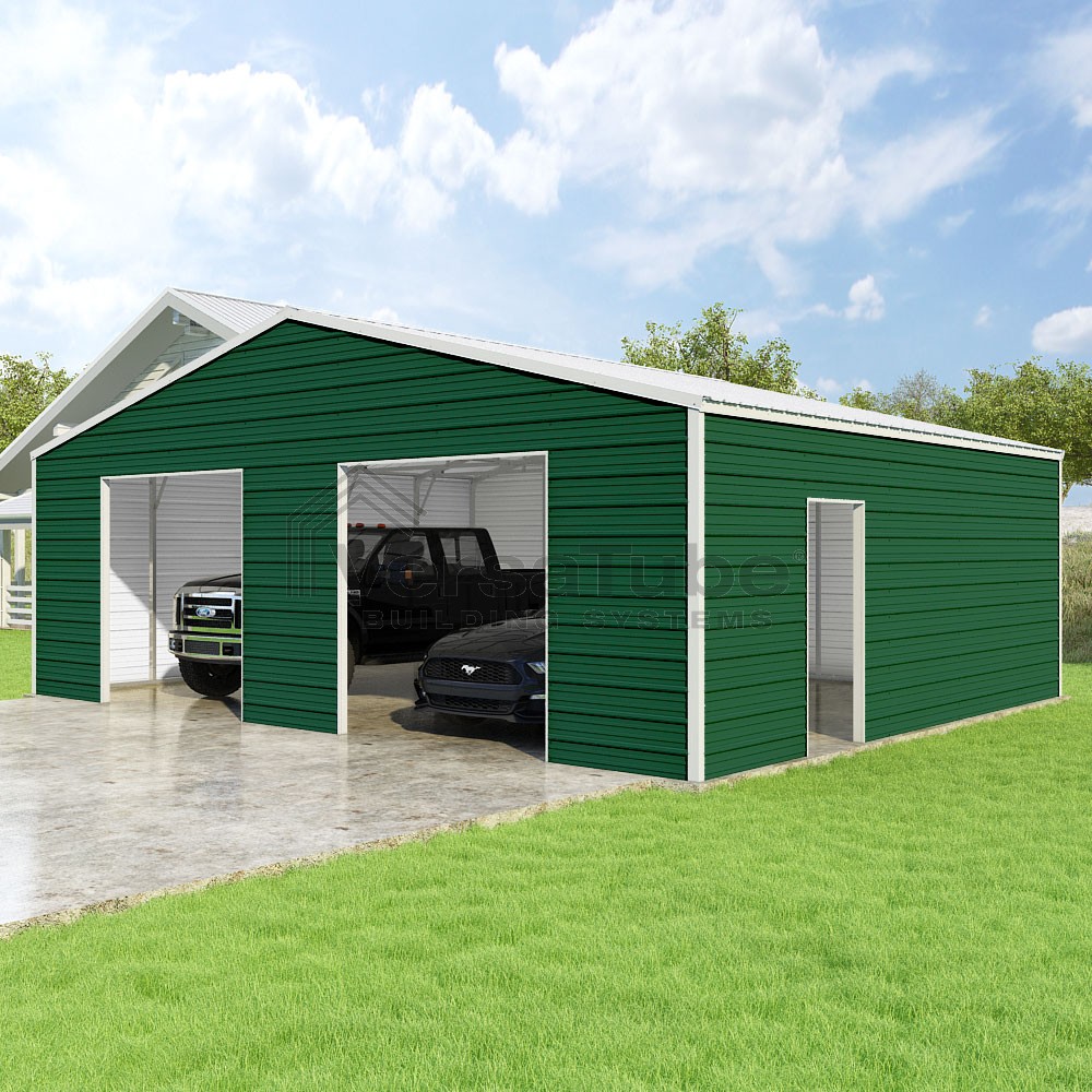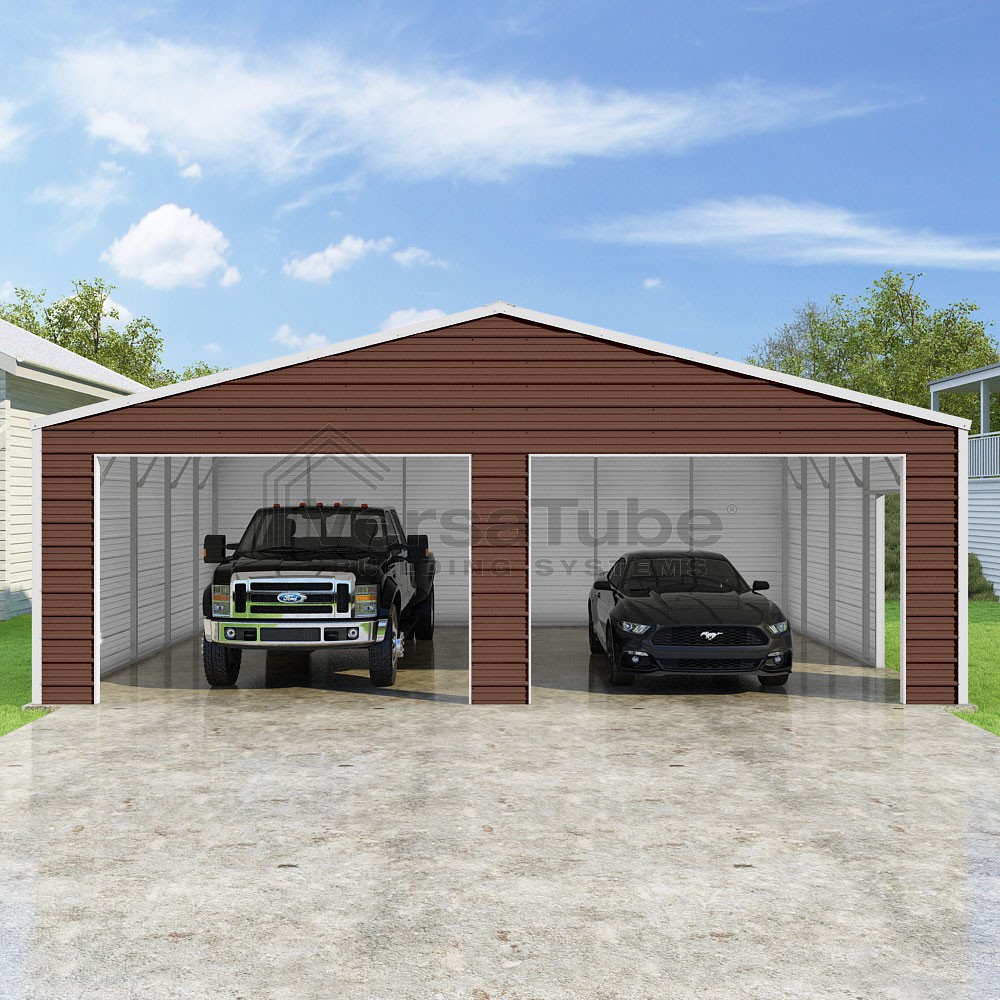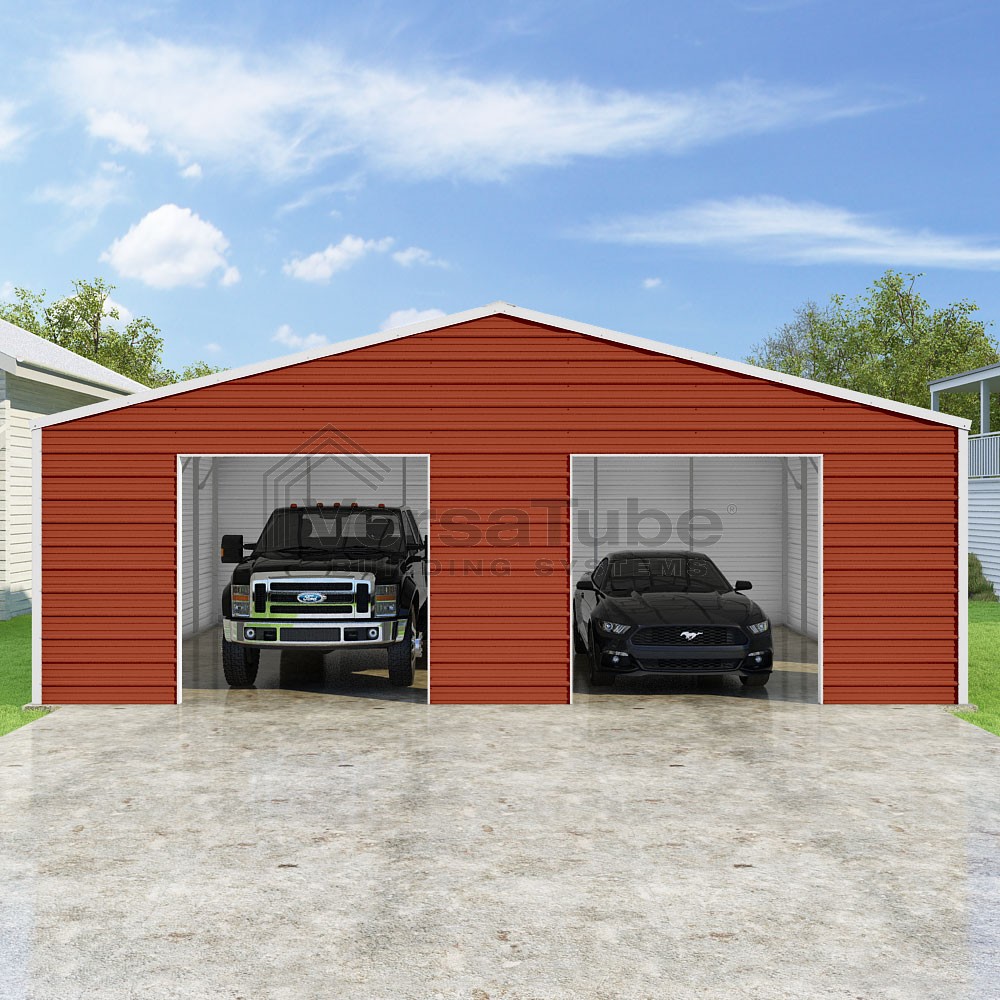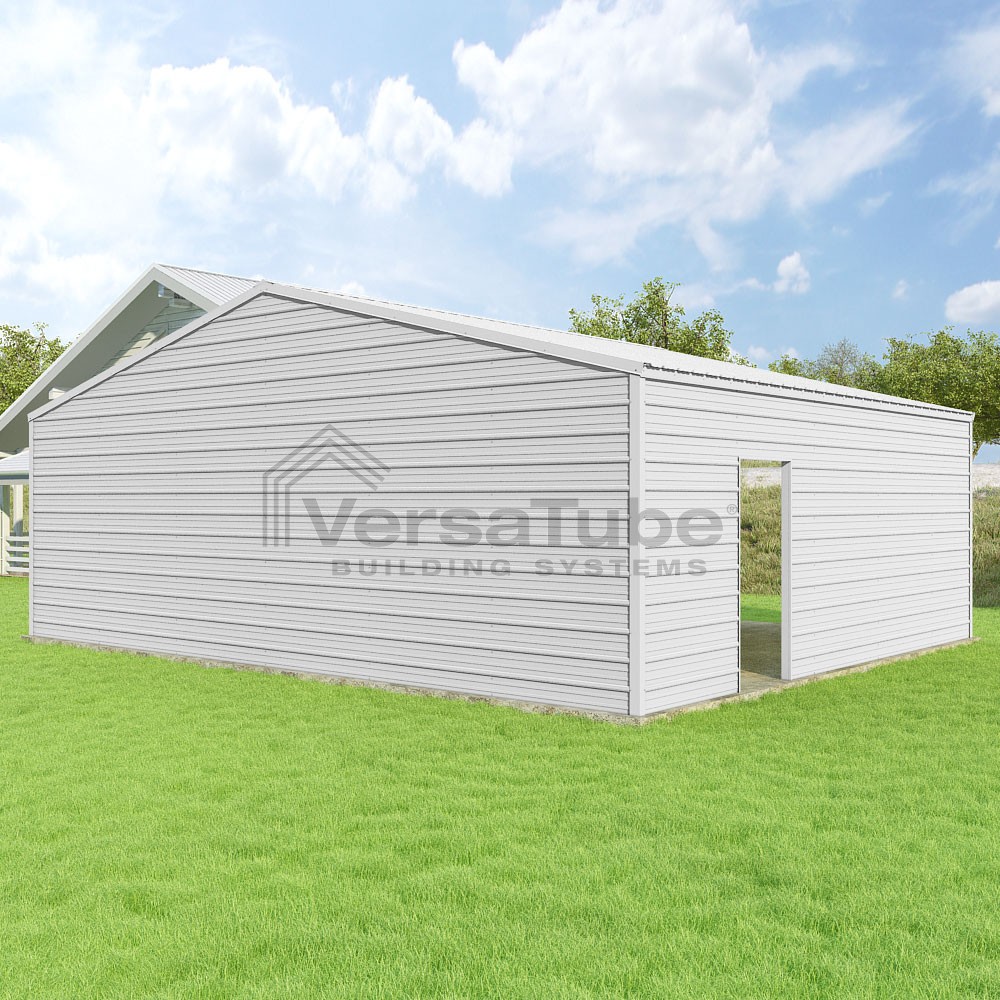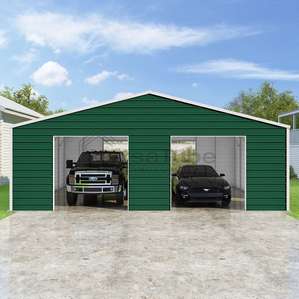 Frontier Series DIY garage kit features vertical sheet metal roof panels with horizontal siding panels..