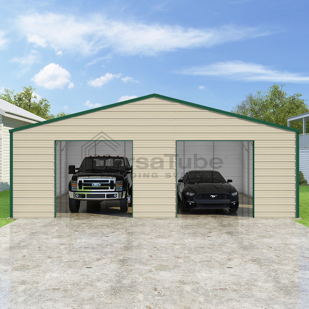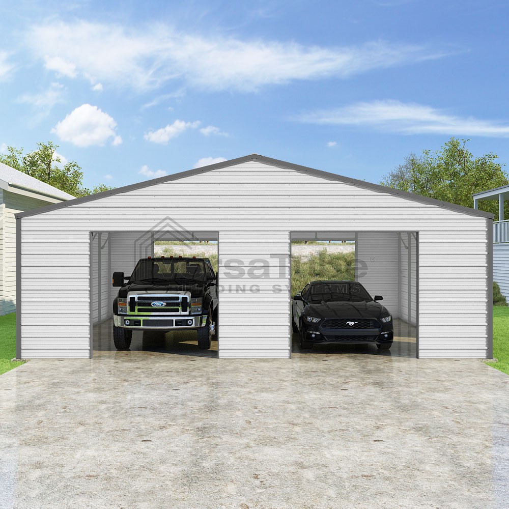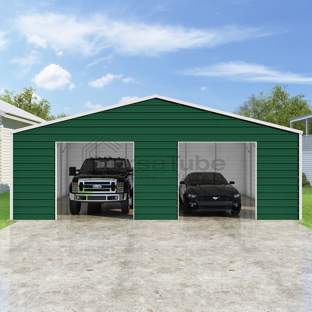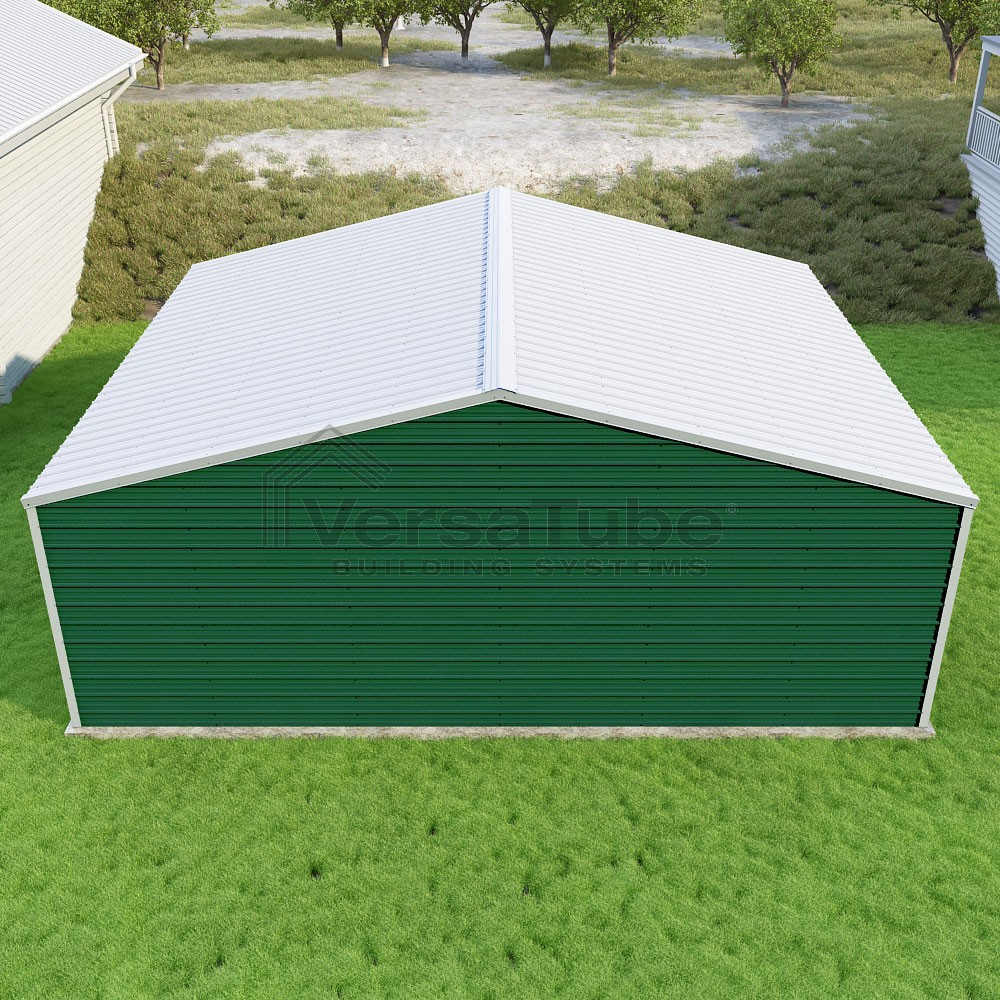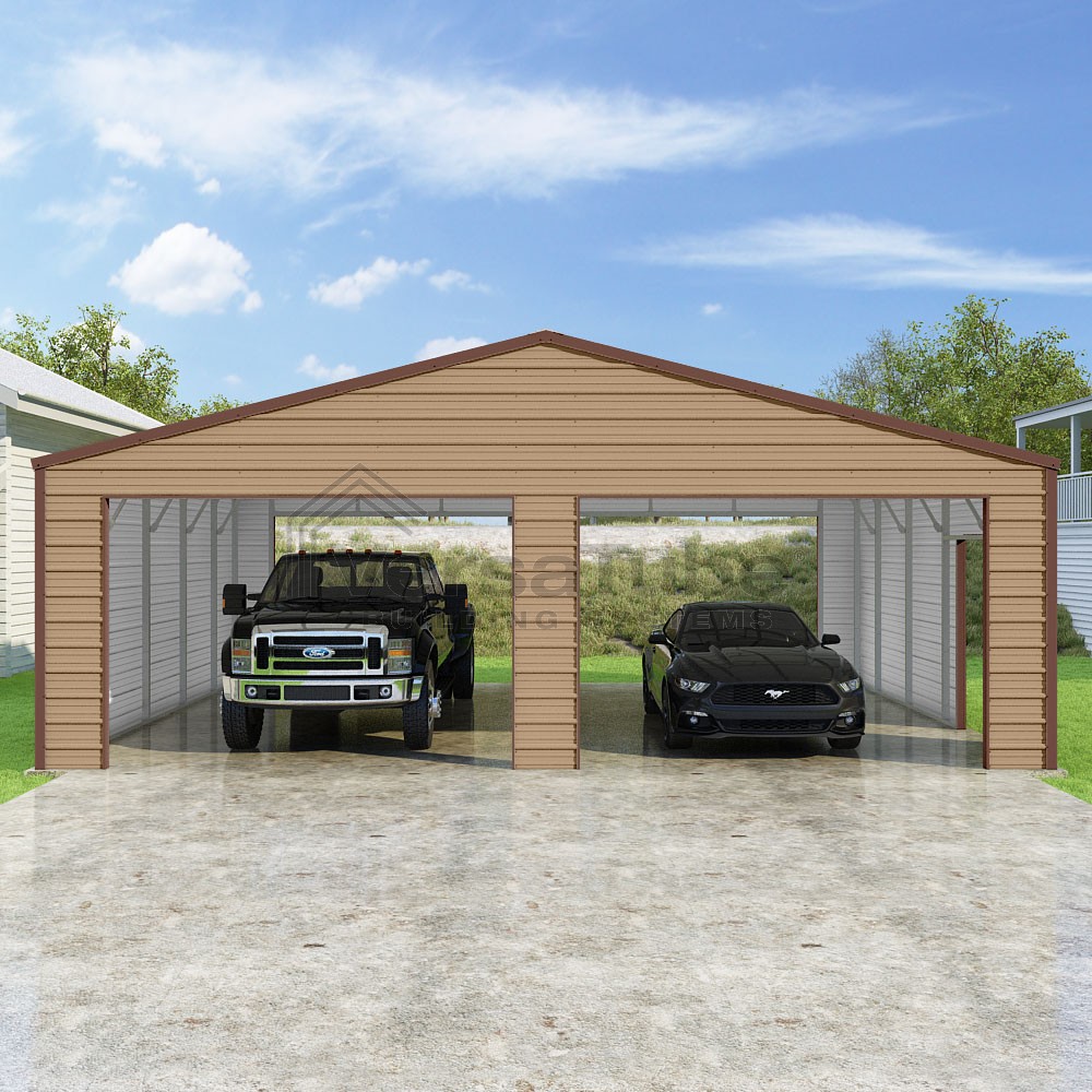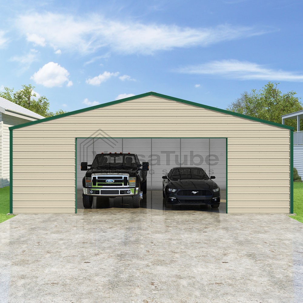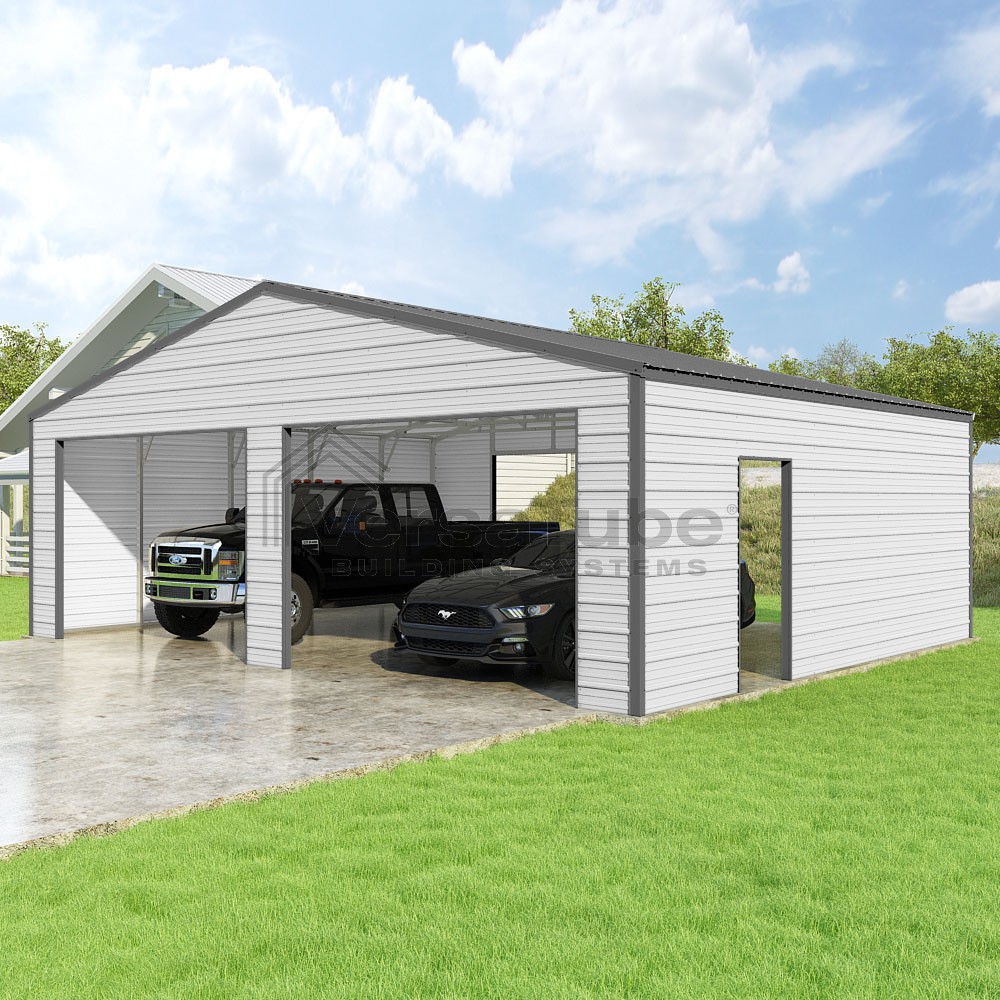Frontier Series DIY garage kit features vertical sheet metal roof panels with horizontal siding panels..