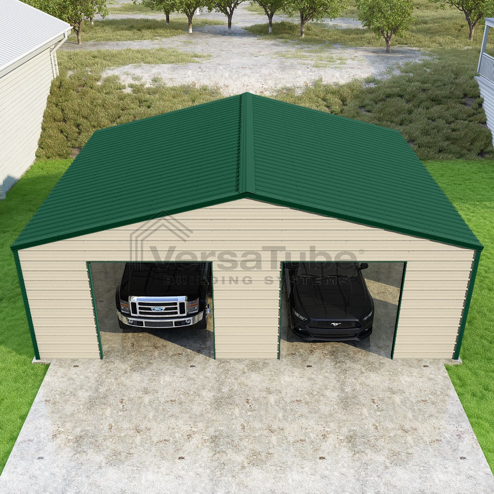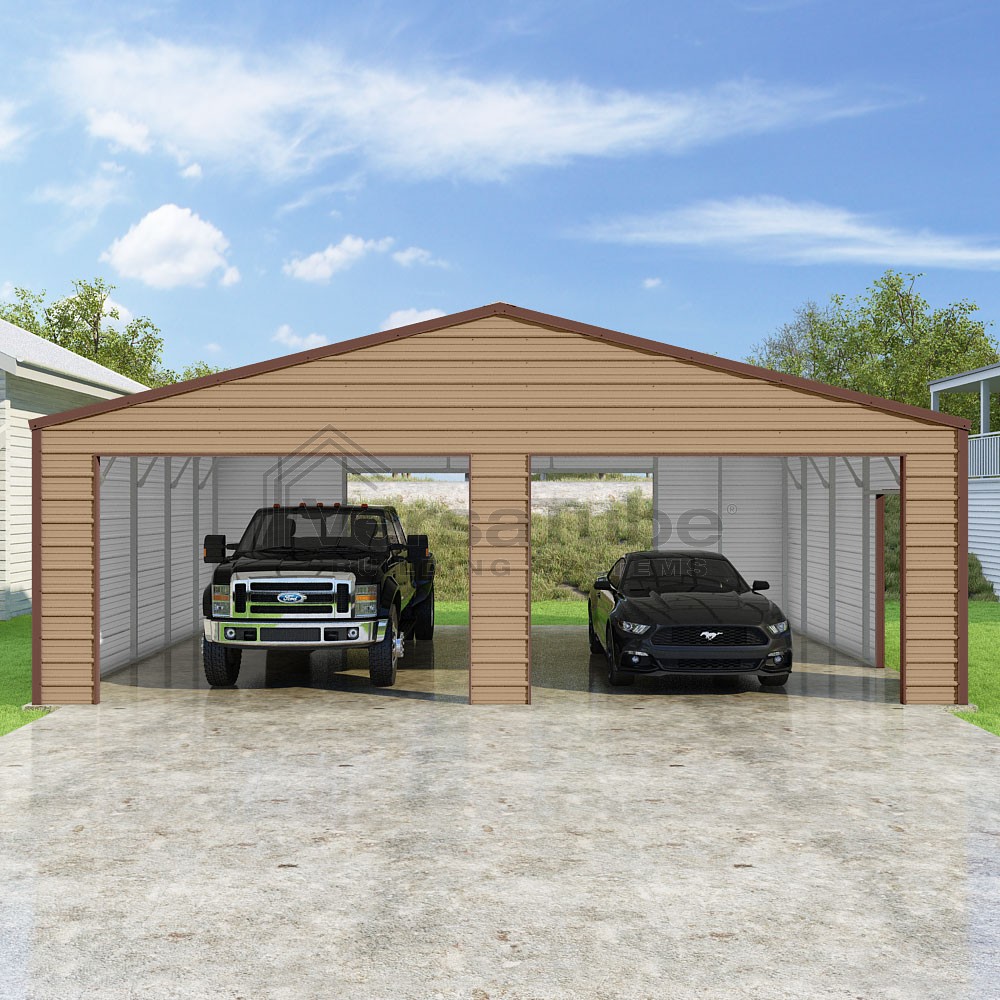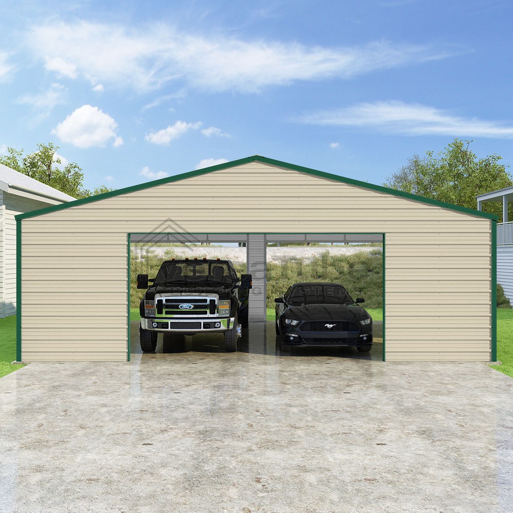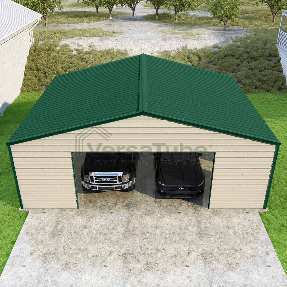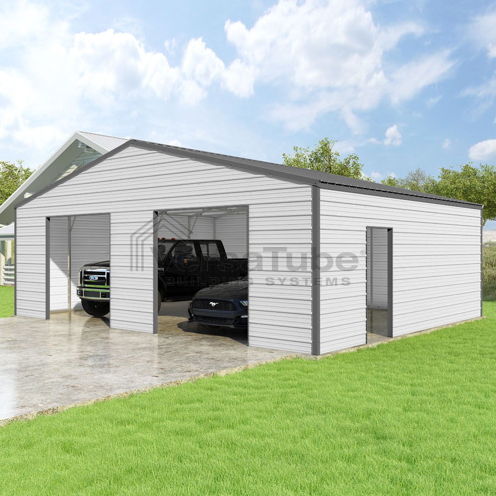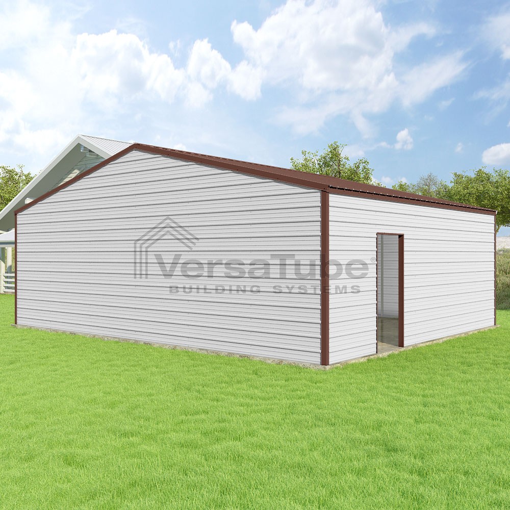 Frontier Series DIY garage kit features vertical sheet metal roof panels with horizontal siding panels..
