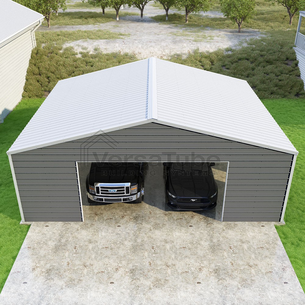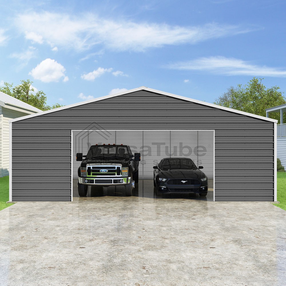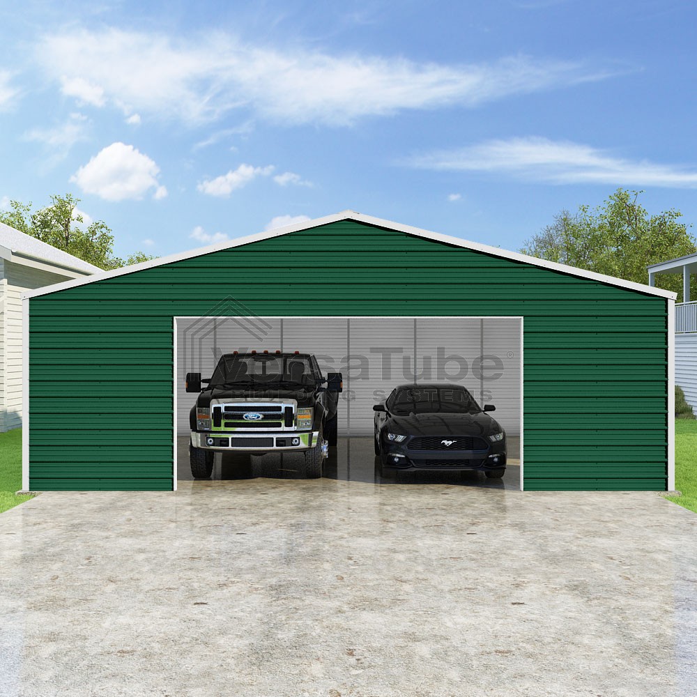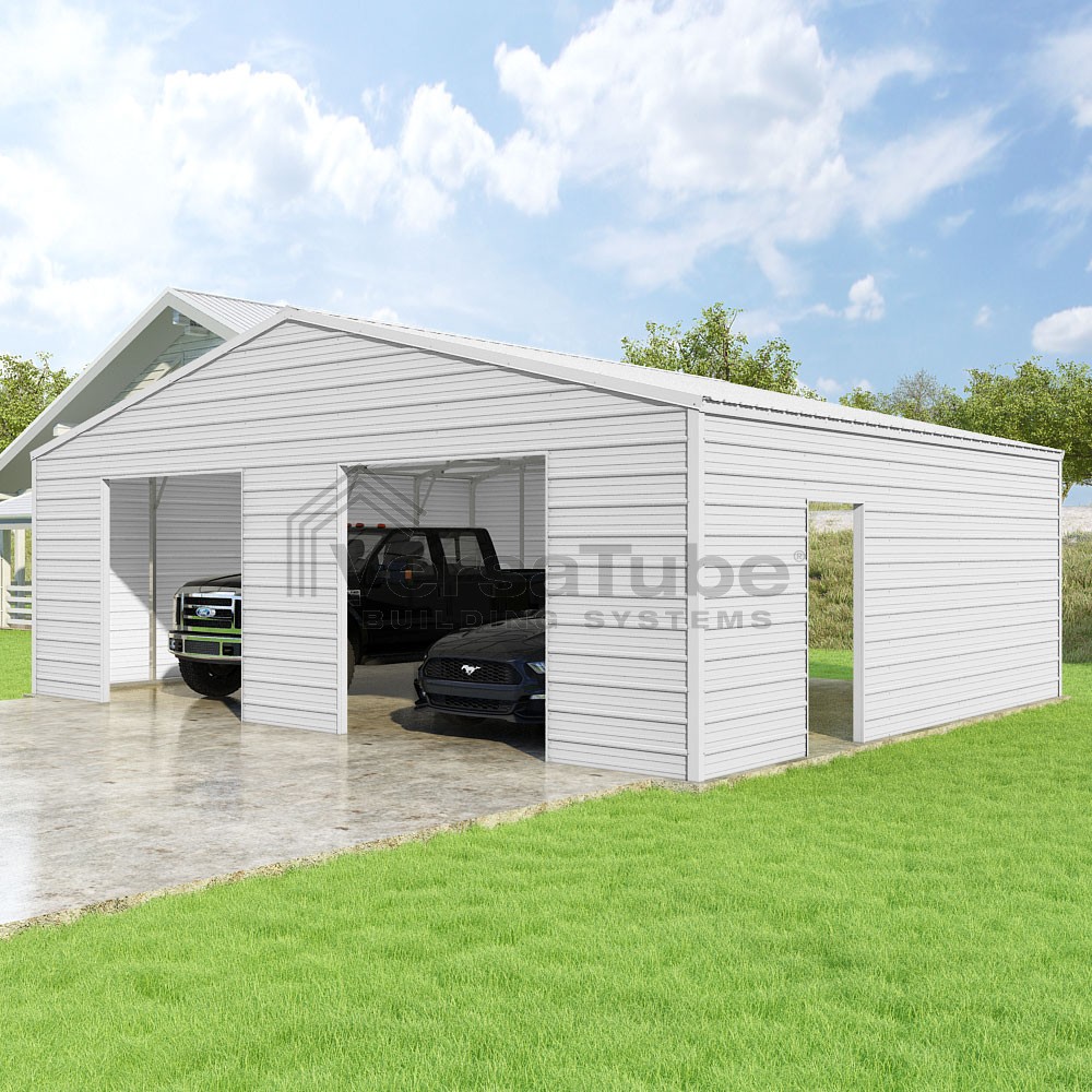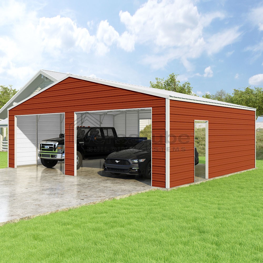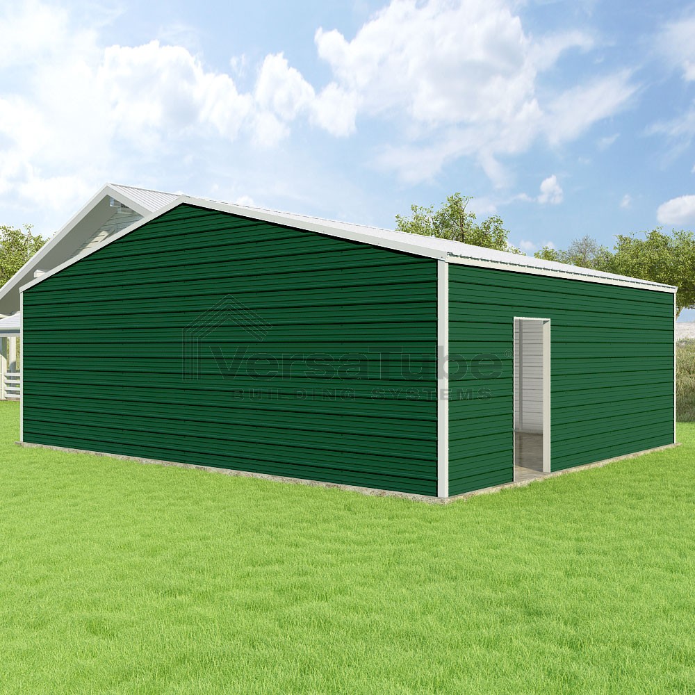 Frontier Series DIY garage kit features vertical sheet metal roof panels with horizontal siding panels..