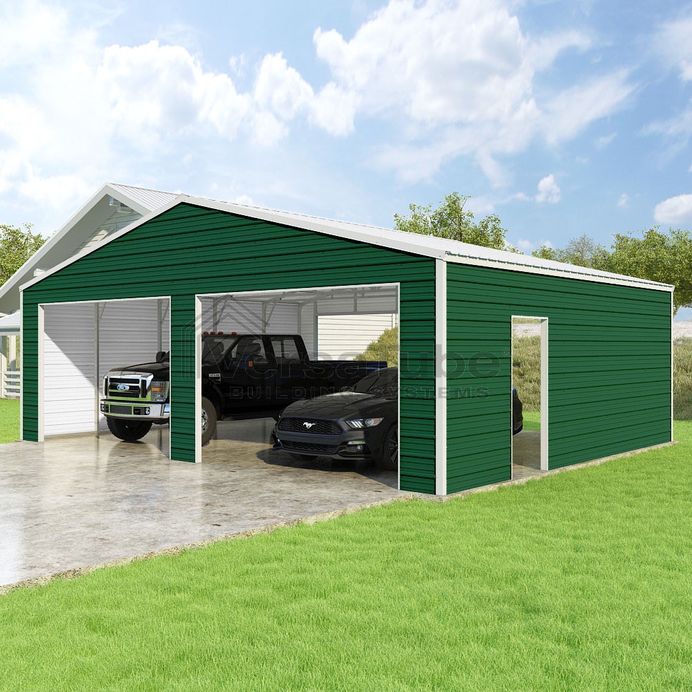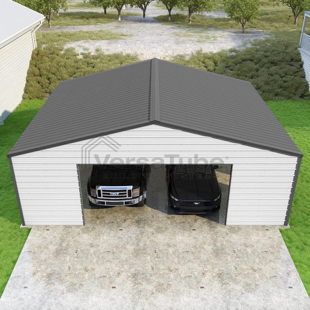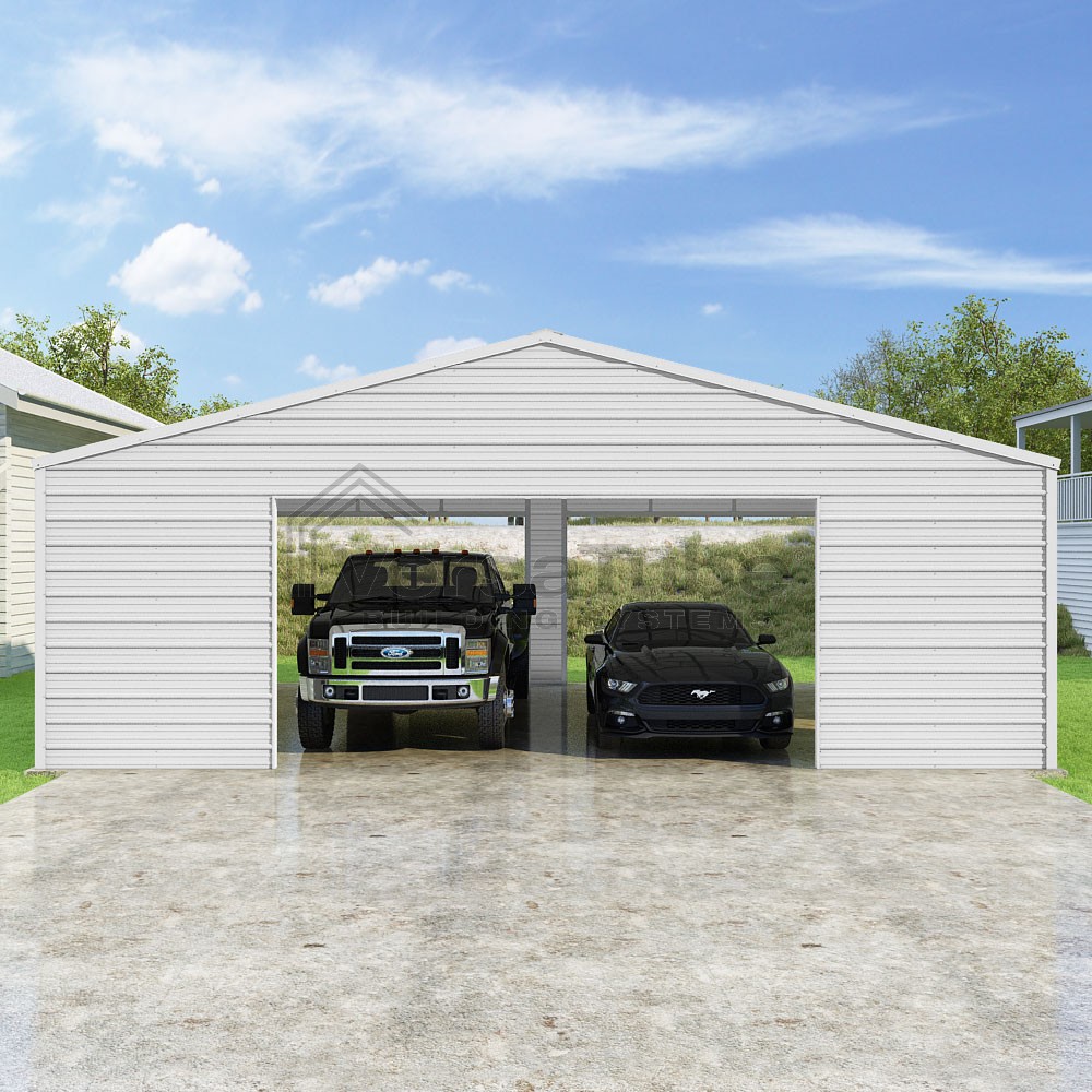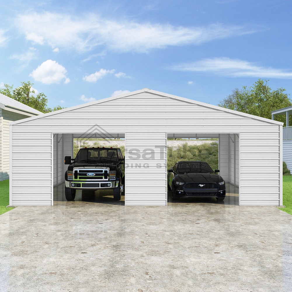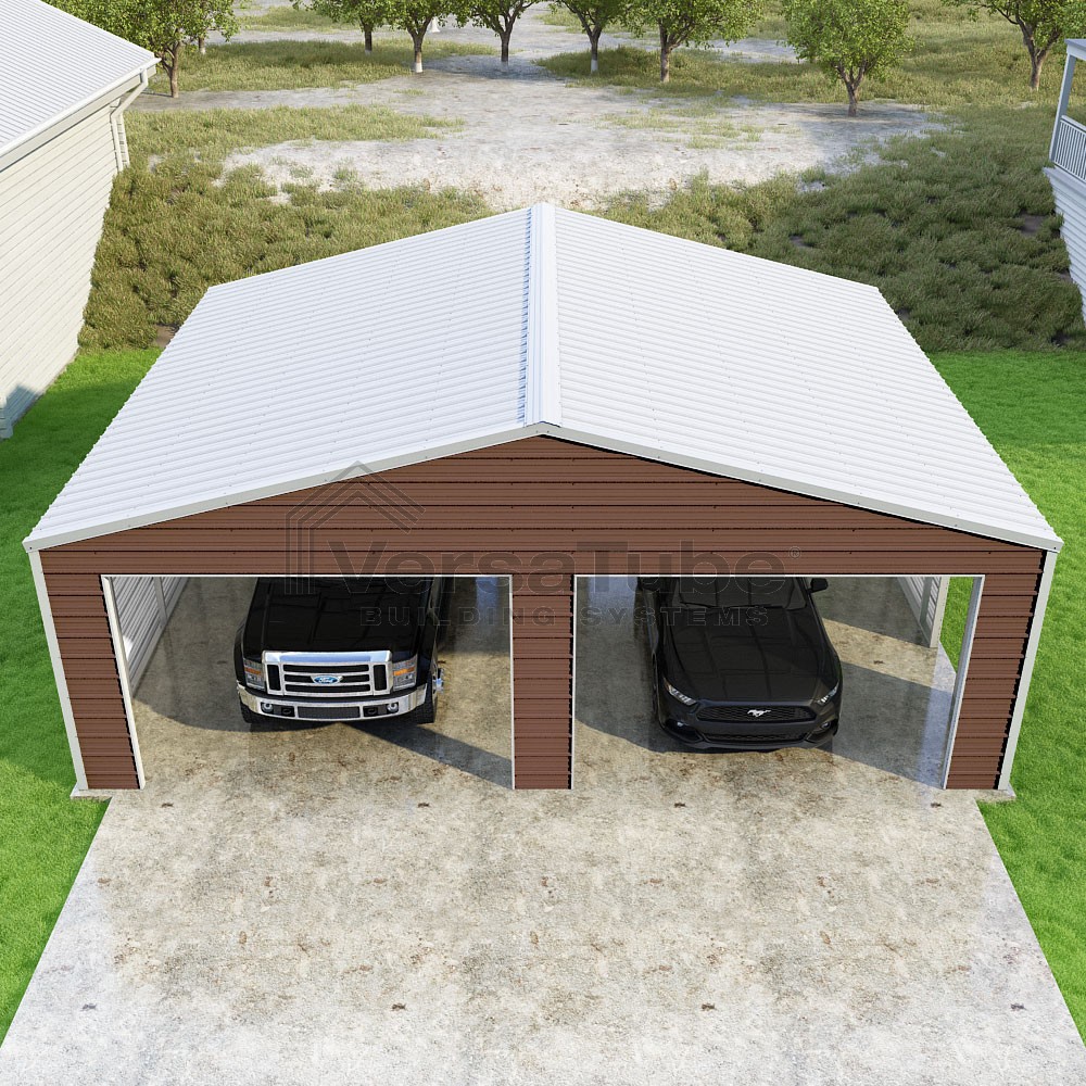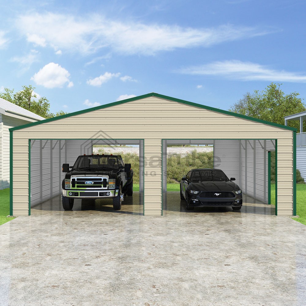 Frontier Series DIY garage kit features vertical sheet metal roof panels with horizontal siding panels..