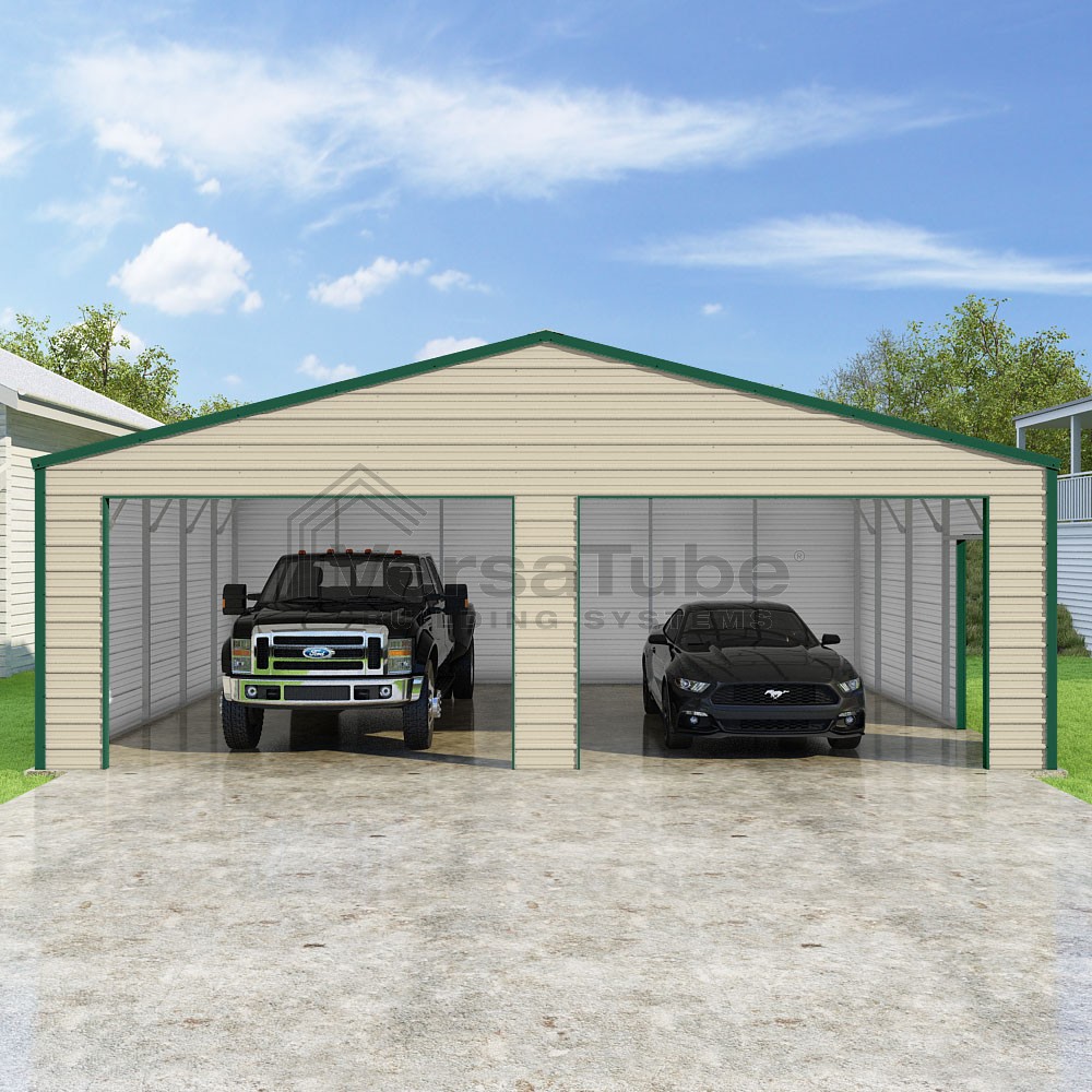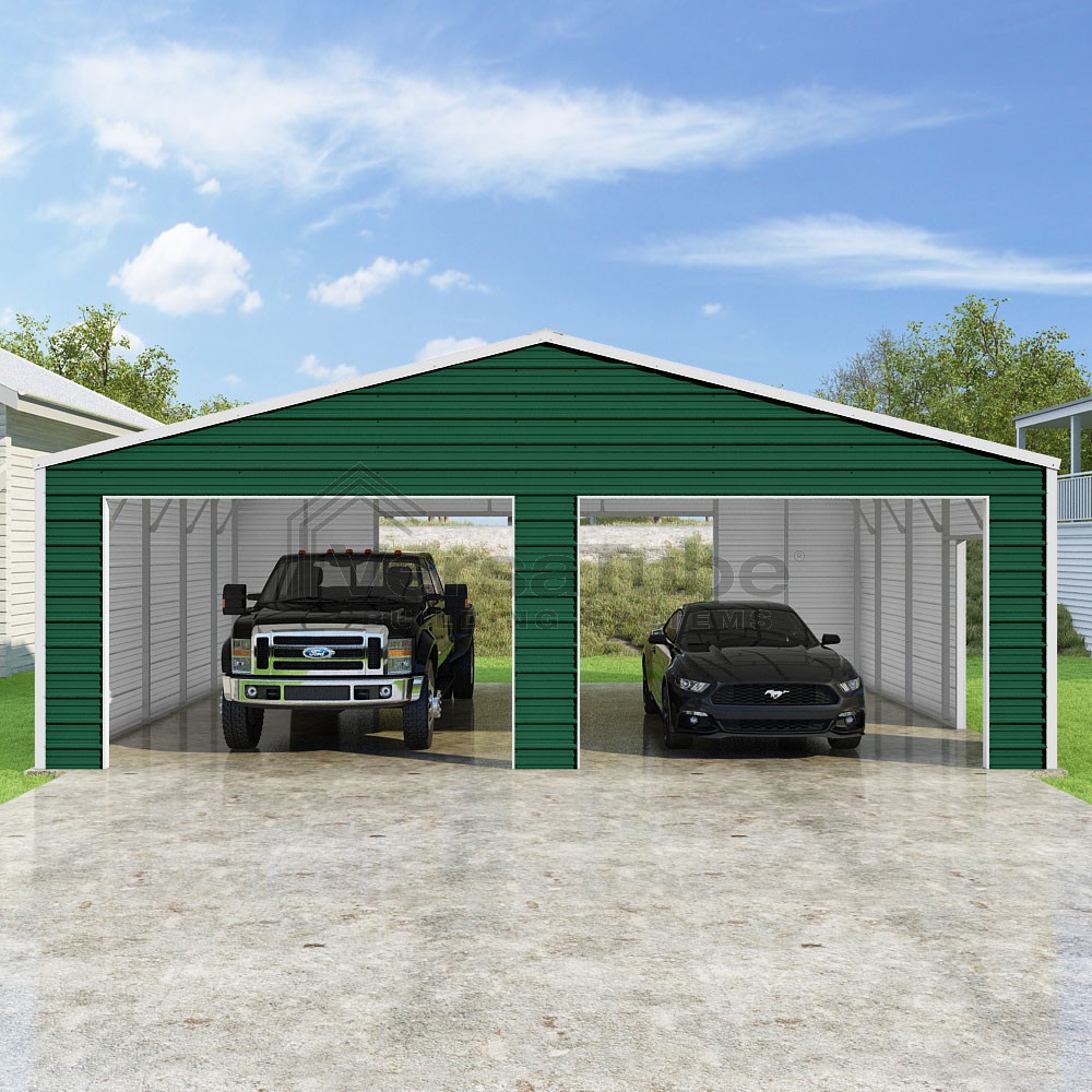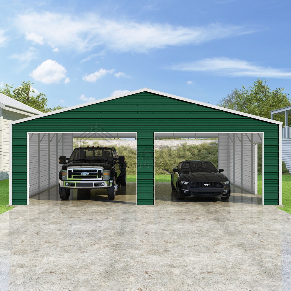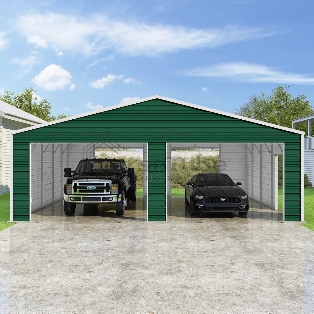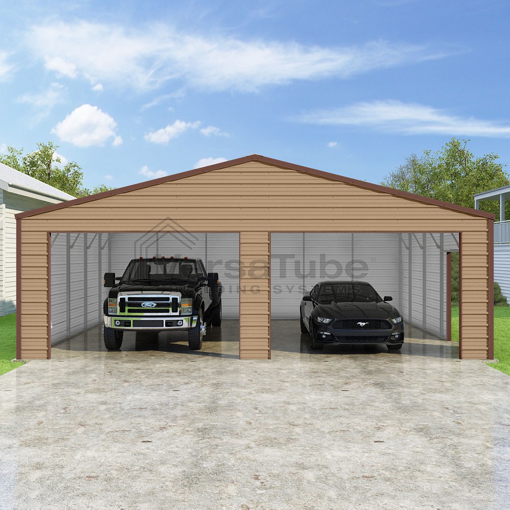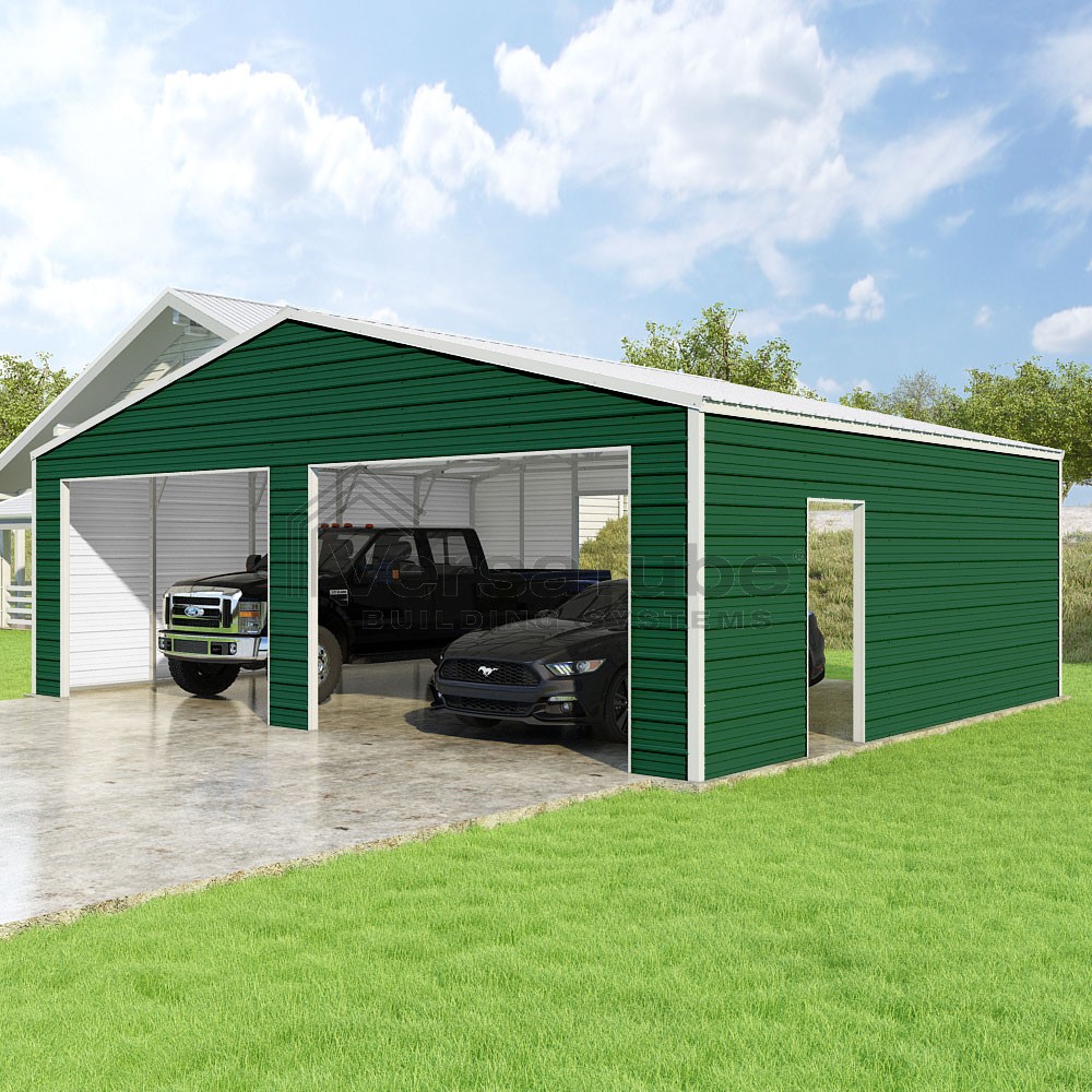 Frontier Series DIY garage kit features vertical sheet metal roof panels with horizontal siding panels..