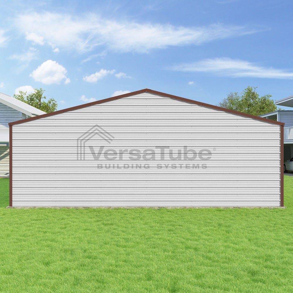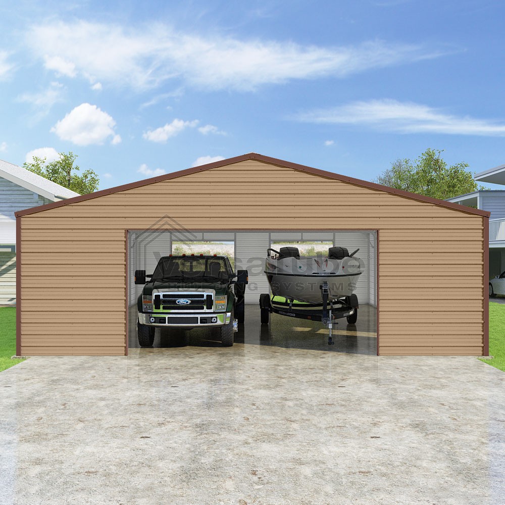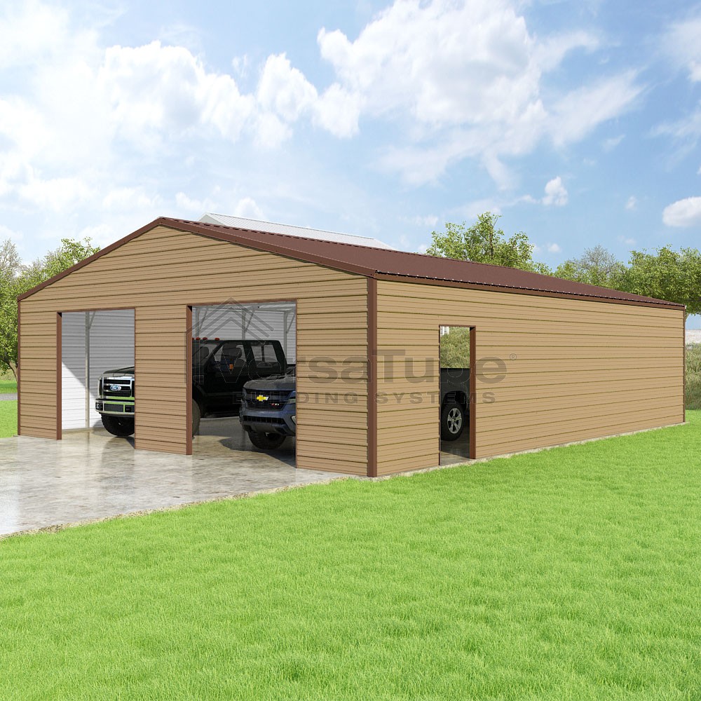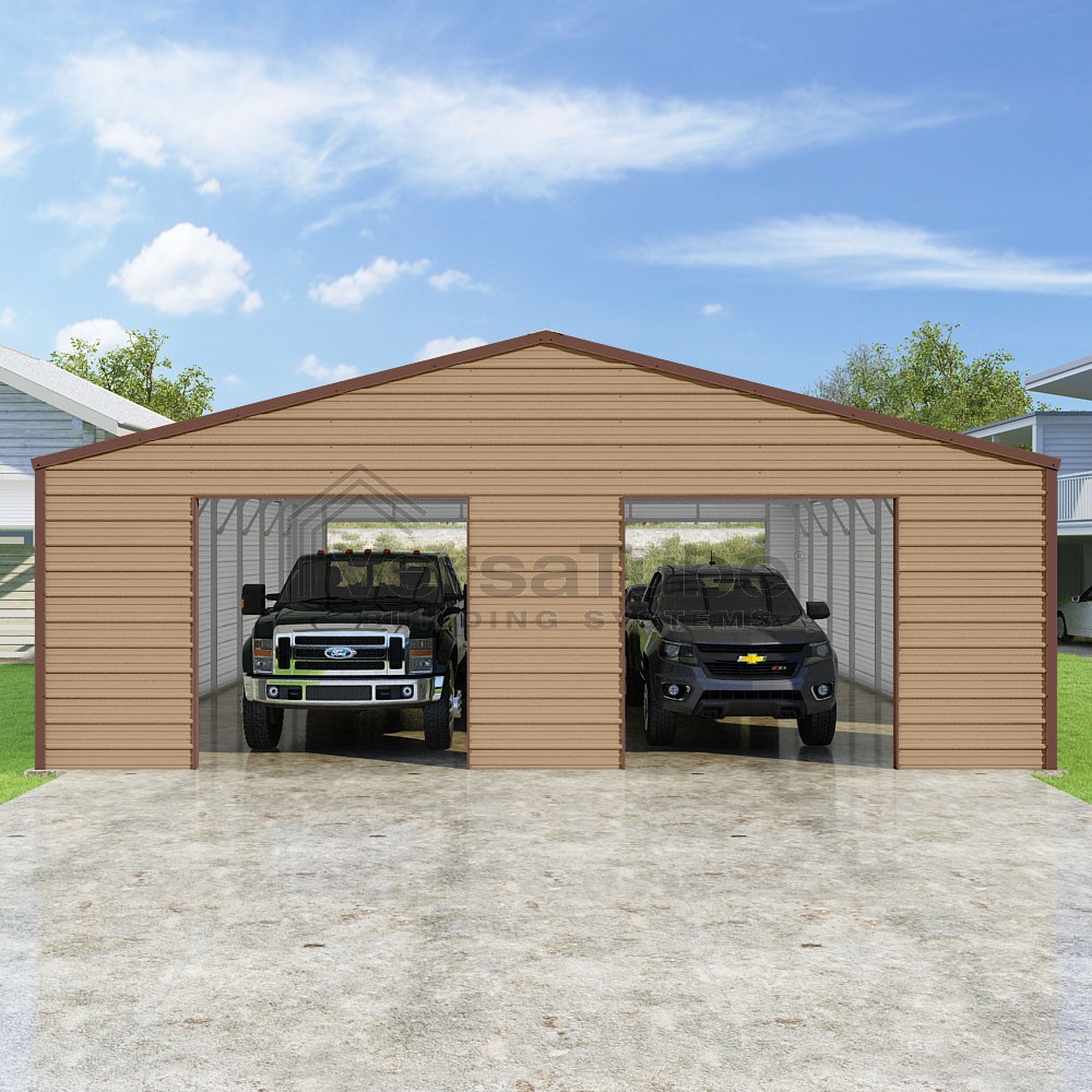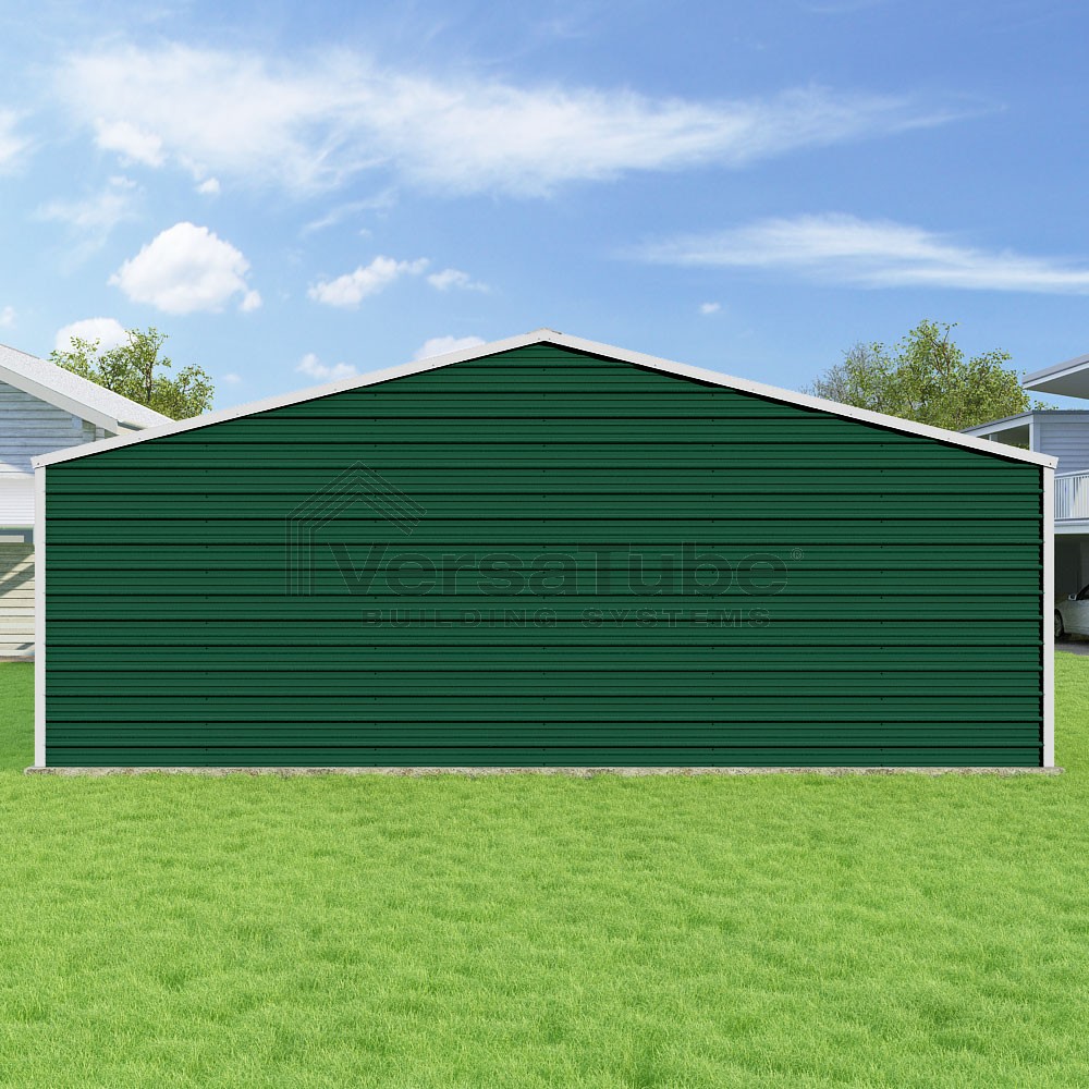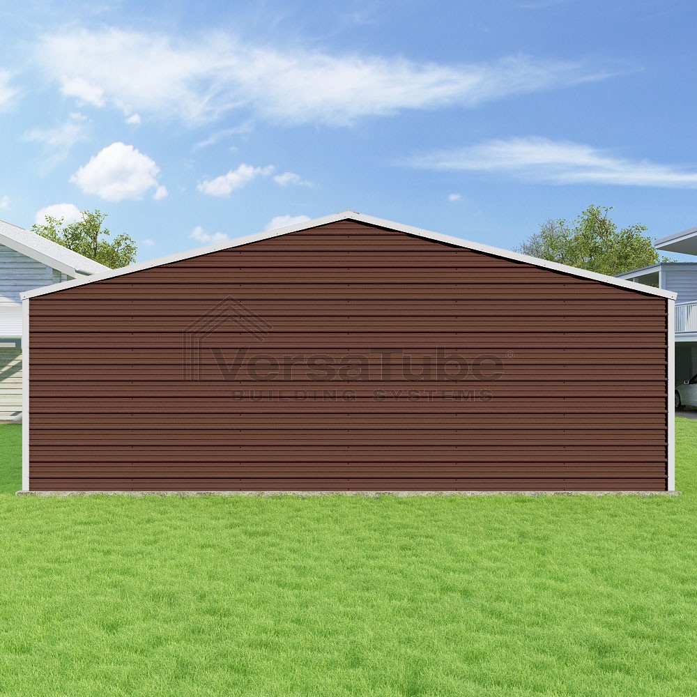 Frontier Series DIY garage kit features vertical sheet metal roof panels with horizontal siding panels..