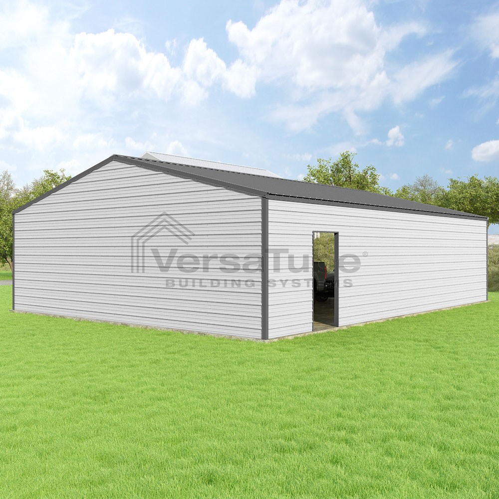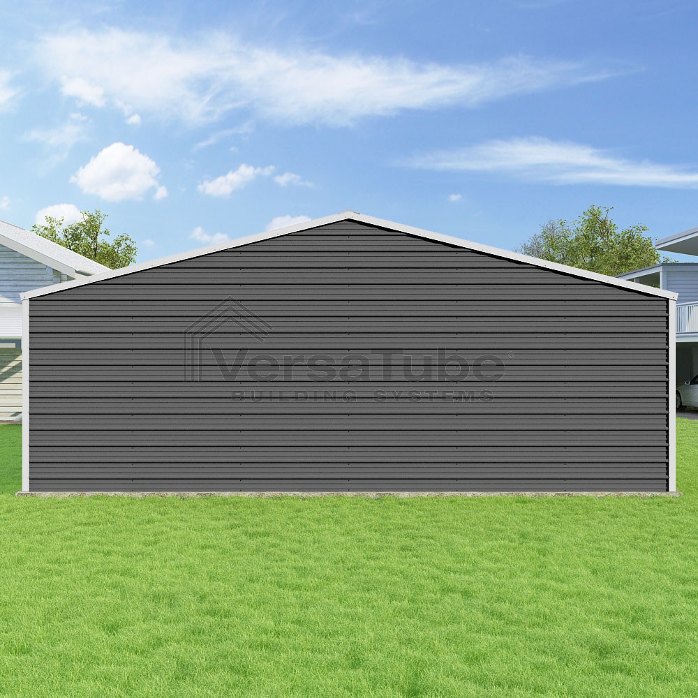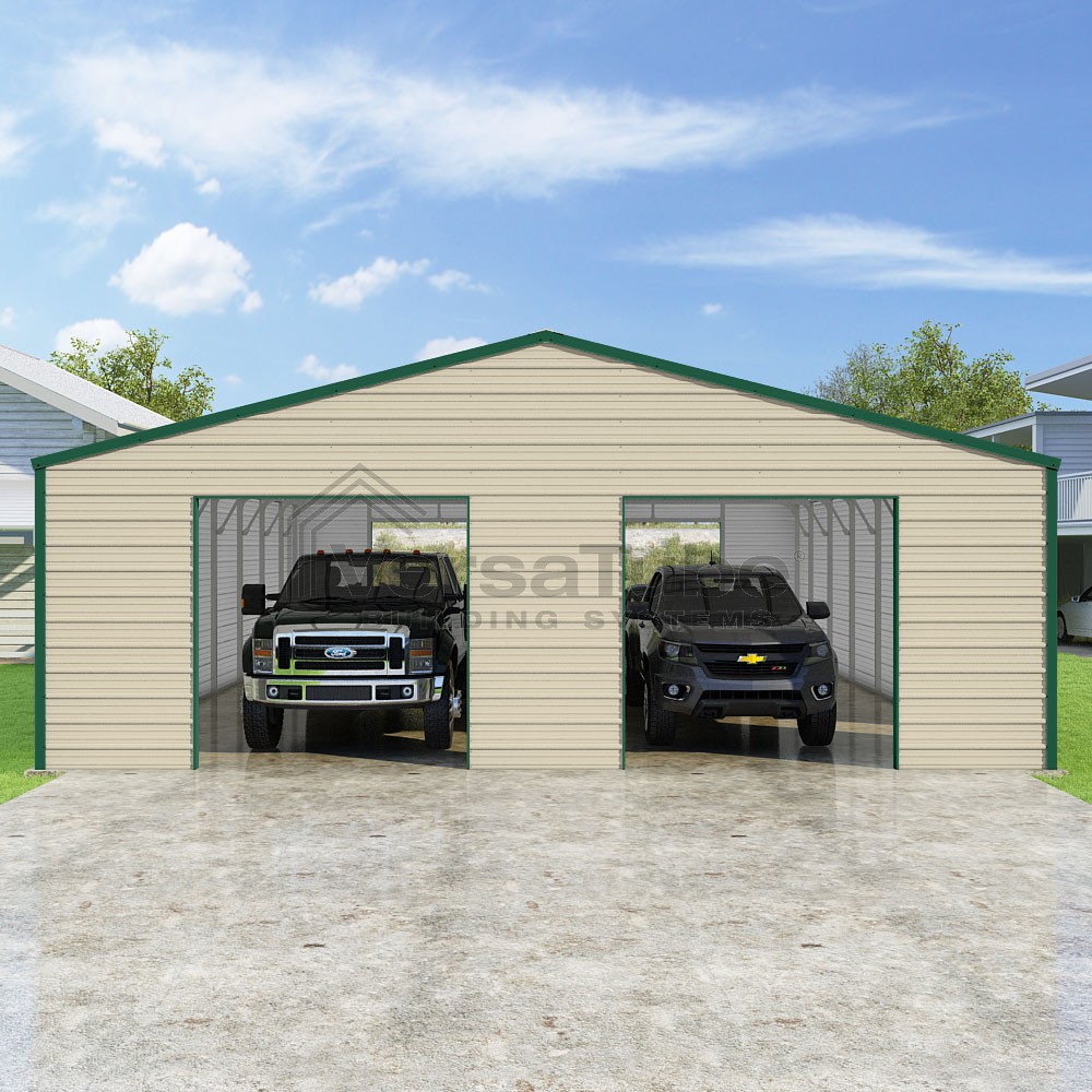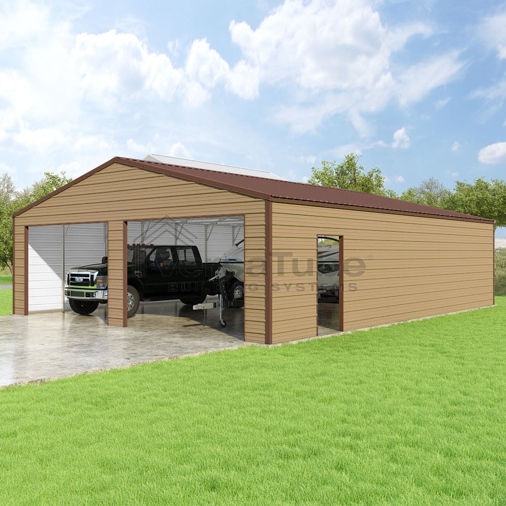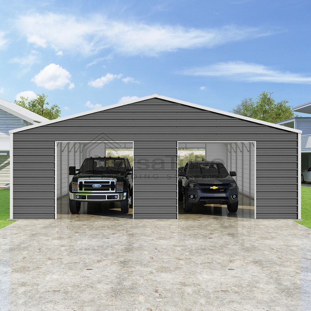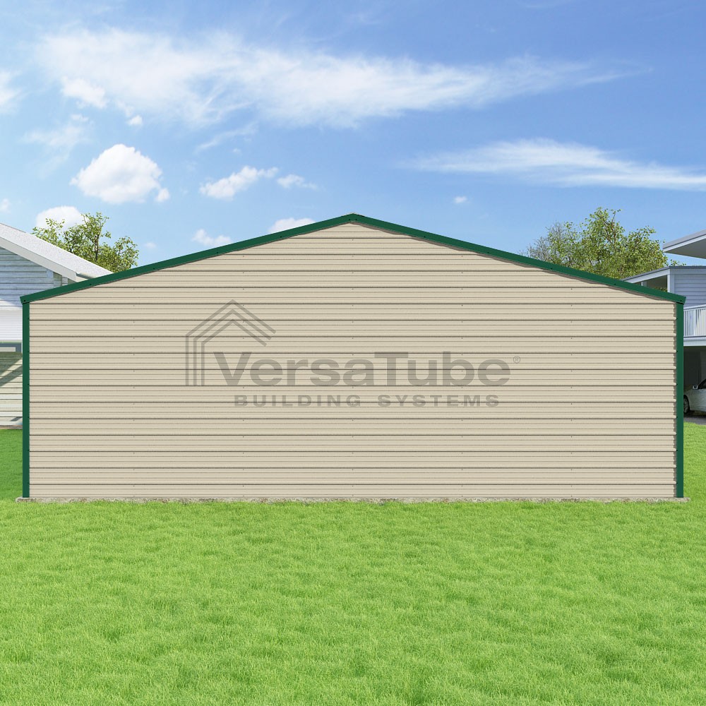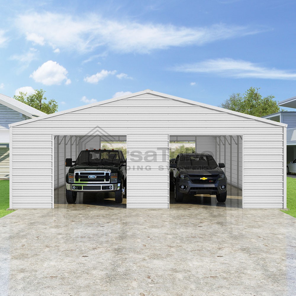 Frontier Series DIY garage kit features vertical sheet metal roof panels with horizontal siding panels..