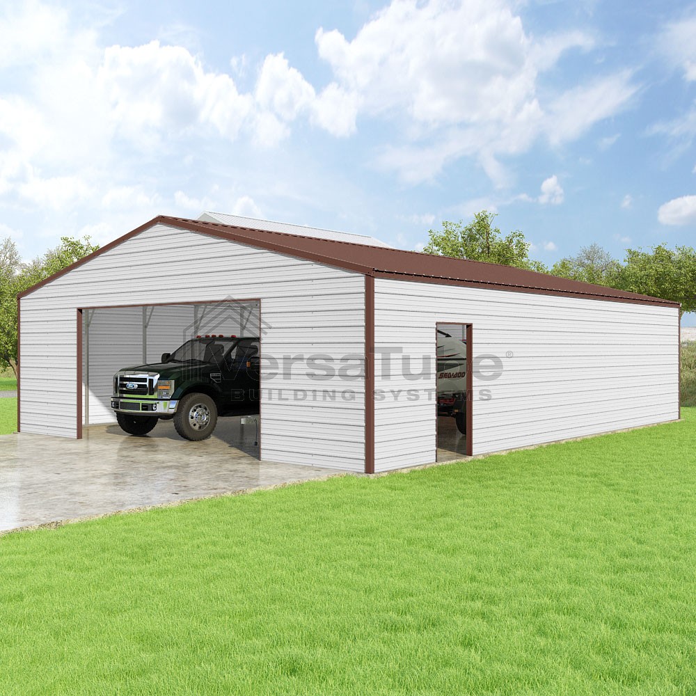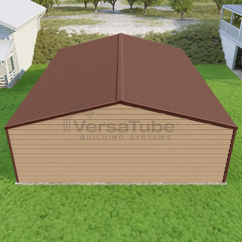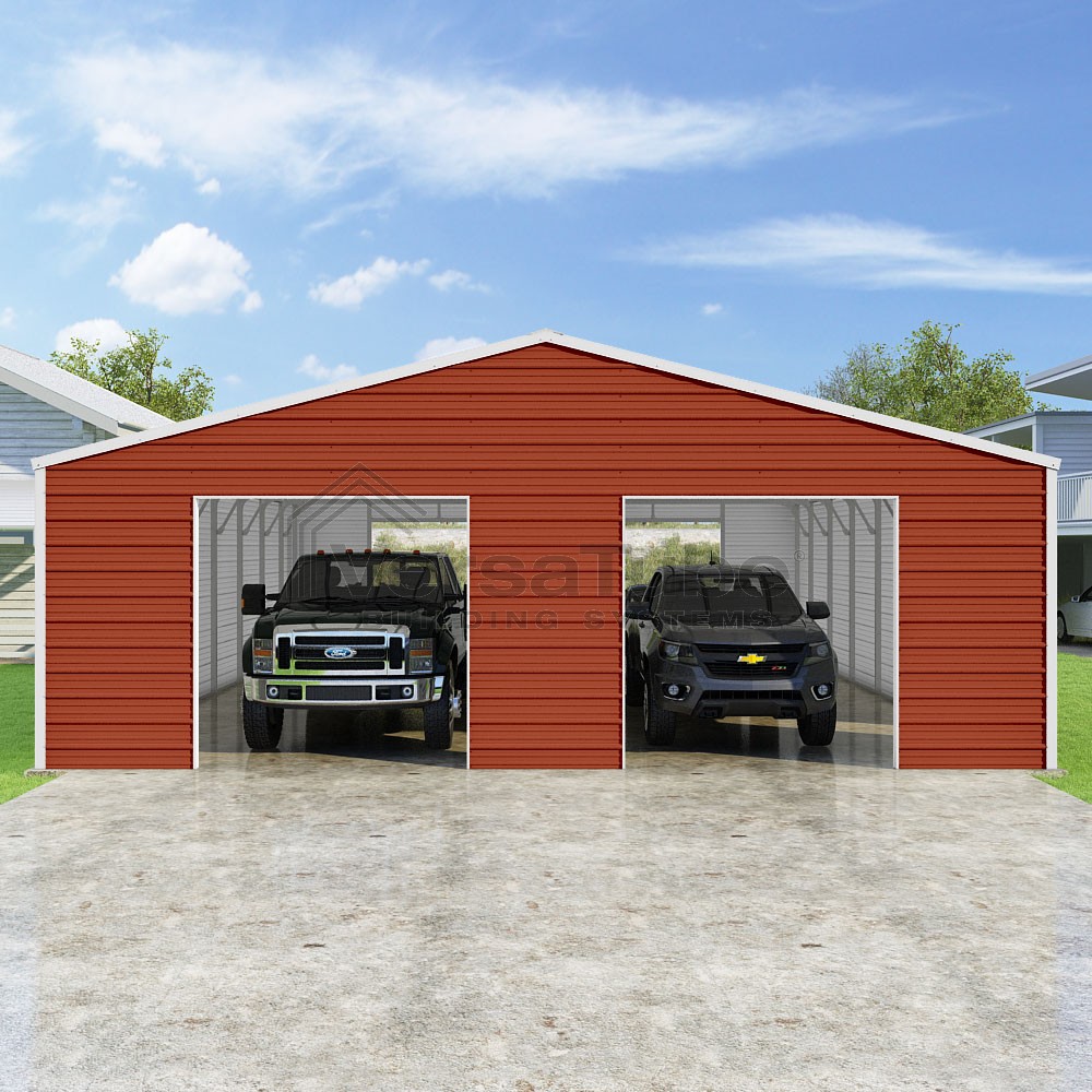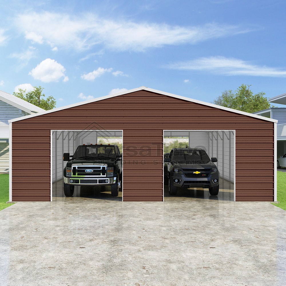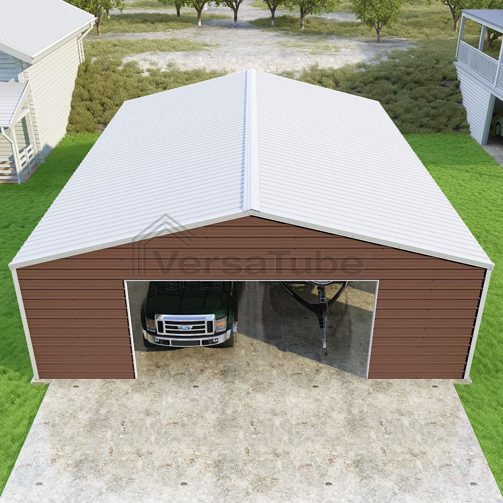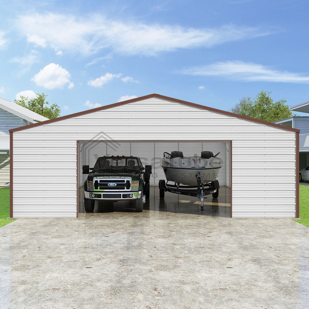 Frontier Series DIY garage kit features vertical sheet metal roof panels with horizontal siding panels..