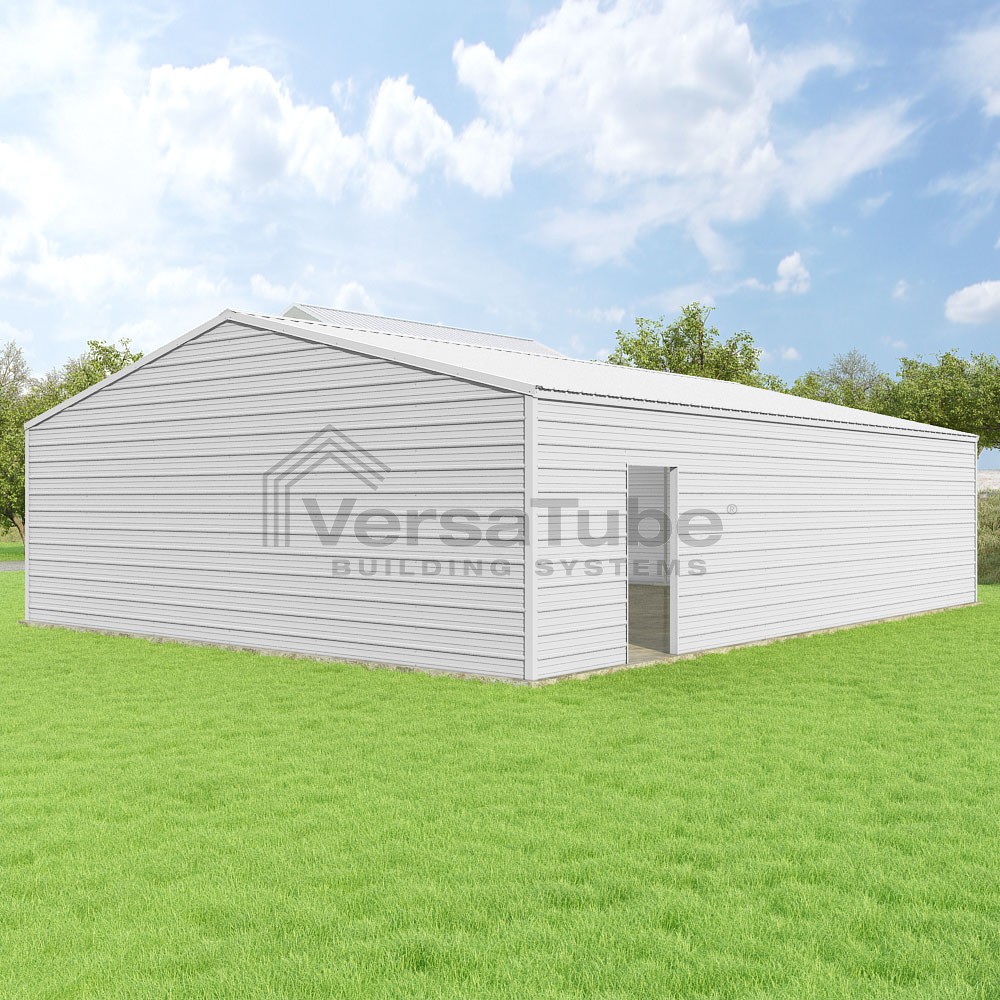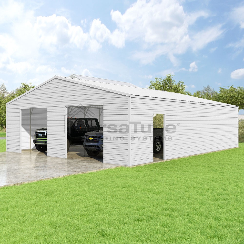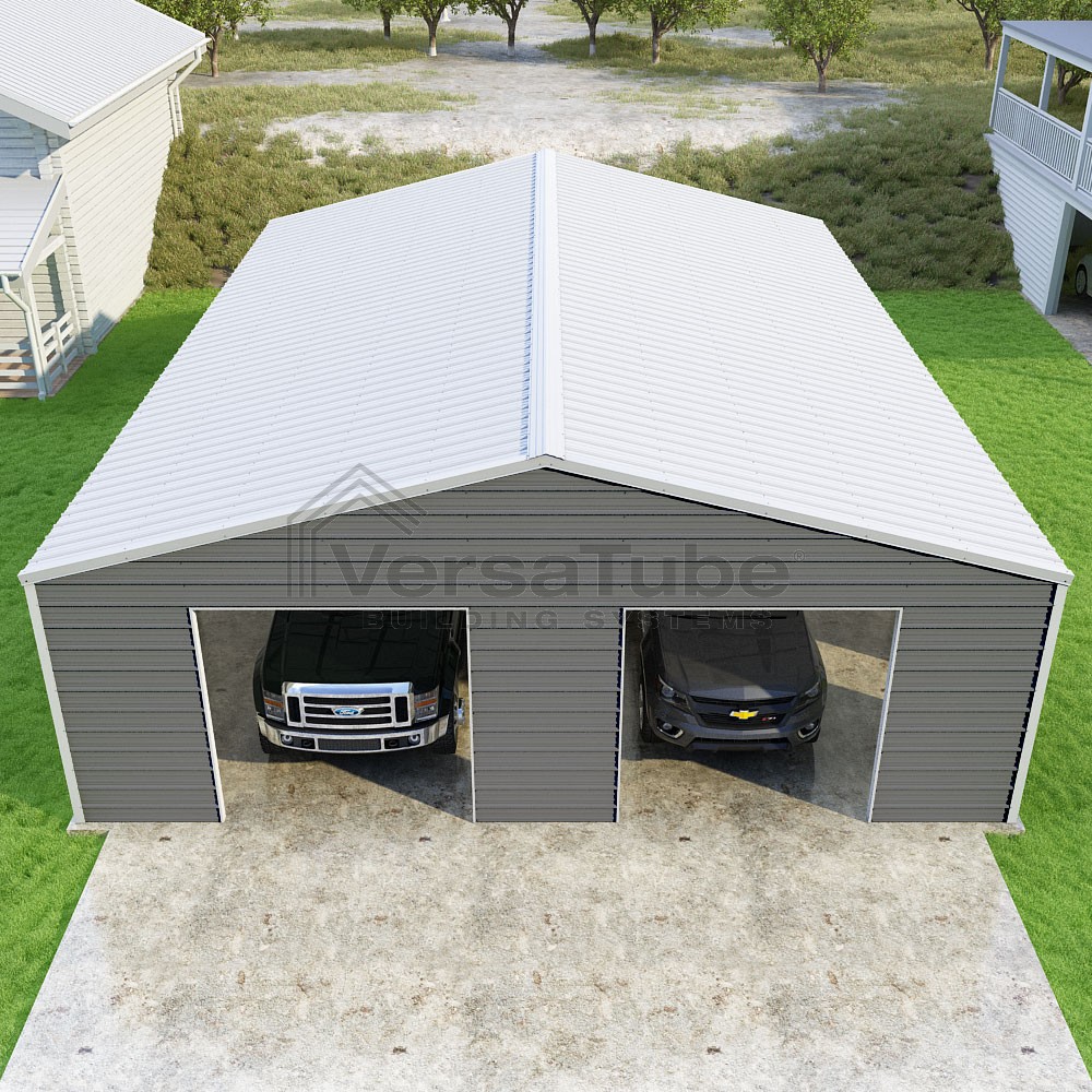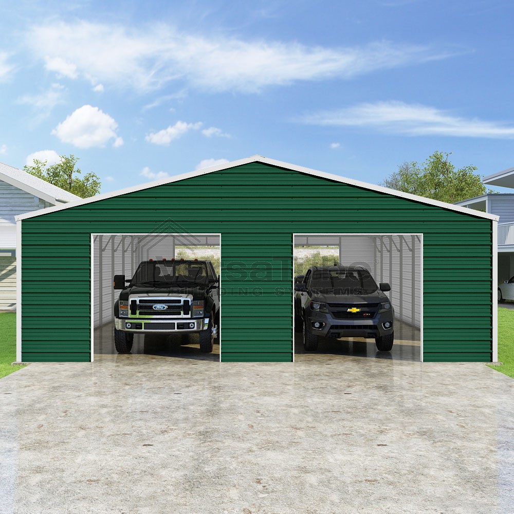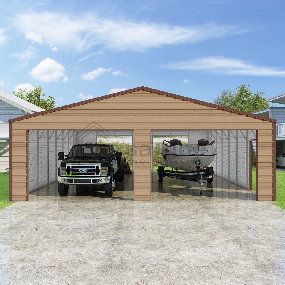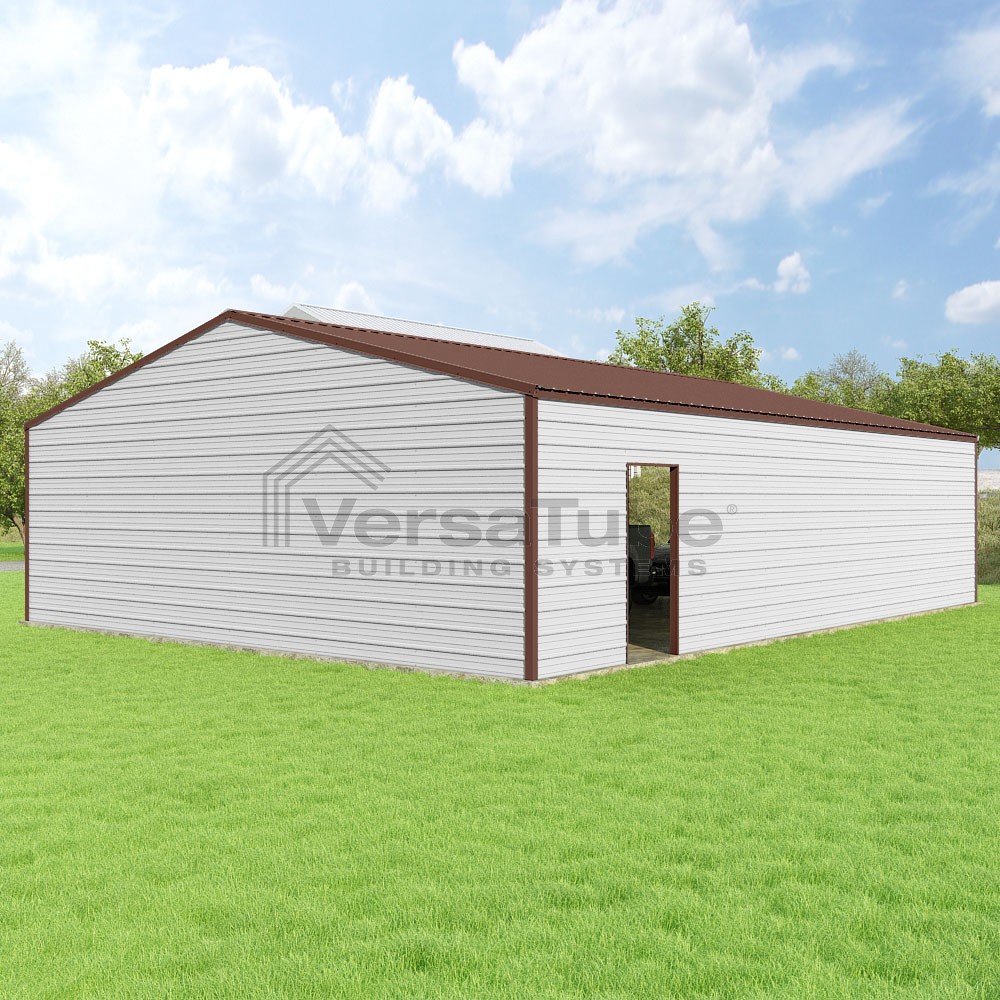 Frontier Series DIY garage kit features vertical sheet metal roof panels with horizontal siding panels..
