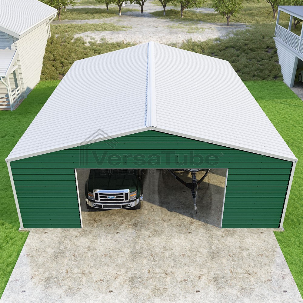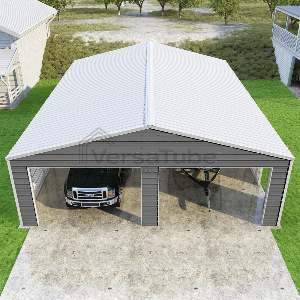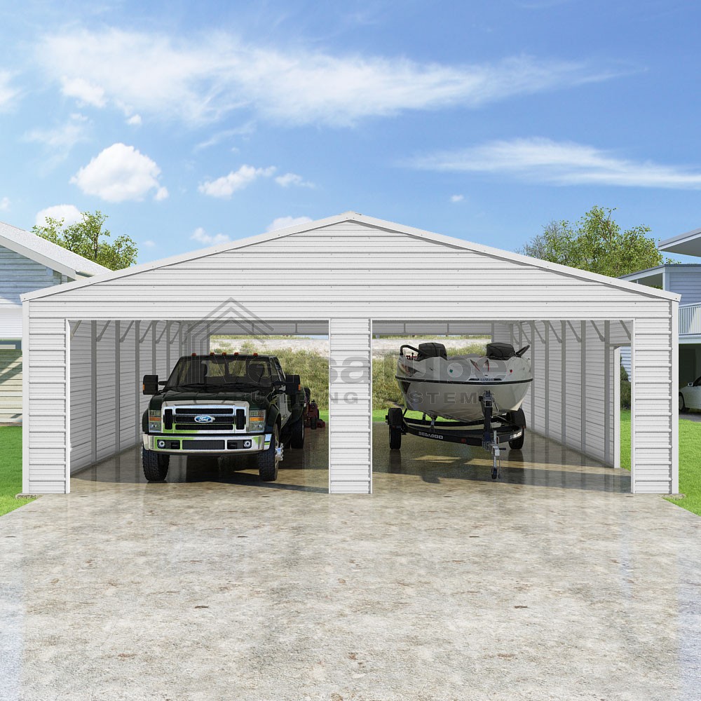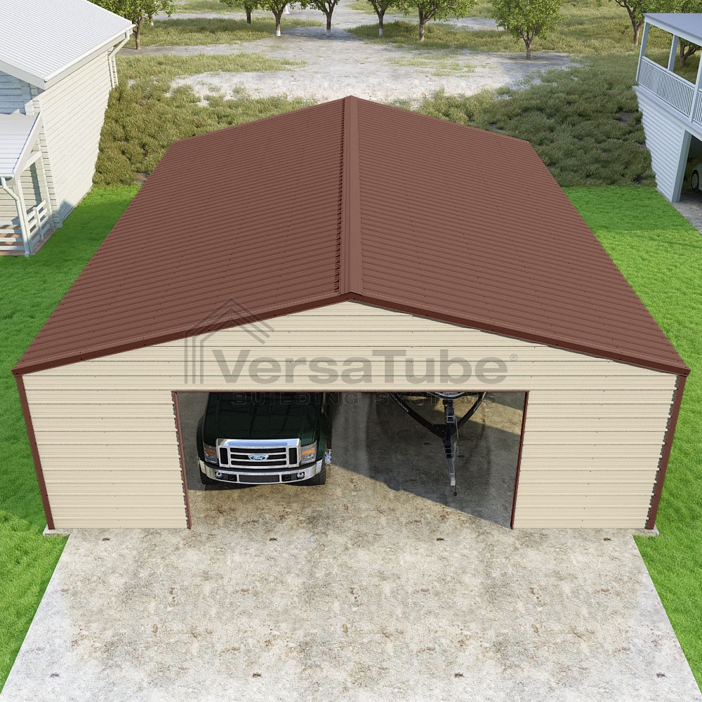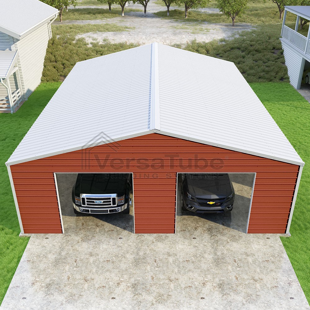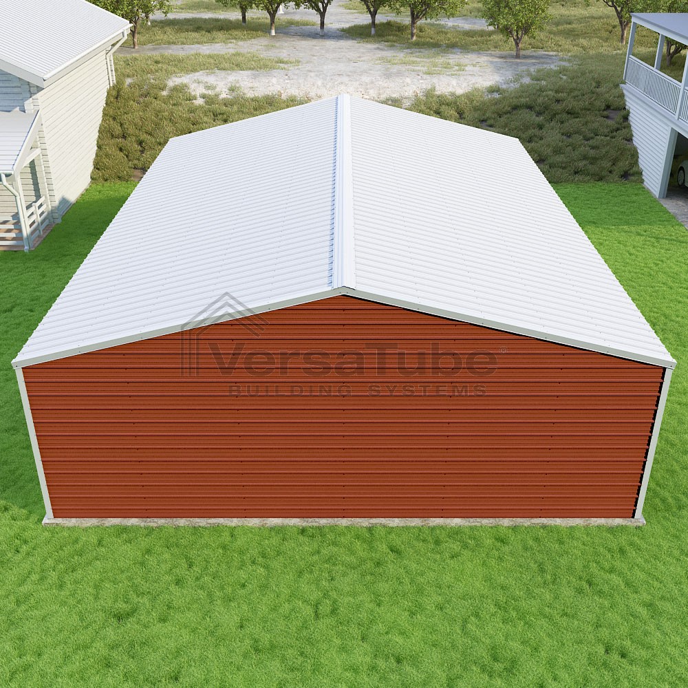 Frontier Series DIY garage kit features vertical sheet metal roof panels with horizontal siding panels..