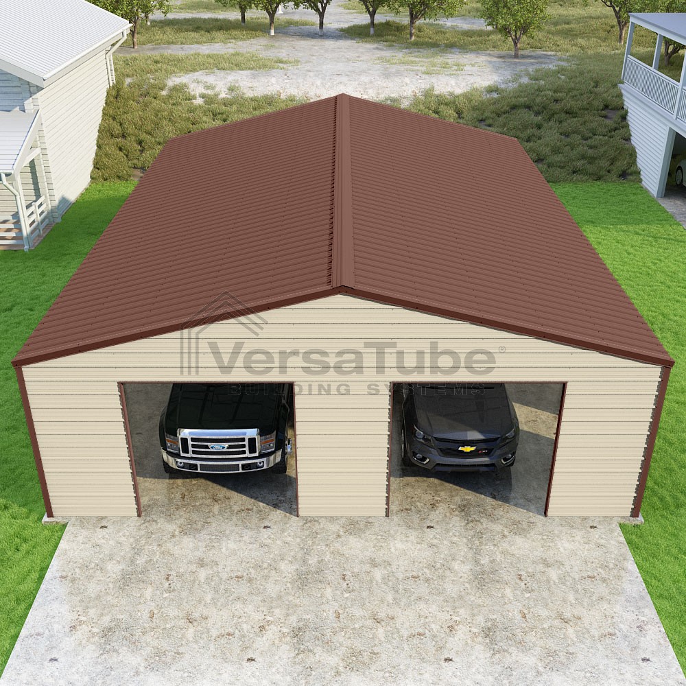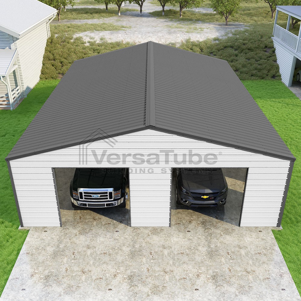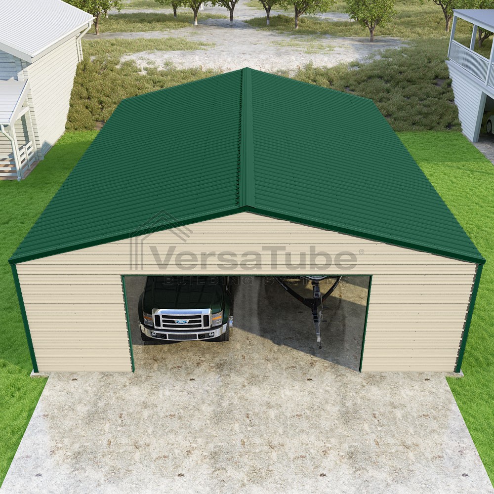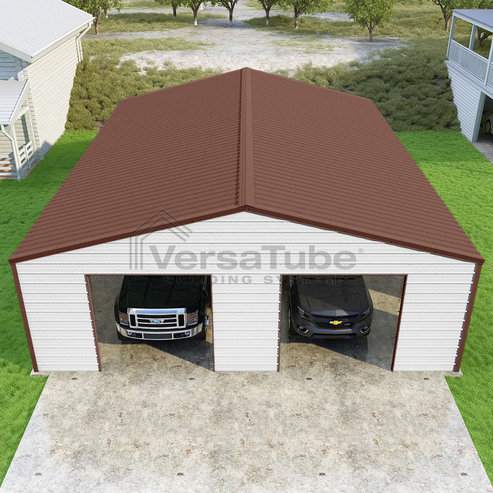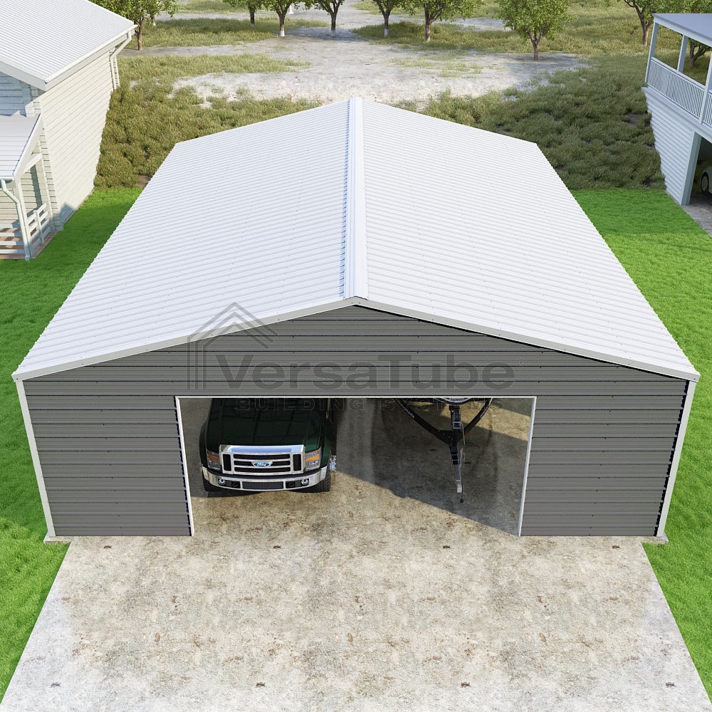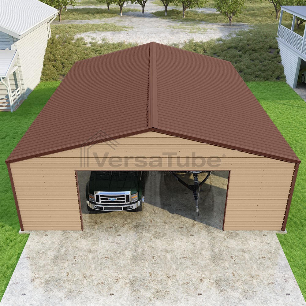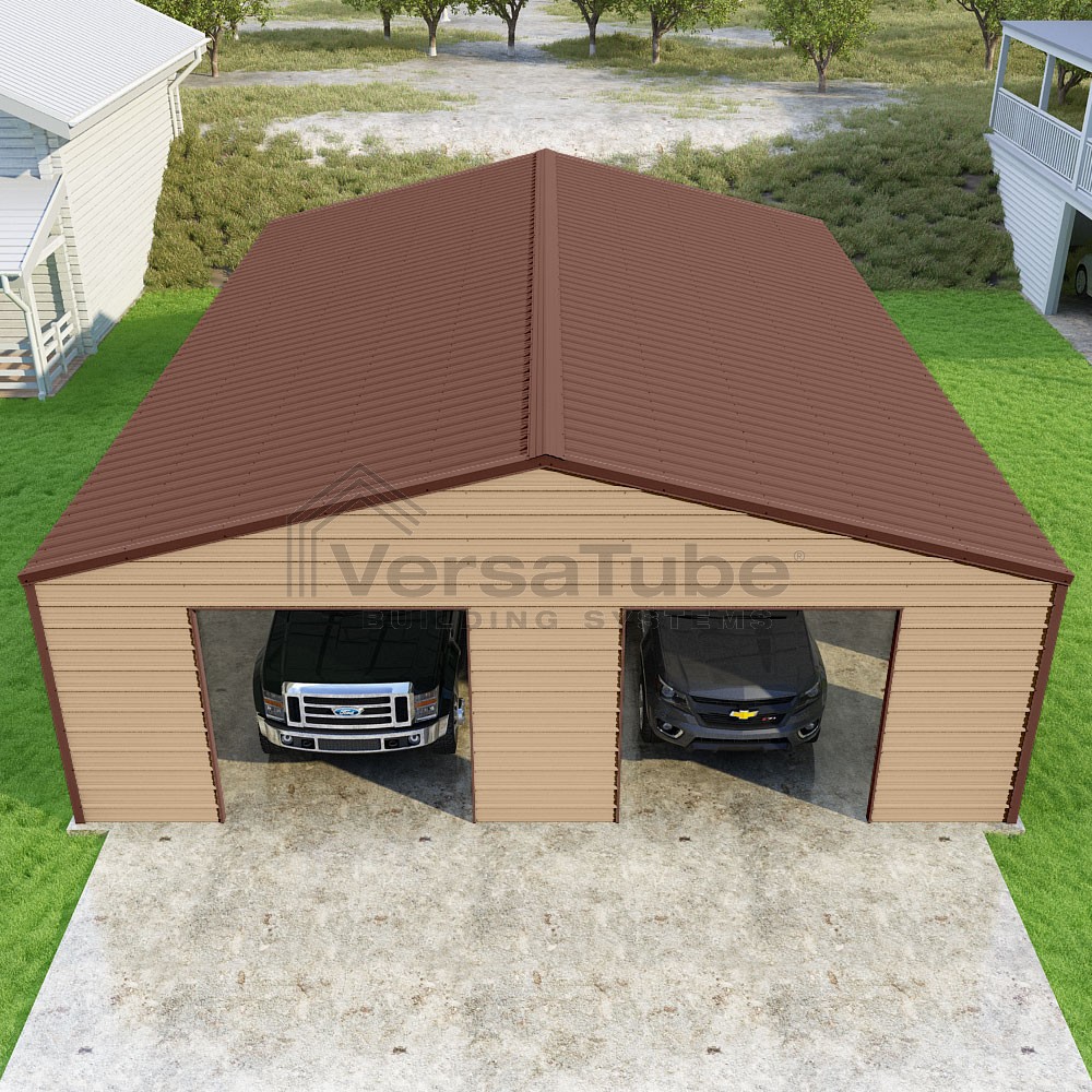 Frontier Series DIY garage kit features vertical sheet metal roof panels with horizontal siding panels..