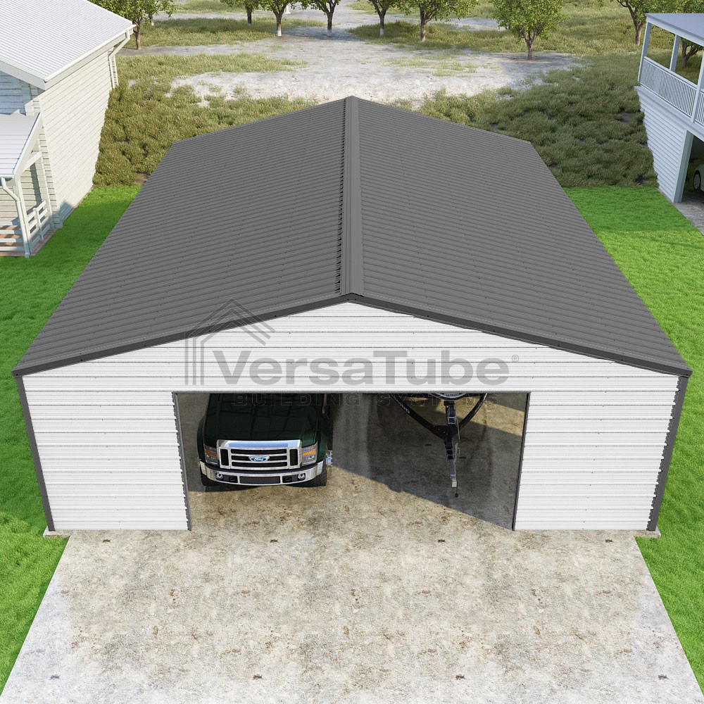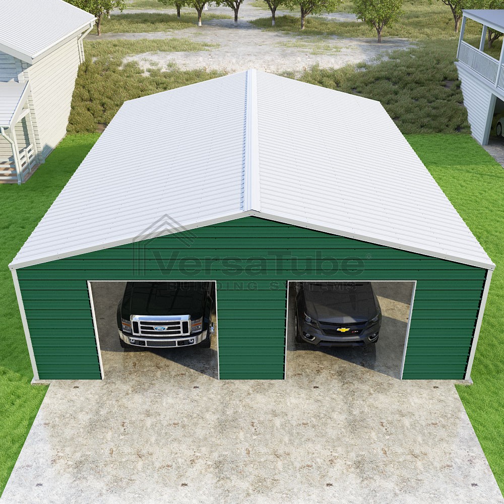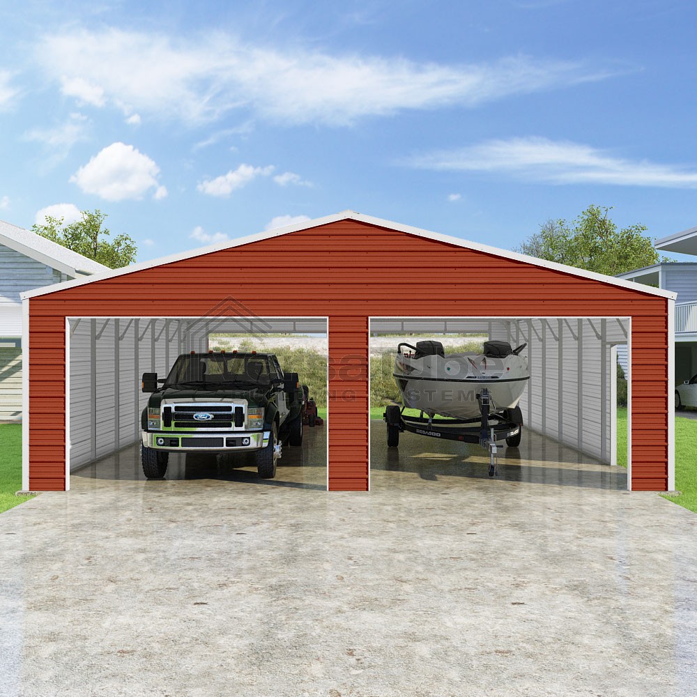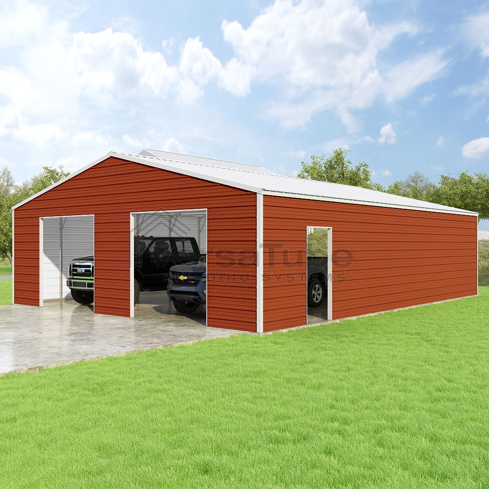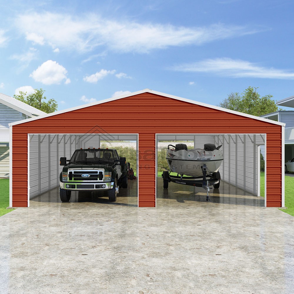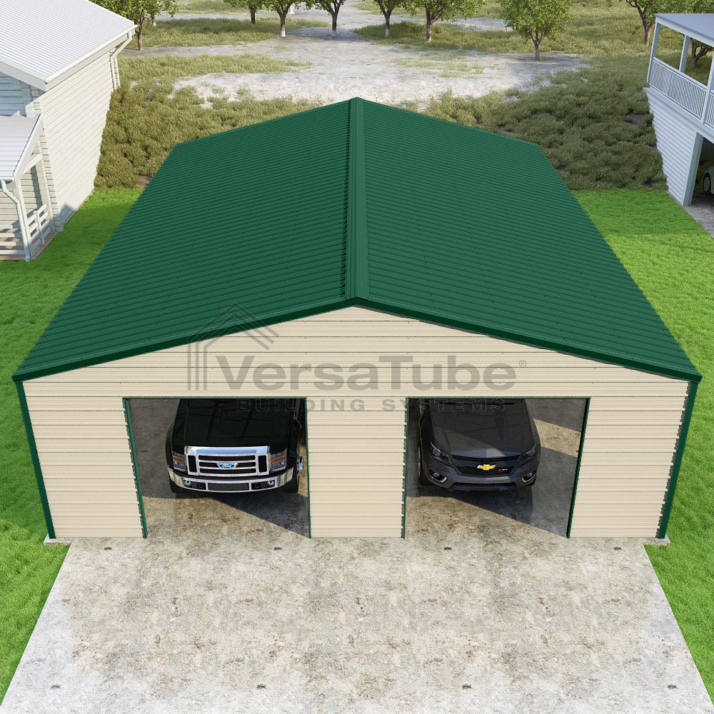 Frontier Series DIY garage kit features vertical sheet metal roof panels with horizontal siding panels..
