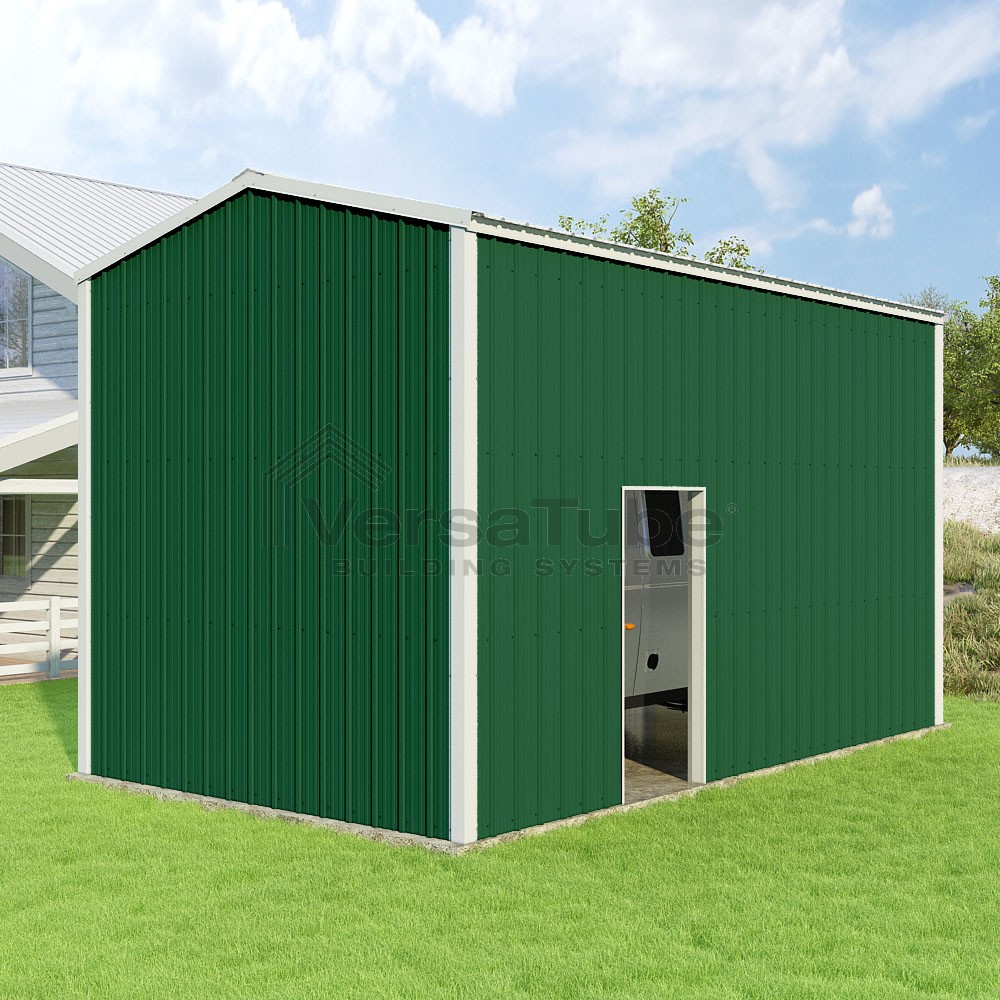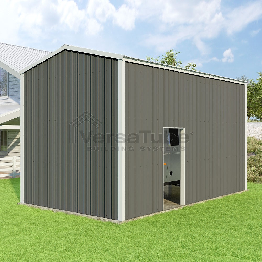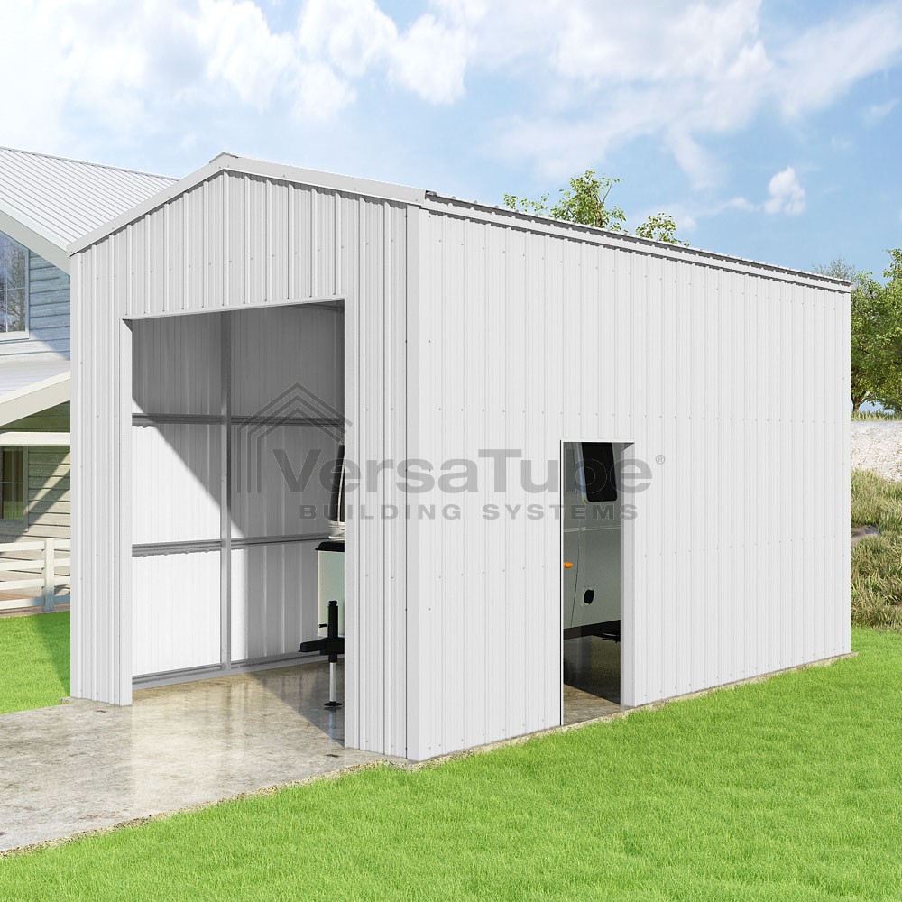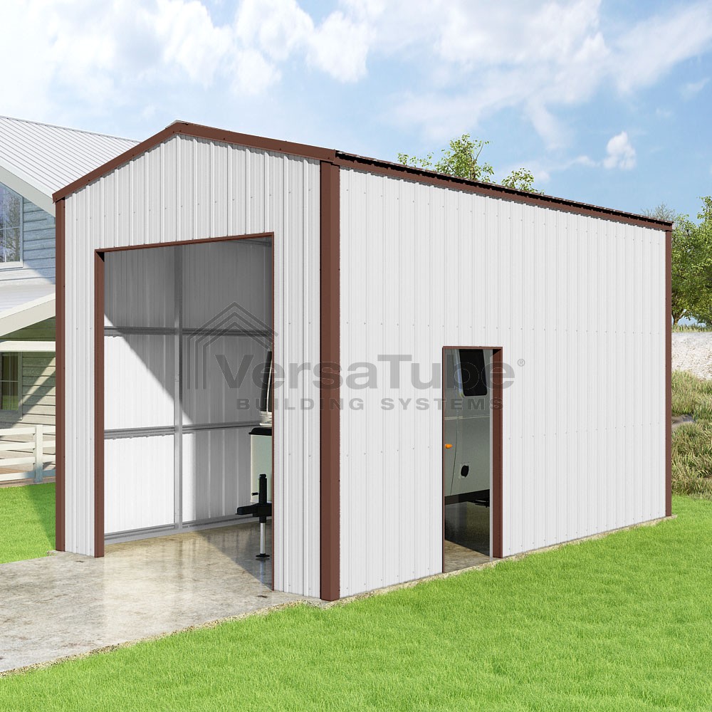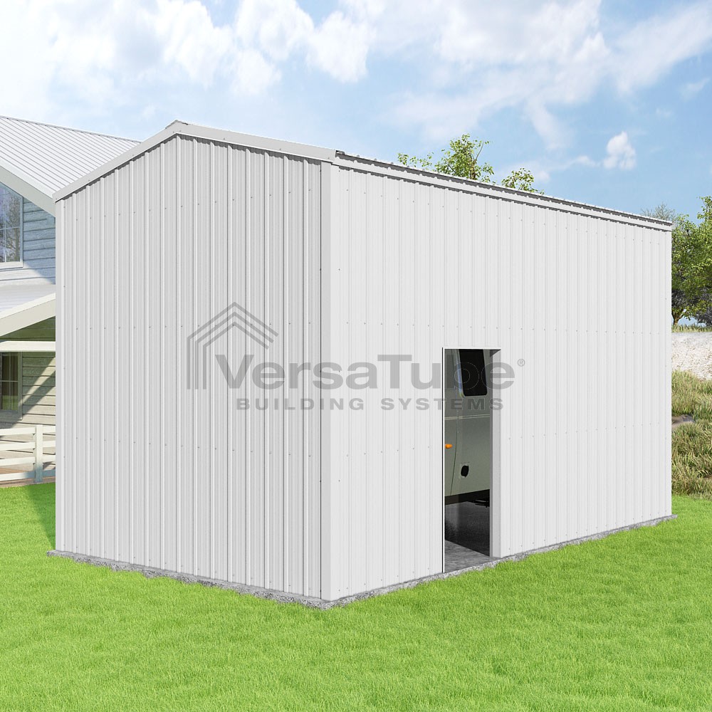 Summit Series DIY garage kit features vertical sheet metal roof and siding panels for a consistent look.