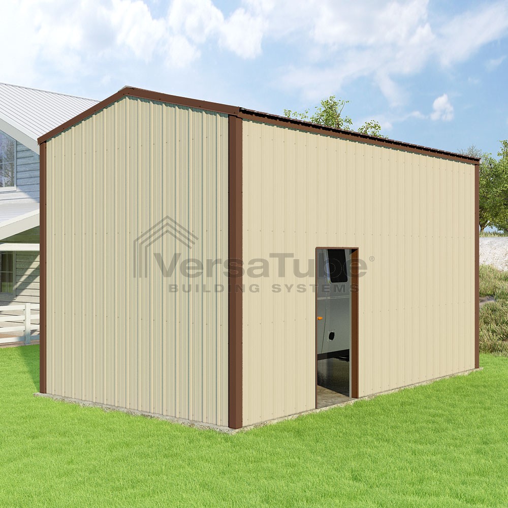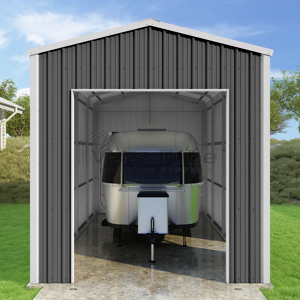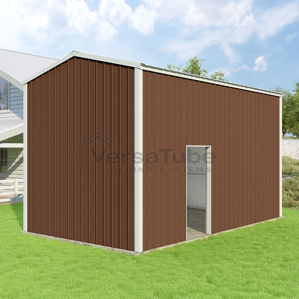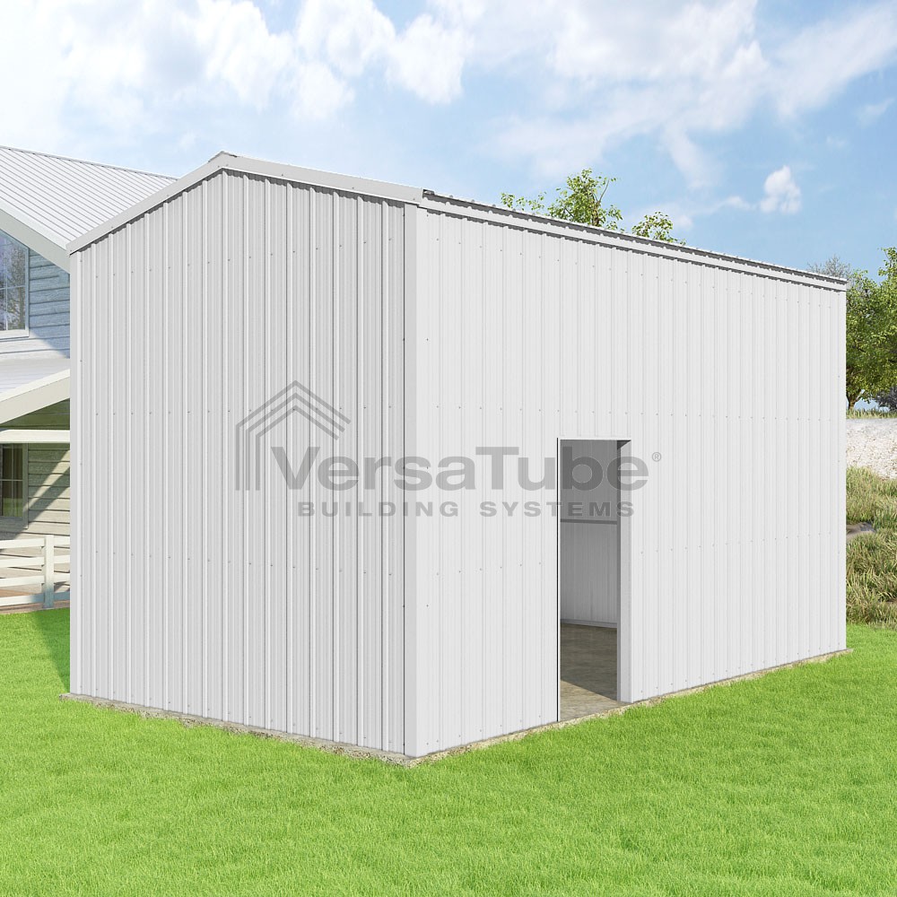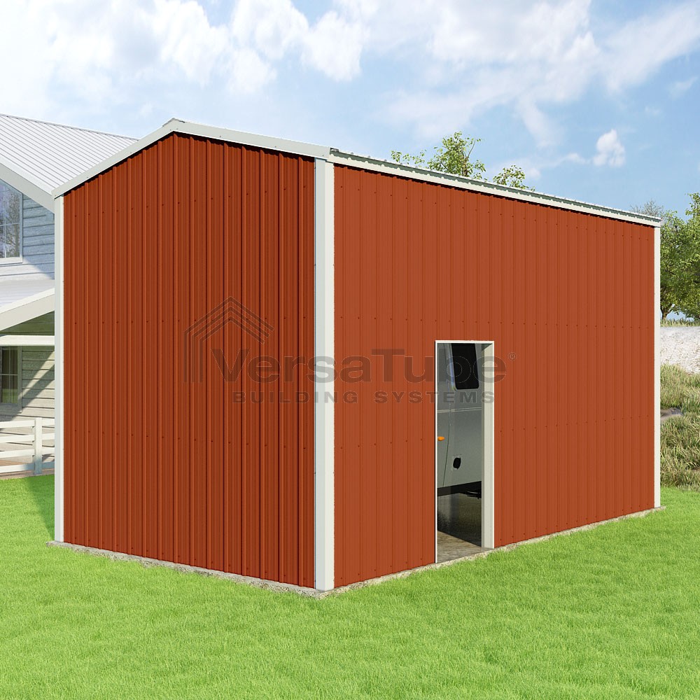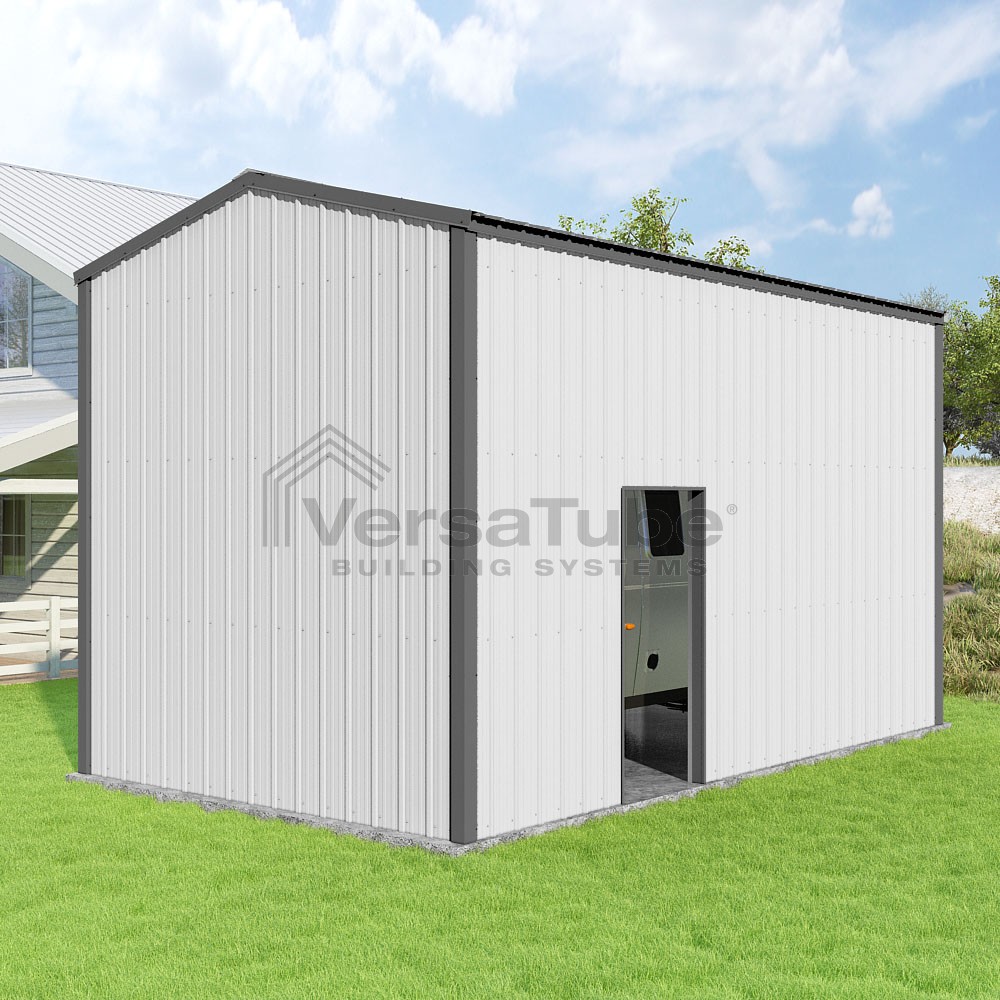 Summit Series DIY garage kit features vertical sheet metal roof and siding panels for a consistent look.