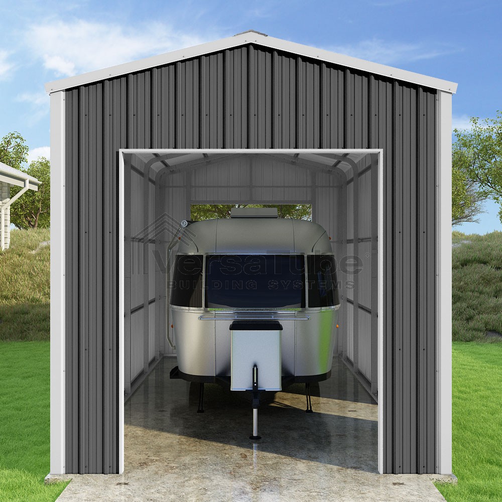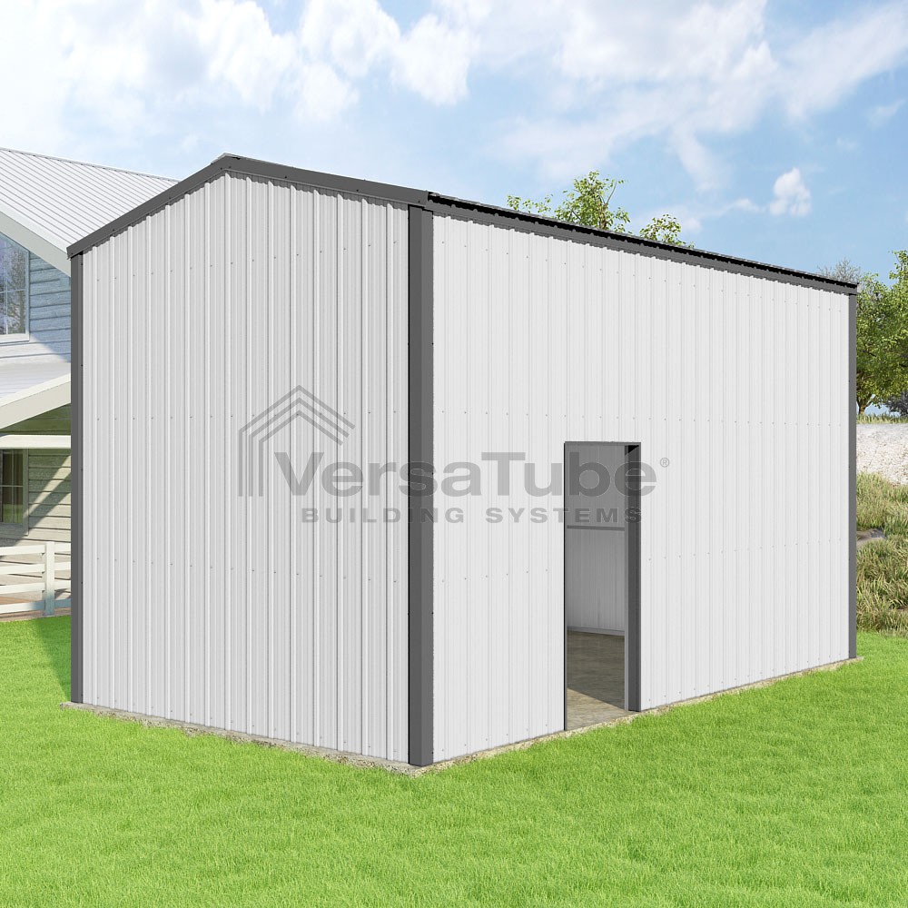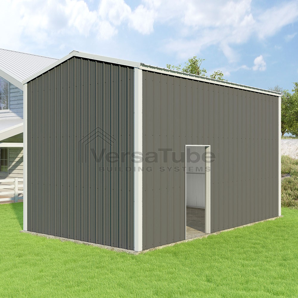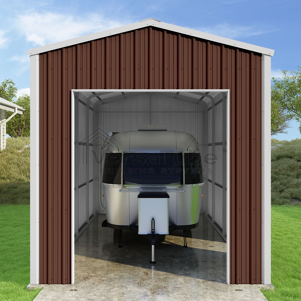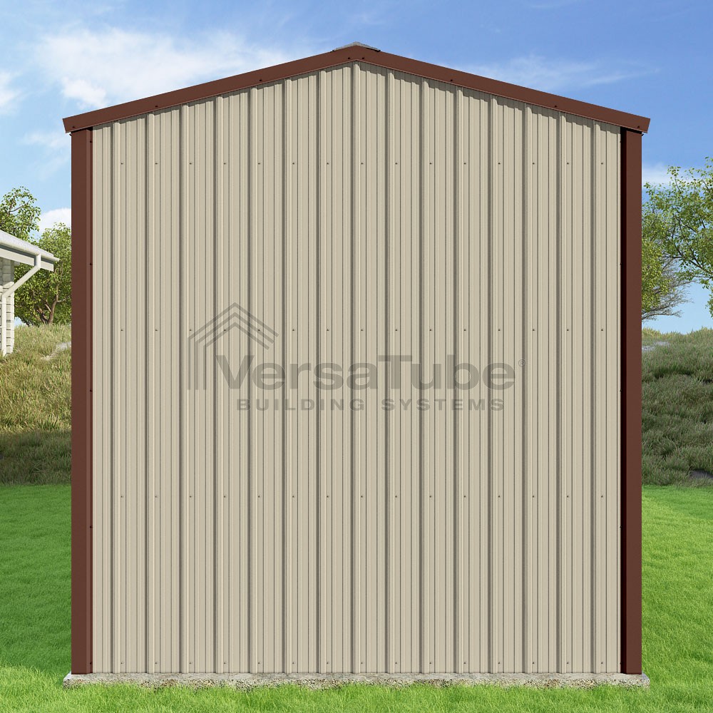 Summit Series DIY garage kit features vertical sheet metal roof and siding panels for a consistent look.