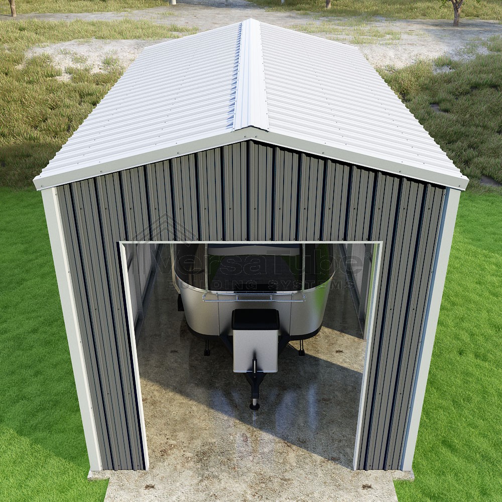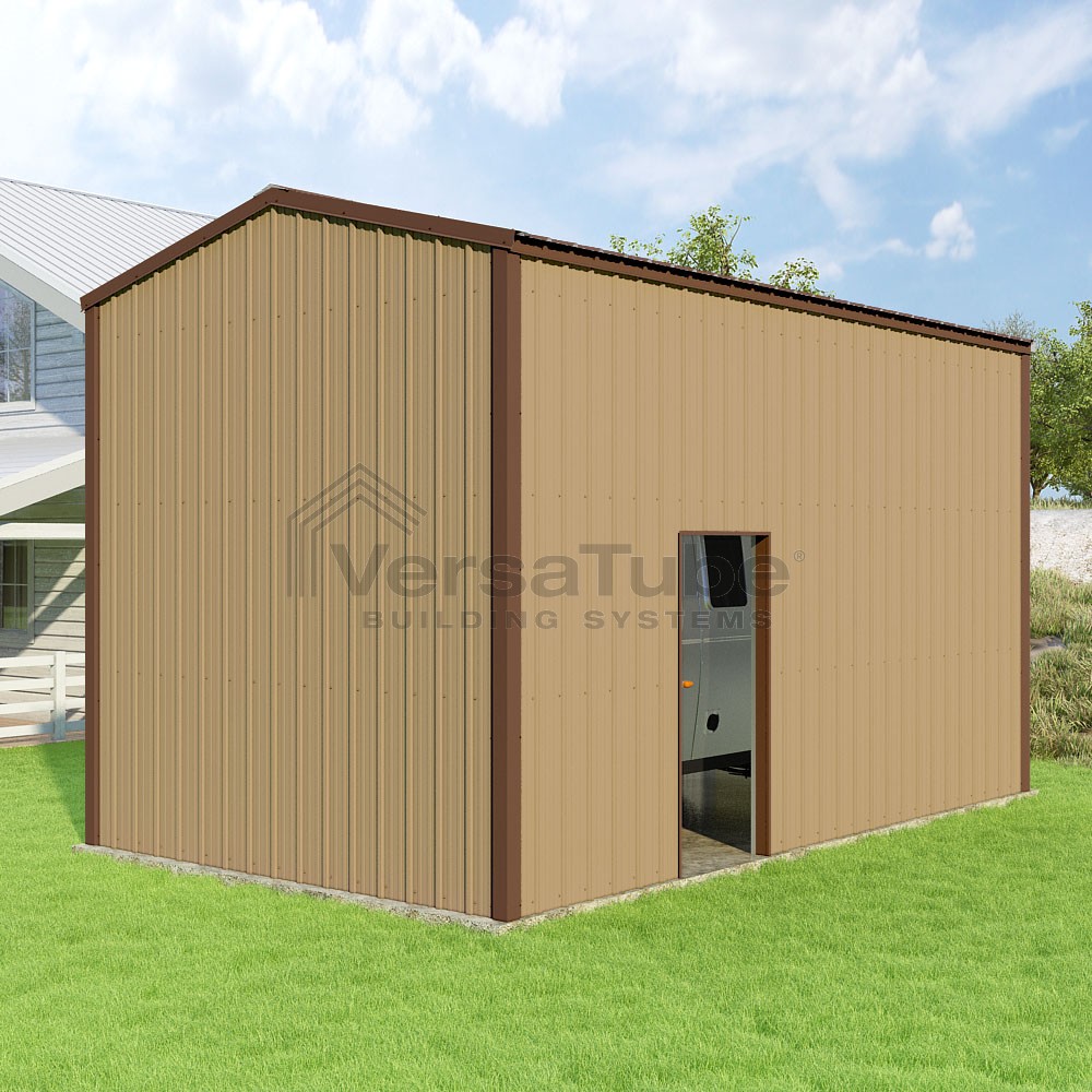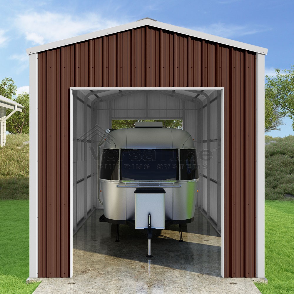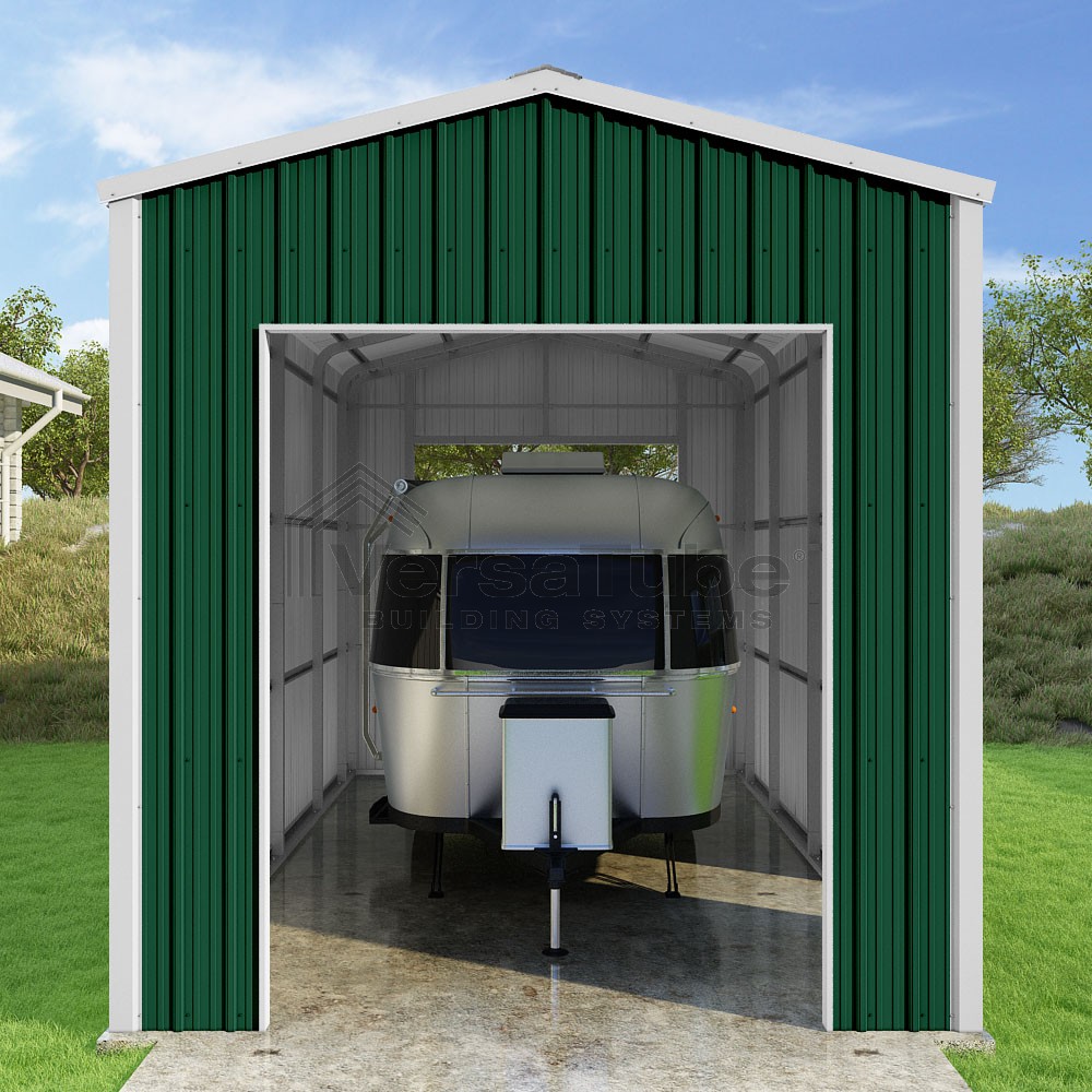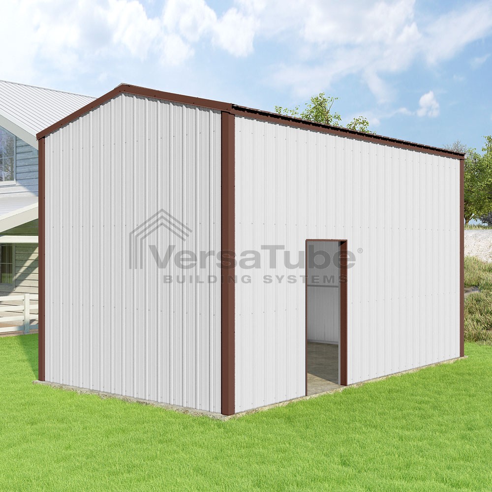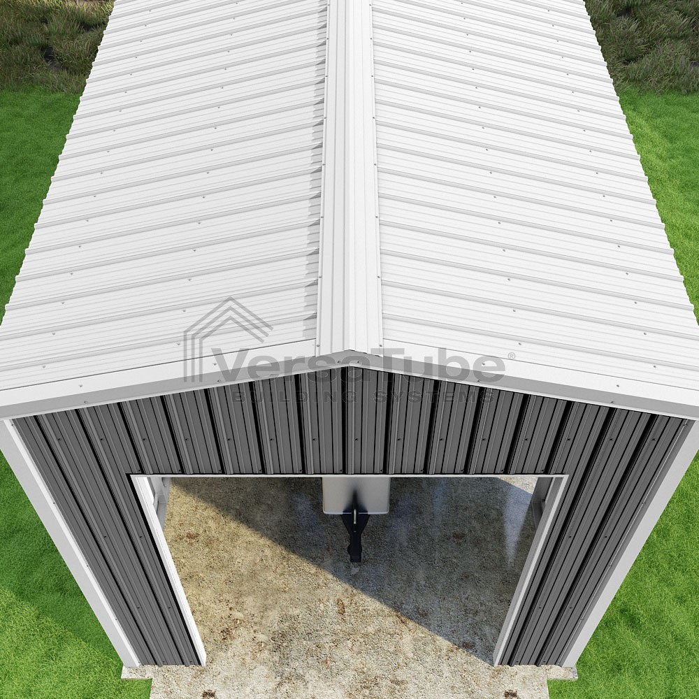 Summit Series DIY garage kit features vertical sheet metal roof and siding panels for a consistent look.