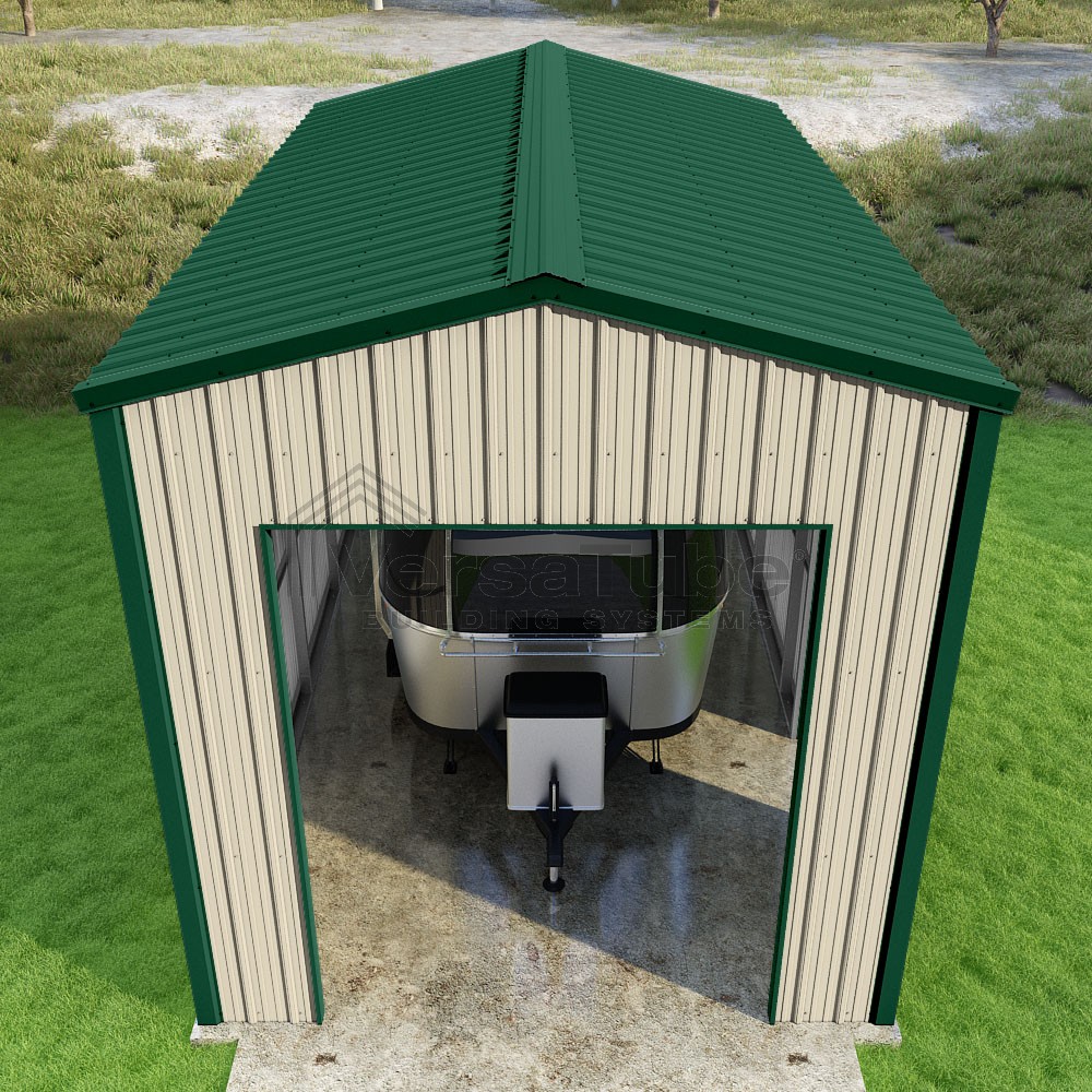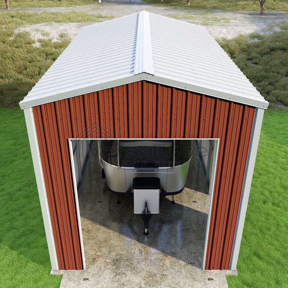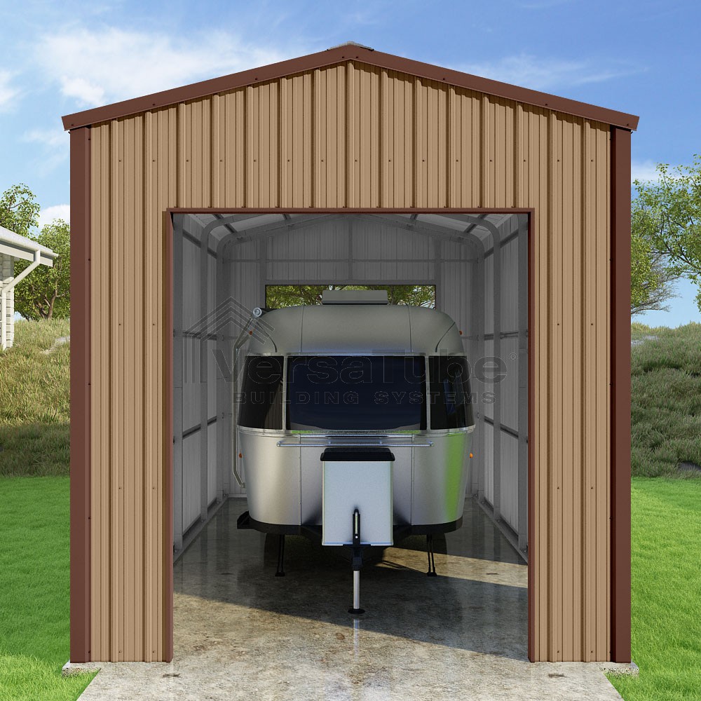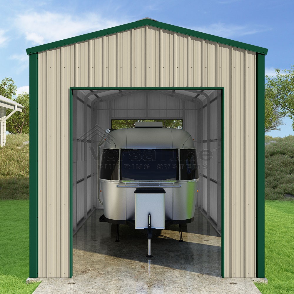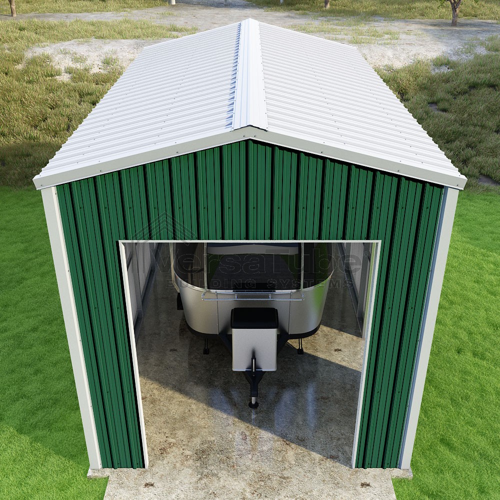 Summit Series DIY garage kit features vertical sheet metal roof and siding panels for a consistent look.