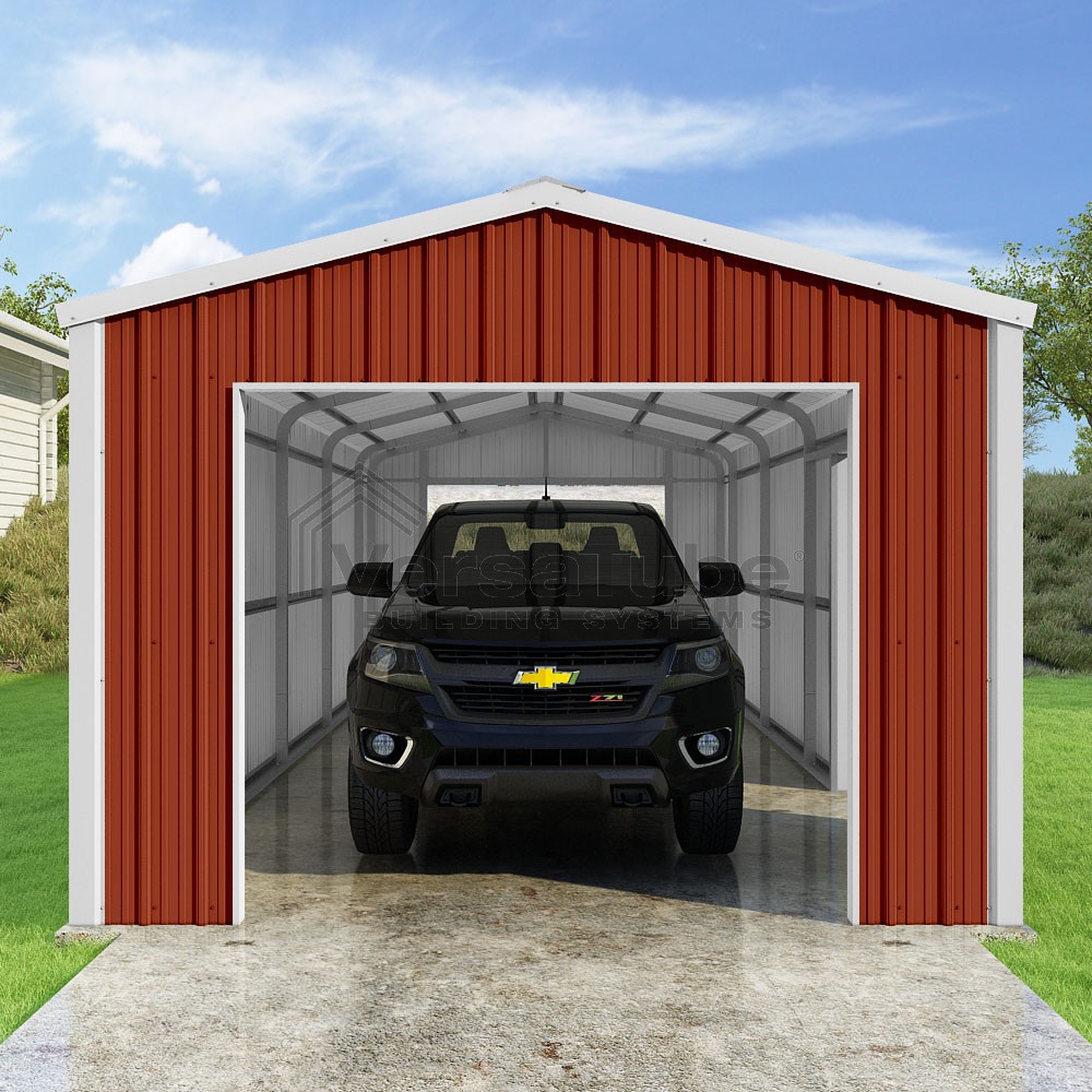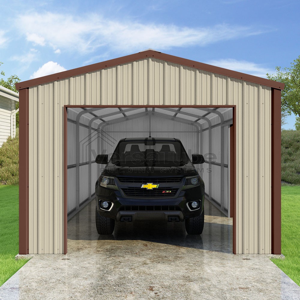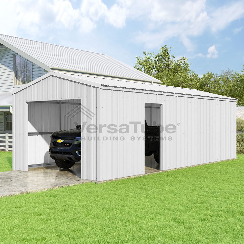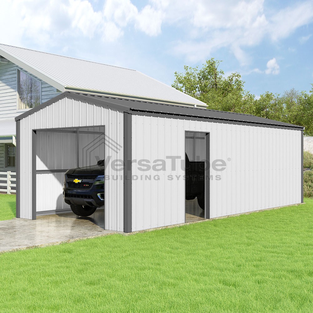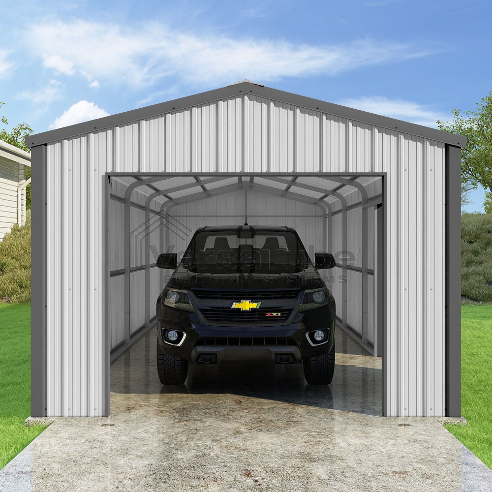 Summit Series DIY garage kit features vertical sheet metal roof and siding panels for a consistent look.