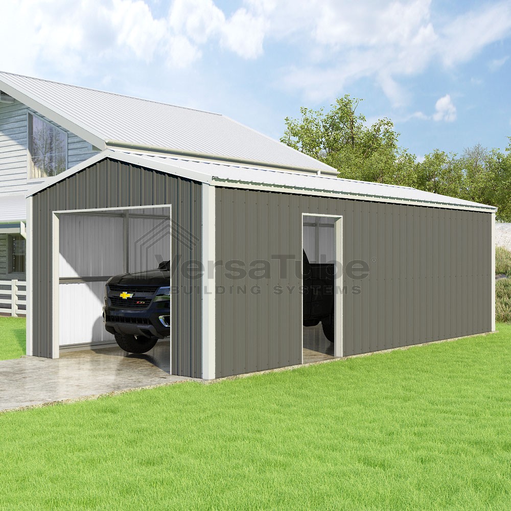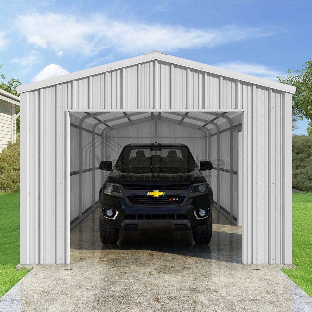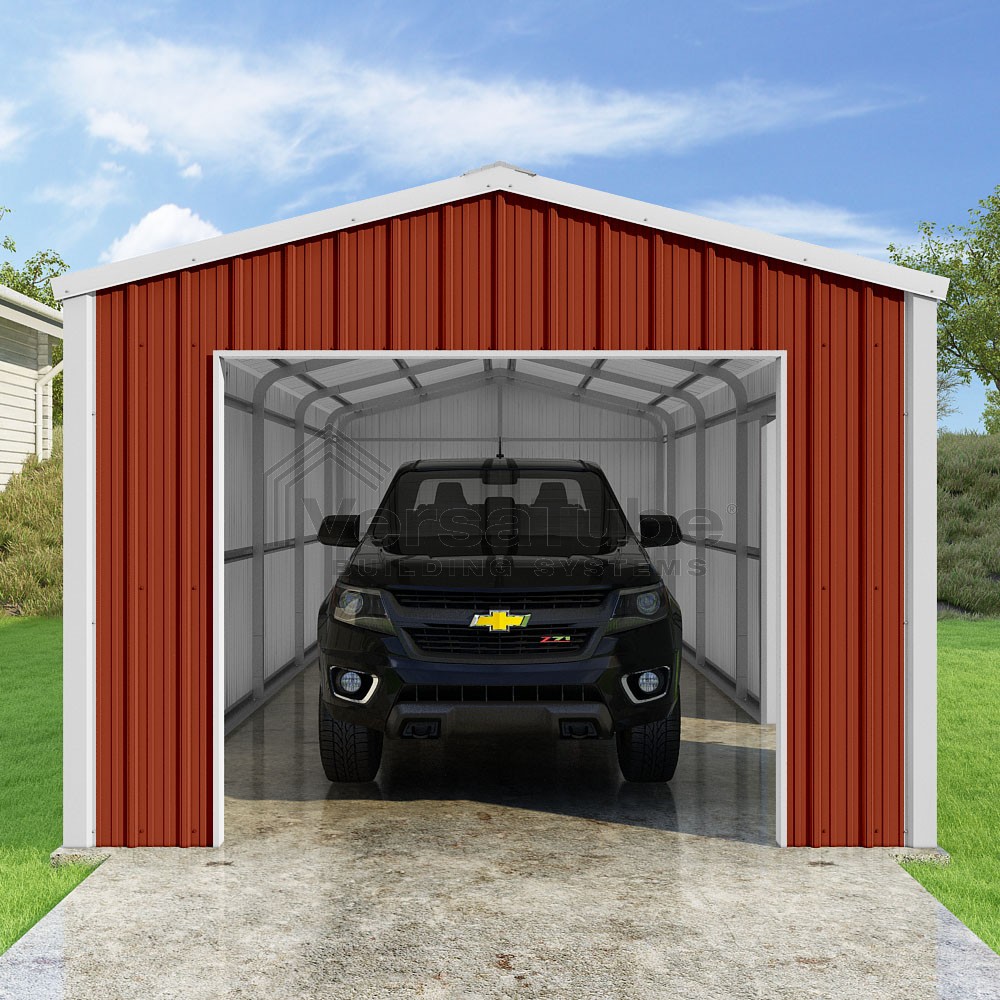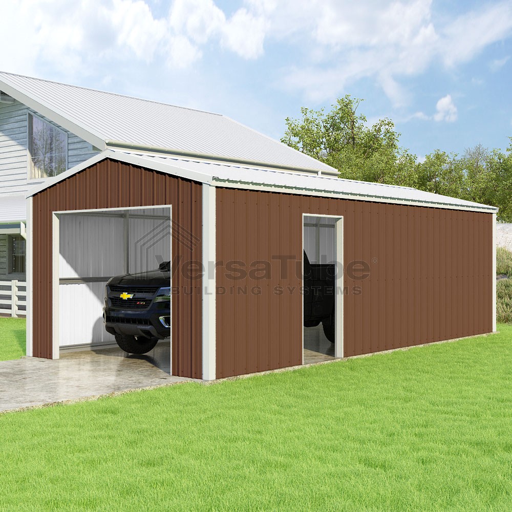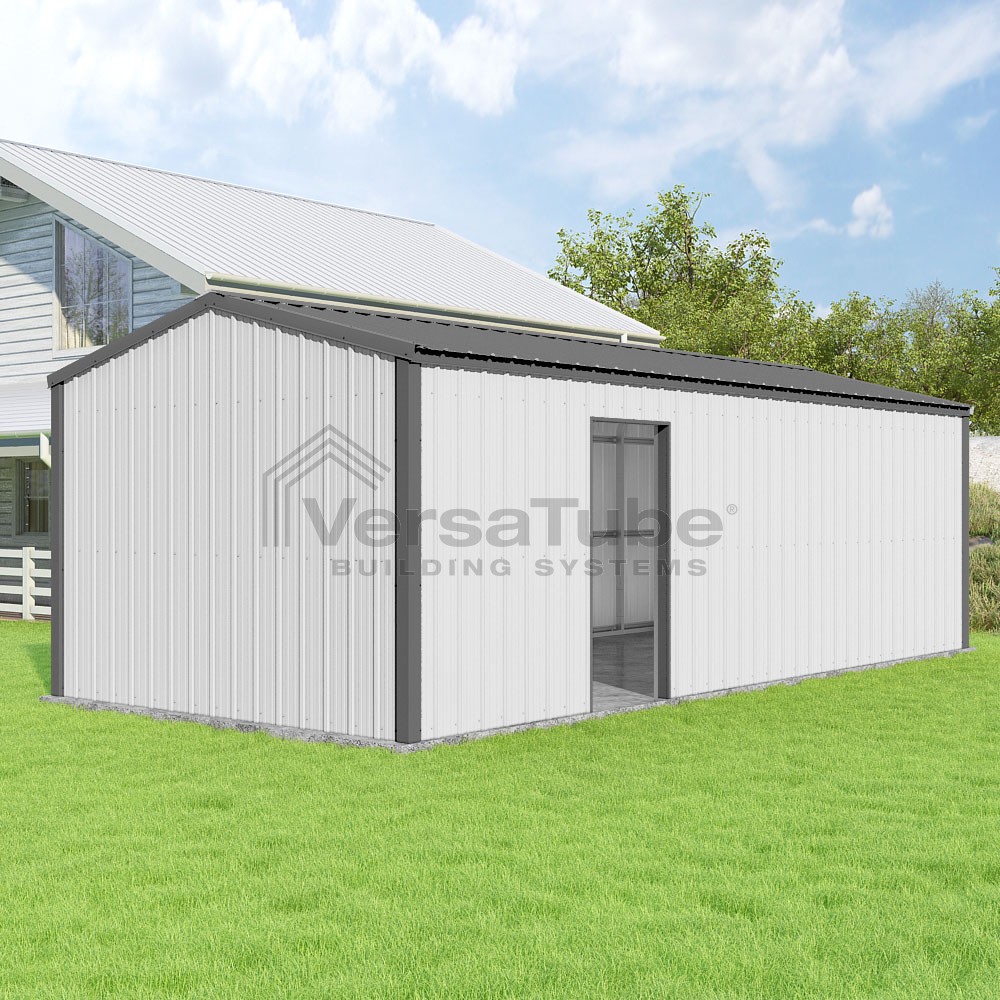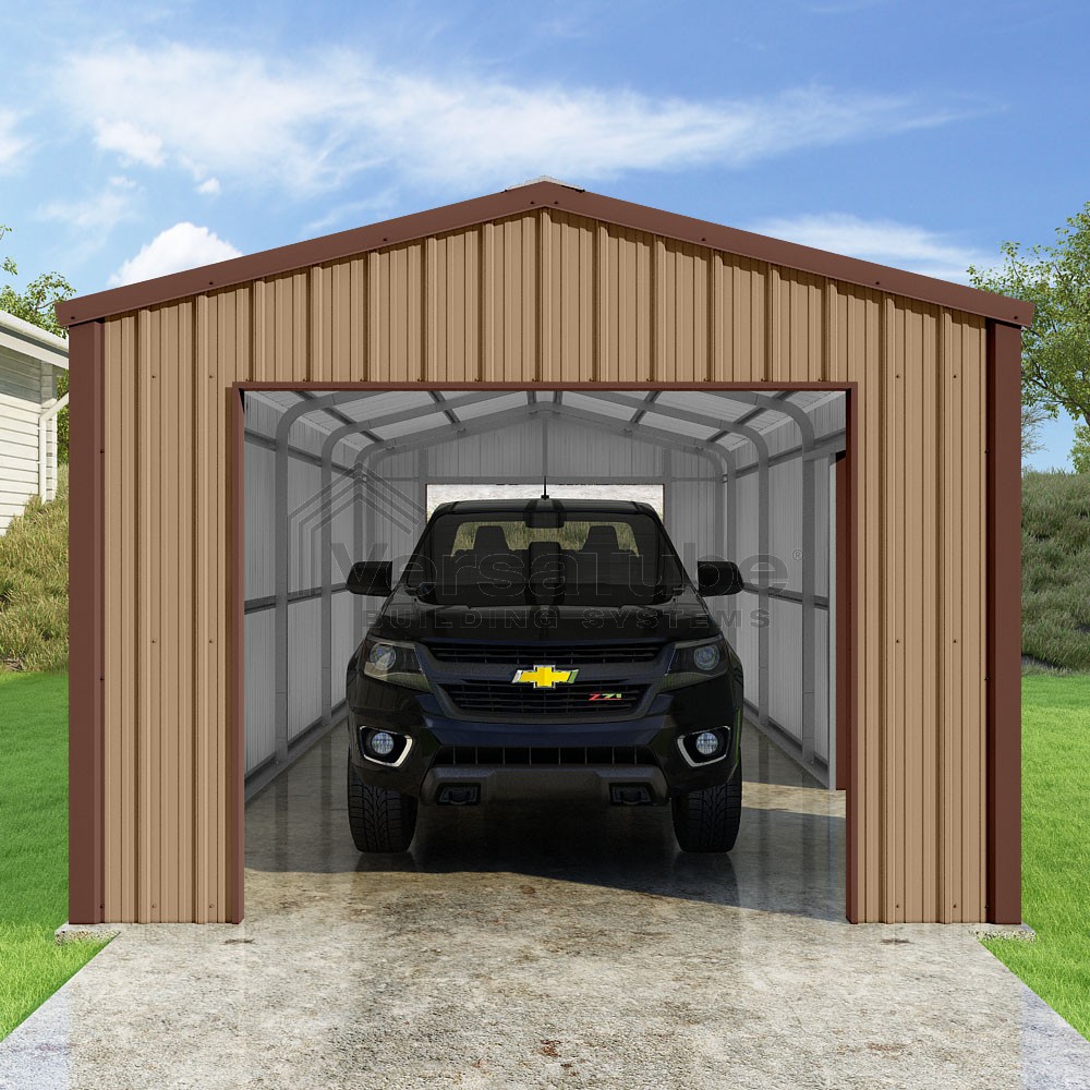 Summit Series DIY garage kit features vertical sheet metal roof and siding panels for a consistent look.