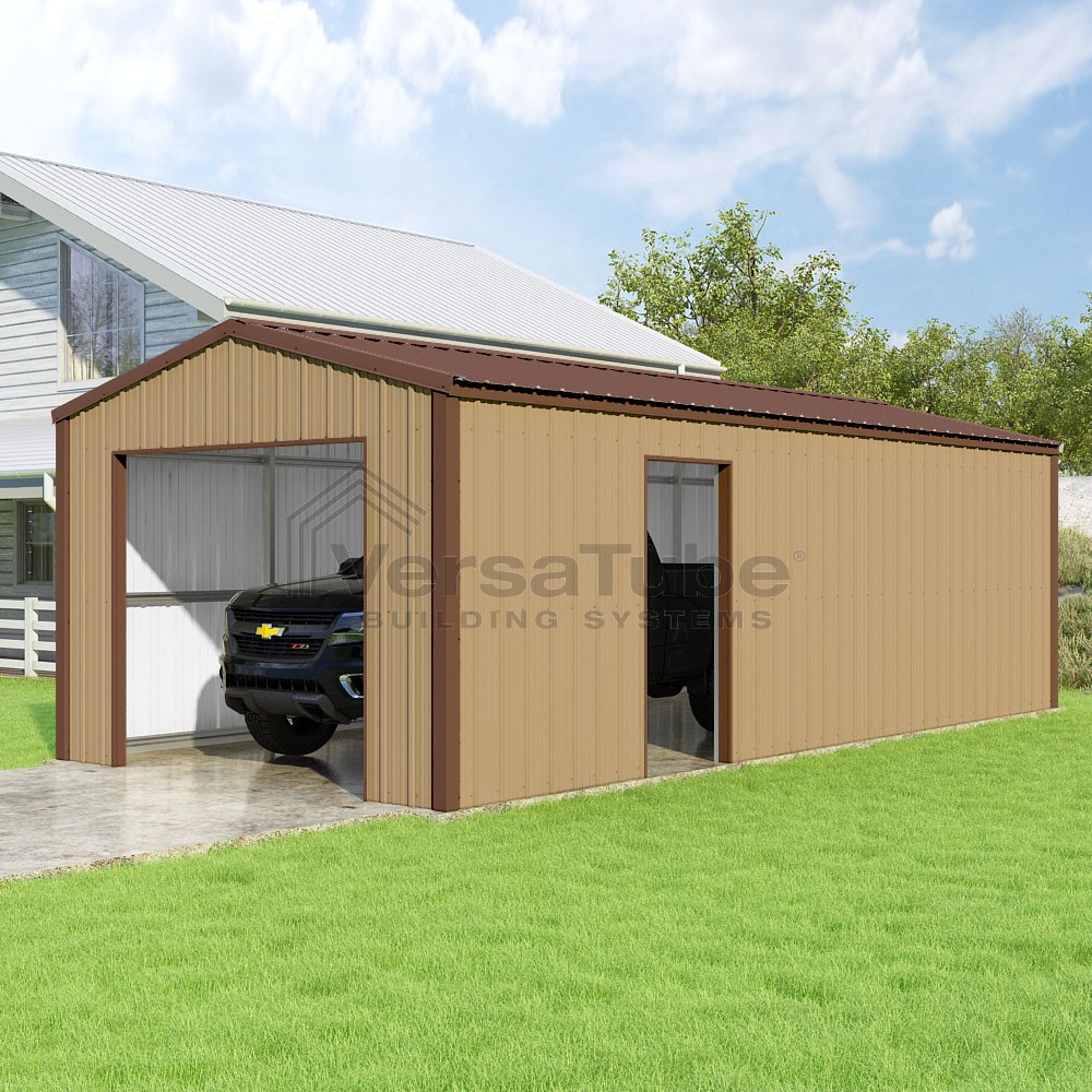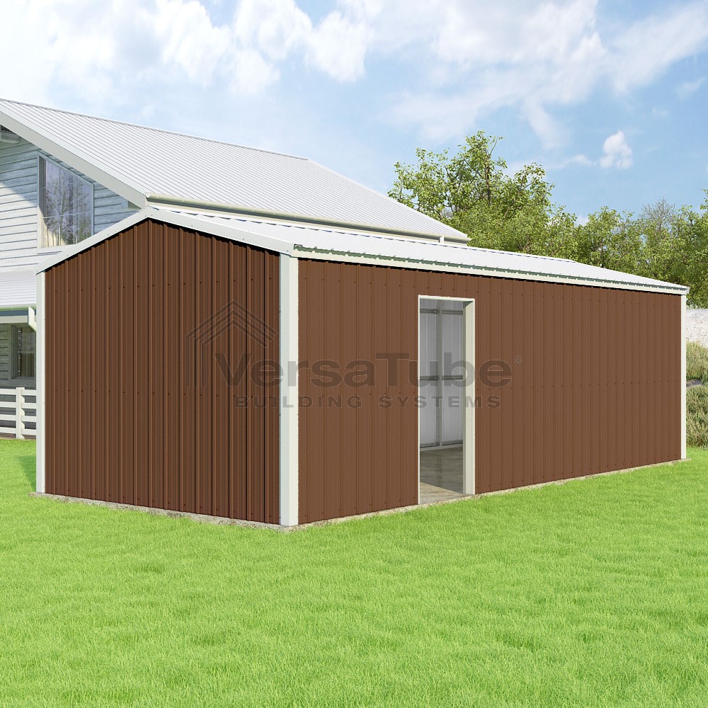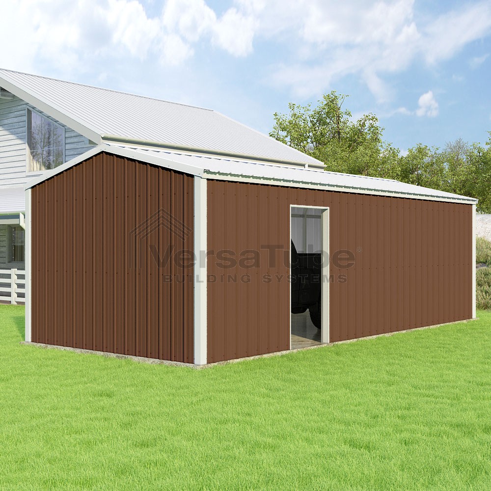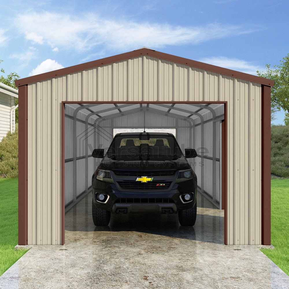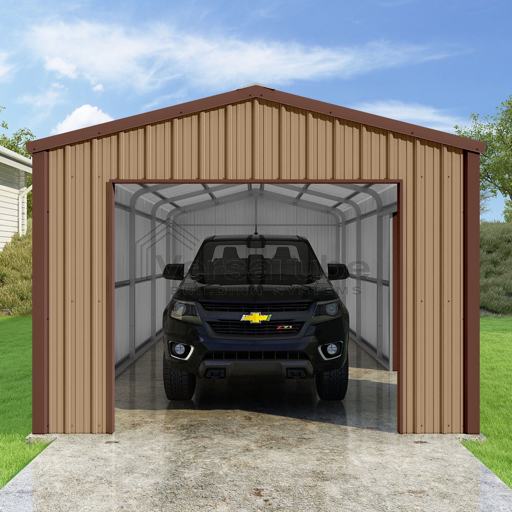Summit Series DIY garage kit features vertical sheet metal roof and siding panels for a consistent look.