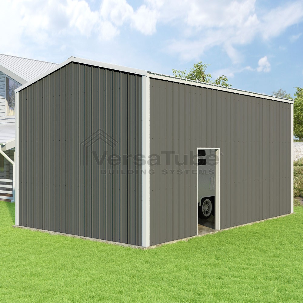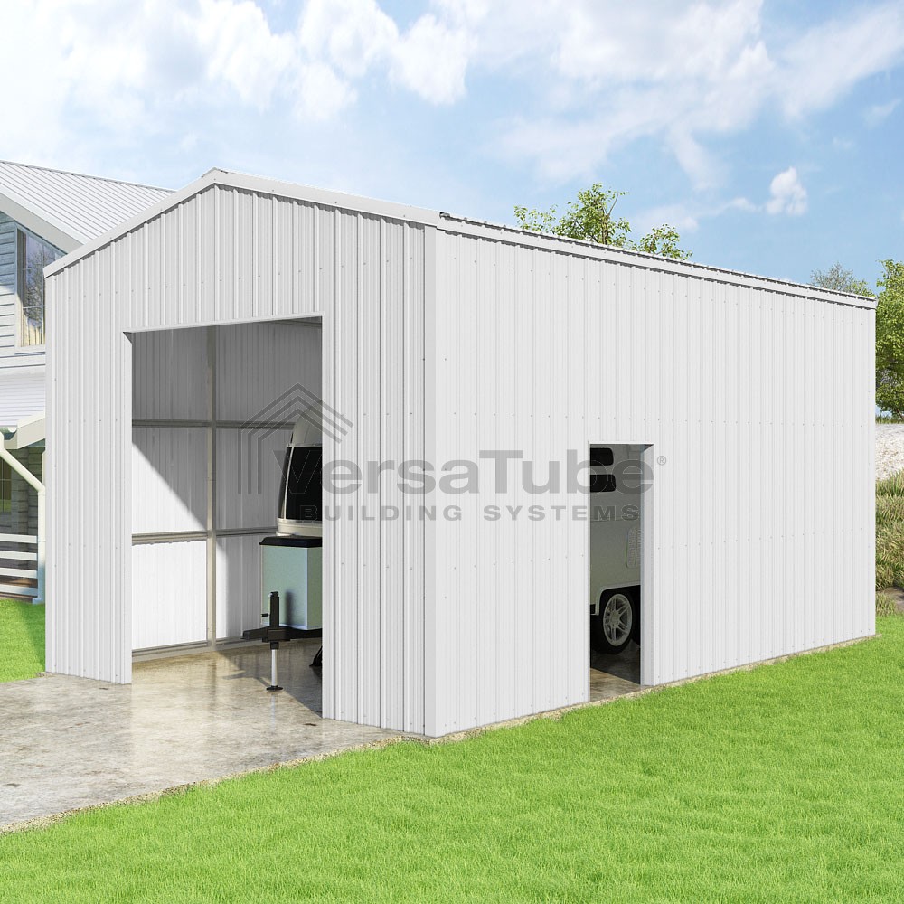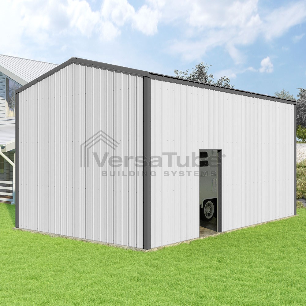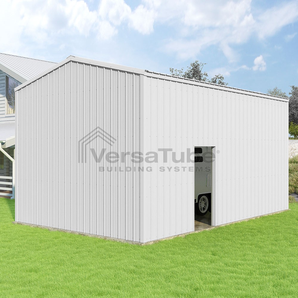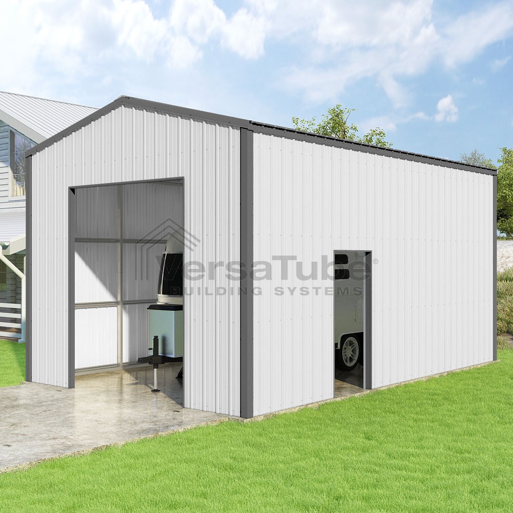 Summit Series DIY garage kit features vertical sheet metal roof and siding panels for a consistent look.