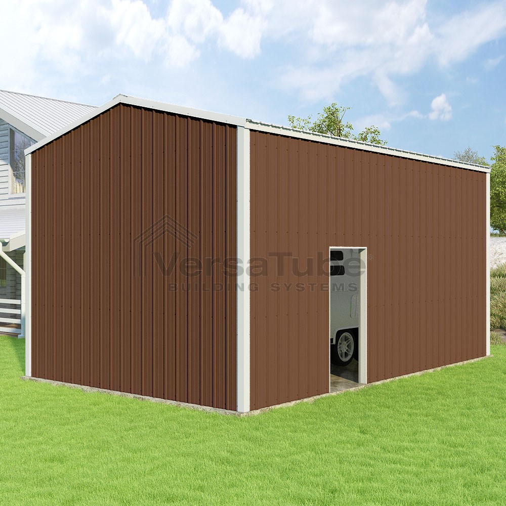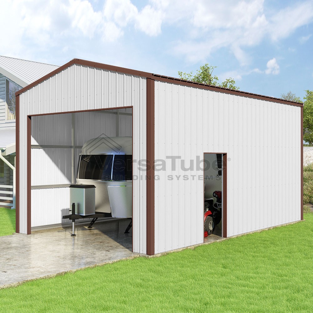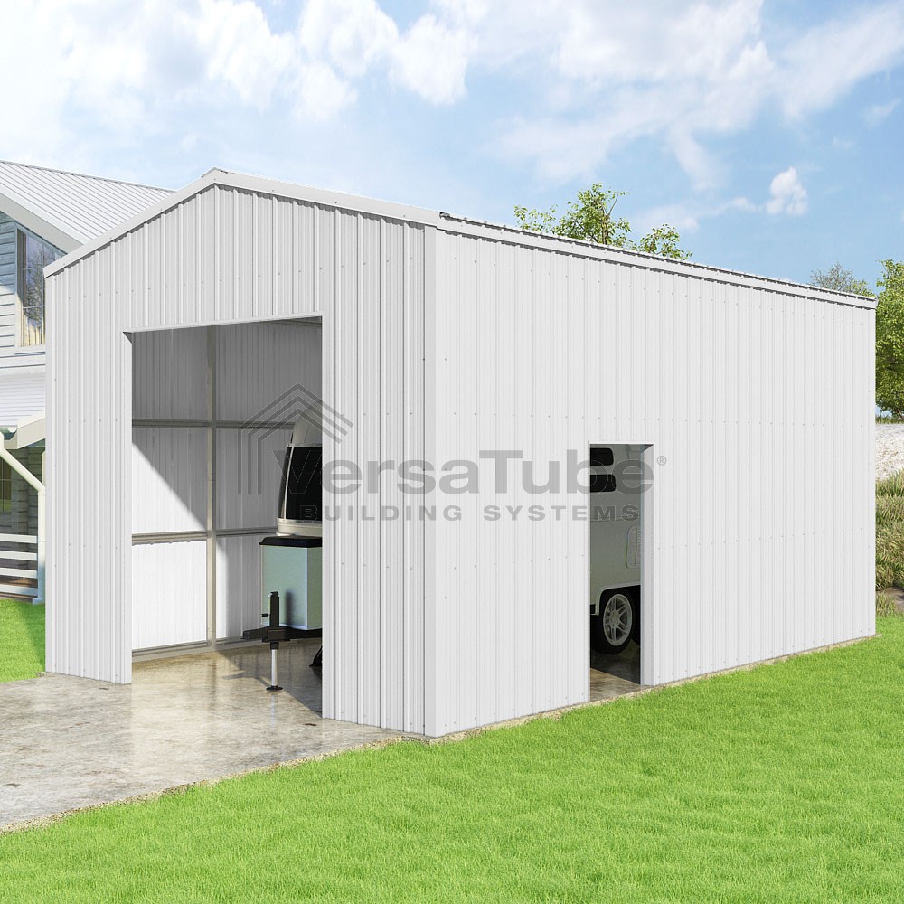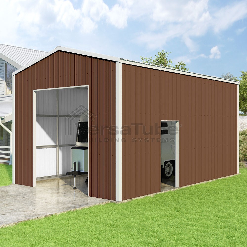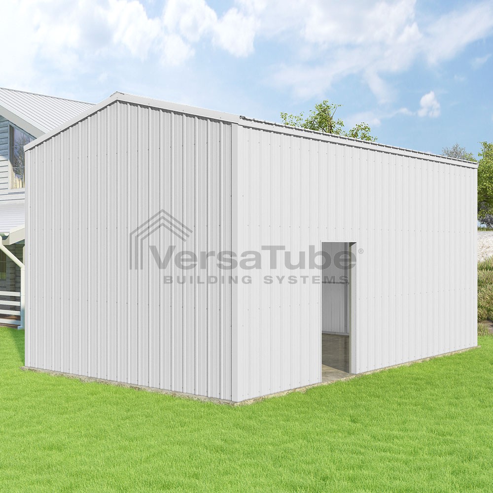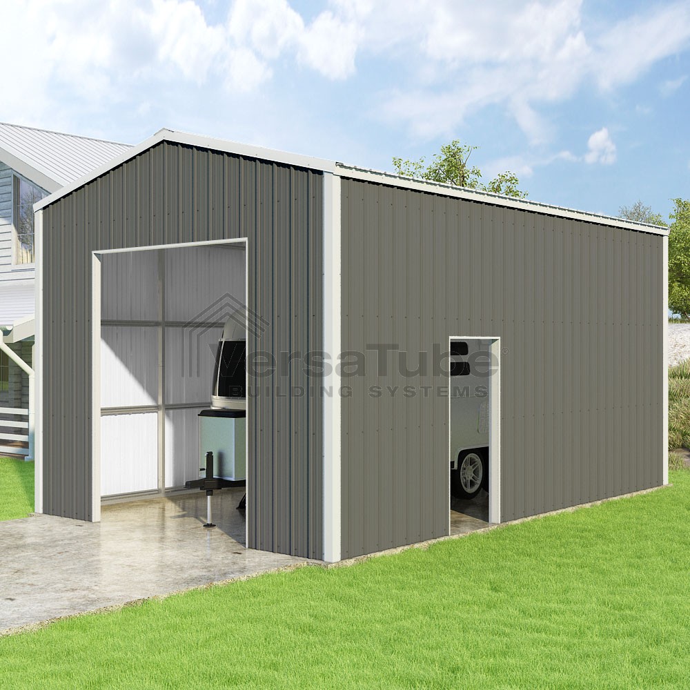 Summit Series DIY garage kit features vertical sheet metal roof and siding panels for a consistent look.