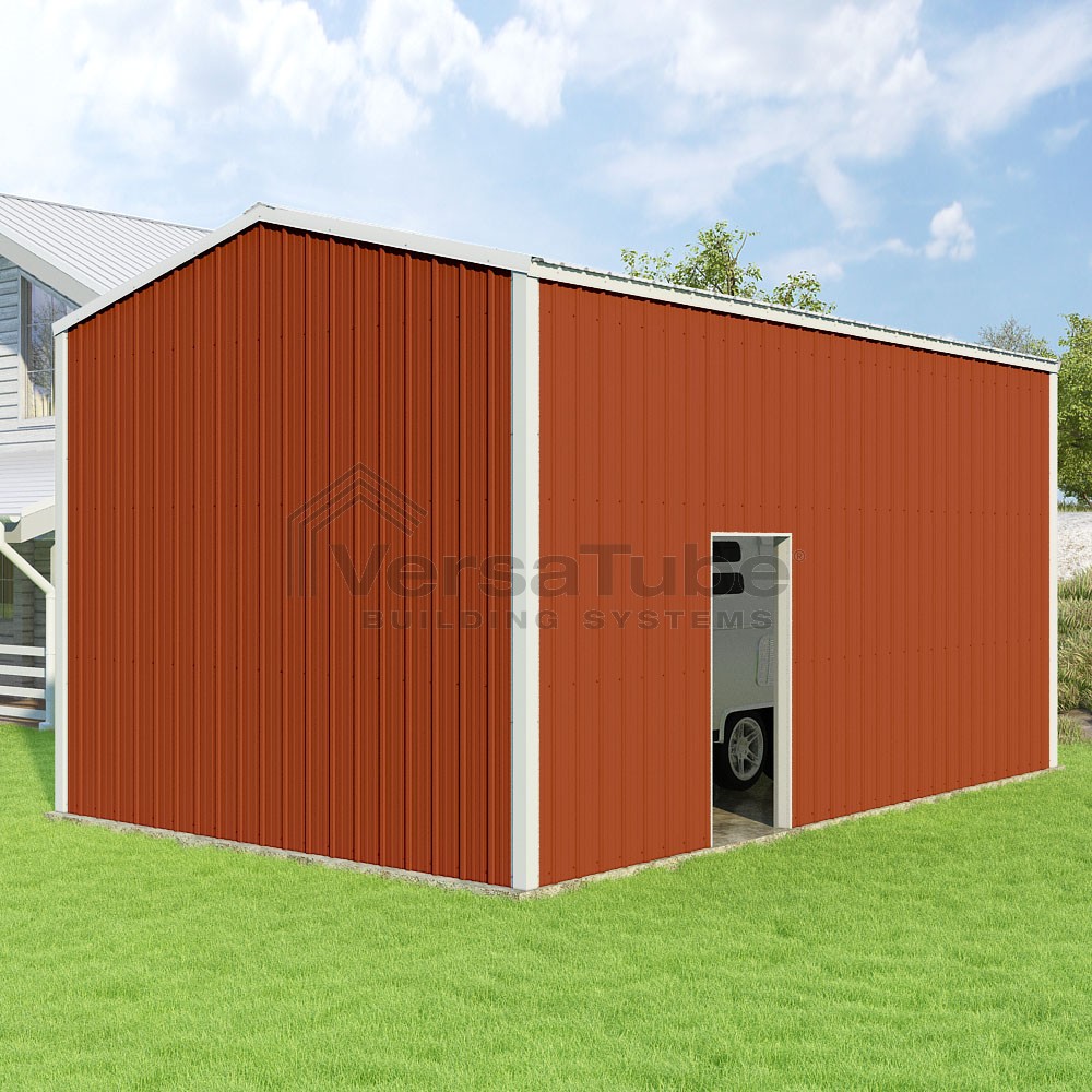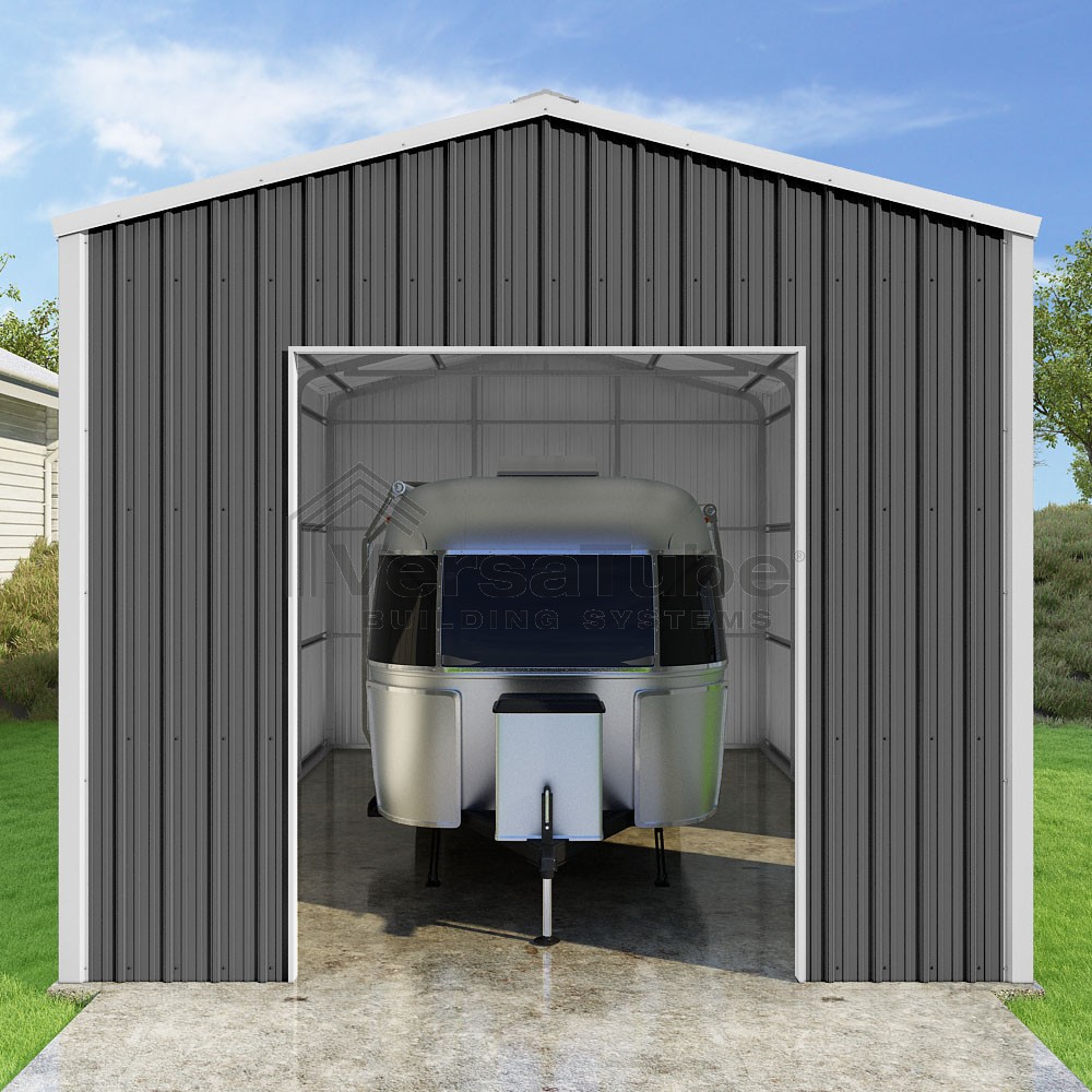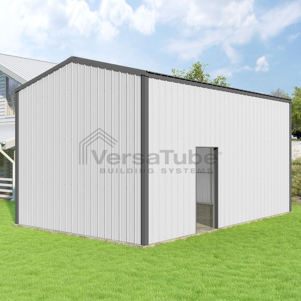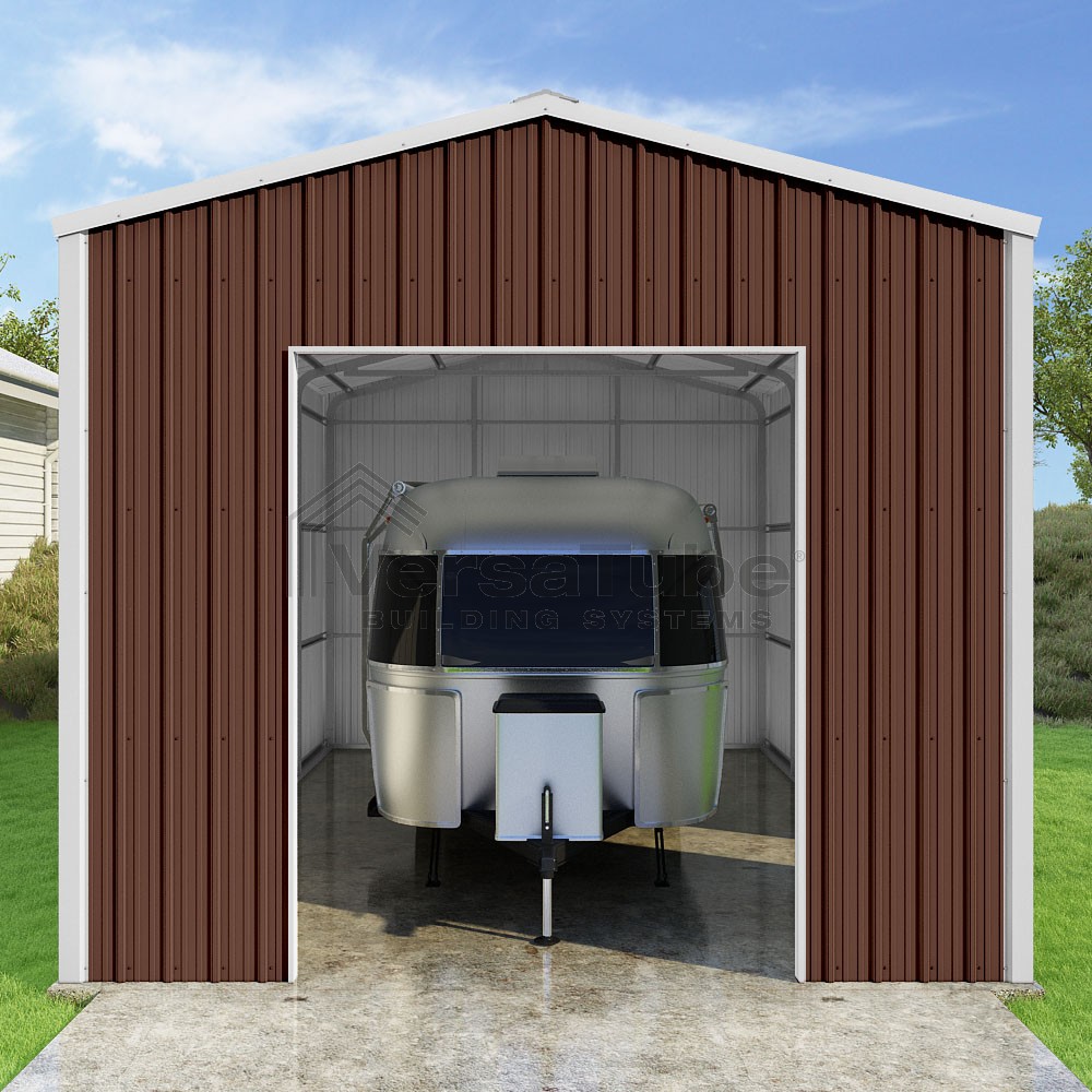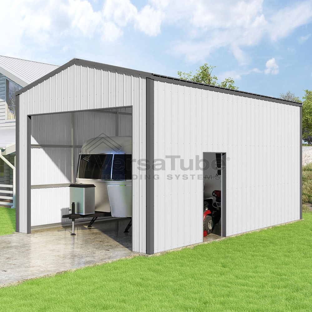 Summit Series DIY garage kit features vertical sheet metal roof and siding panels for a consistent look.